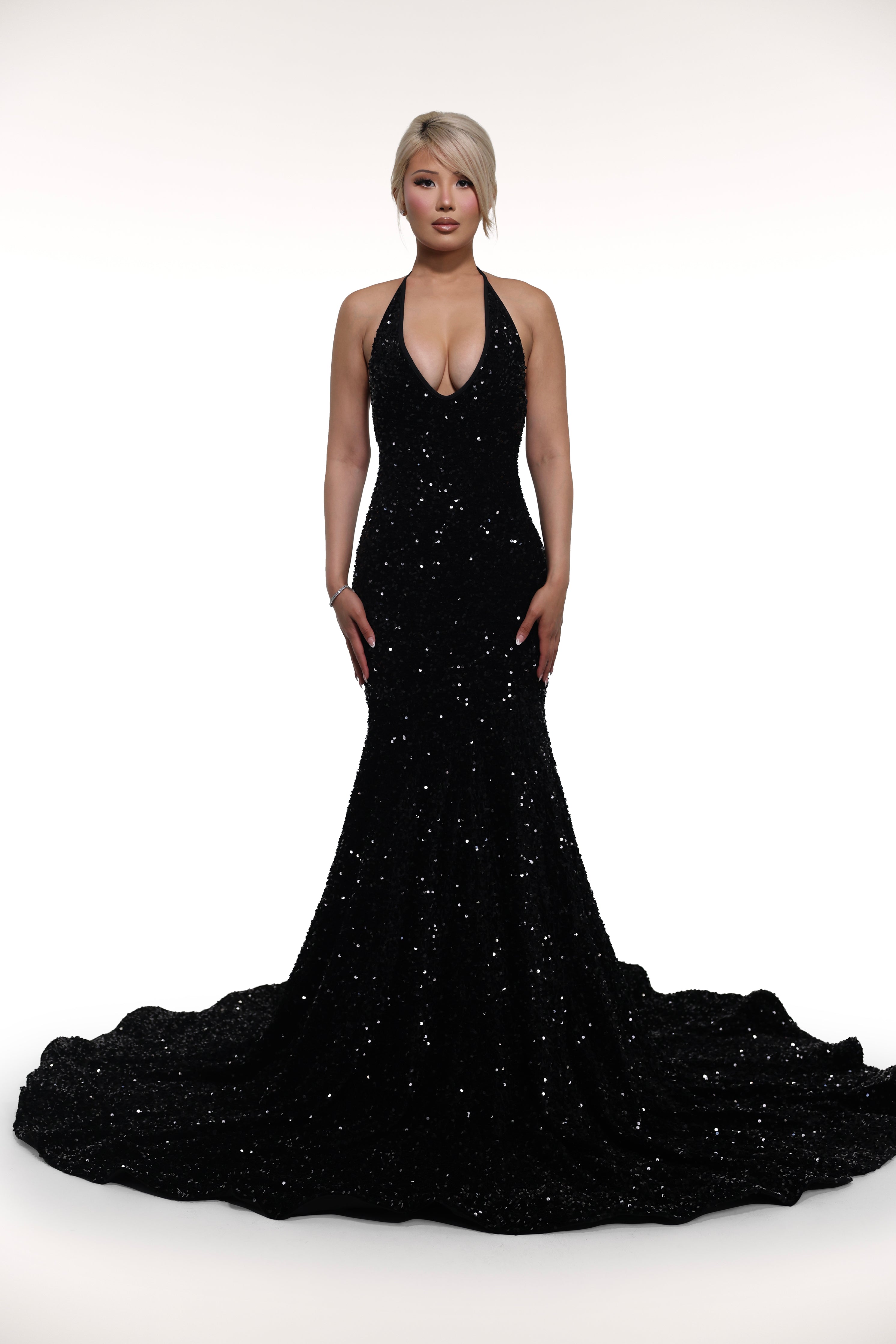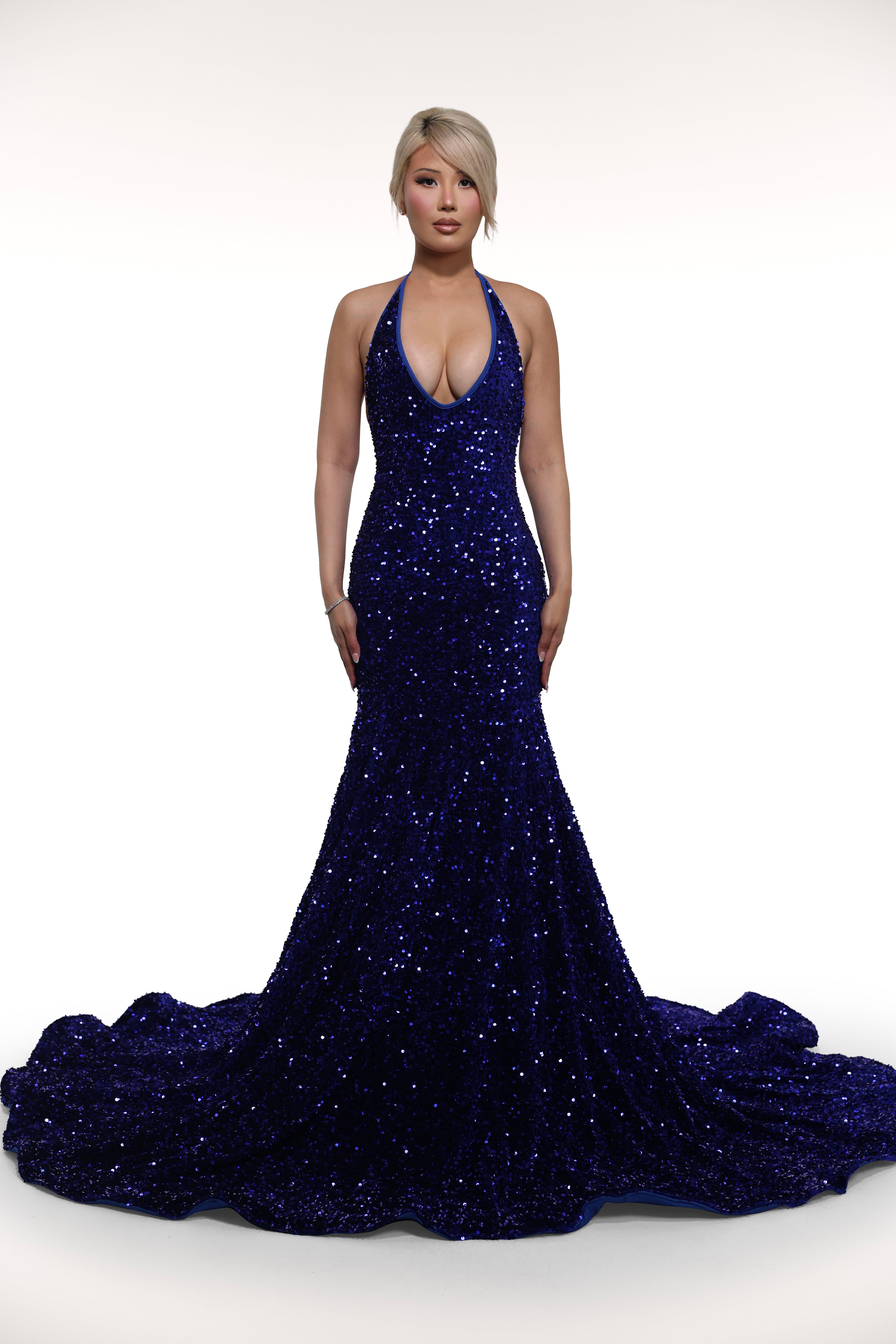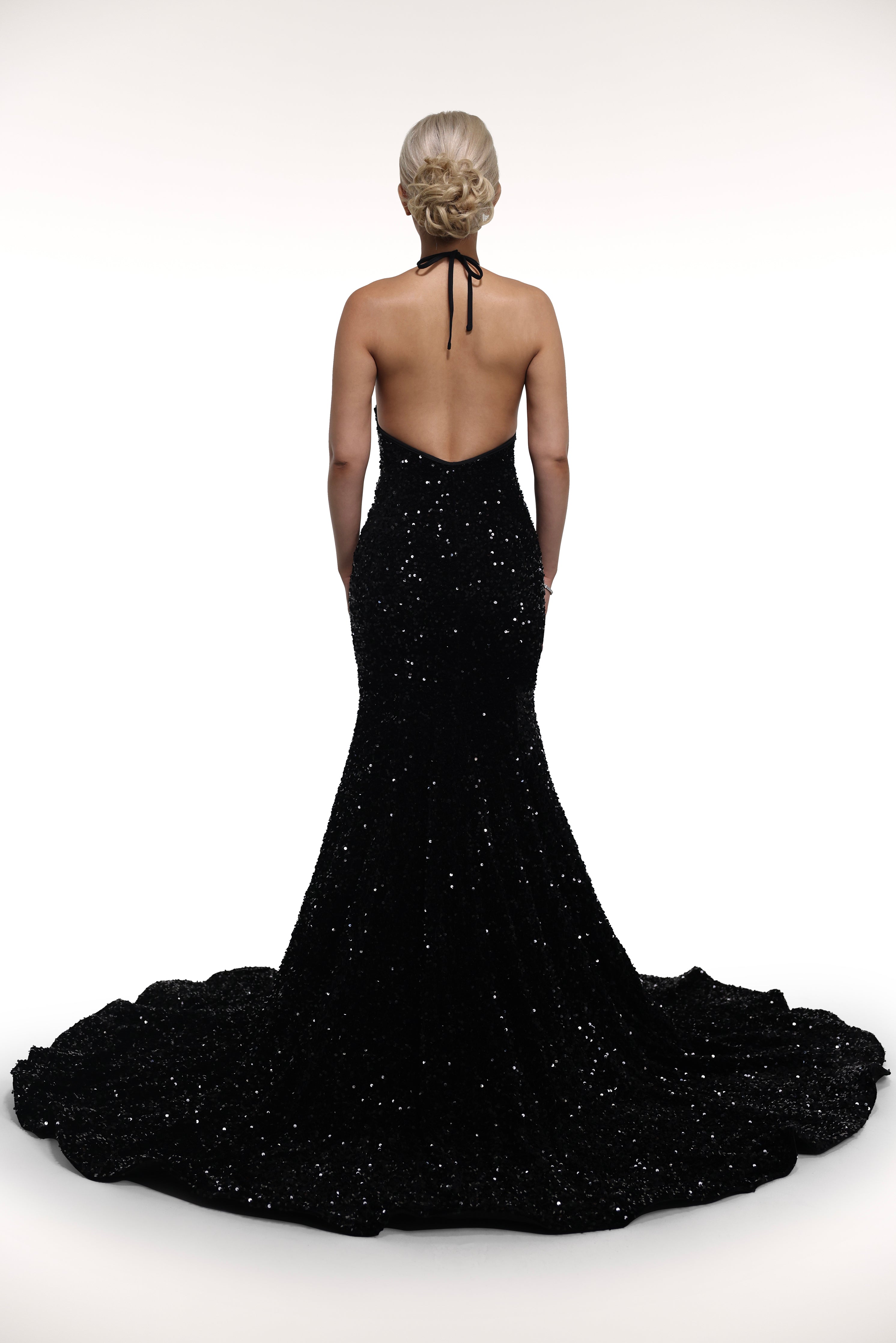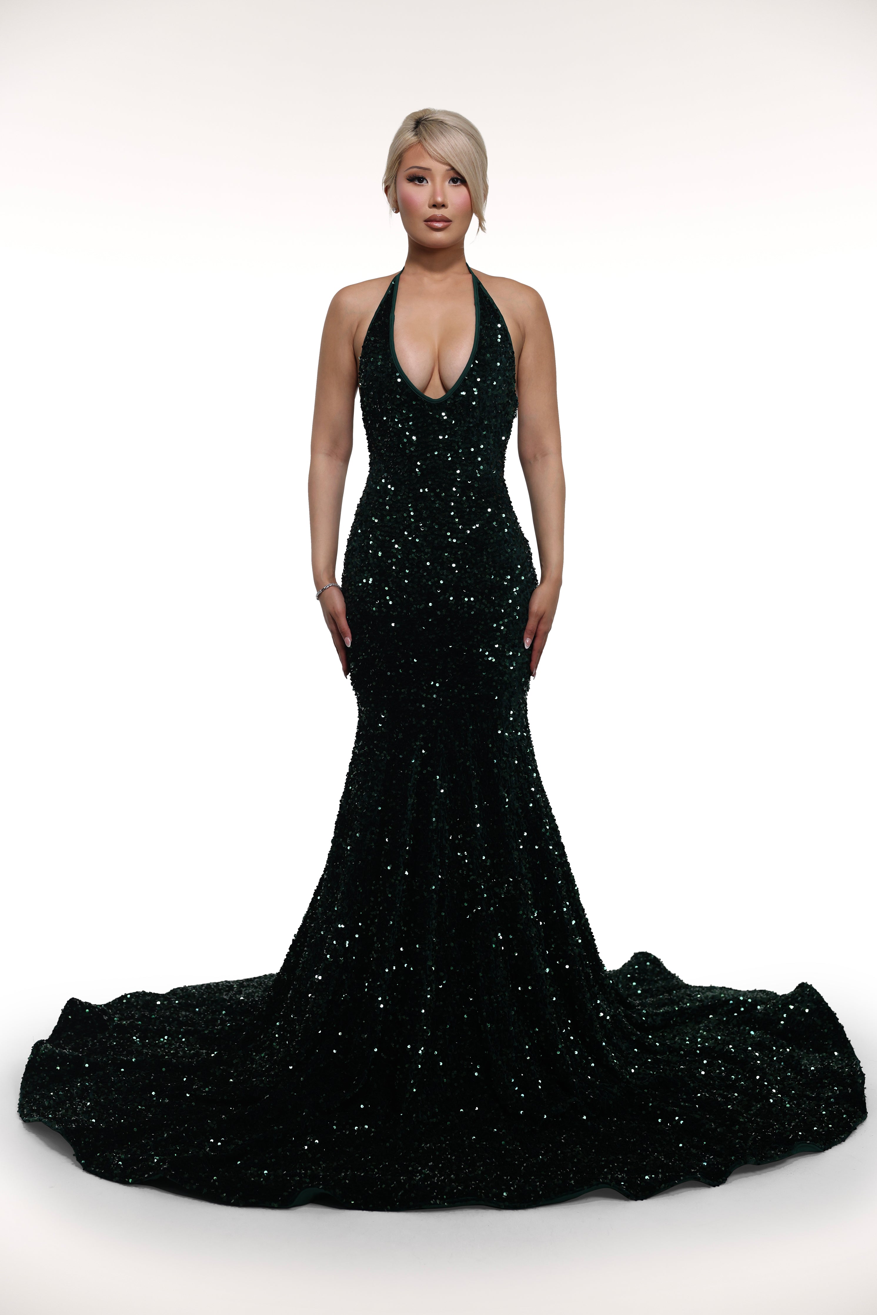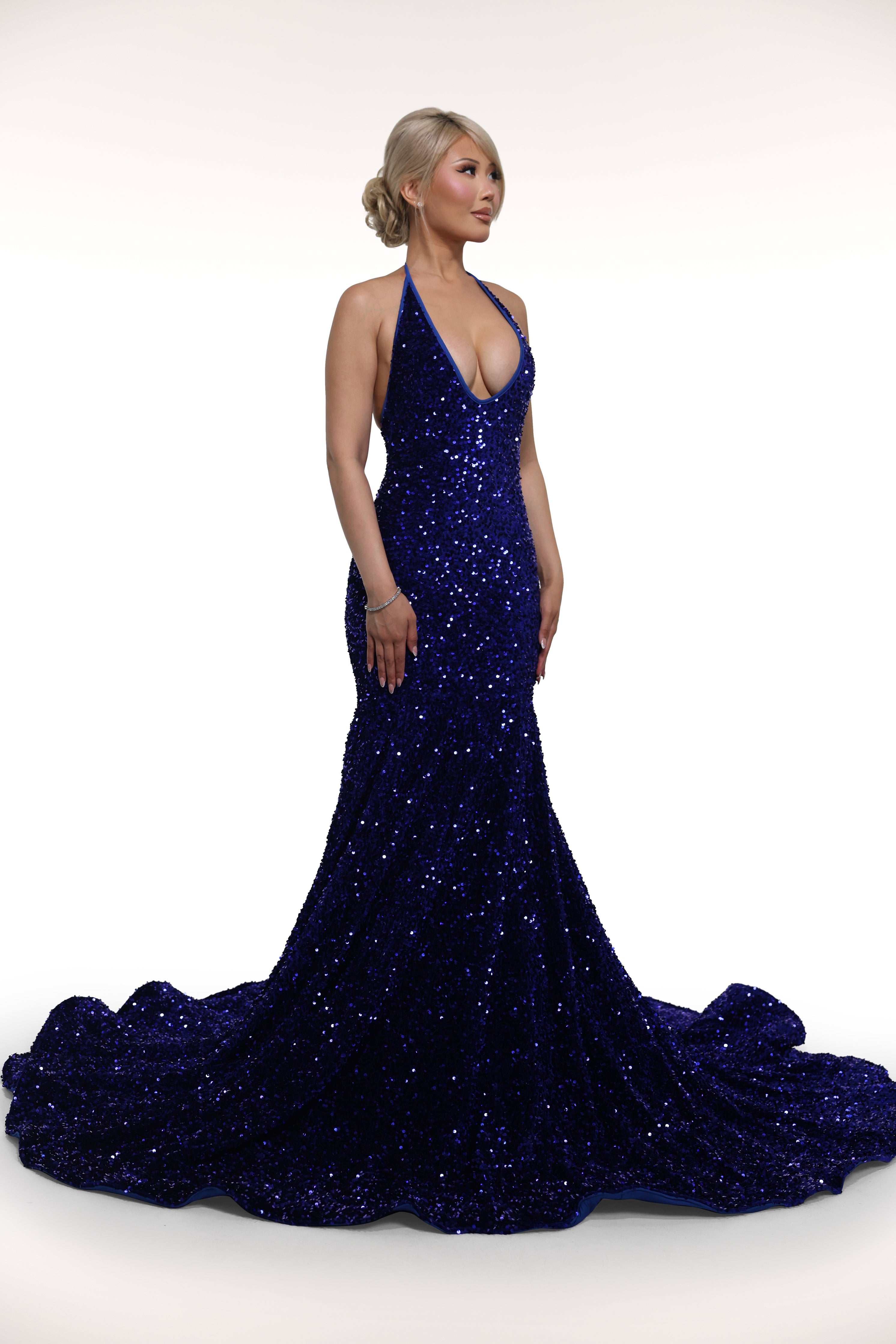 Dazzle and shine in our 'Emma Gown'. With a sequin halter neck, low back design, and velvet sequin fabric, you'll be the center of attention. Plus, the zipper on the side makes it easy to slip into (and out of).