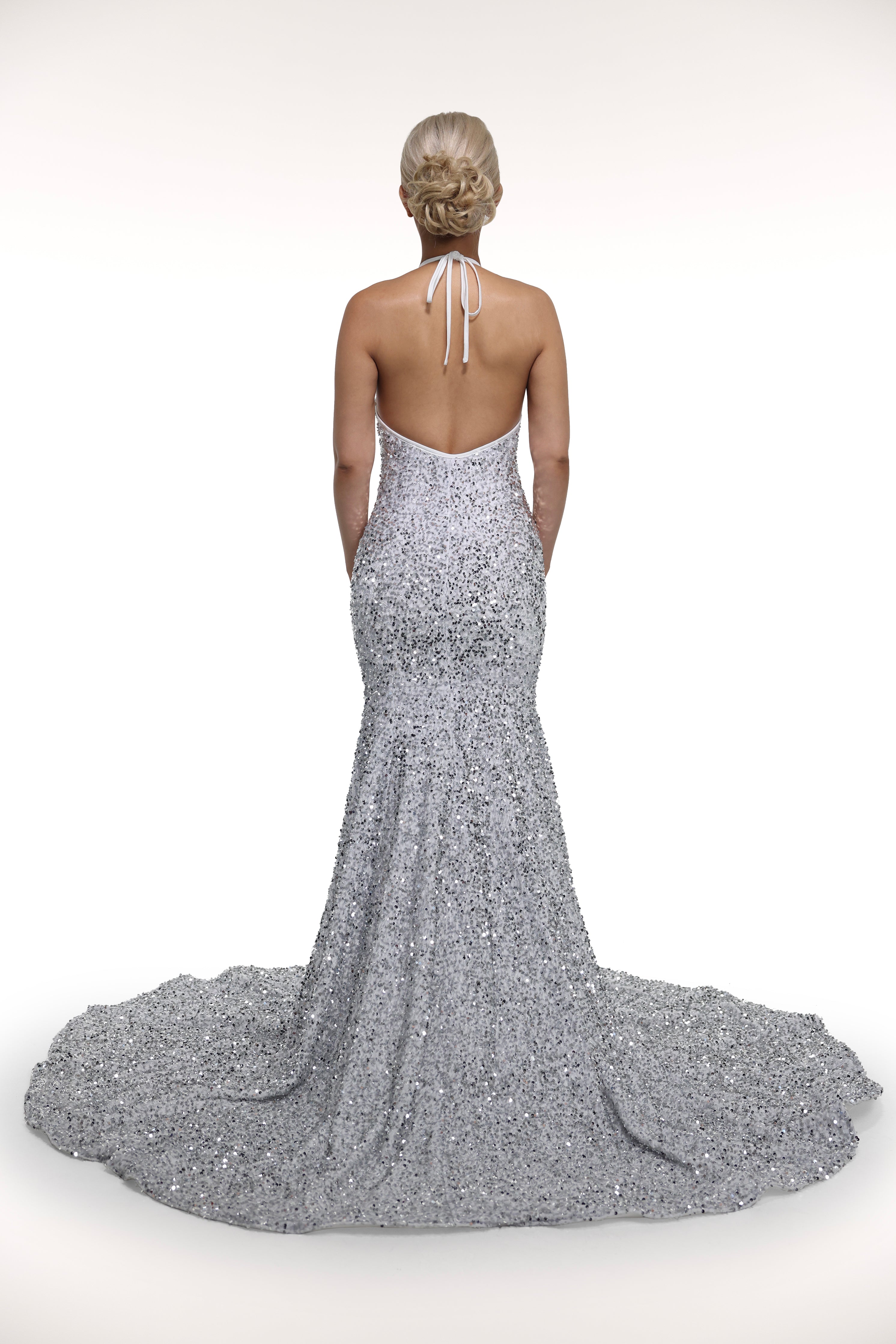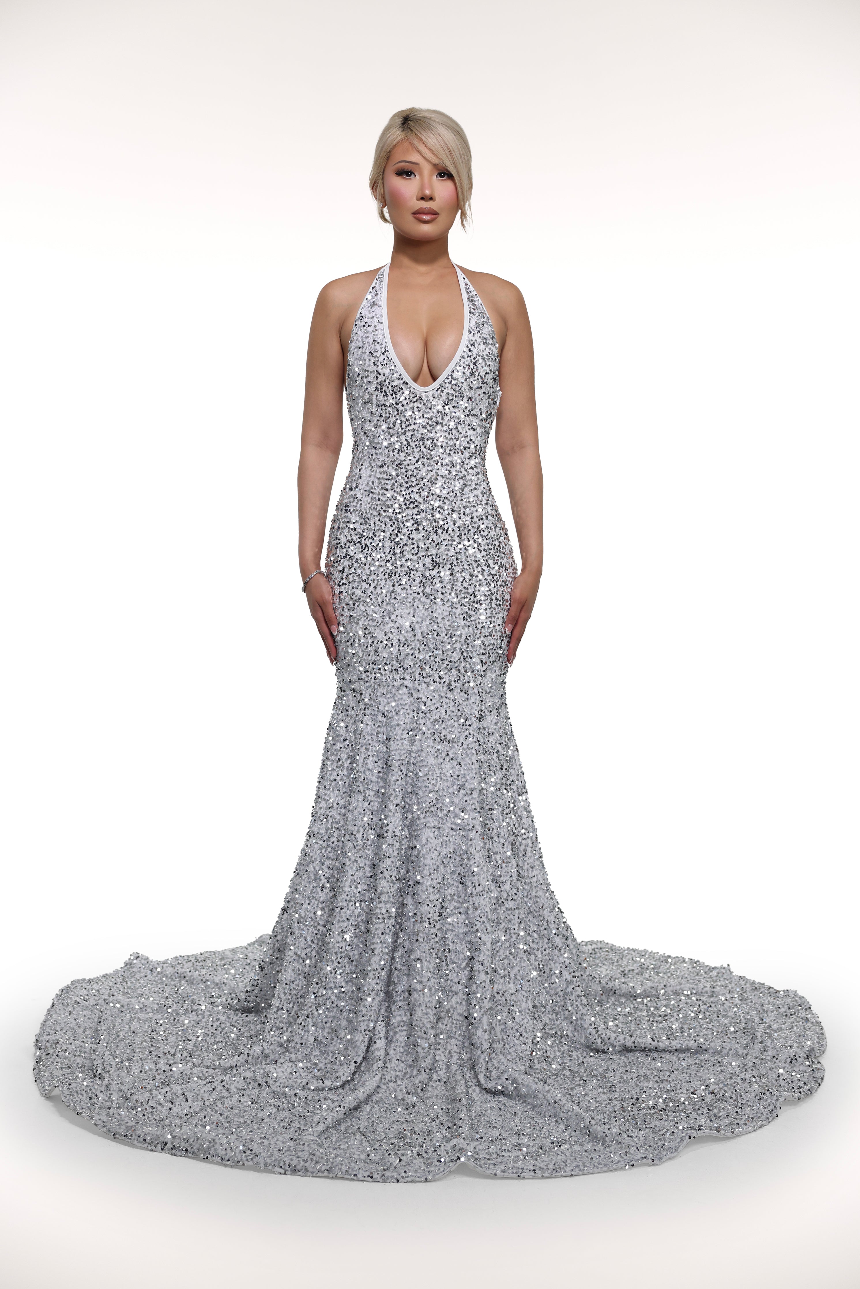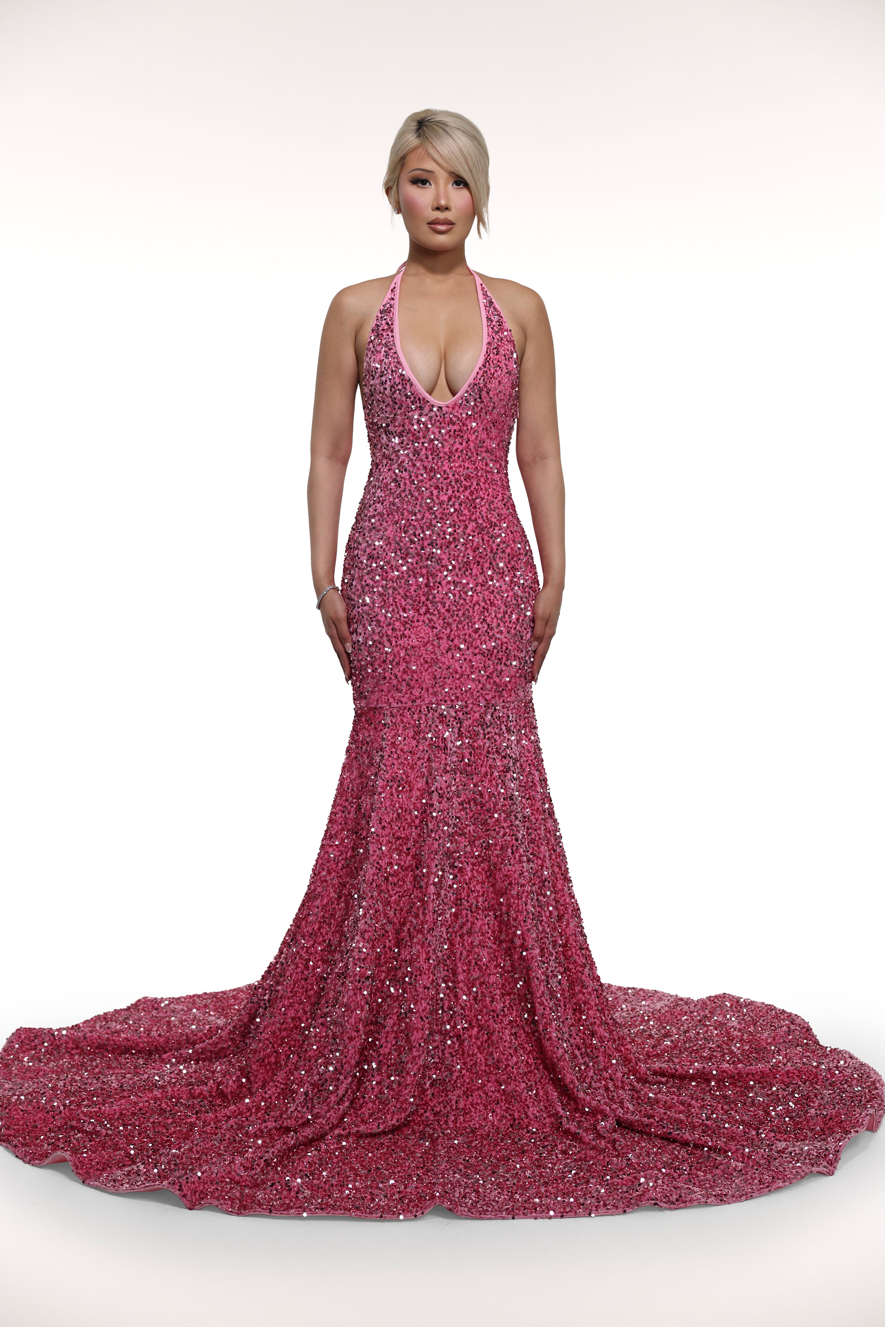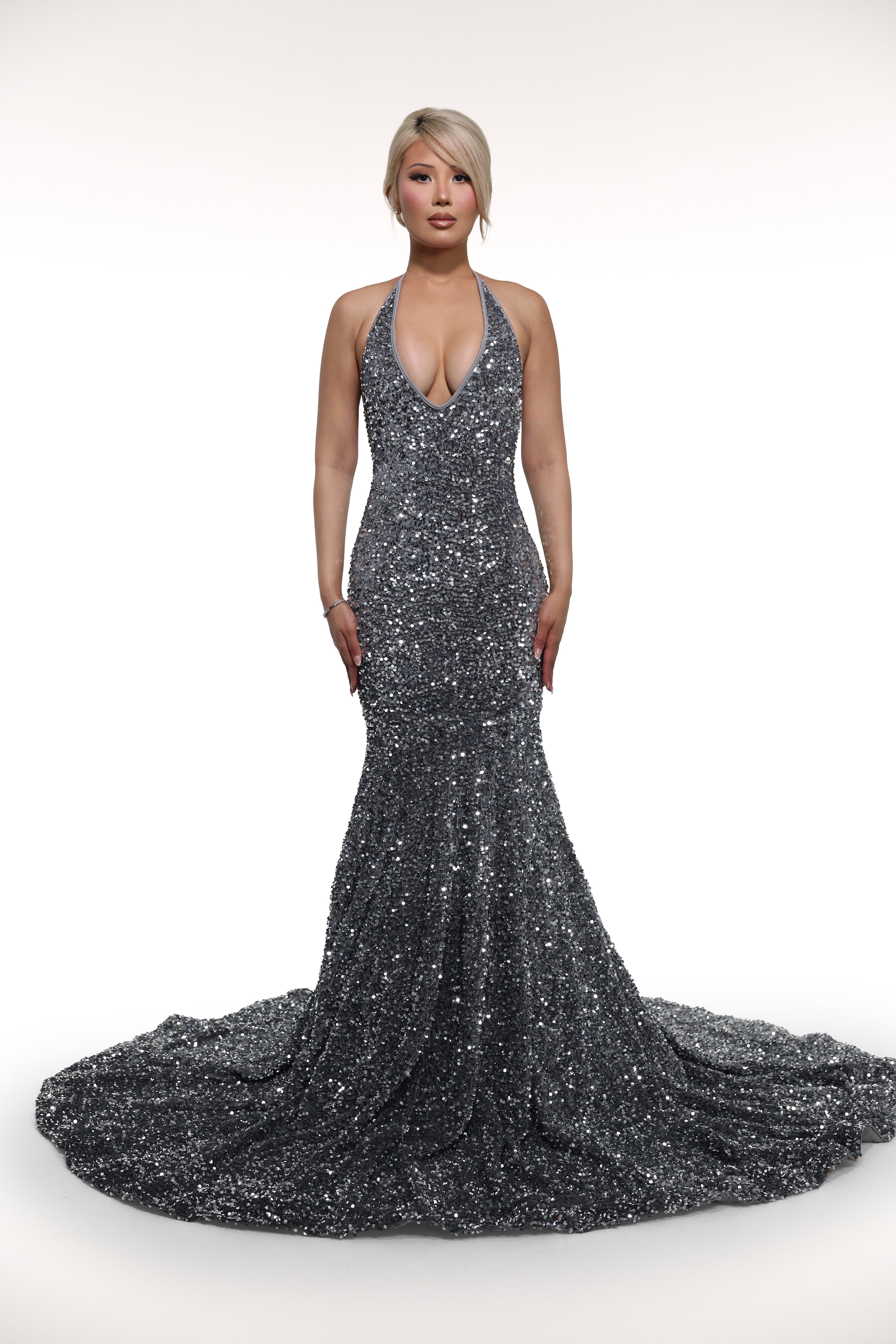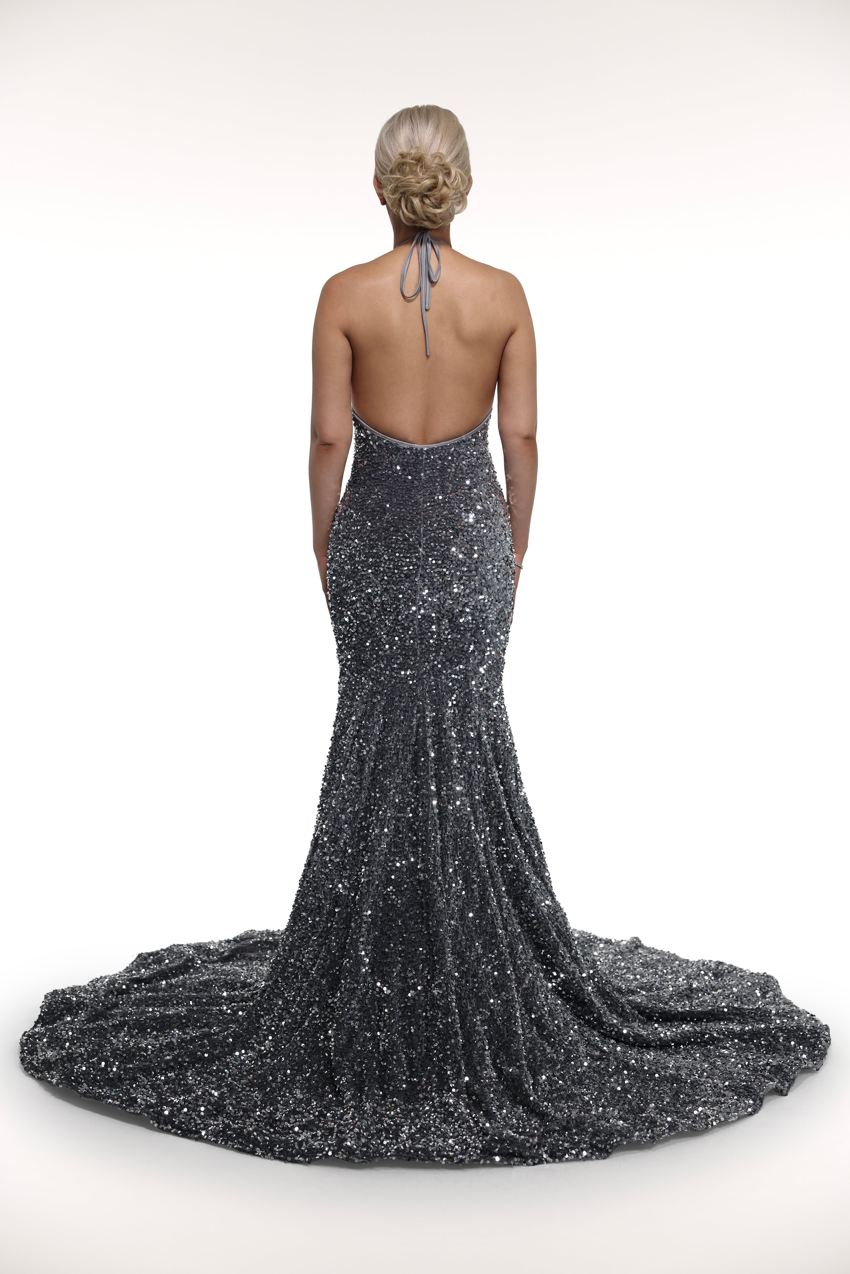 Dazzle and shine in our 'Emma Gown'. With a sequin halter neck, low back design, and velvet sequin fabric, you'll be the center of attention. Plus, the zipper on the side makes it easy to slip into (and out of).
