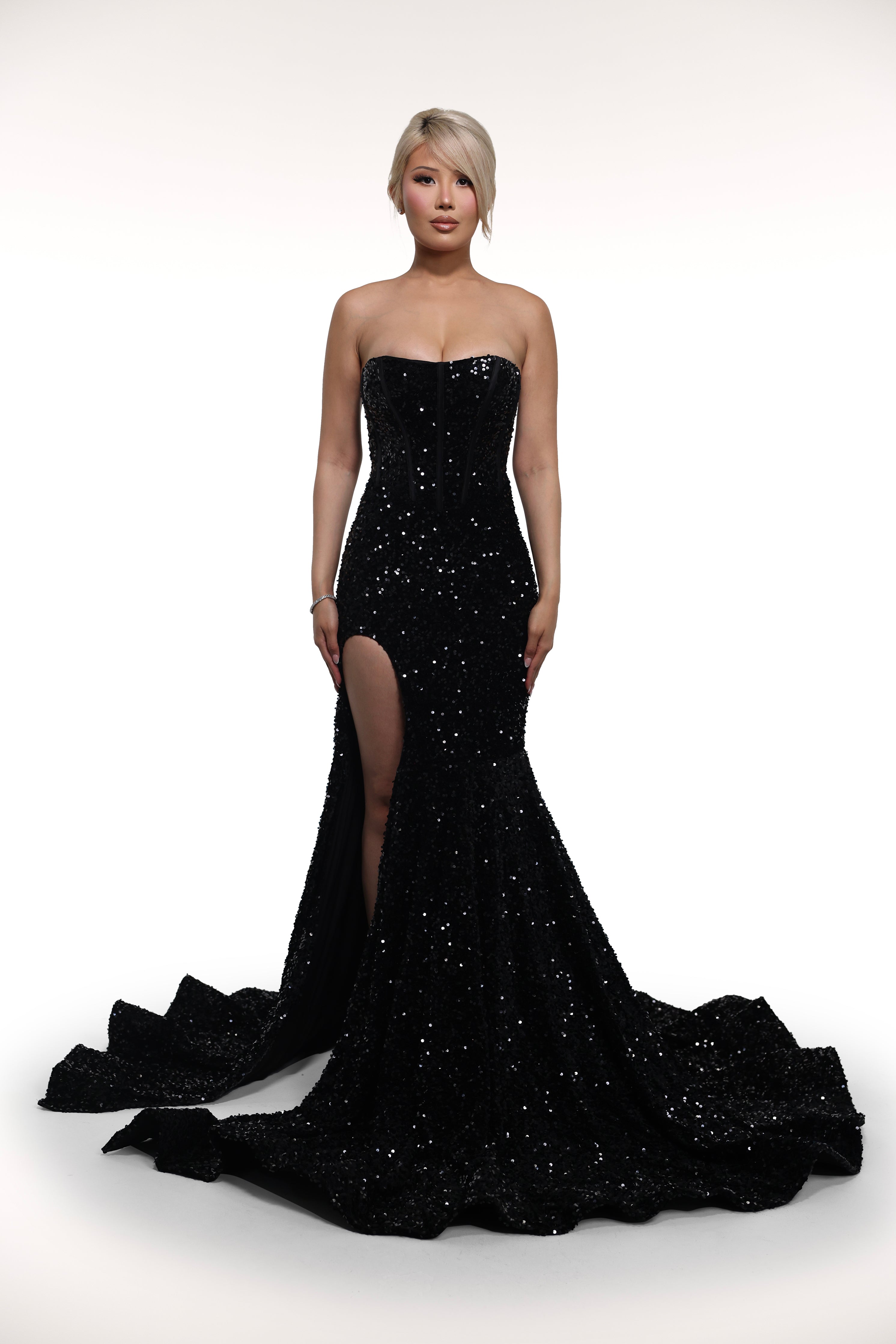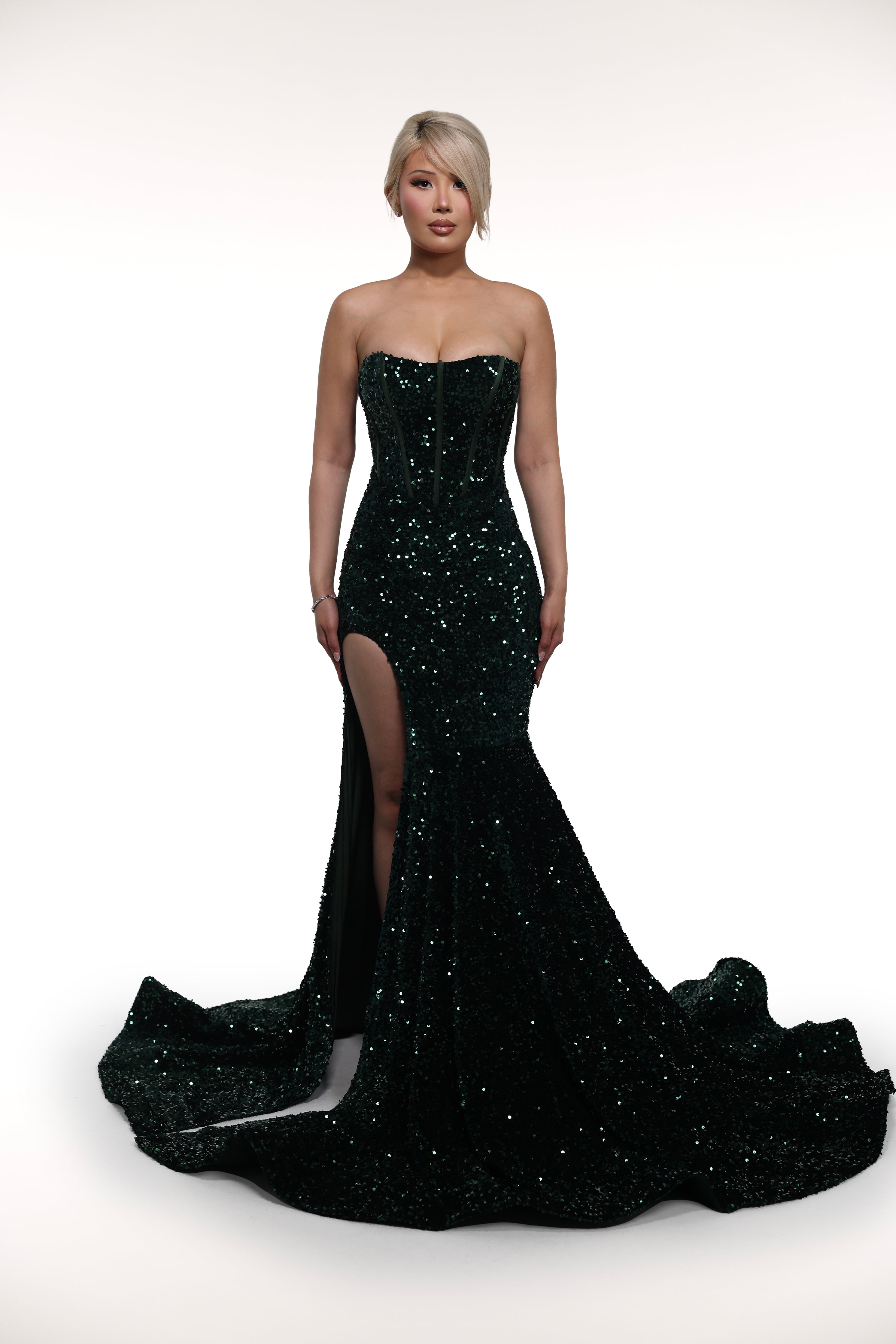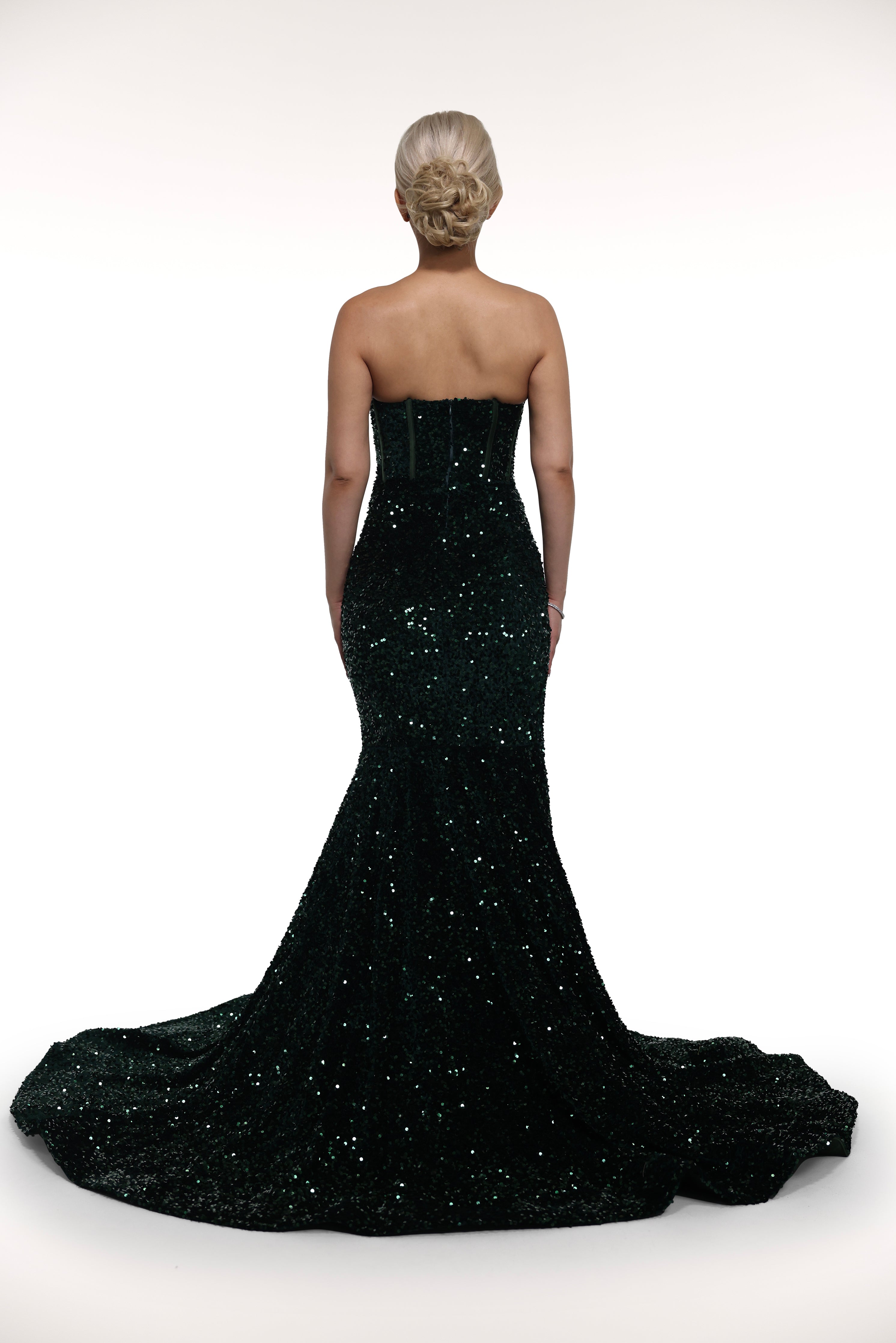 ‘Zeina’ gown a corset strapless dress made of sequin fabric with a slight stretch. It also features a slit and a mermaid silhouette that flares out into a train.