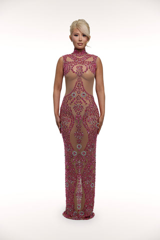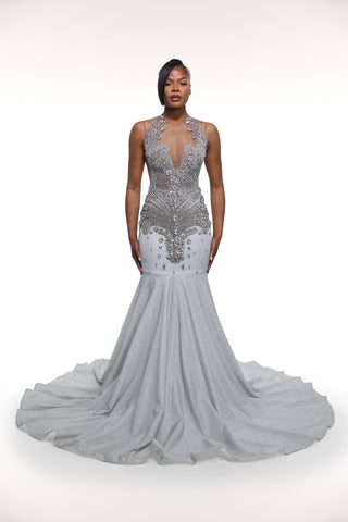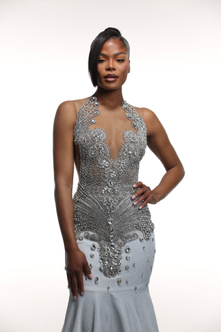 A person models a stunning, form-fitting bronze evening gown with intricate beadwork, standing beside a decorative mirror