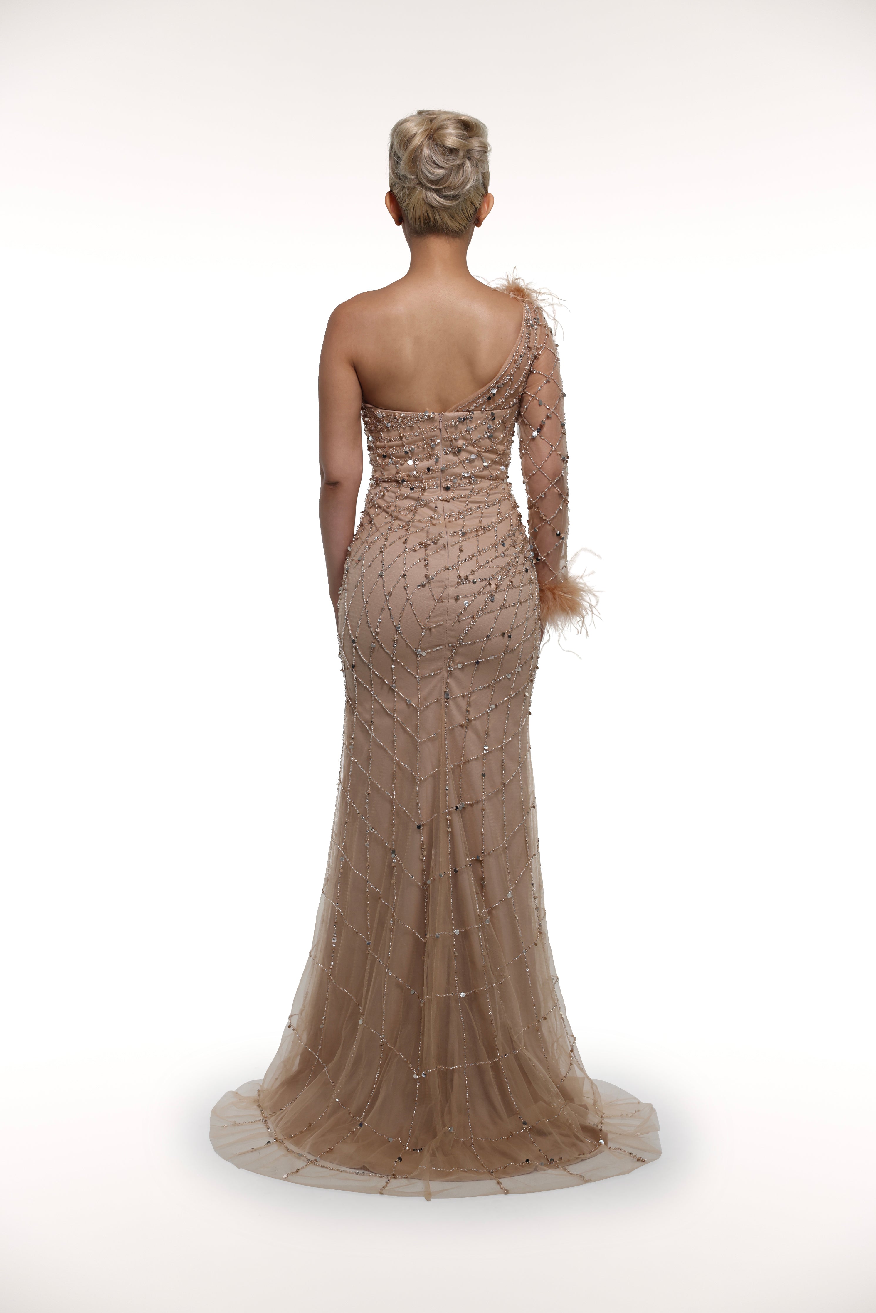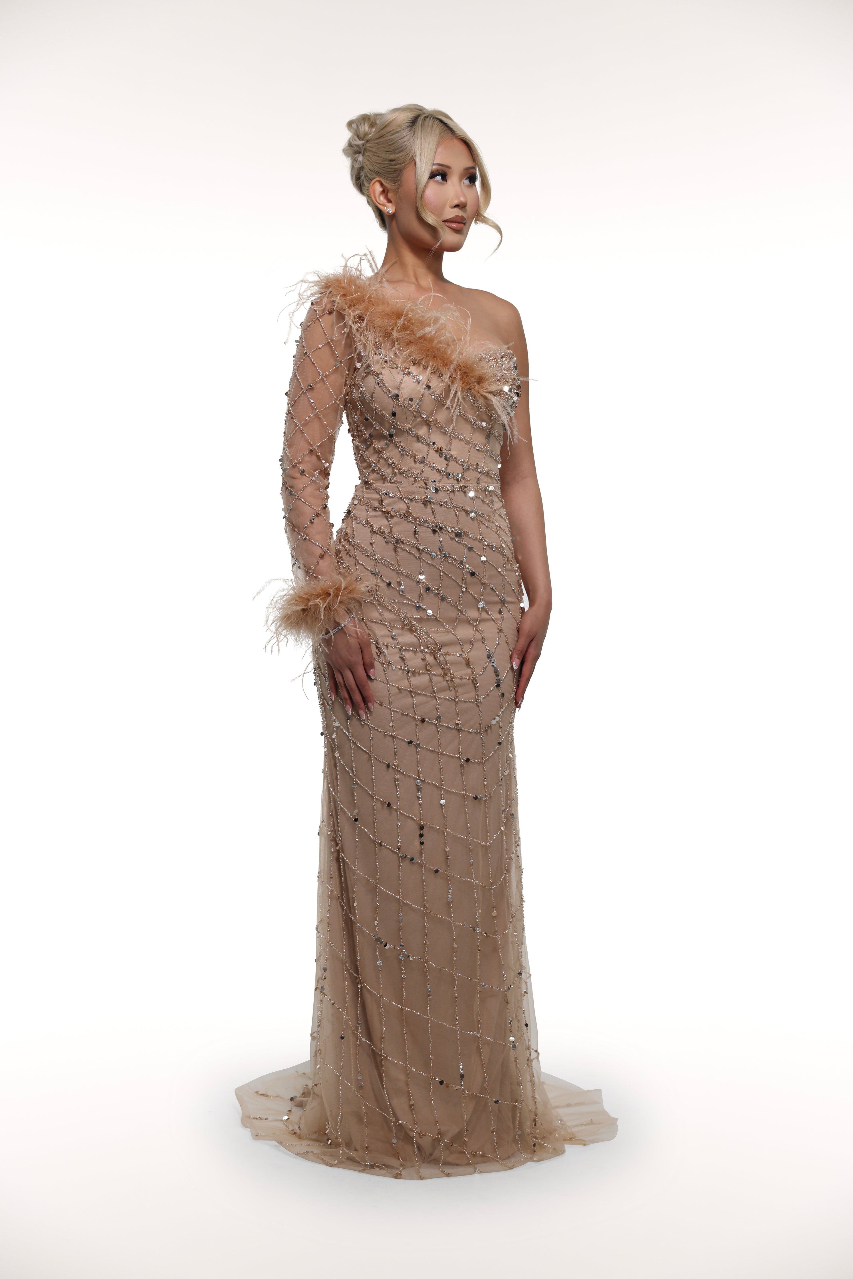 Introducing the elegant 'Bubbly' gown, featuring a unique design with one sleeve and beautiful feather embellishments along the wrist and chest. Exude sophistication and style with this must-have addition to your wardrobe.