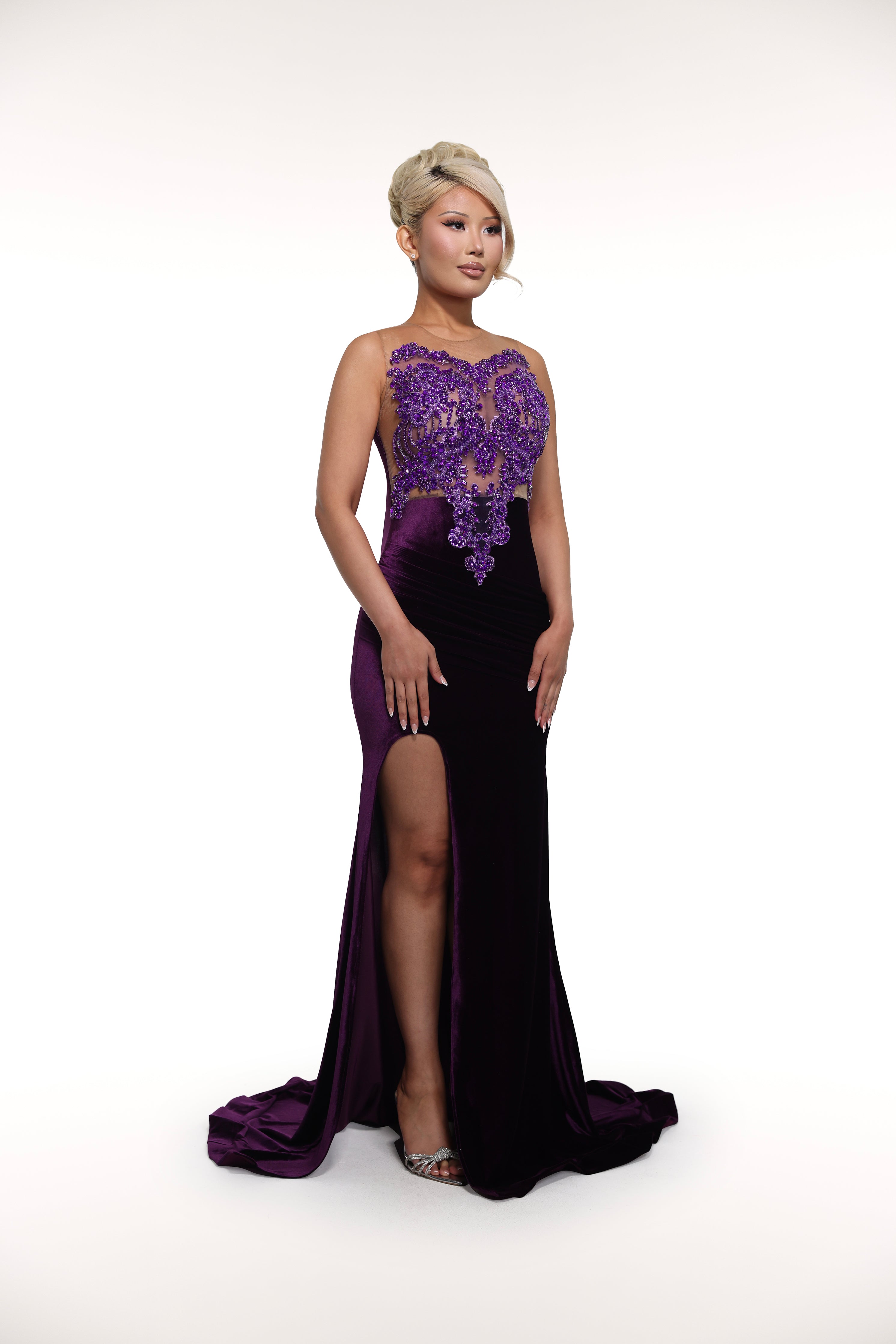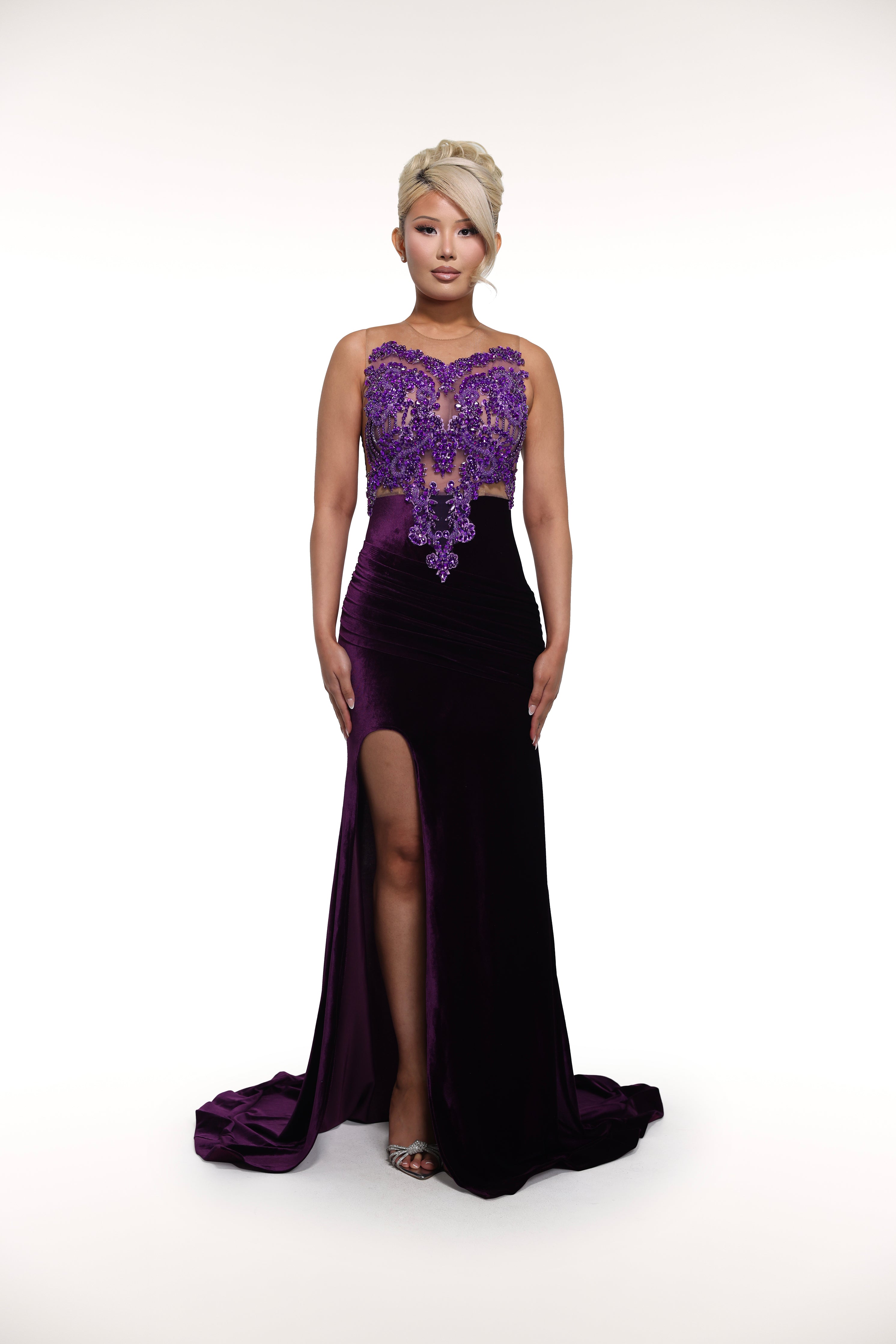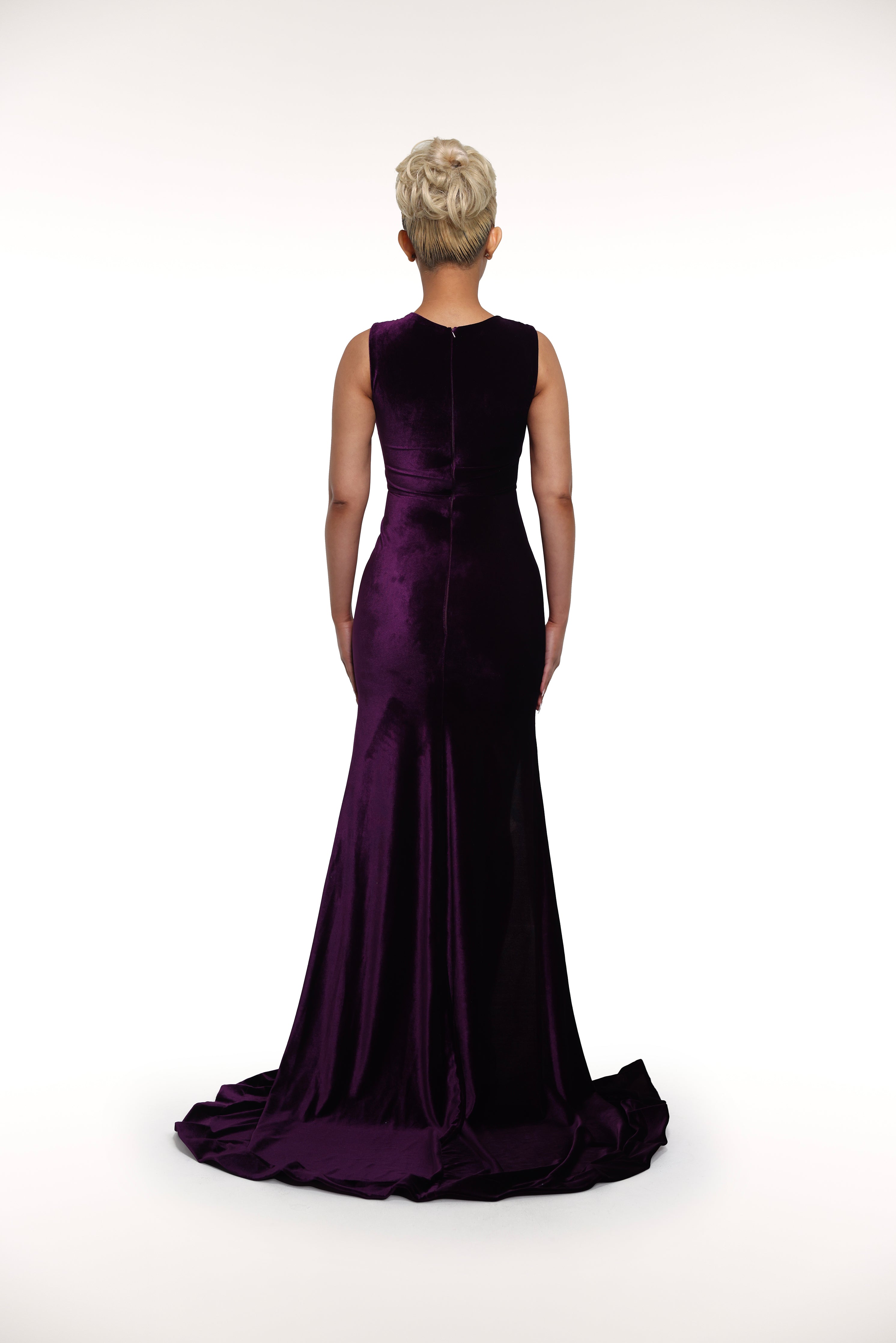 'Edrei' is made from a velvet fabric. It features an a-line silhouette with a slit at the side, a train at back and a sleeveless beaded mesh top.
