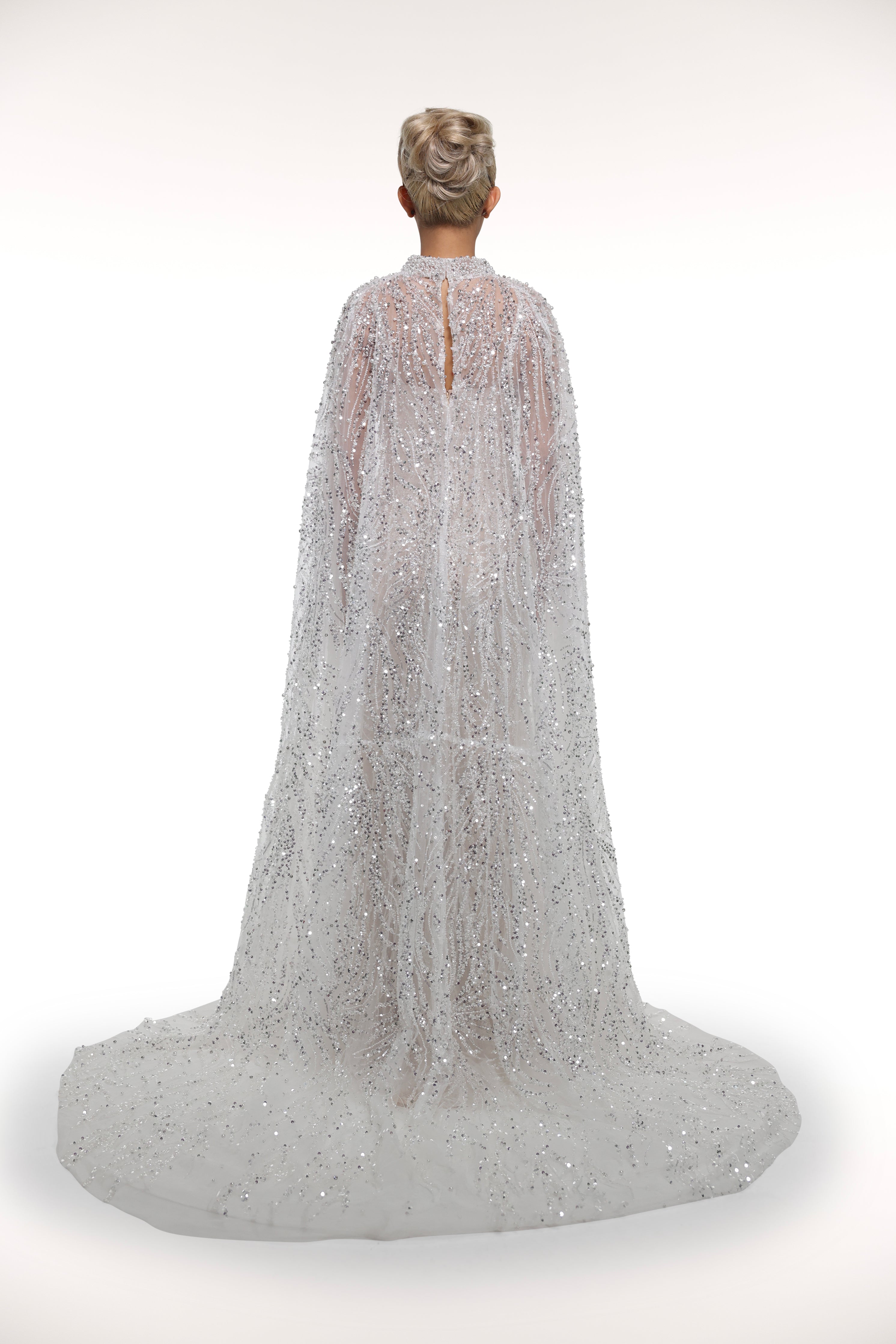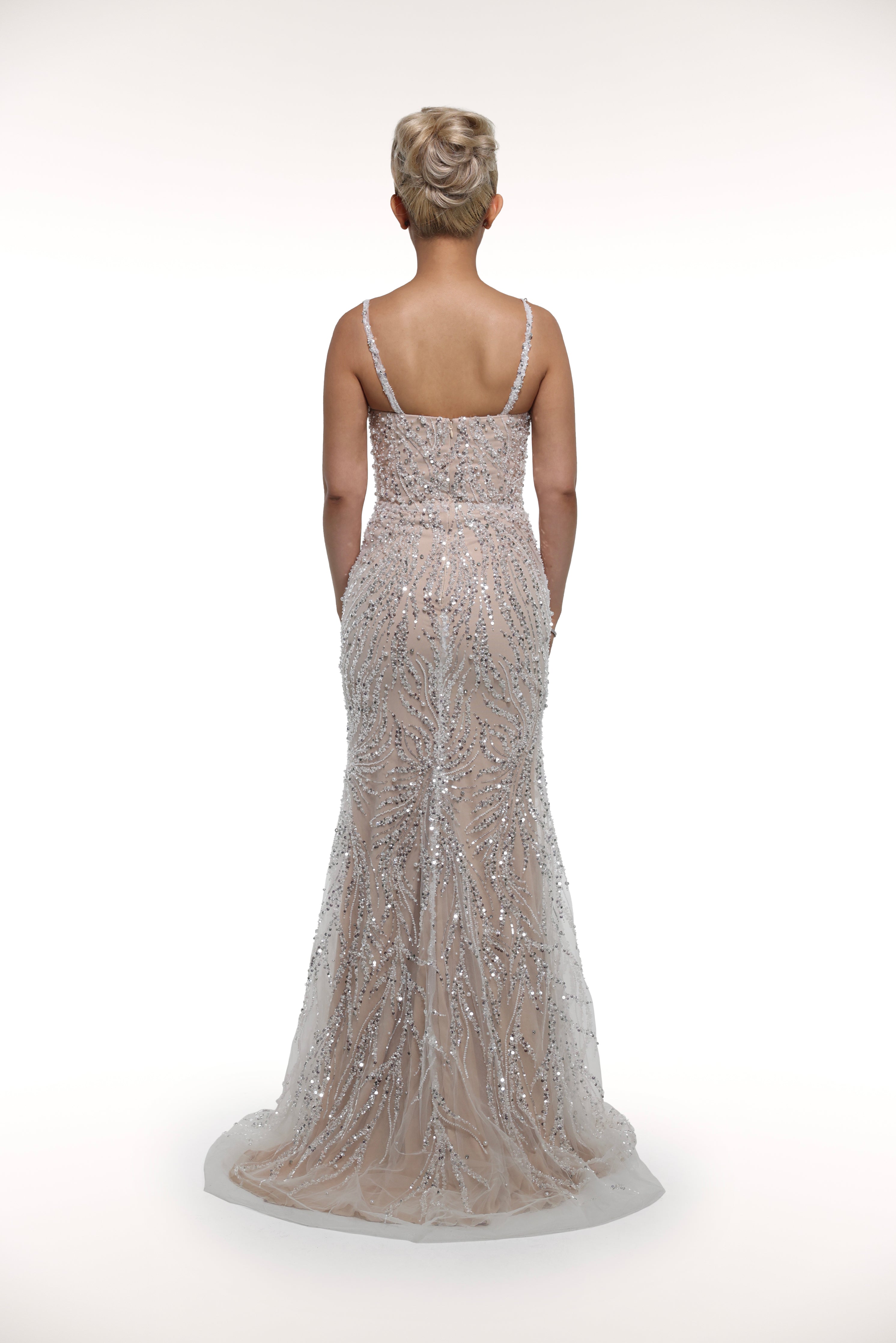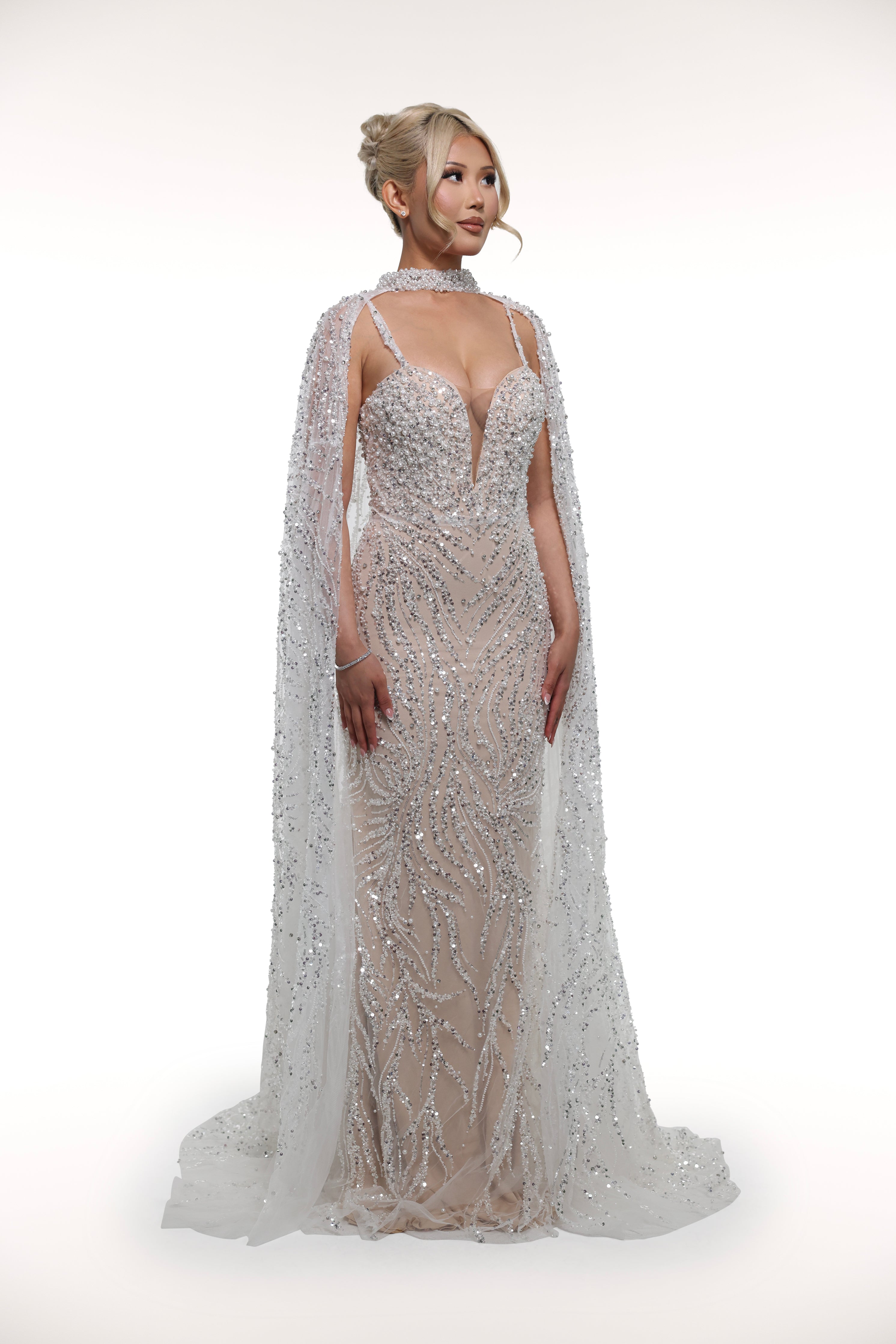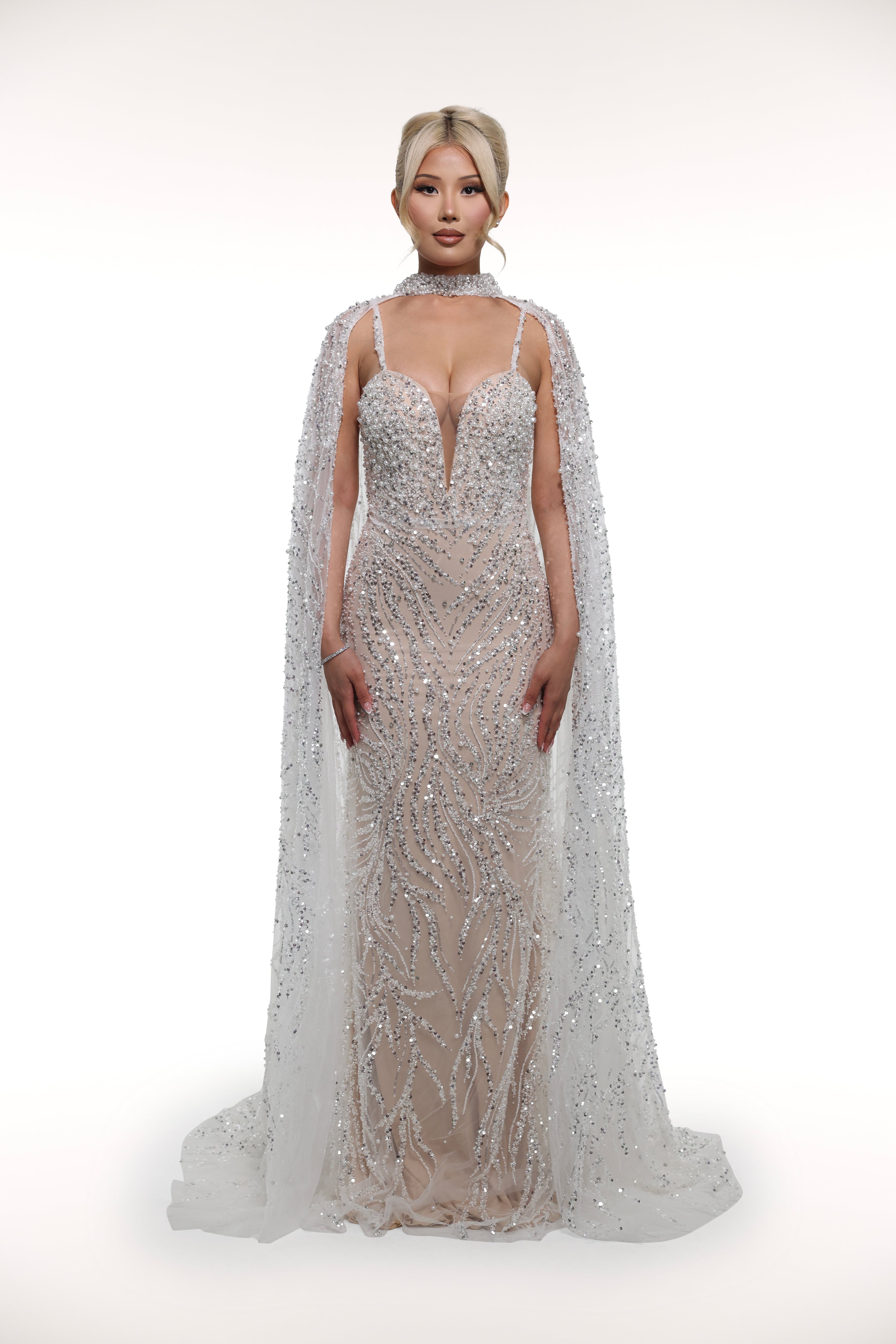 'Dova': A true masterpiece, this gown is a breathtaking fusion of sophistication and luxury. The nude lining accentuates your curves, while the delicate white tulle and intricate beading add an exquisite touch