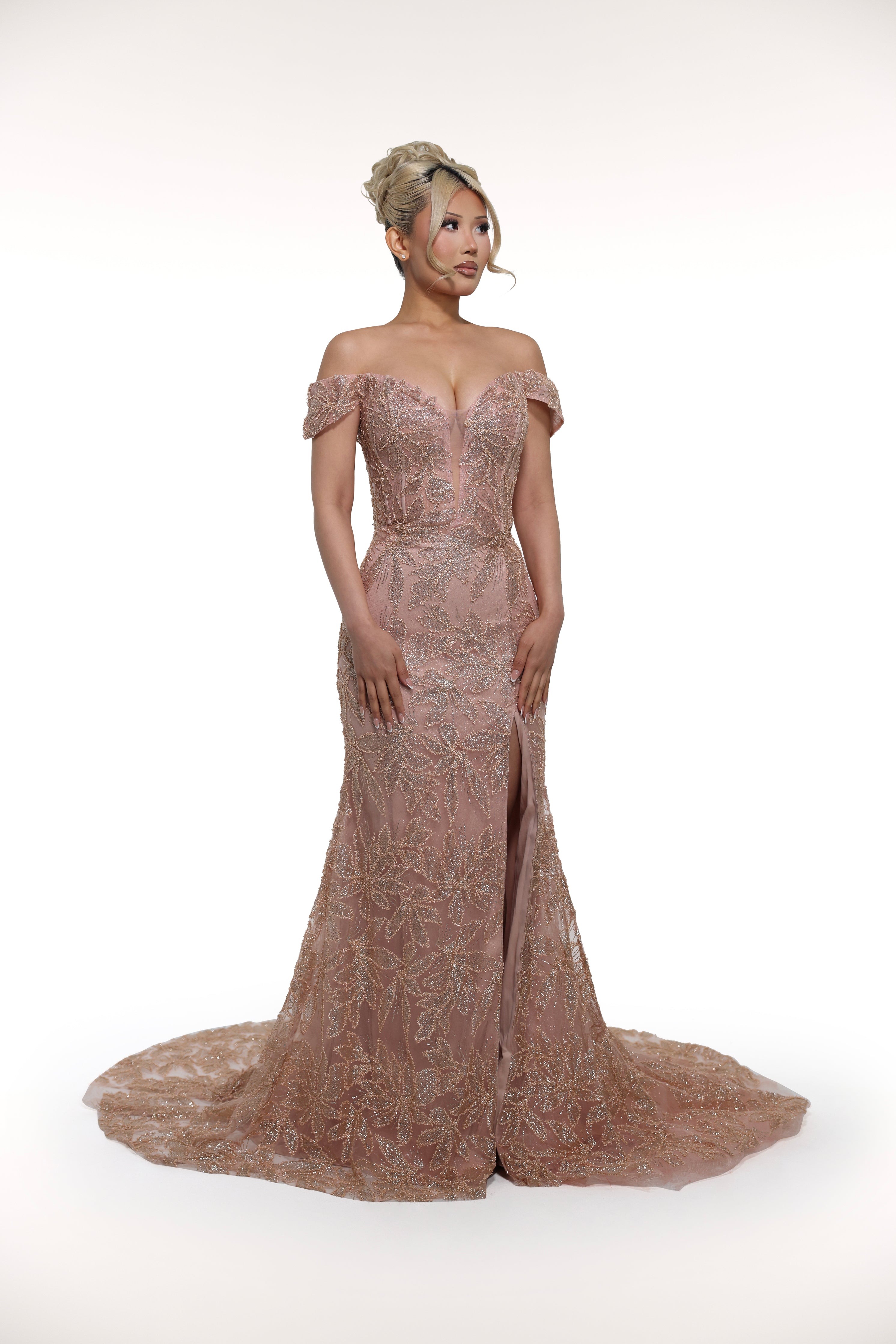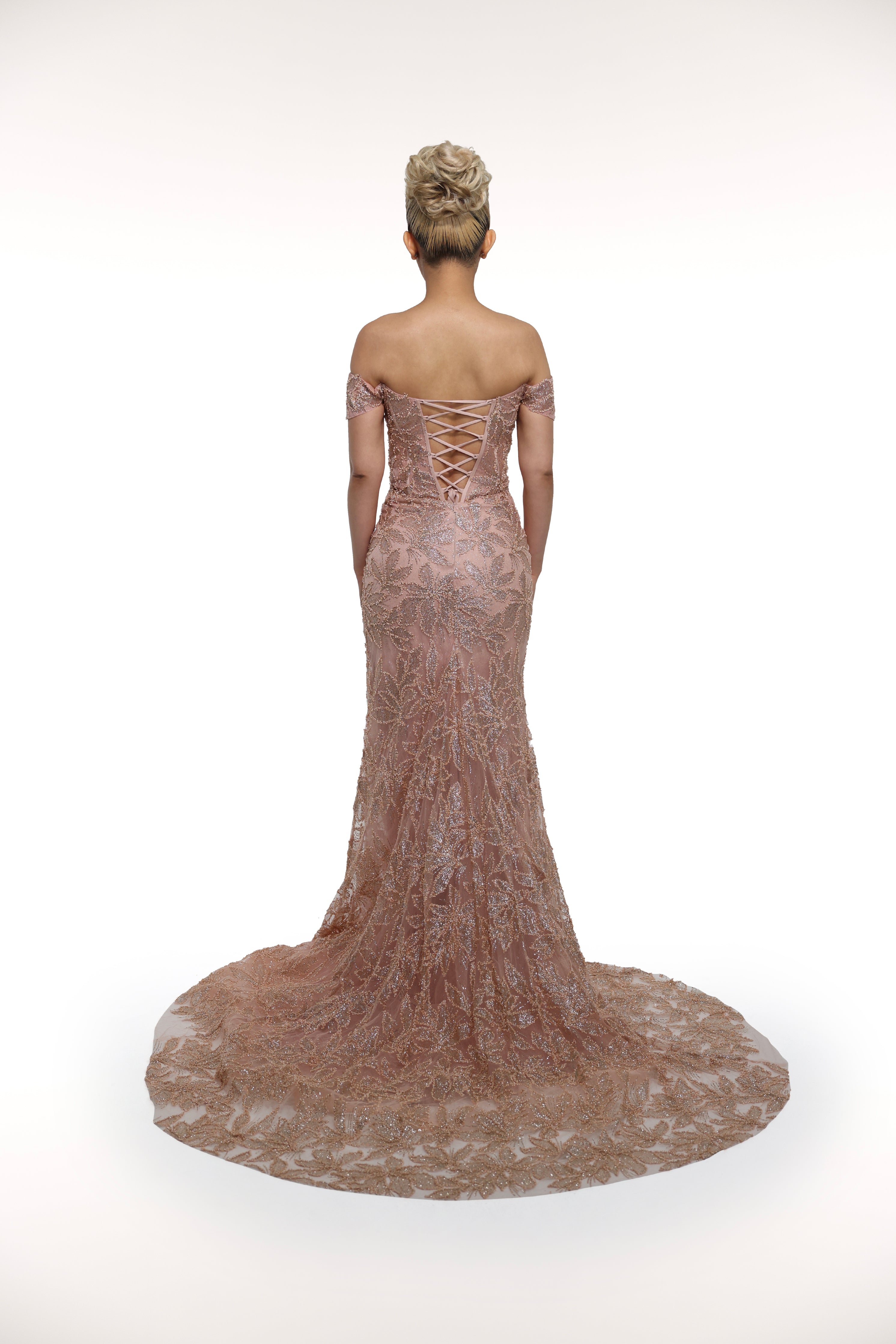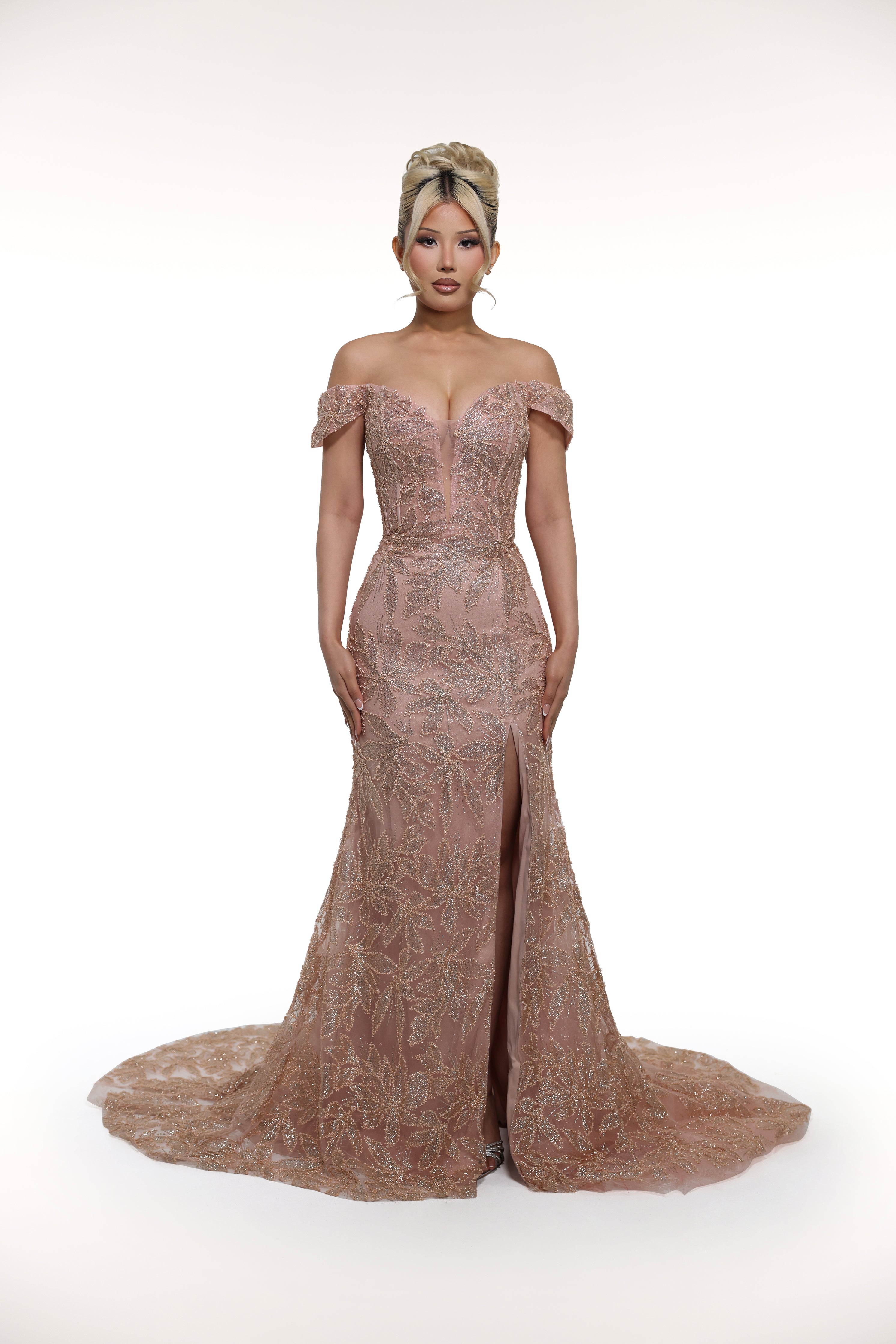 Feel like a glamorous garden nymph in our 'Florena' gown! This off shoulder dress features a glittery floral design that shines in every light. The beige lining adds a touch of elegance while the left leg slit and long train bring a dramatic flair. Be the belle of the ball in Florena.