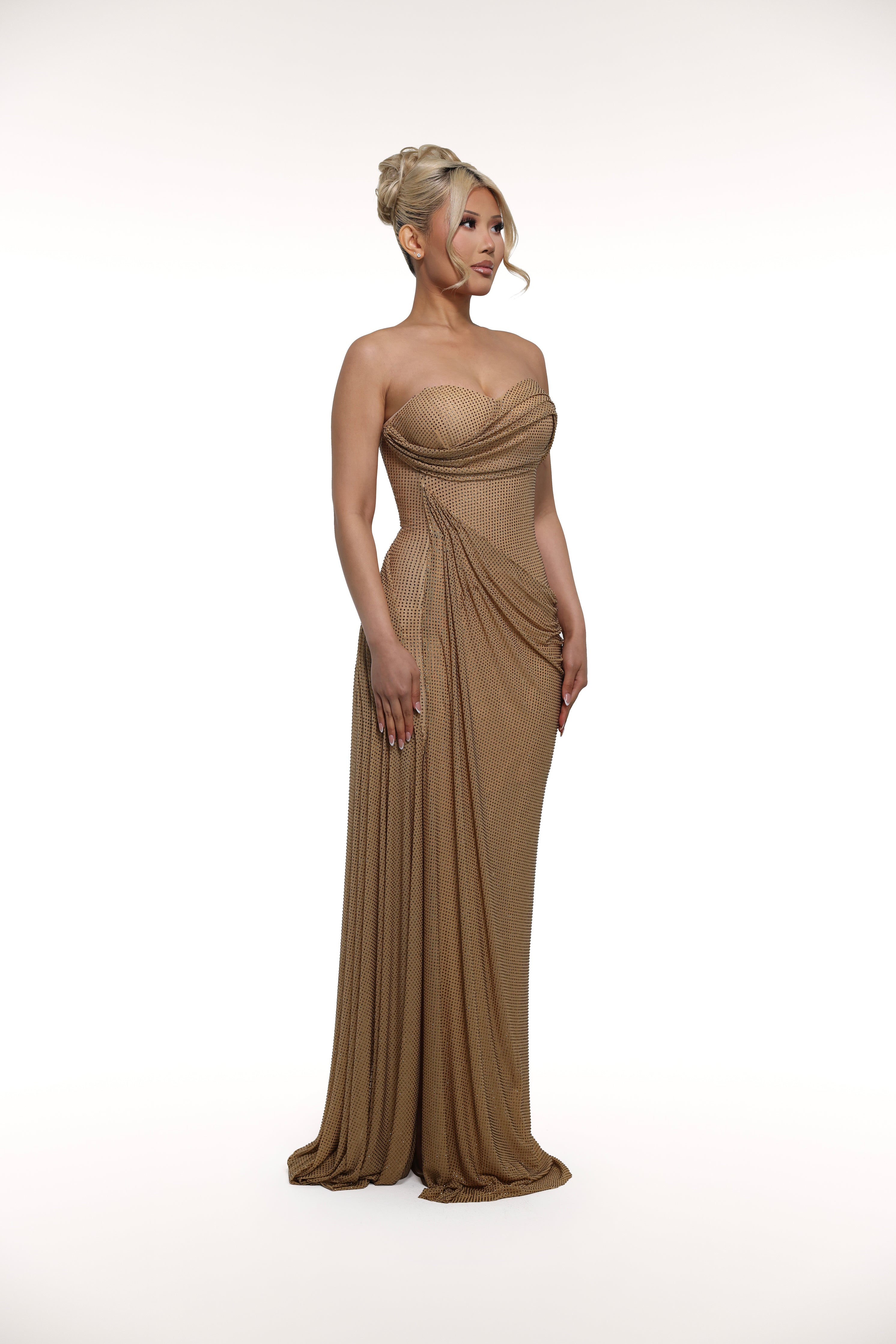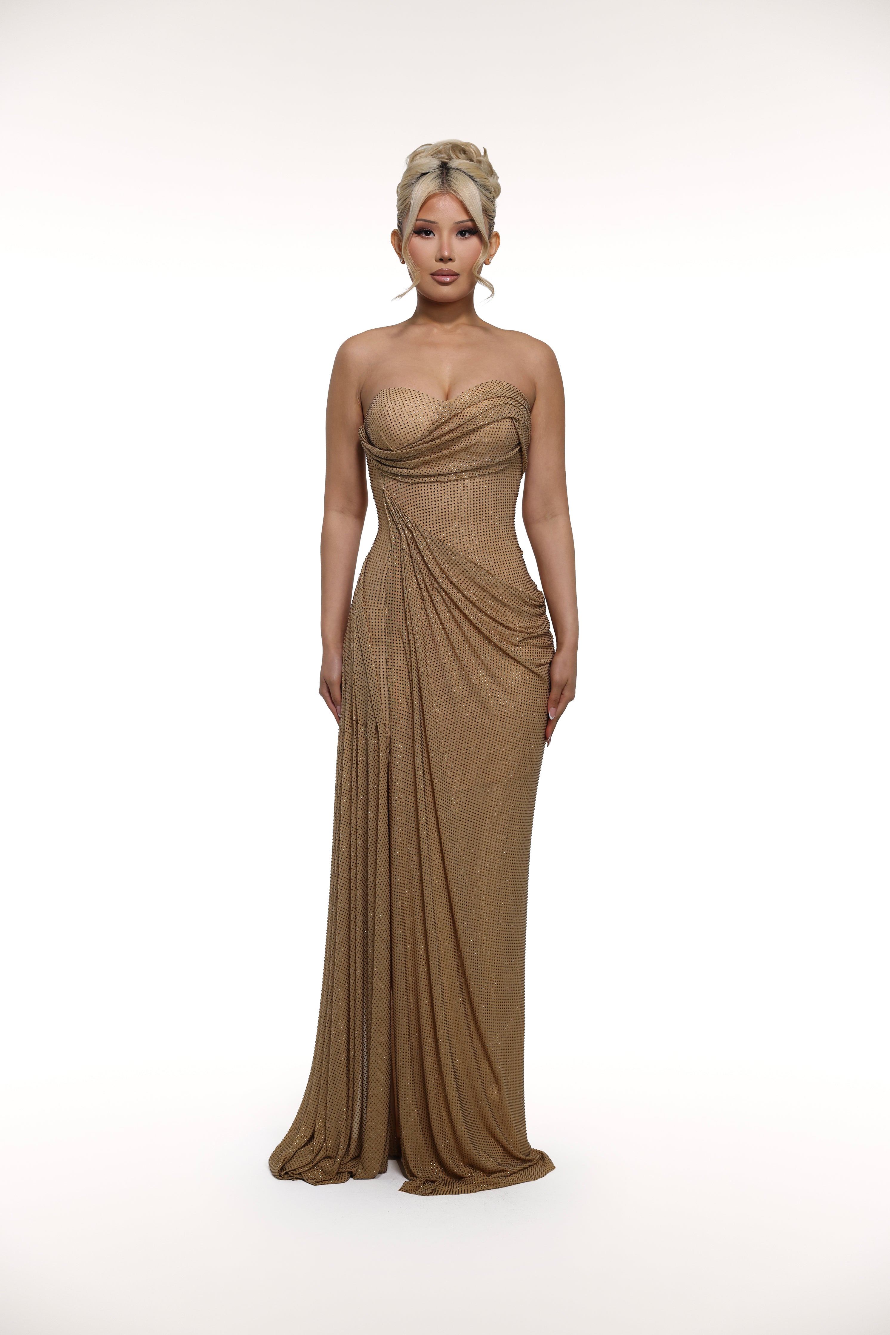 Add a touch of glamour to your wardrobe with 'Gala' glittery fabric and draped style. The one-tone design exudes elegance and greek vibes, making it perfect for any occasion. A slit on the right leg and draped fabric along the front and back of the dress looks absolutely stunning in and of its own.