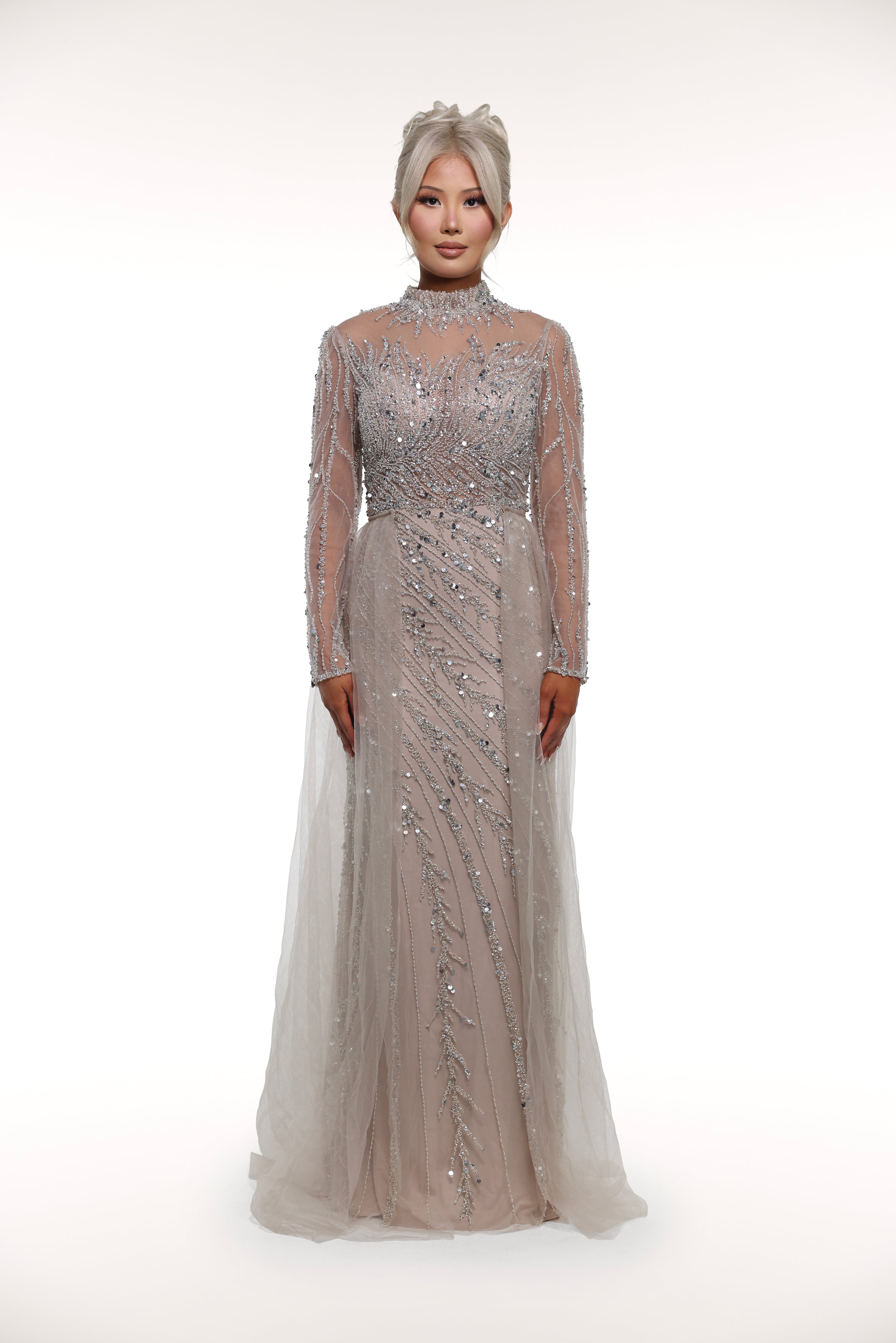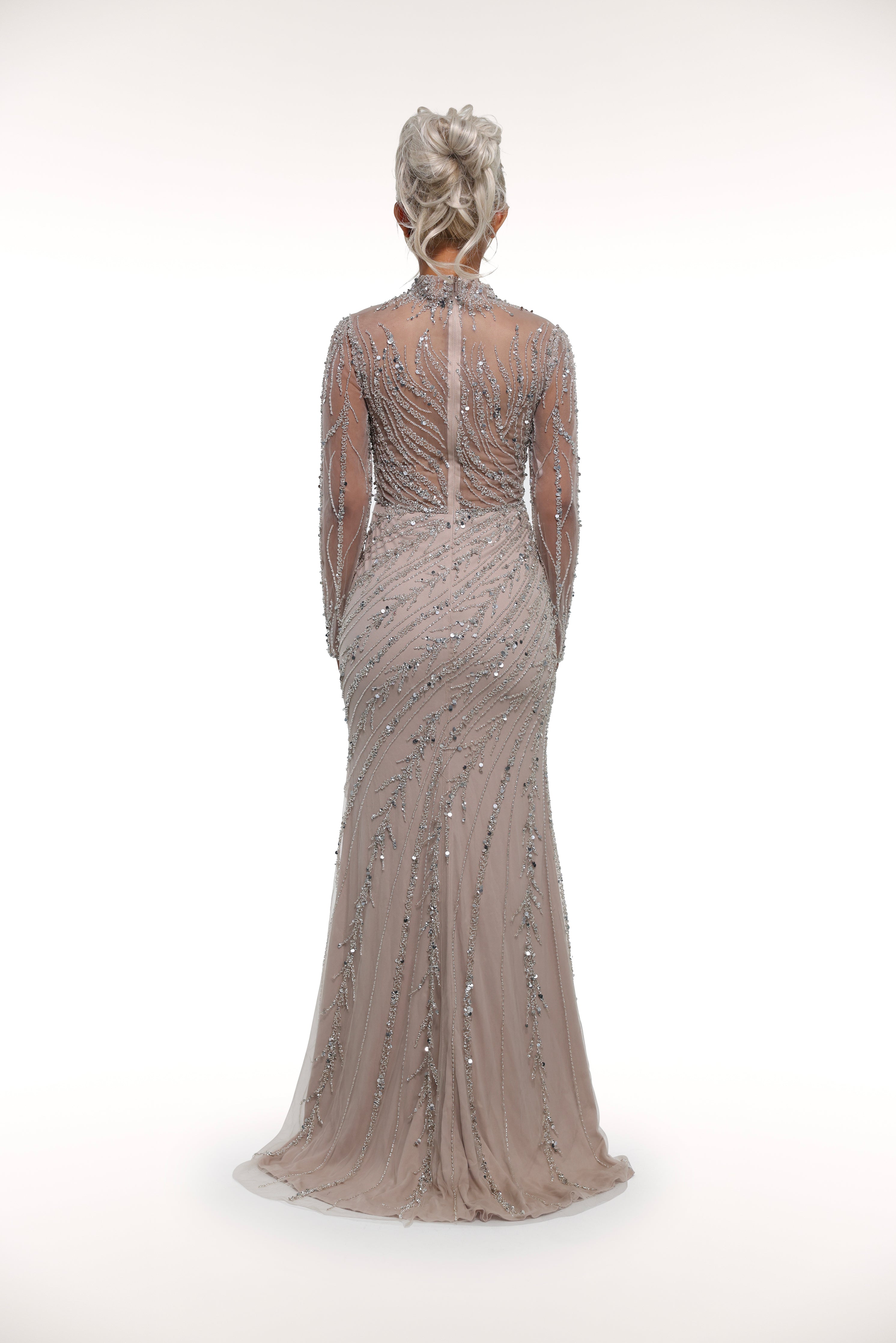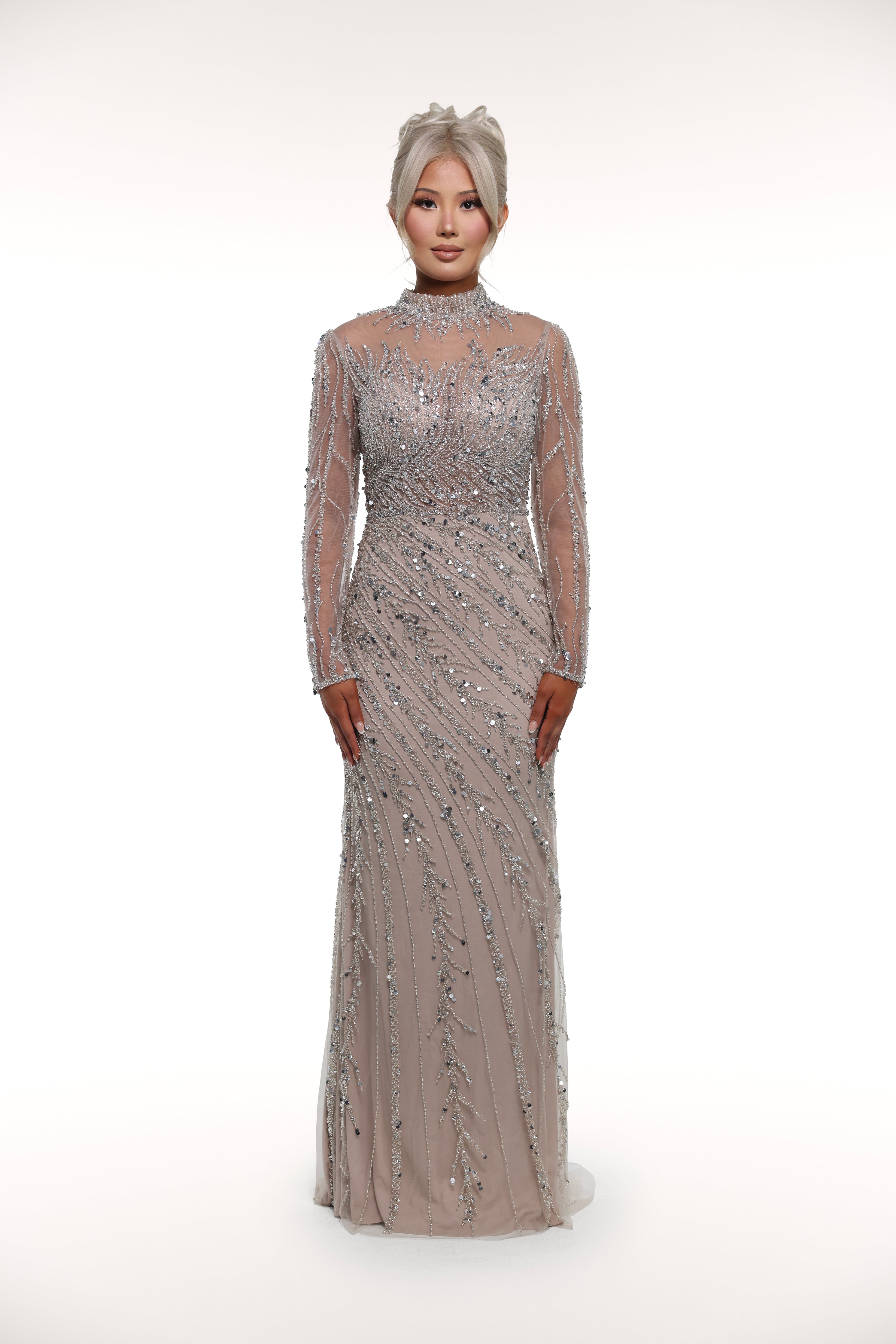 Expertly crafted, the 'Ismara' is a long sleeve embellished gown. With delicate mesh sleeves, a high turtle neck, and a zipper back, this gown is both elegant and functional. The nude lining adds a touch of sophistication, making it perfect for any special occasion.