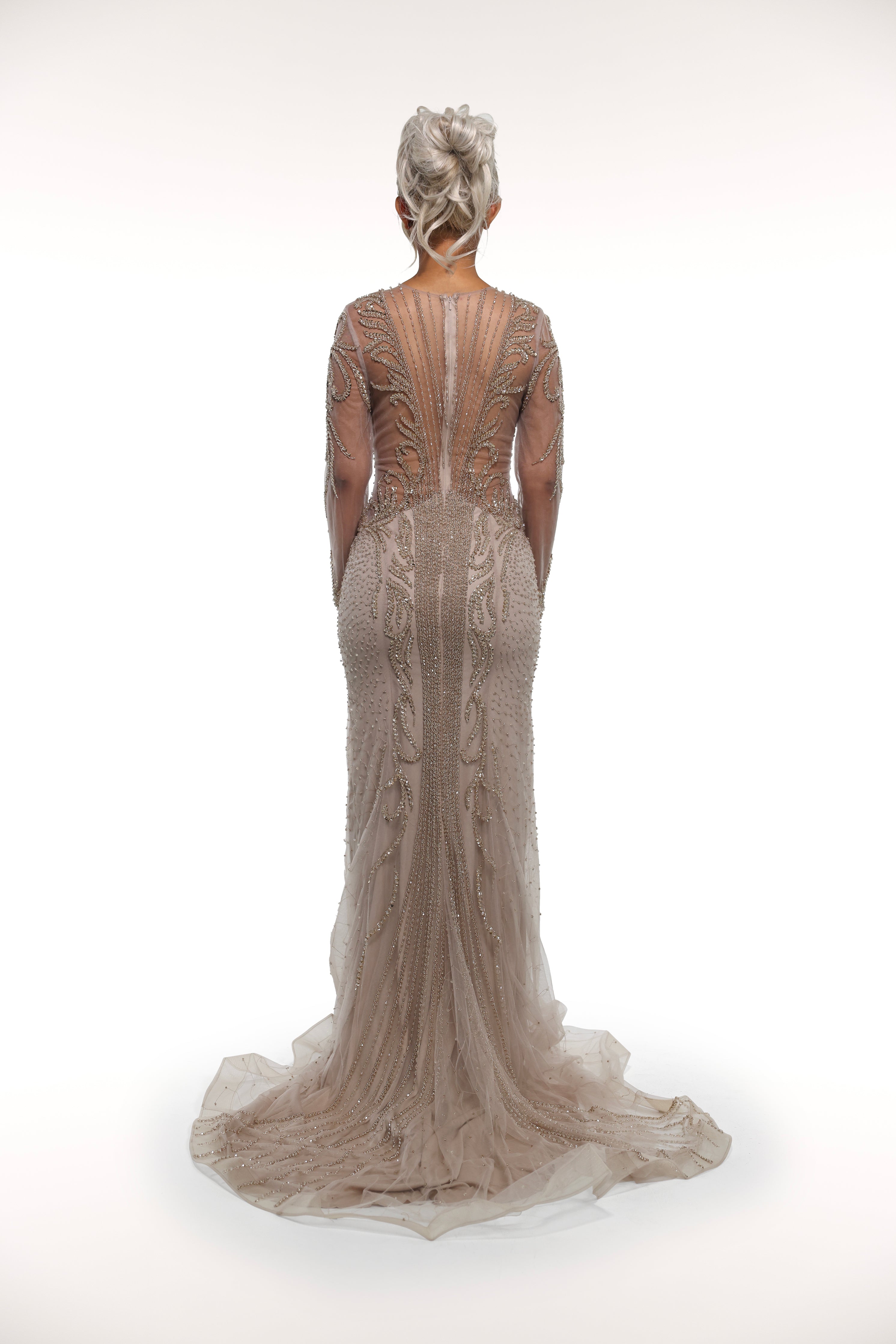 Stay on trend with the 'Jemma' gown. Its long sleeves and high neck design, paired with a convenient zipper back, make it the perfect choice for any formal occasion. Showcase your sophisticated style with this beautifully embroidered gown.