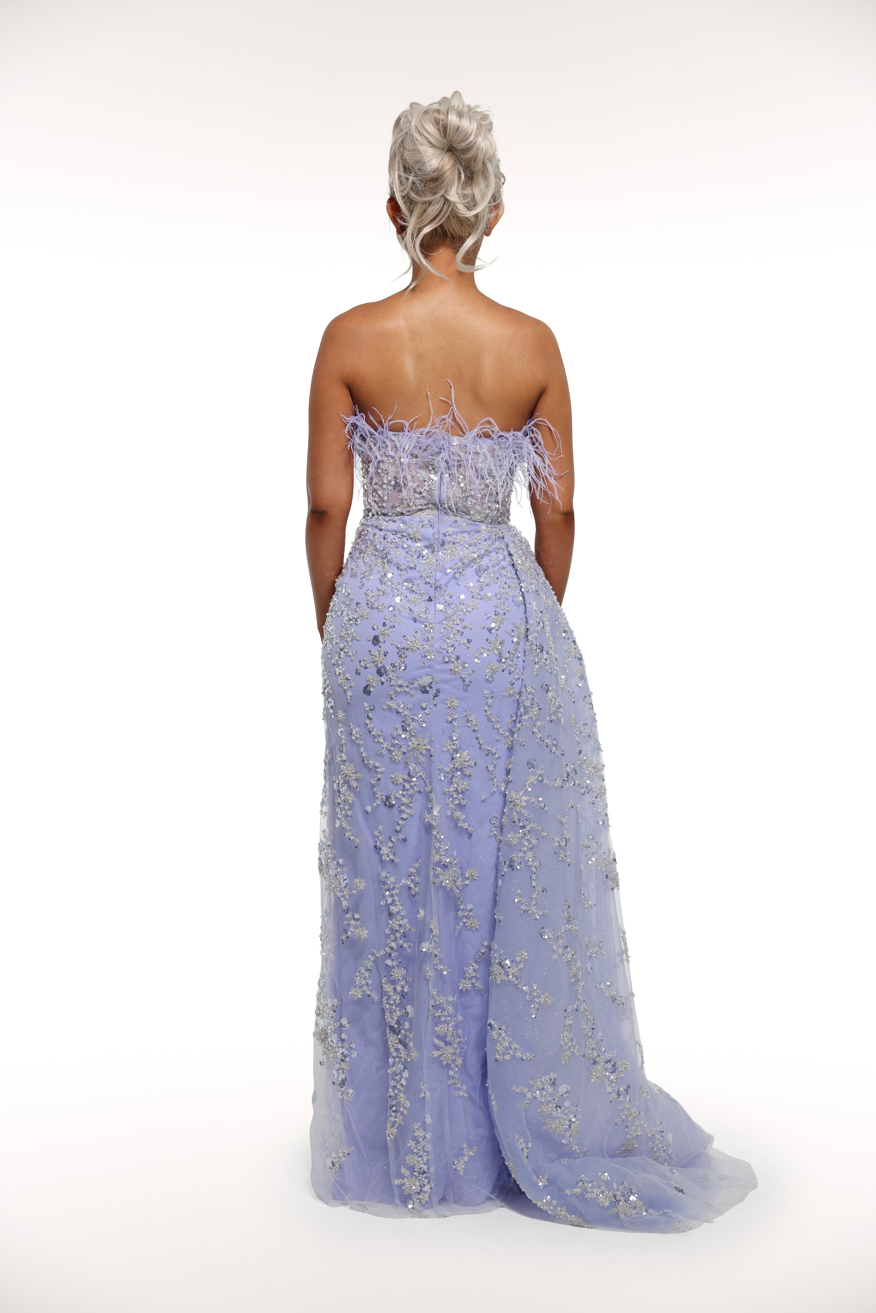 Experience the peak of elegance with 'Lavelle', featuring a strapless feather bust and an overlapping embellished design that cascades into a ball gown effect with a trailing train. Immerse yourself in luxury and make a statement in this lavender-hued masterpiece.