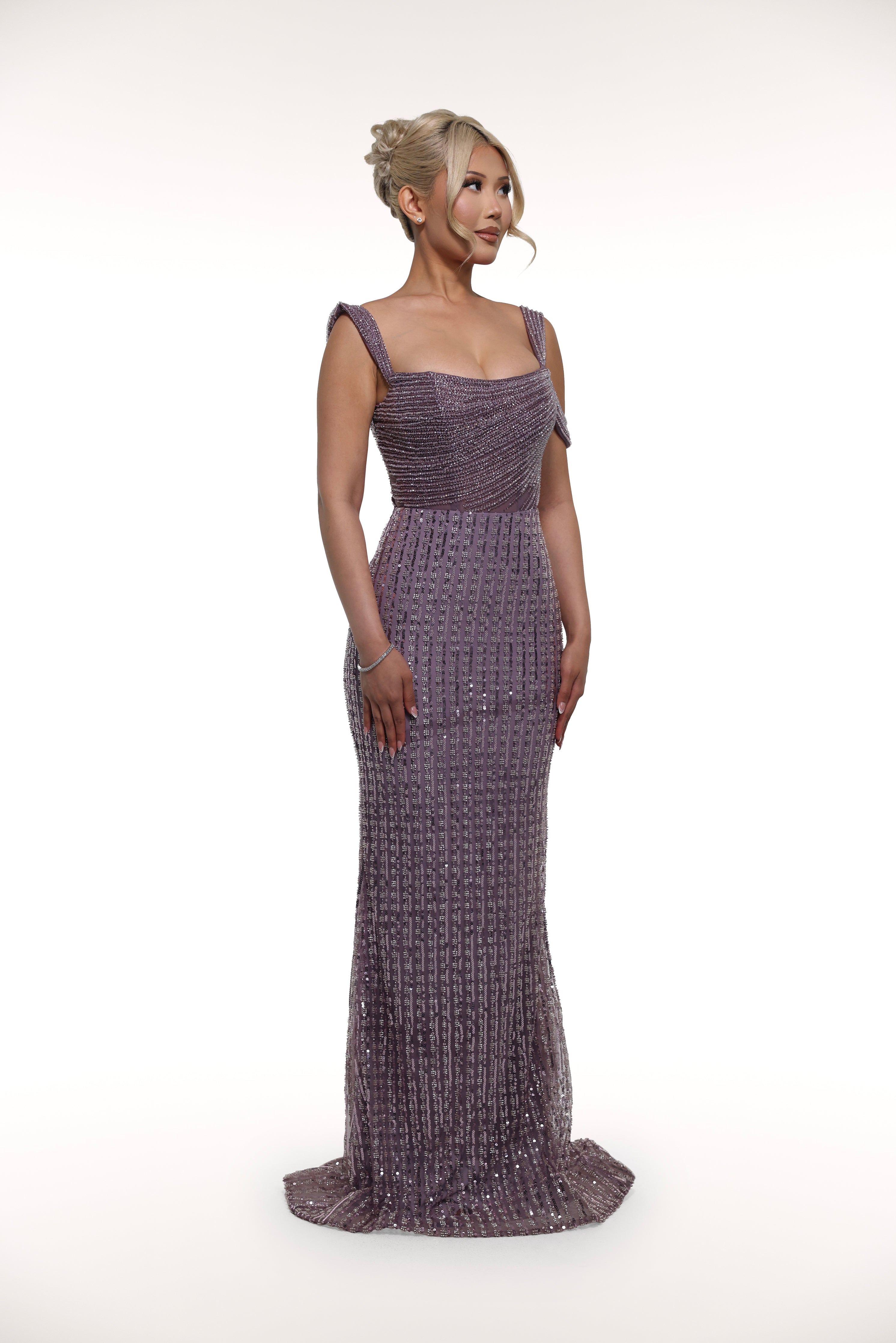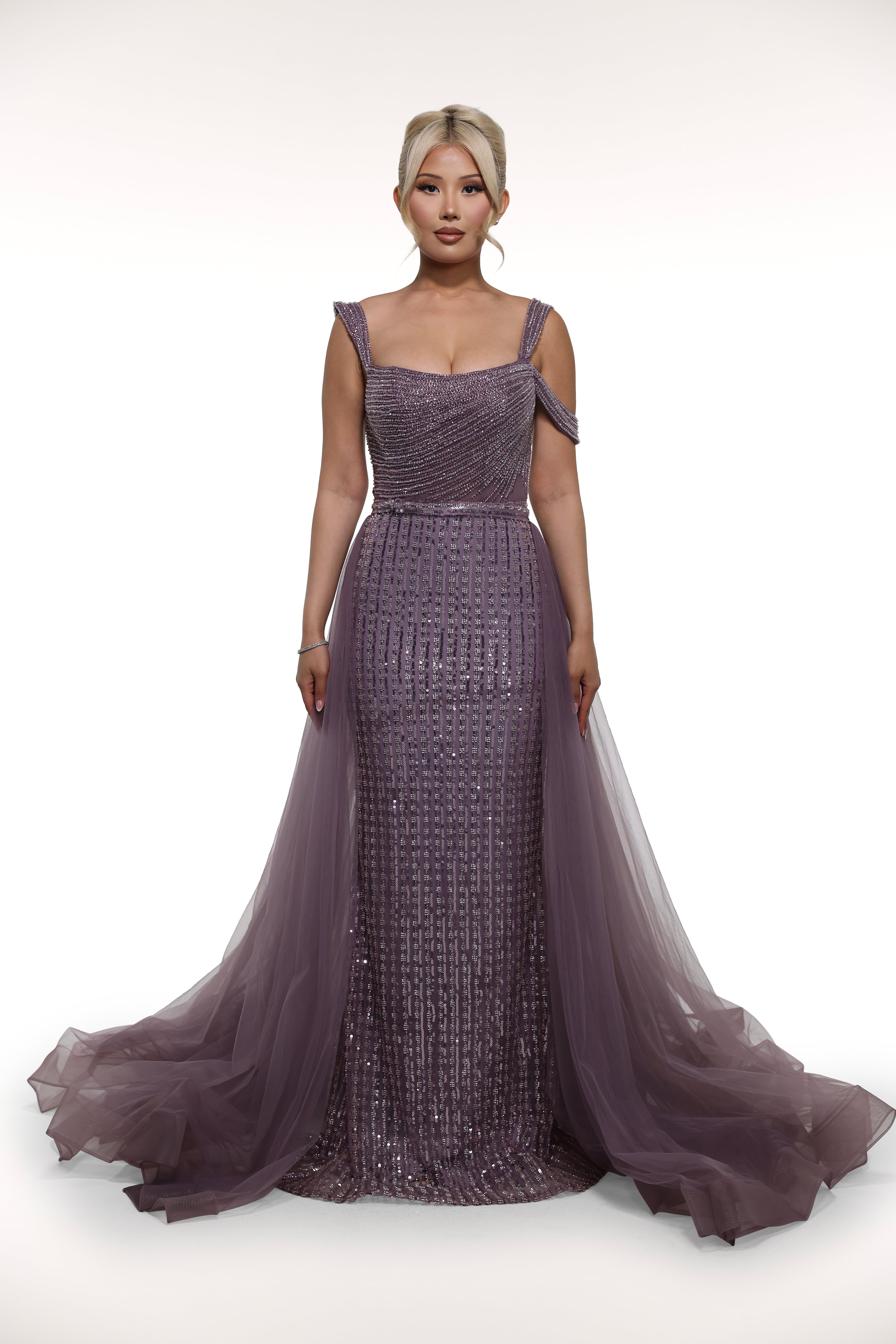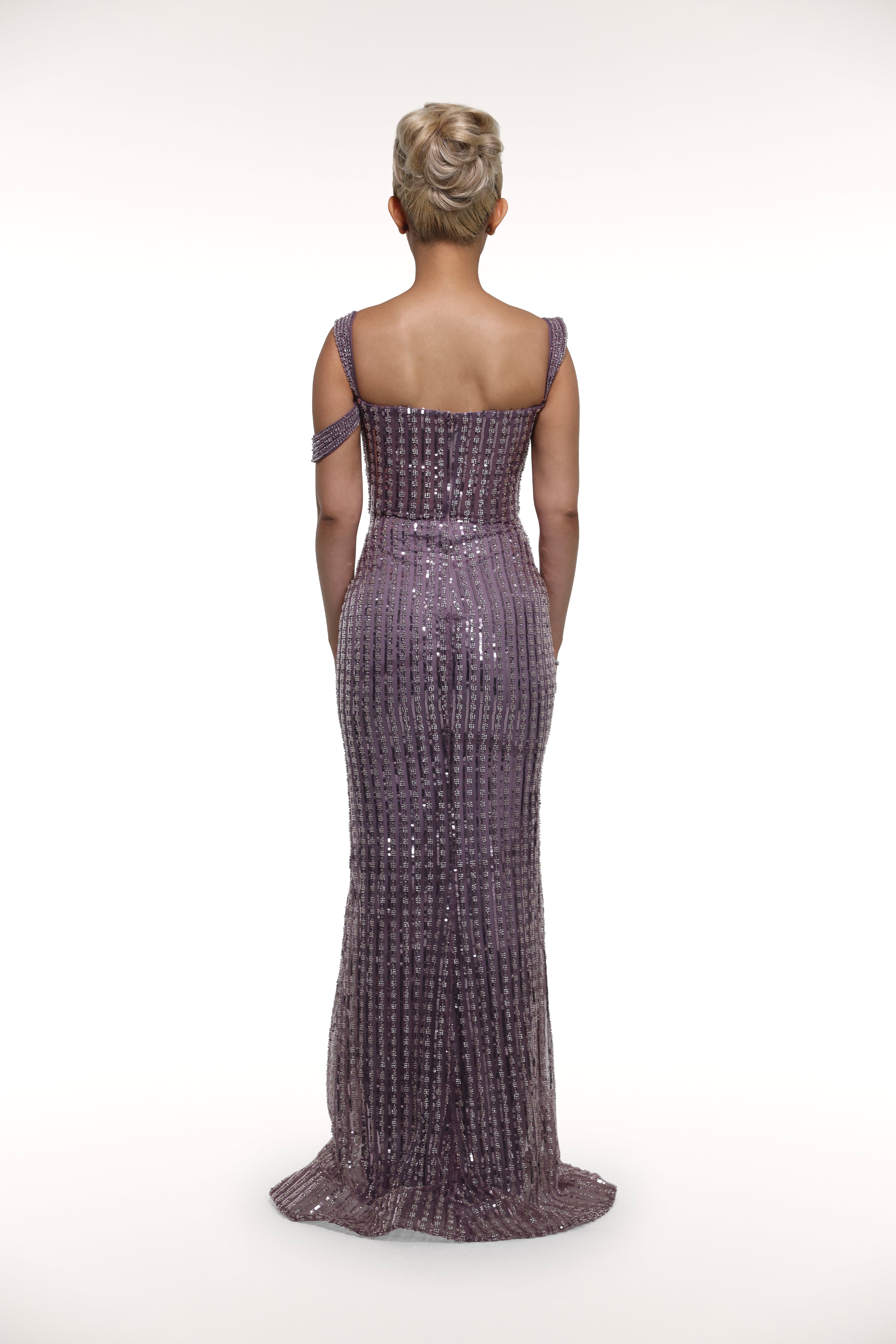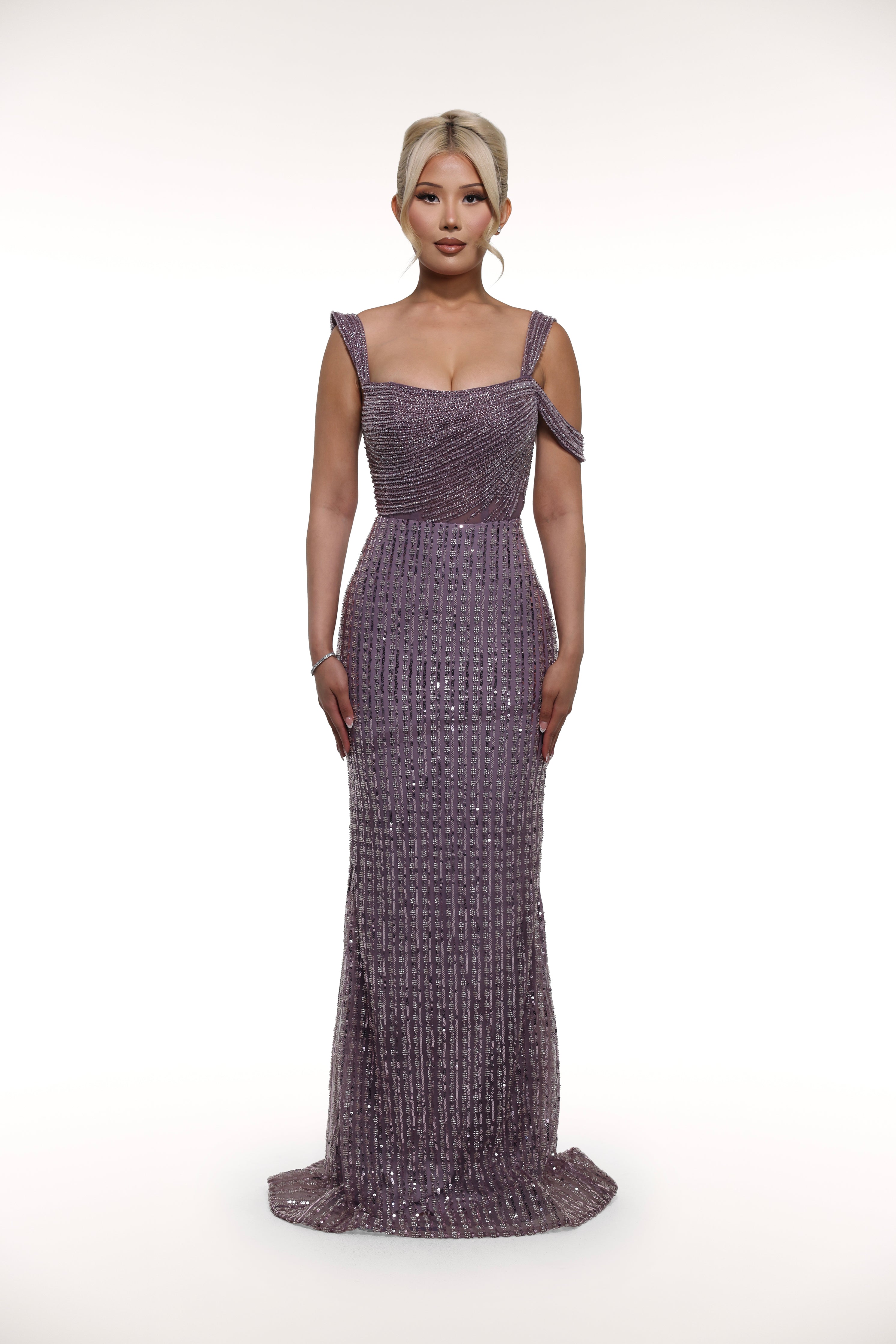 Experience the glamour and sparkle with 'Laylay.' This stunning one-shoulder gown features a sequin-lined bodice and an off-shoulder detail that's sure to turn heads.