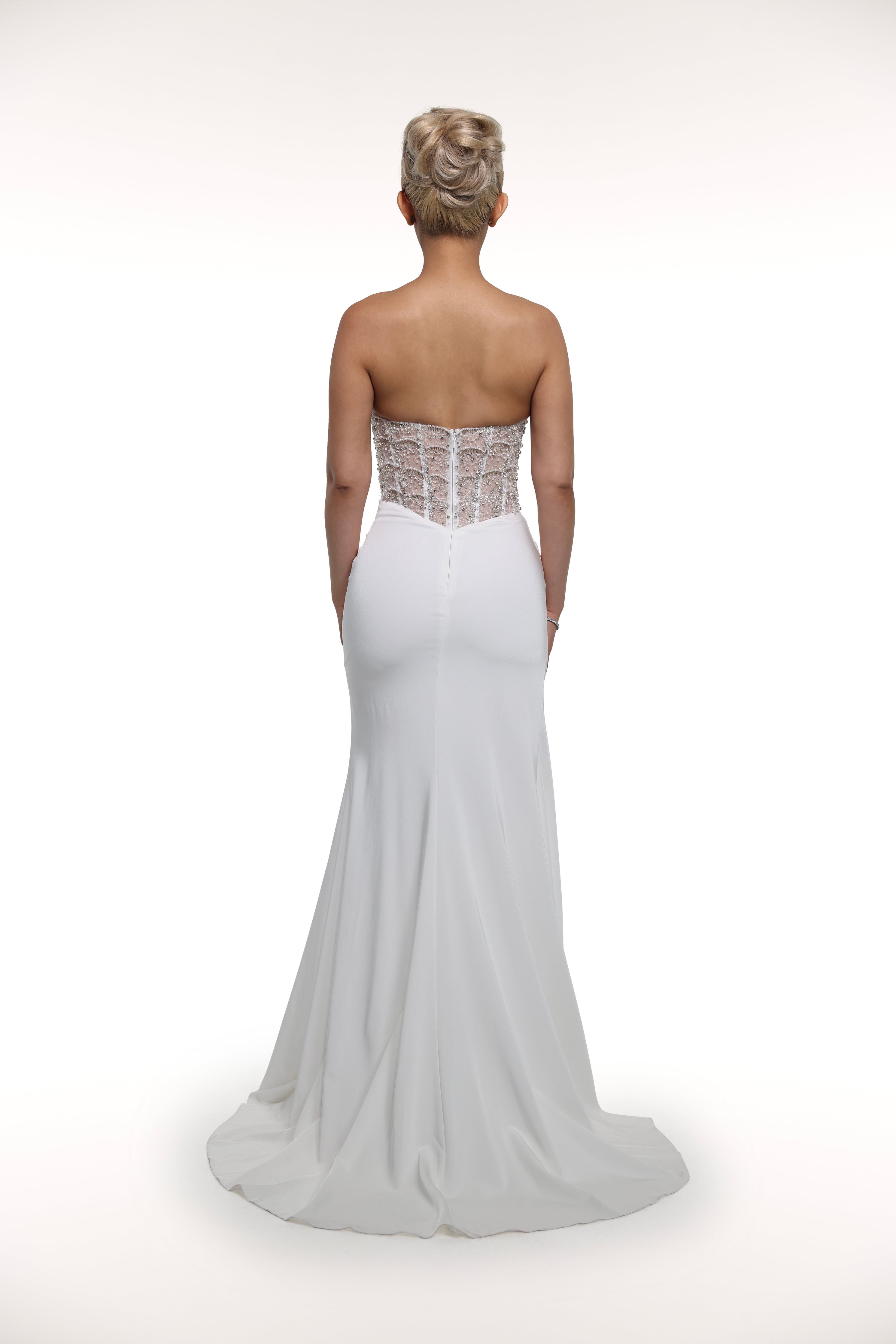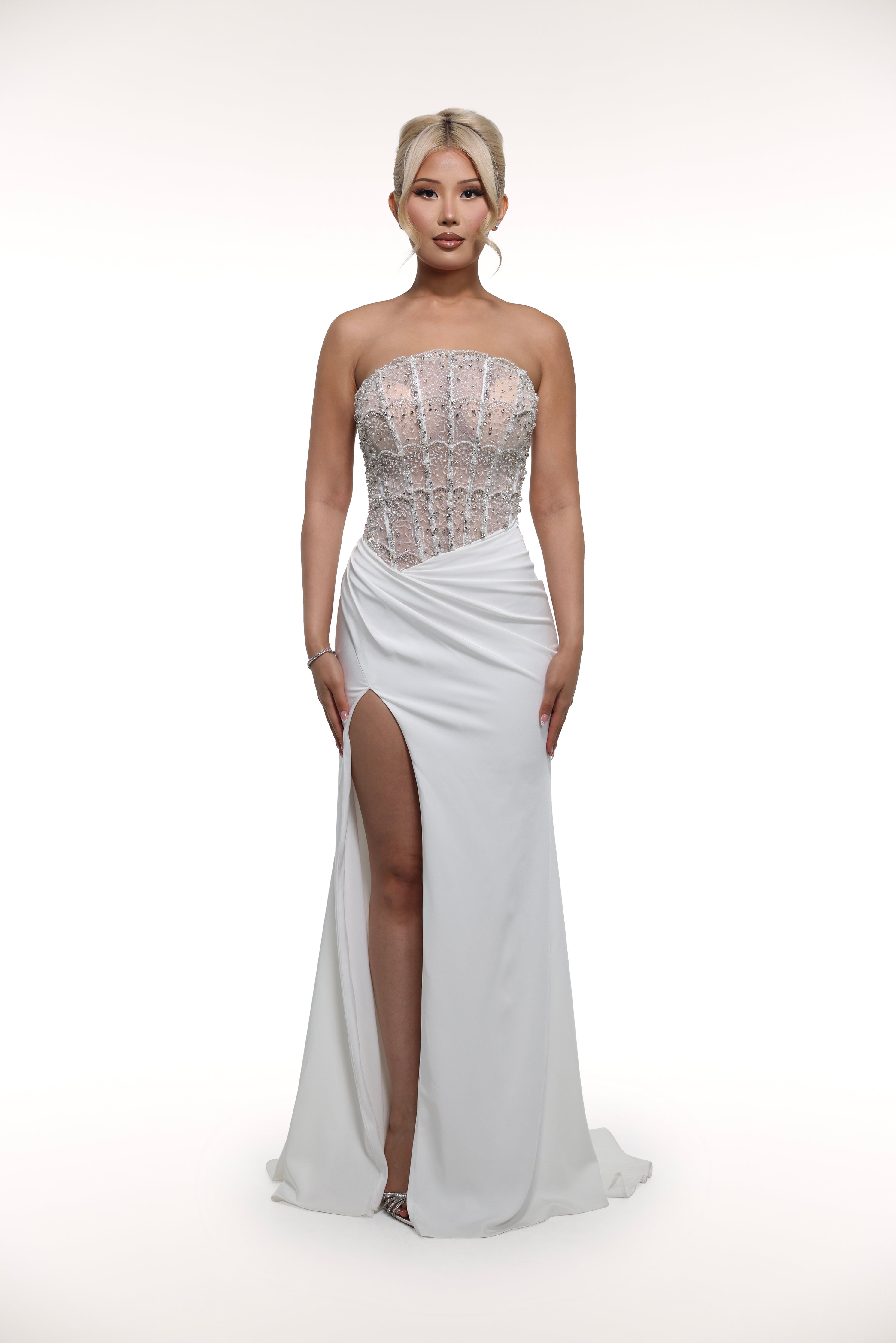 Experience elegance and versatility with 'Magnolia'. The strapless corset bust offers a flattering fit, while the shell-like design adds a touch of sophistication. The white skirt features a right leg slit for easy movement and removable sleeves for customizable style.