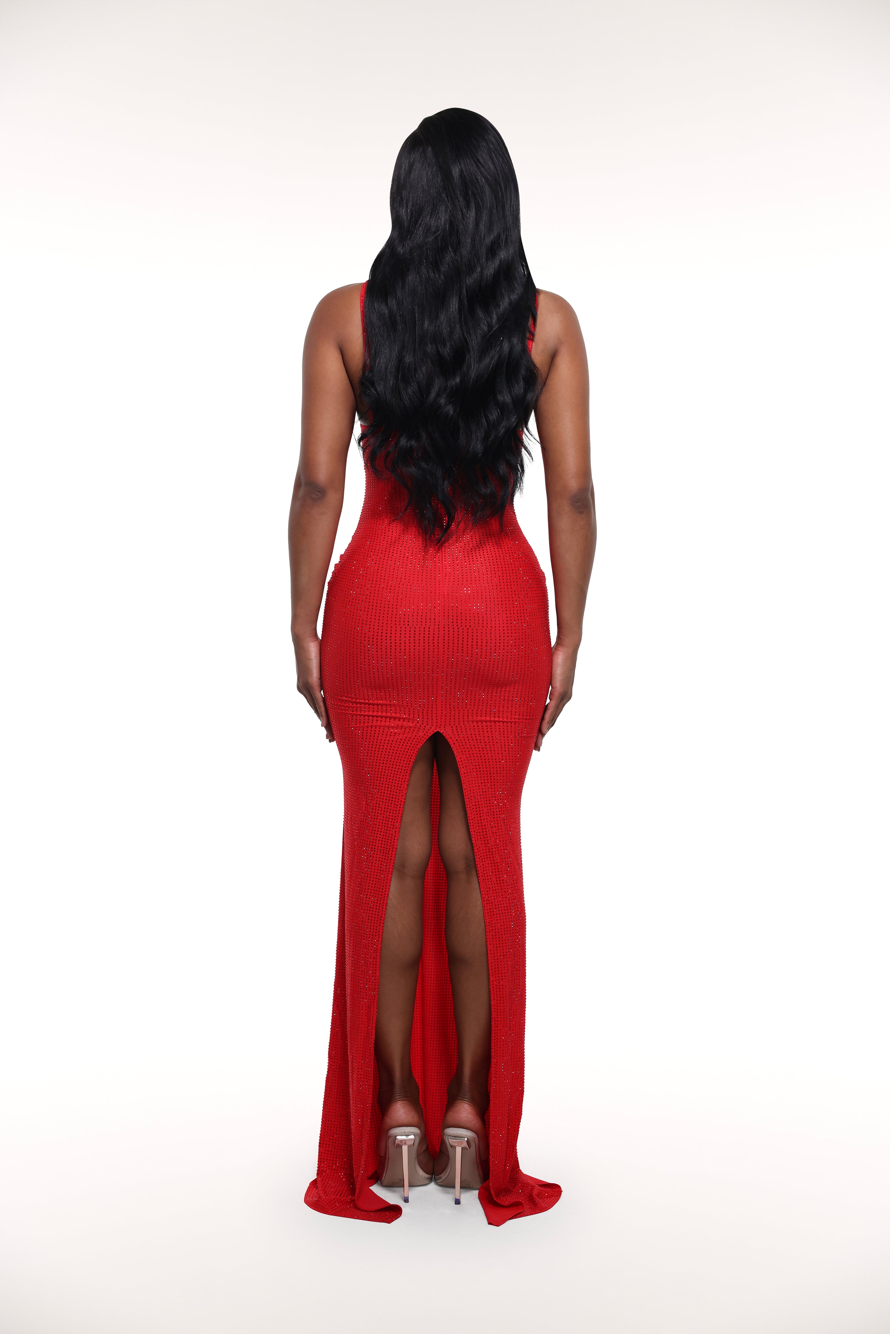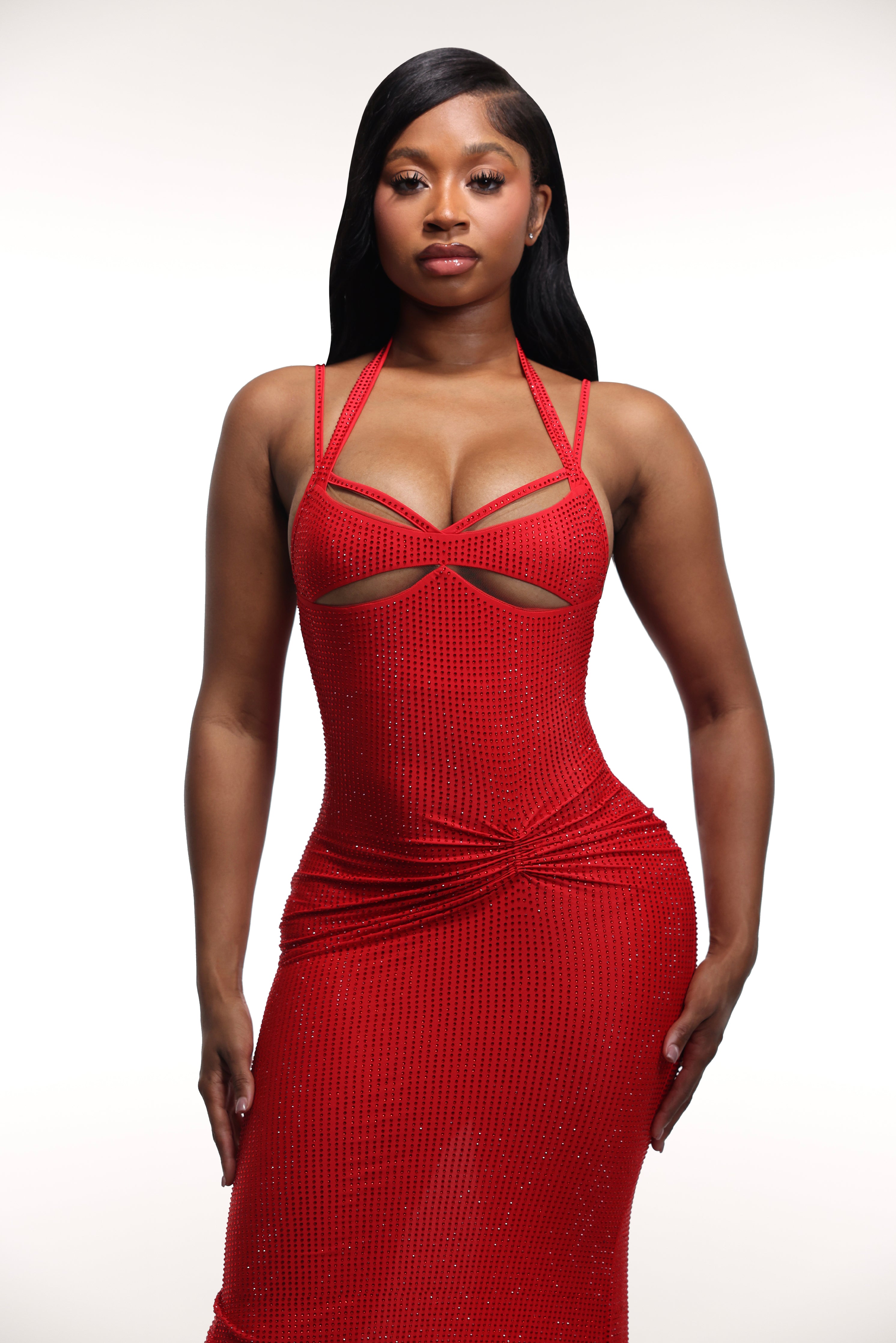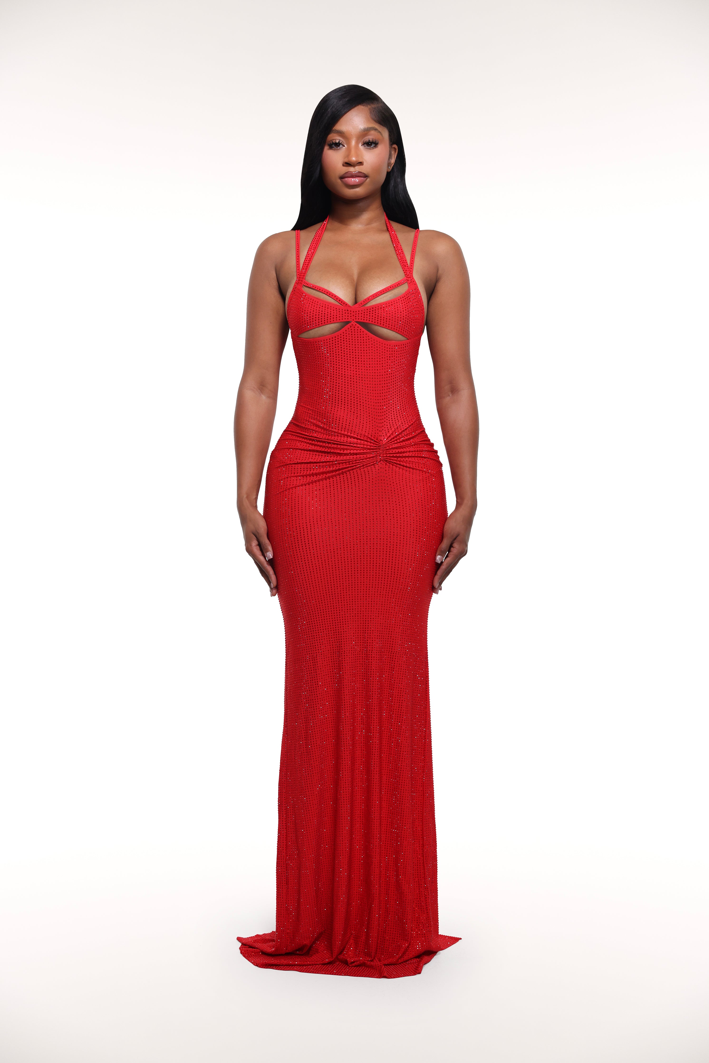 'Mariposa' made from stretchy fabric filled with rhinestones. It's the perfect dress for a night out or dinner. It features a maxi length, straps at shoulder and neckline, cutouts with mesh under bust and ruching design at hip.