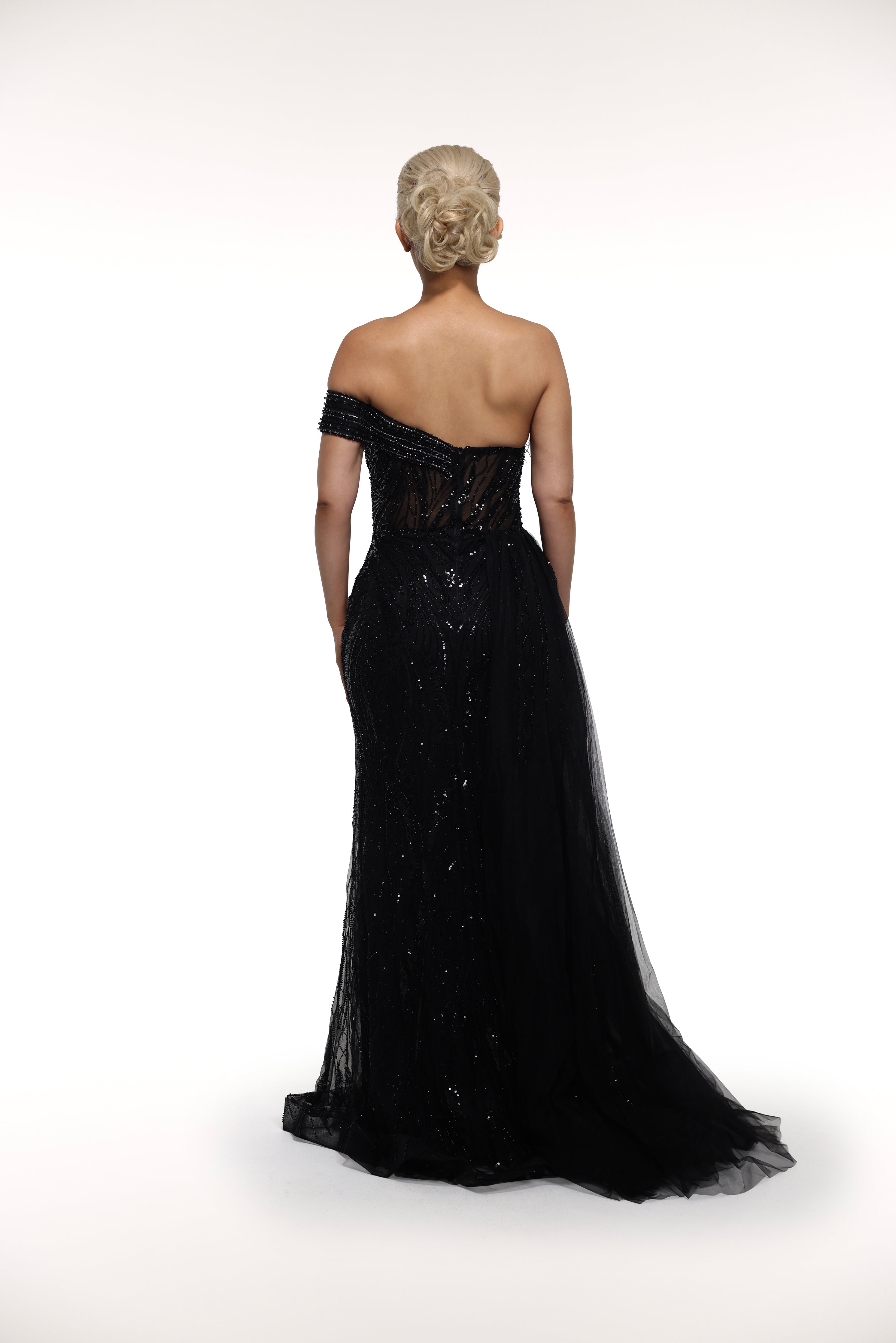 Experience luxury and elegance in our 'Moonlight' gown. The long black gown features a stunning one shoulder design, adorned with matching crystals and rhinestones for a touch of glamour. Complete with a stylish slit on the right leg, this gown is perfect for any formal occasion.