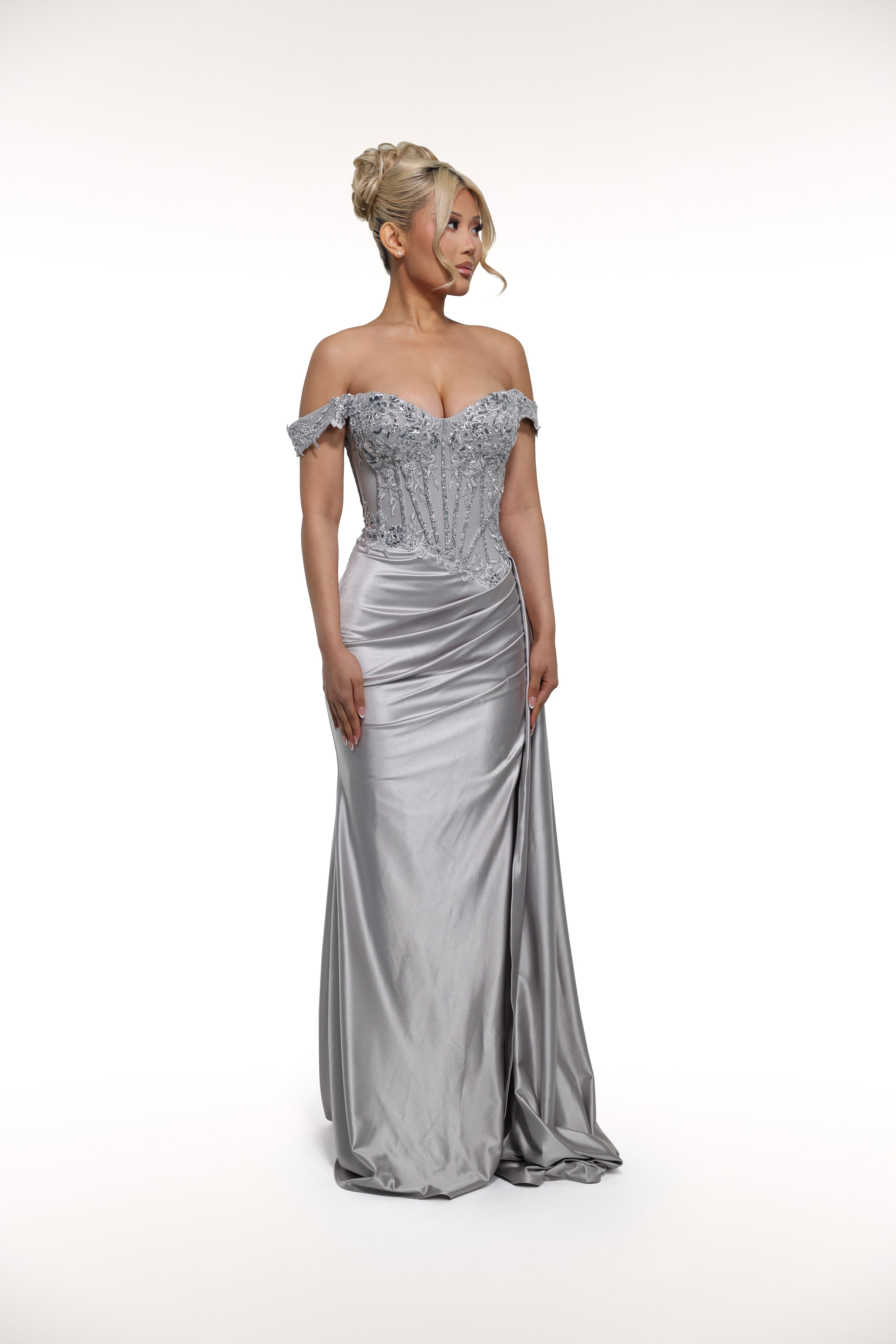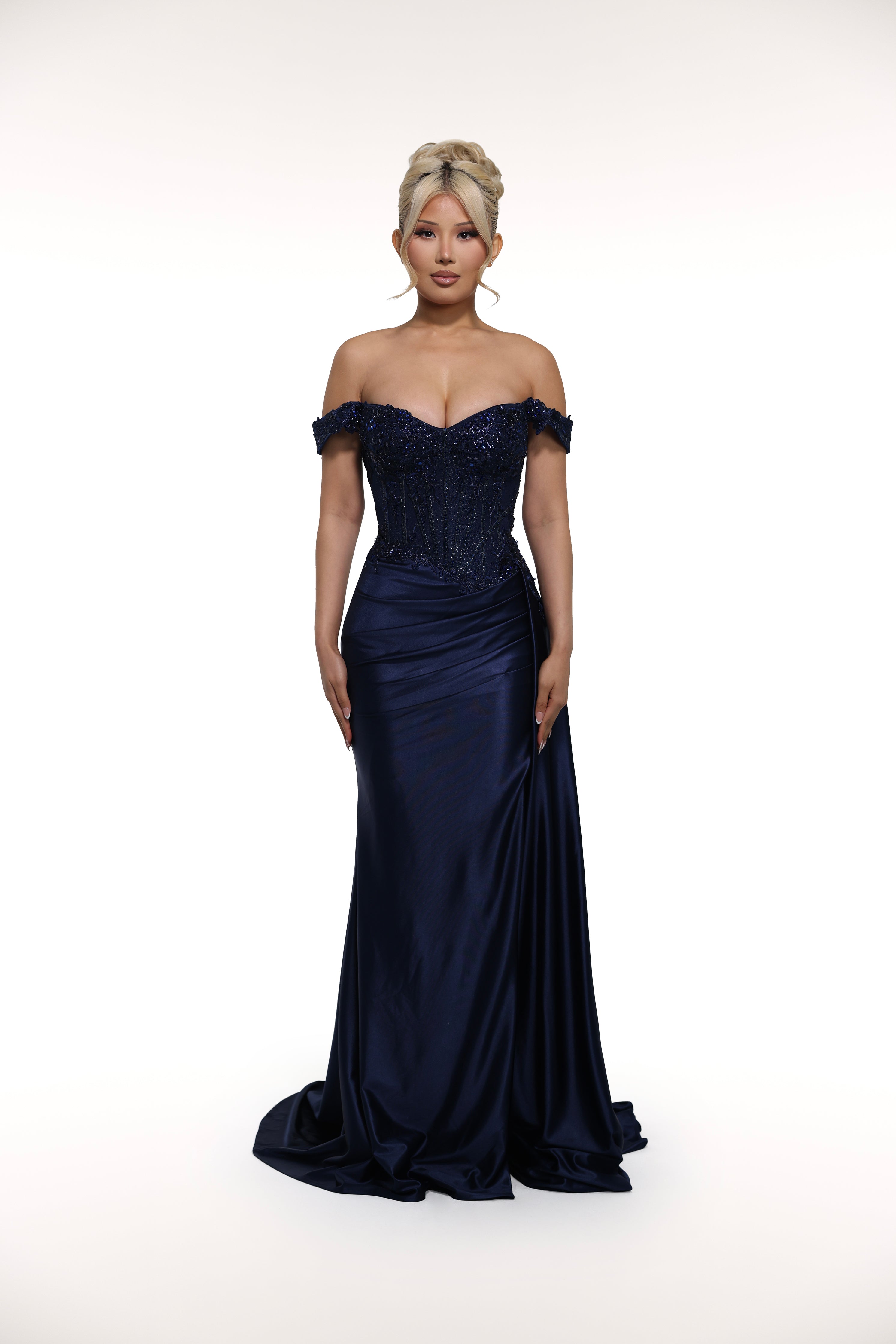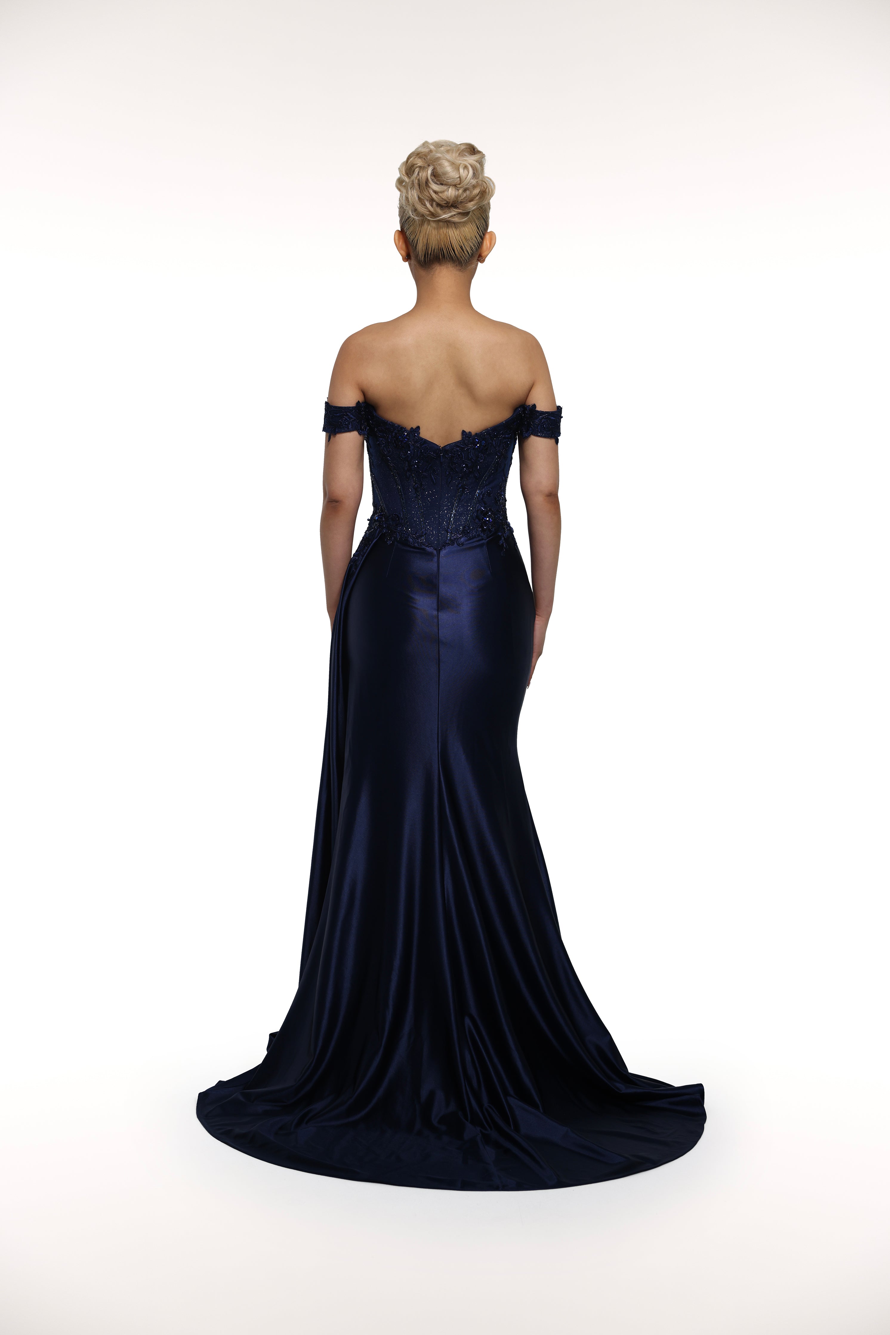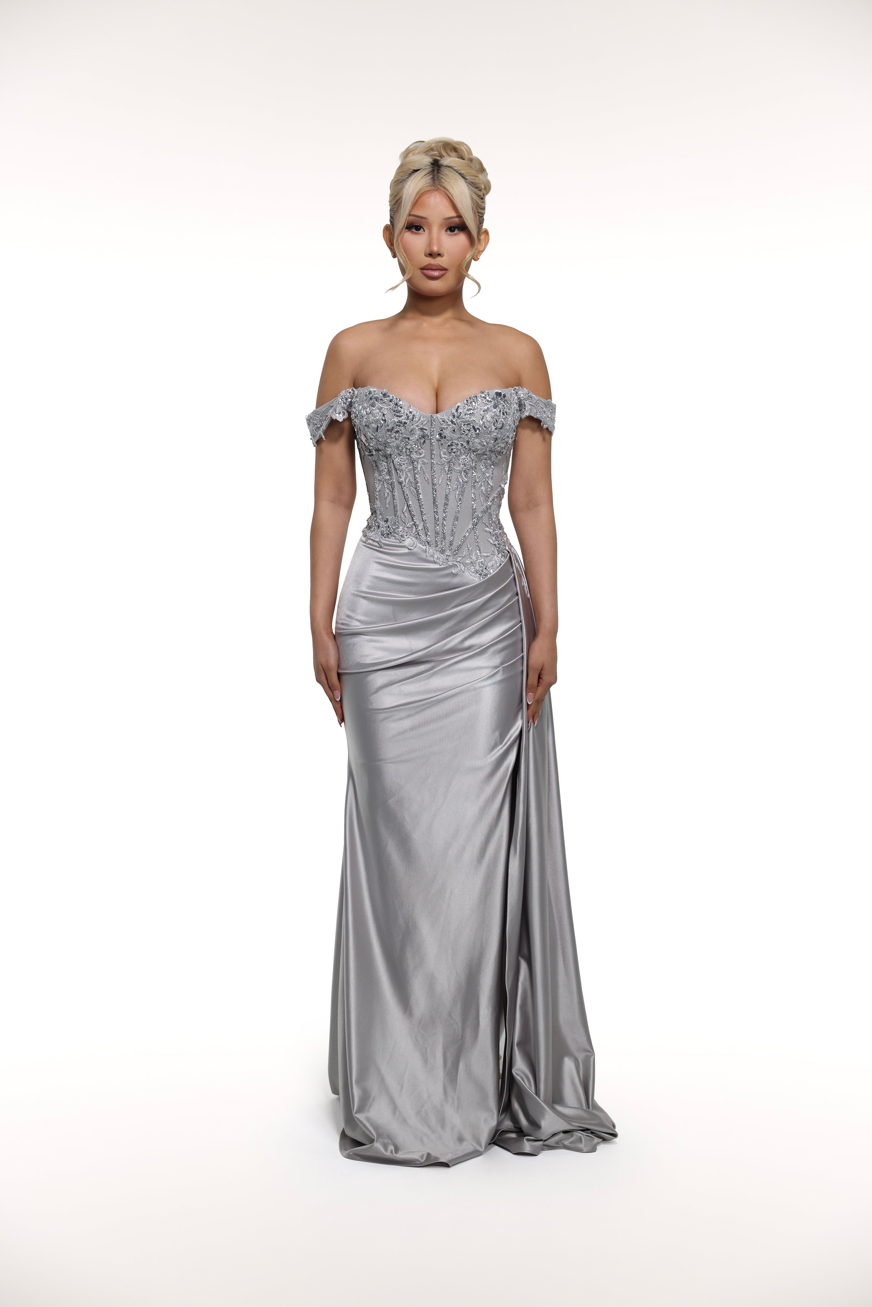 Sister to our Zara Dress, 'Ozzie' is off the shoulder satin gown that will make you stand out at any event. The lace bodice adds a touch of femininity while the left leg slit and added tail create a stunning silhouette.