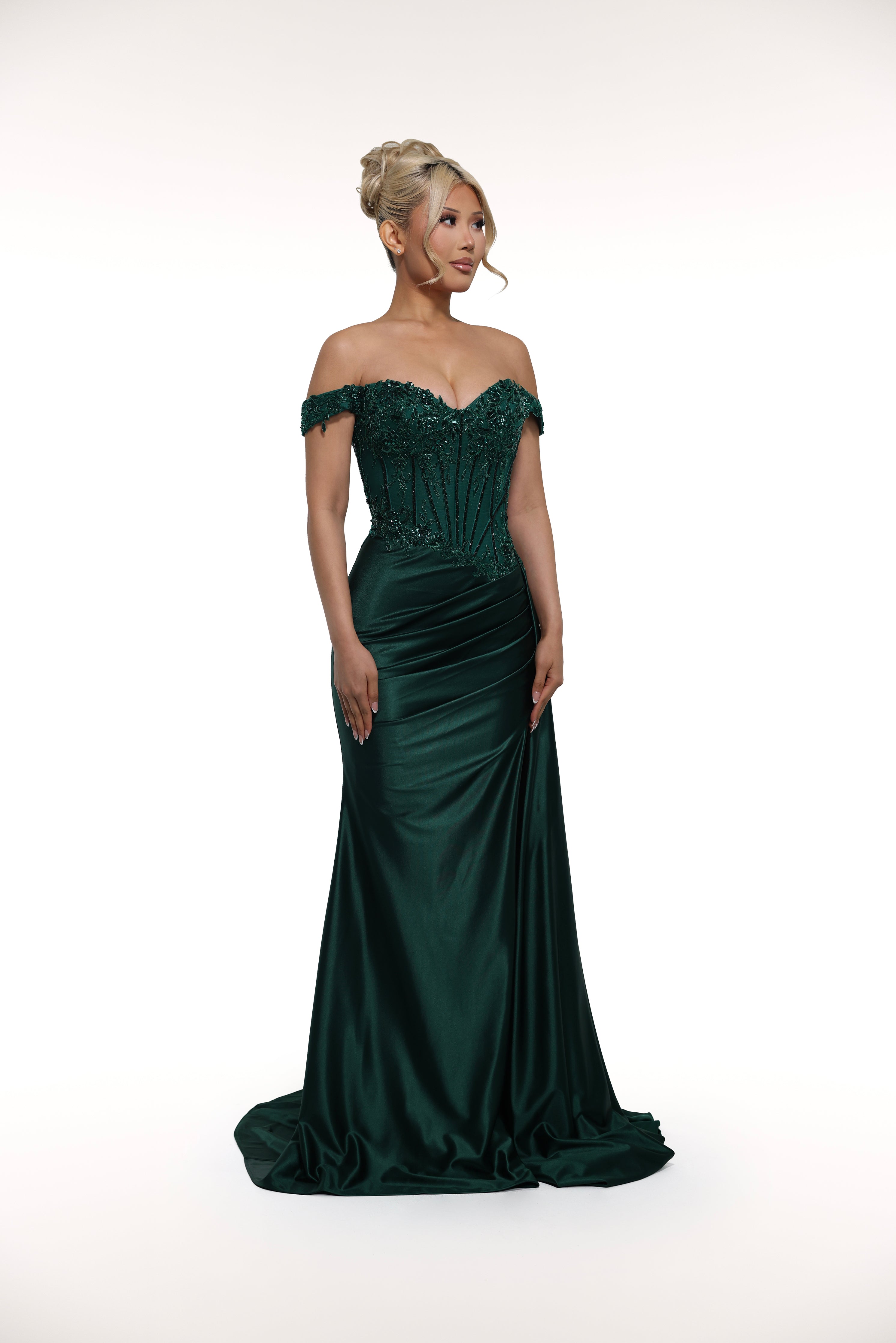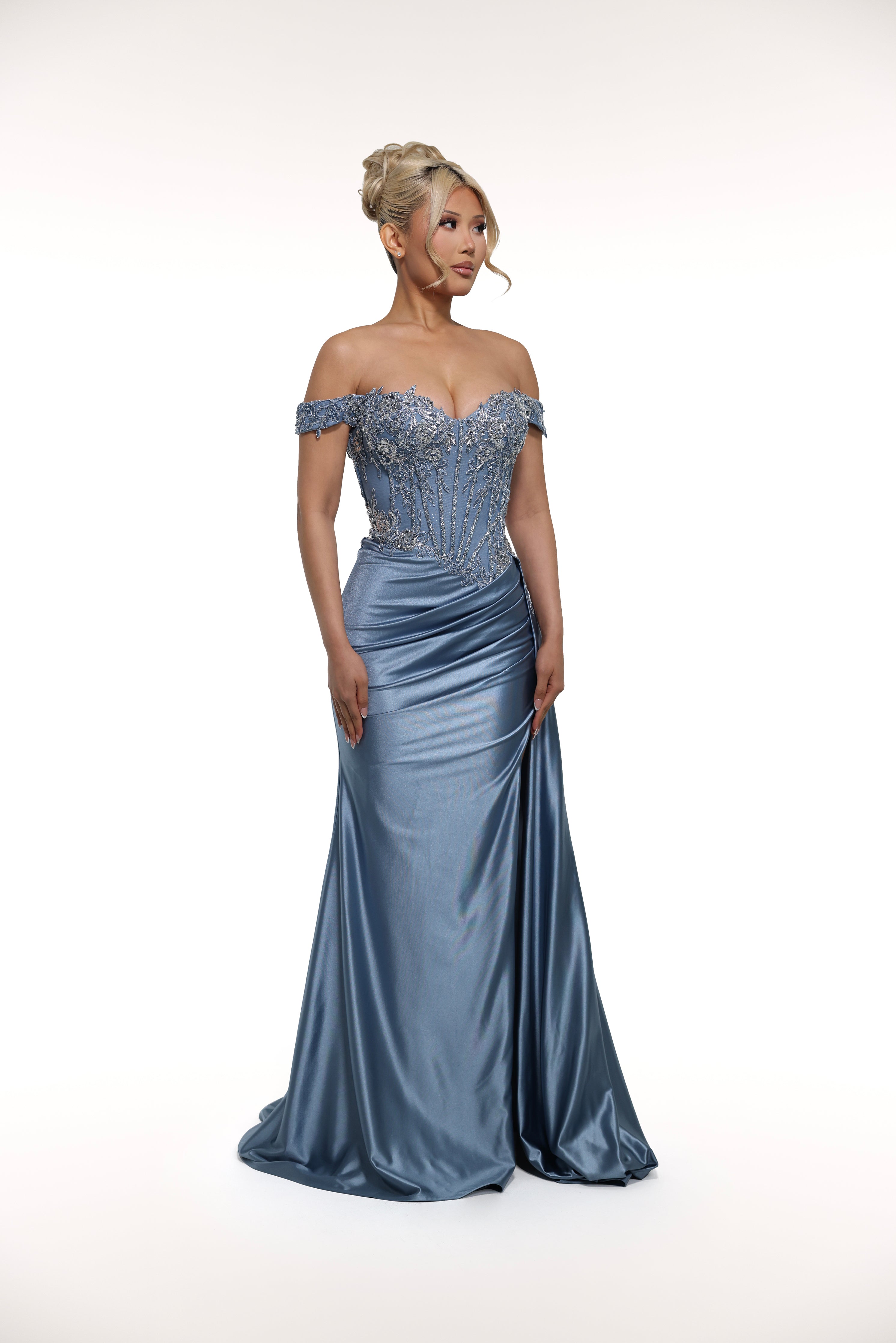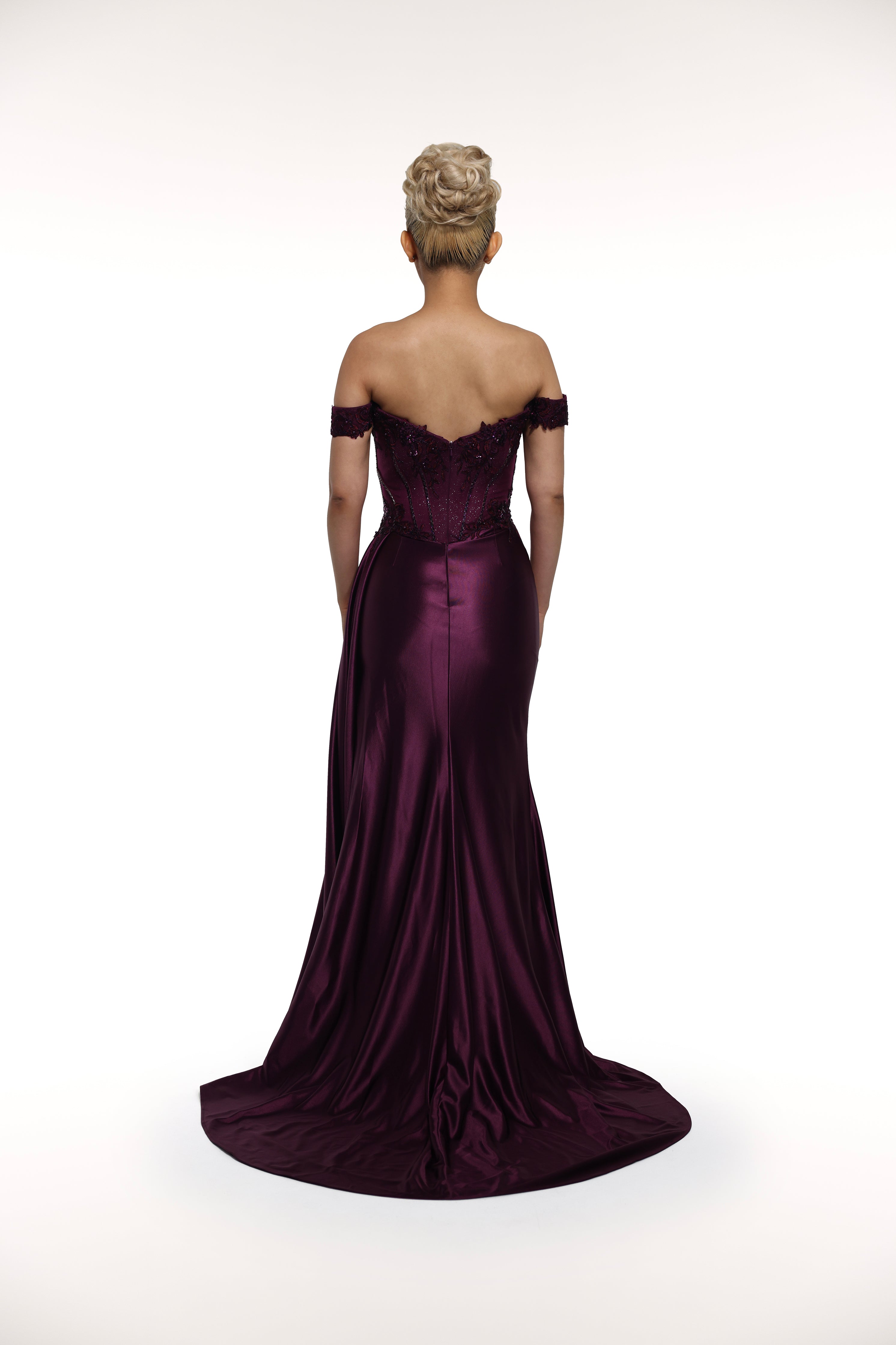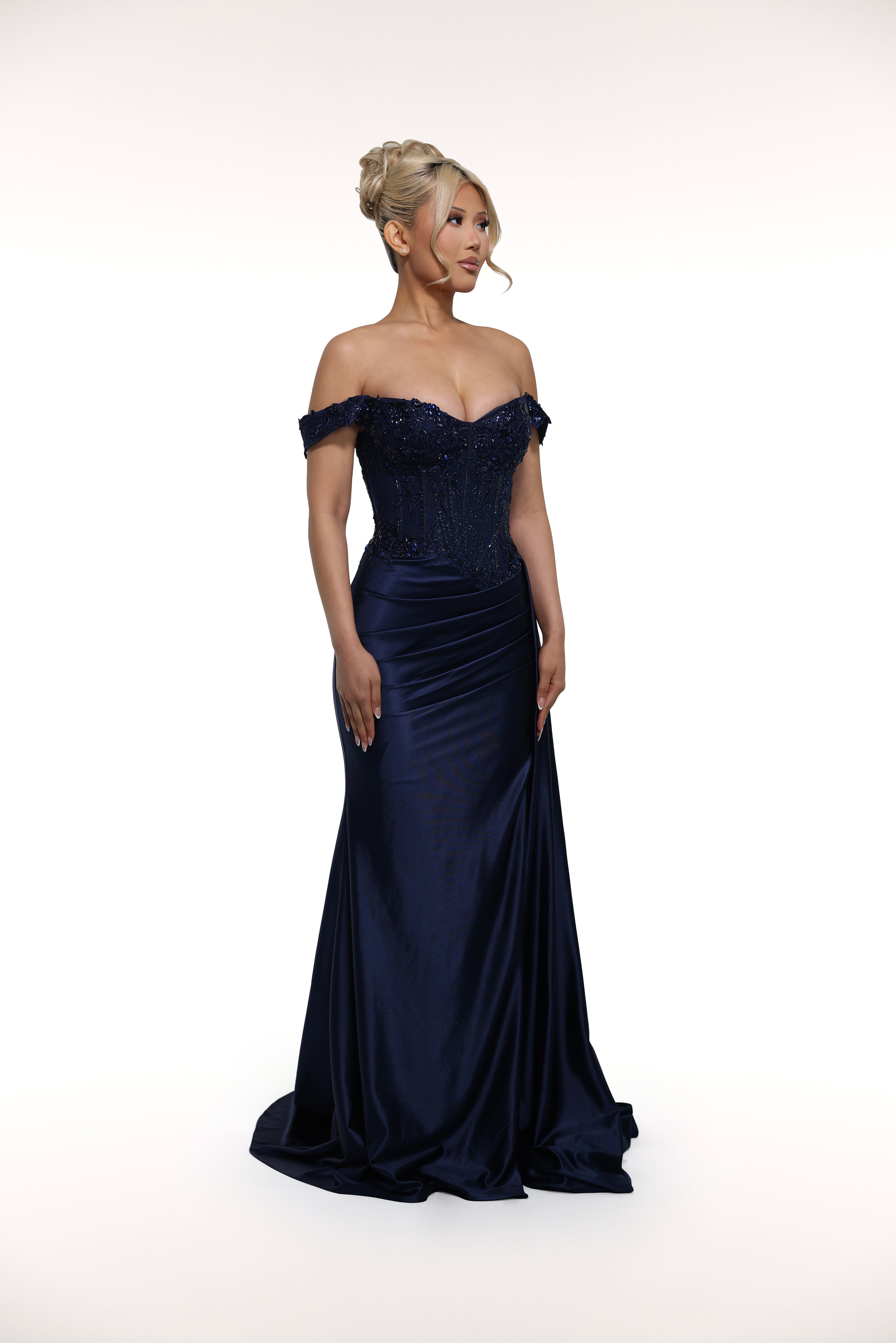 Sister to our Zara Dress, 'Ozzie' is off the shoulder satin gown that will make you stand out at any event. The lace bodice adds a touch of femininity while the left leg slit and added tail create a stunning silhouette.