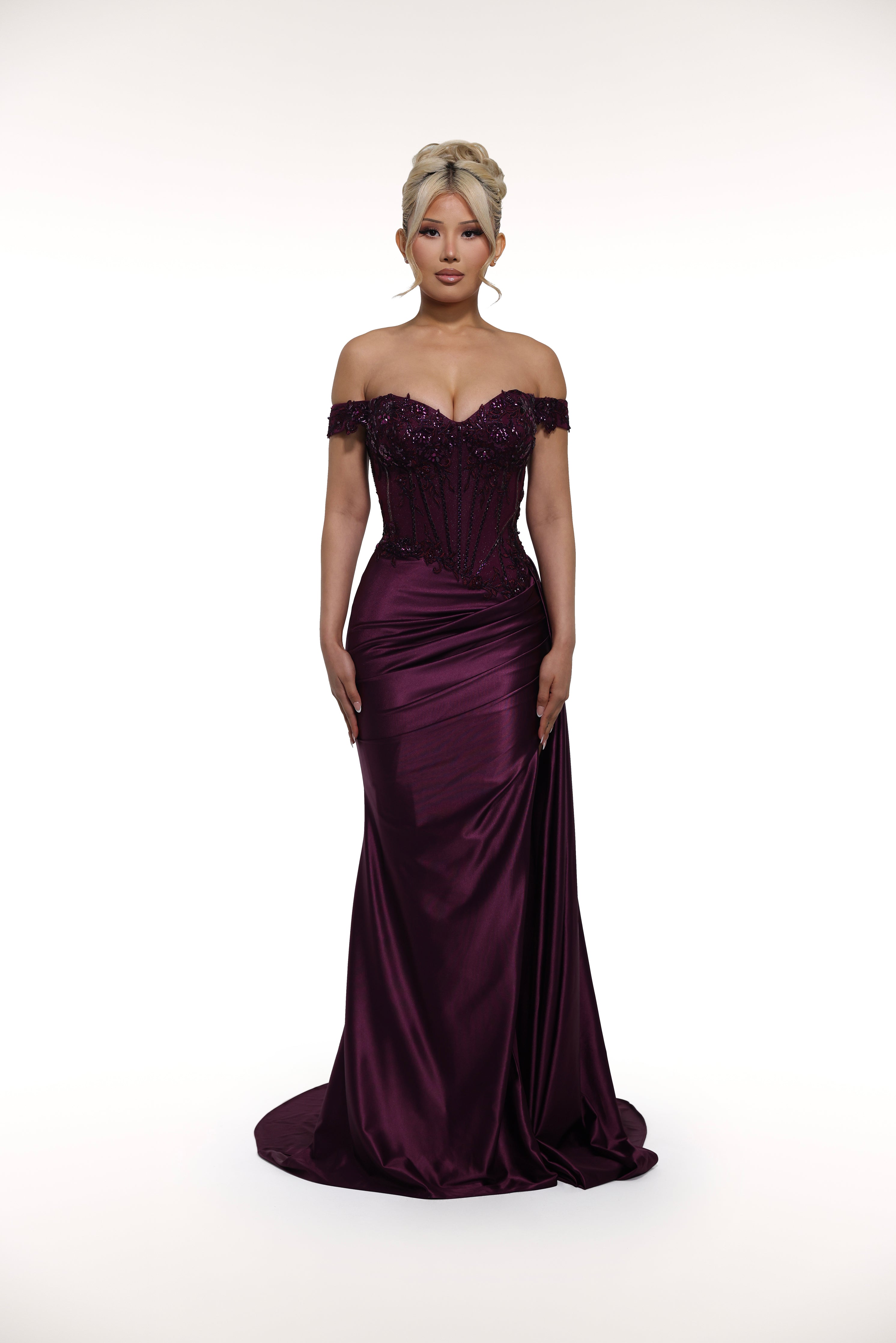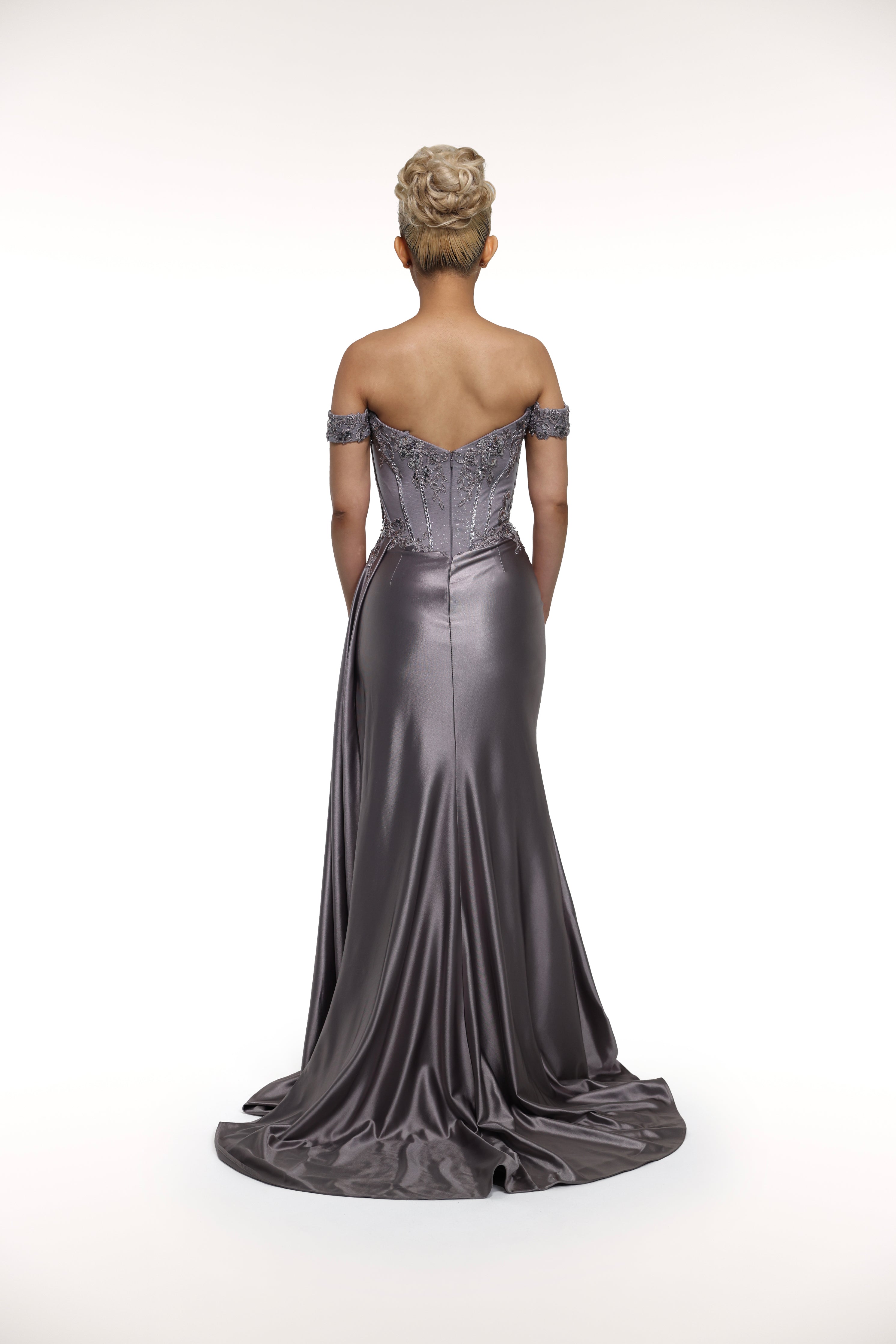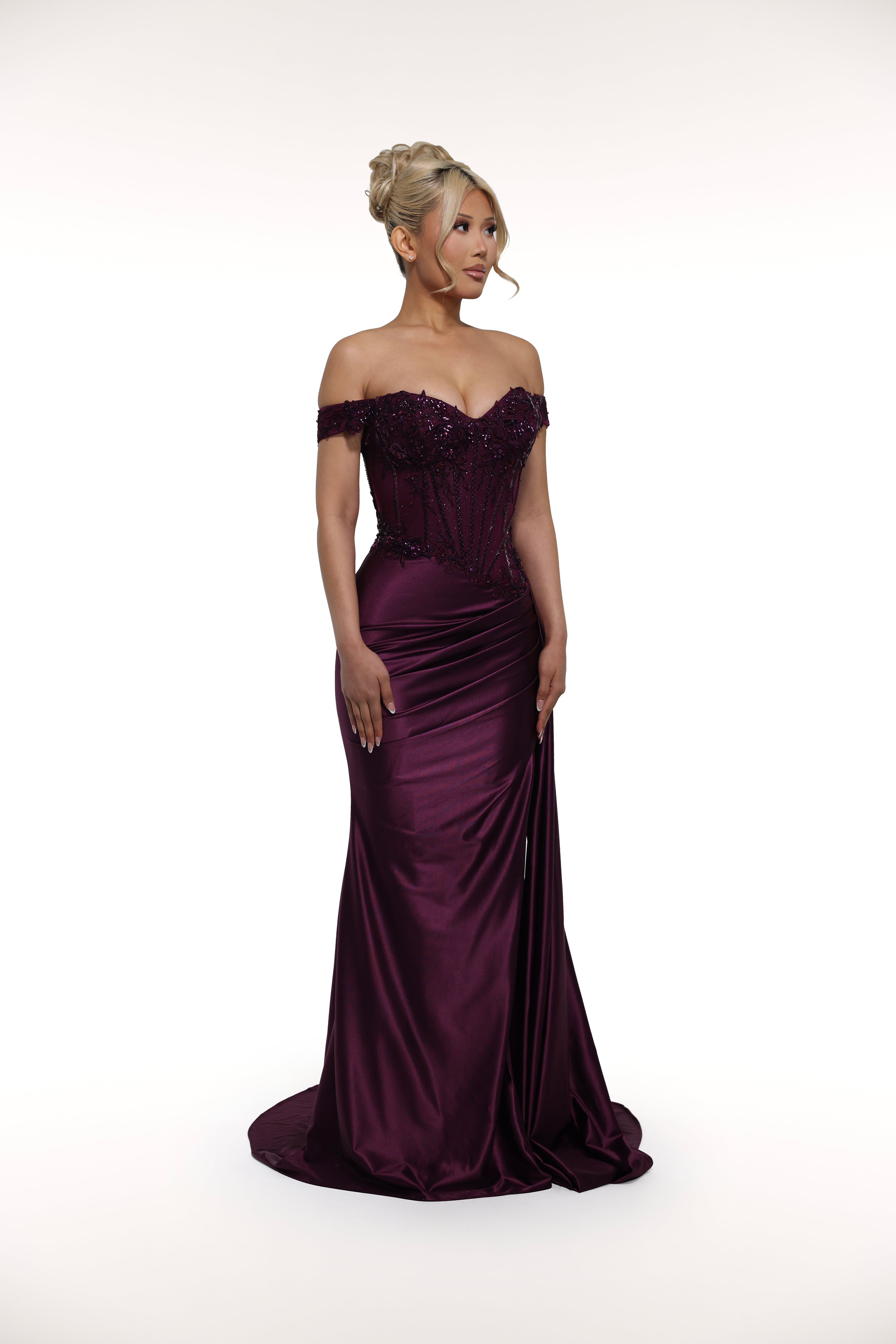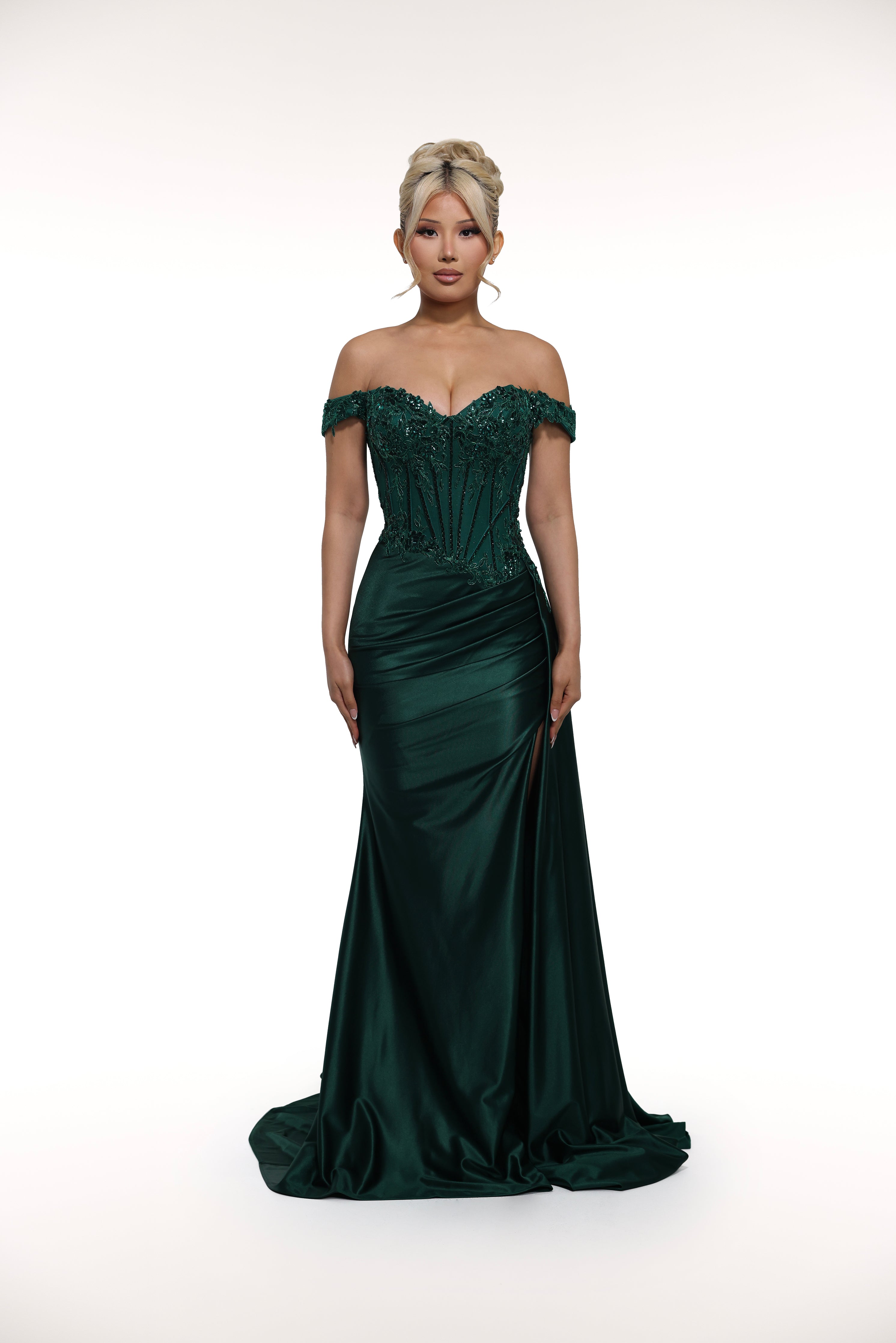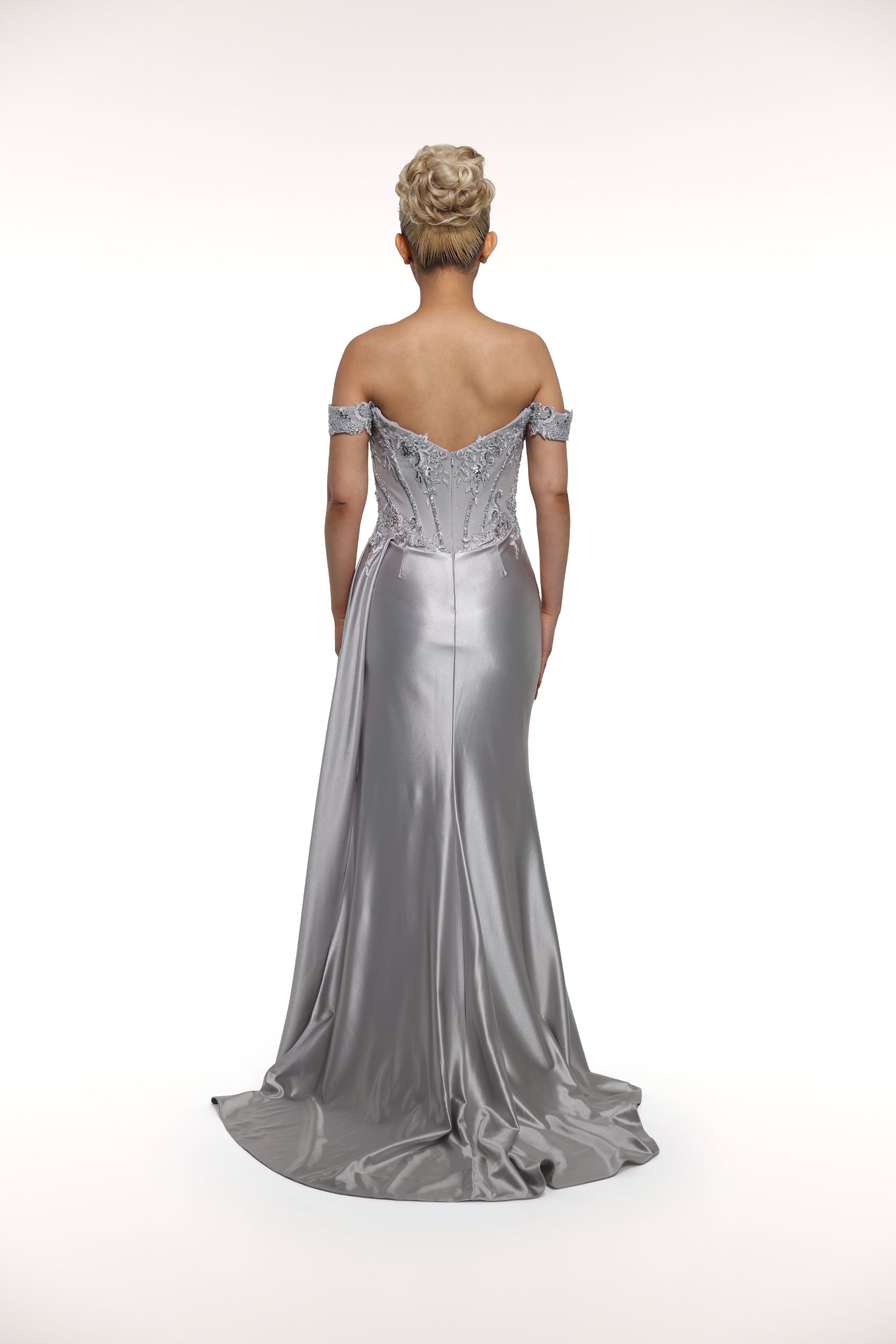 Sister to our Zara Dress, 'Ozzie' is off the shoulder satin gown that will make you stand out at any event. The lace bodice adds a touch of femininity while the left leg slit and added tail create a stunning silhouette.