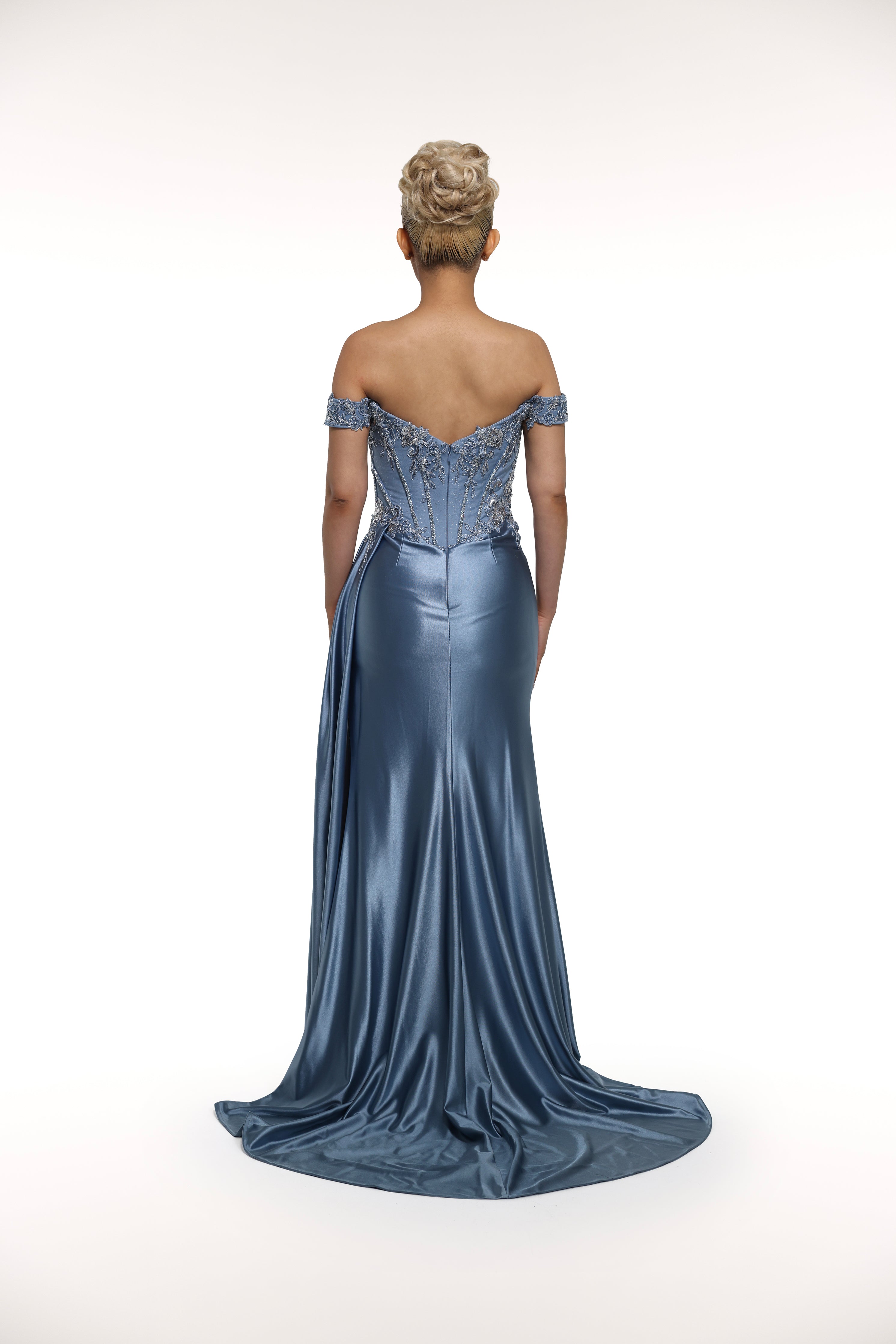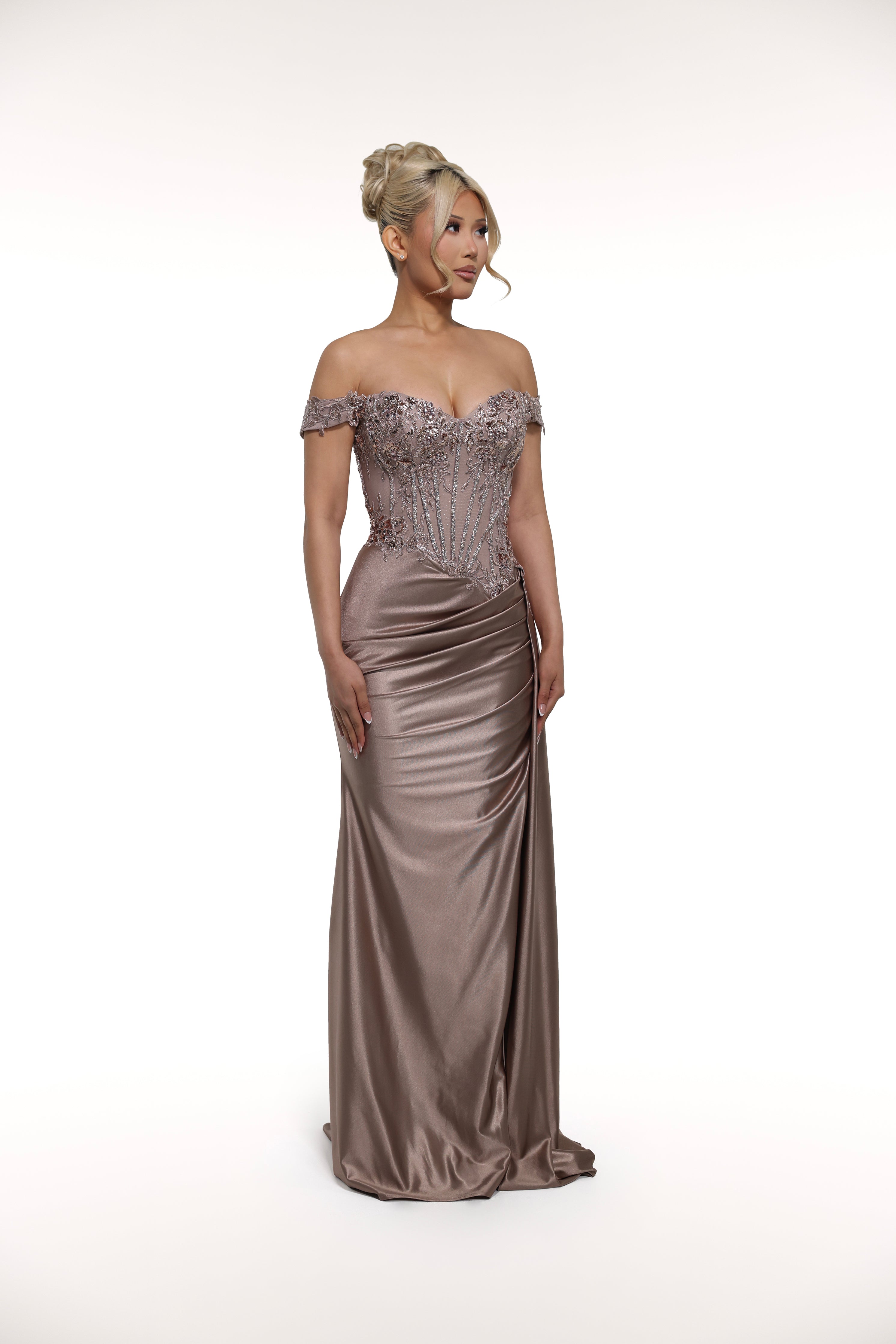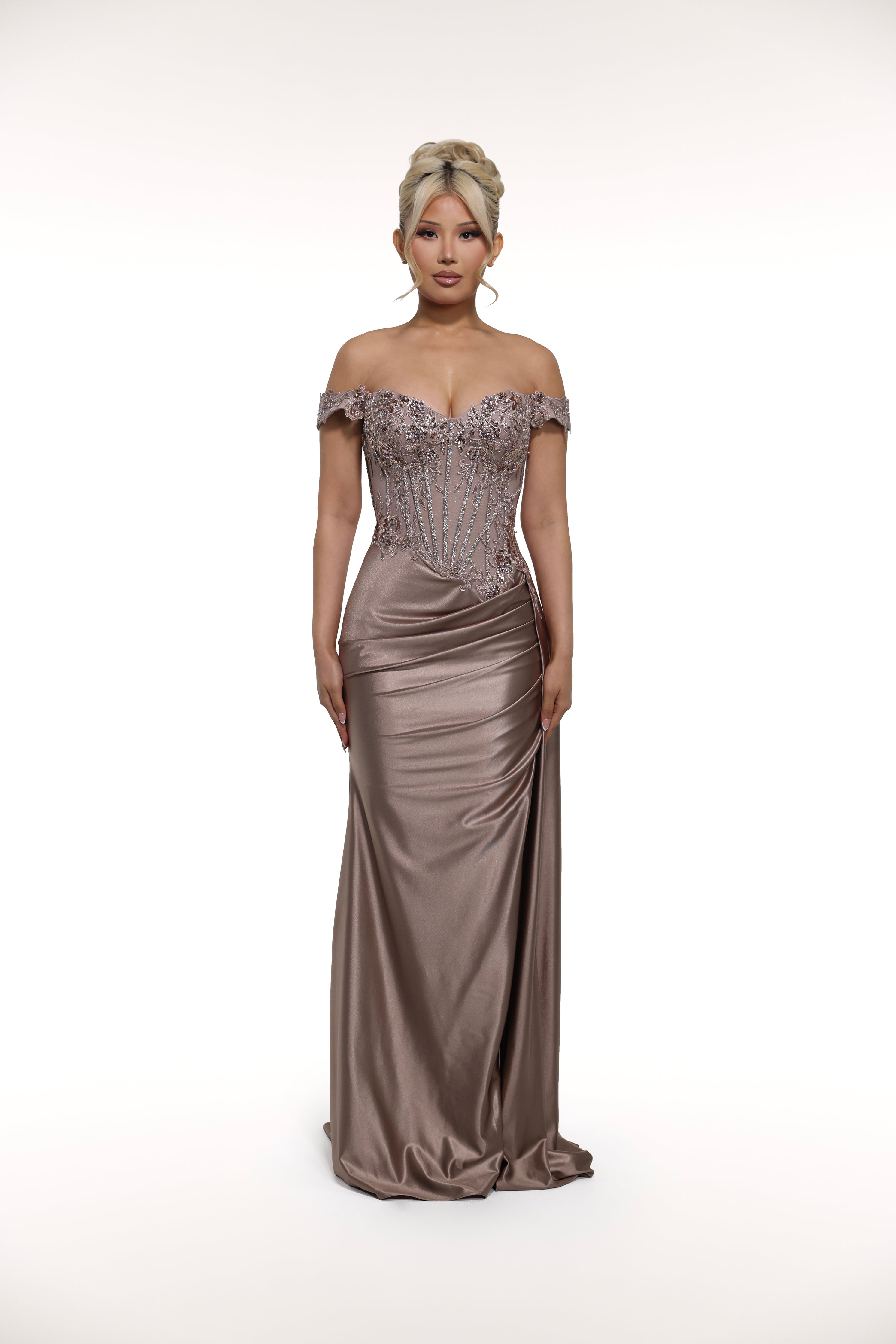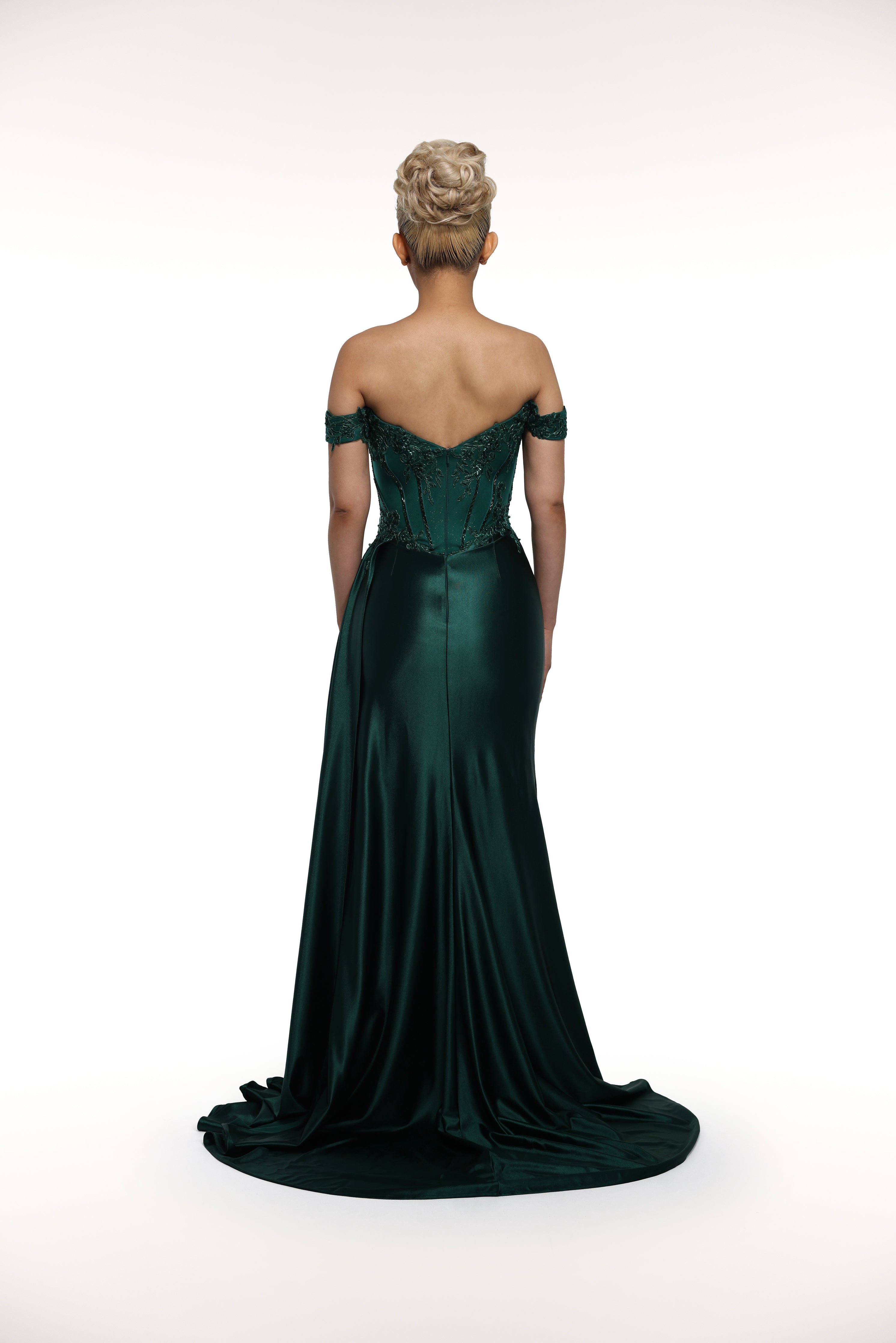 Sister to our Zara Dress, 'Ozzie' is off the shoulder satin gown that will make you stand out at any event. The lace bodice adds a touch of femininity while the left leg slit and added tail create a stunning silhouette.