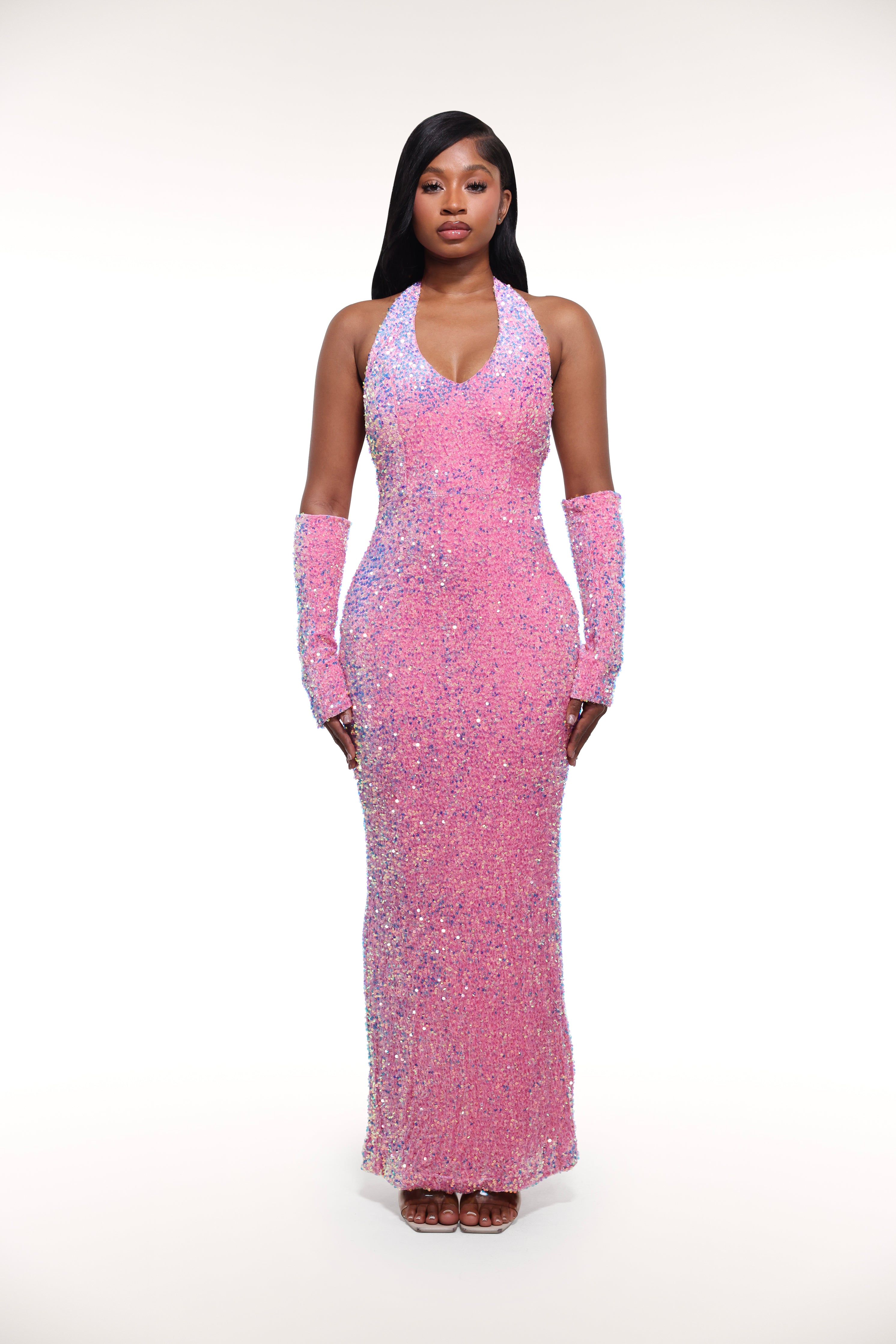 'Nicki' is a stunning long dress with a halter top and removable elbow-length sleeves. Featuring a sequin pink-covered design, this dress is perfect for making a statement at any event.