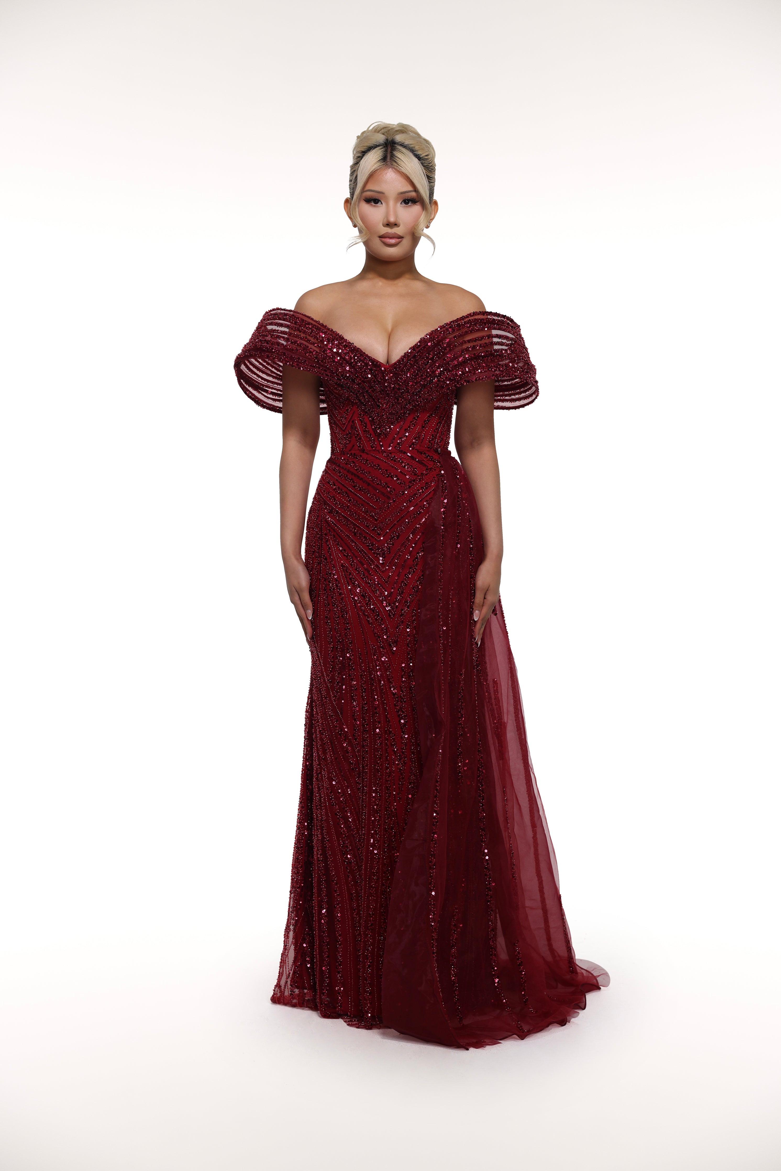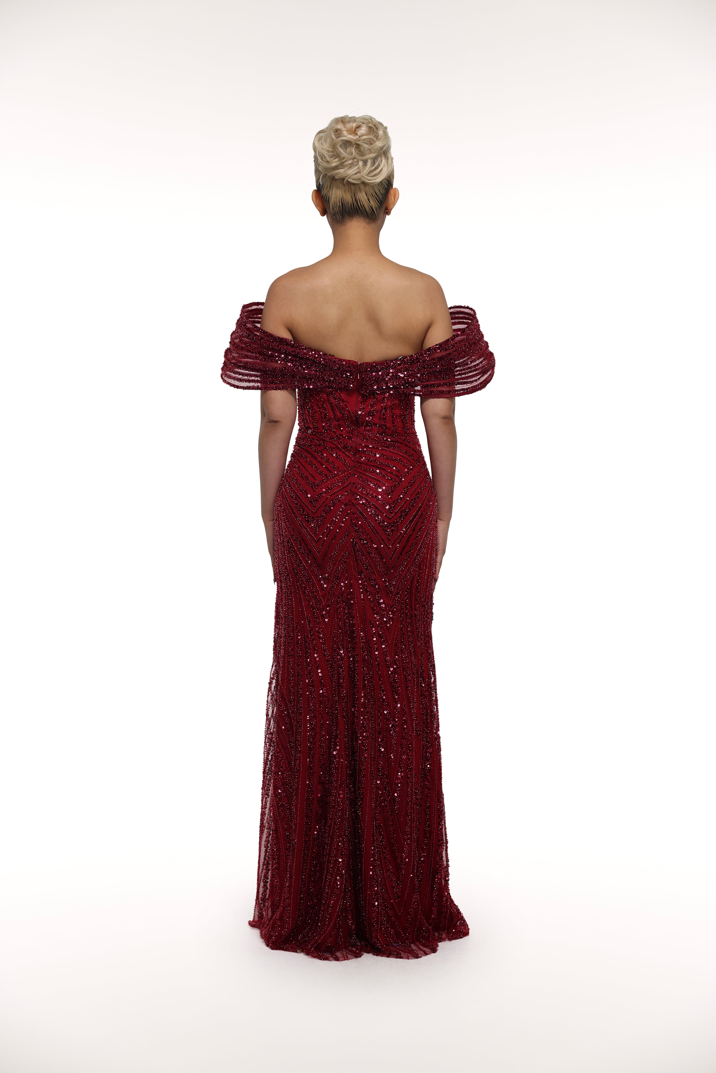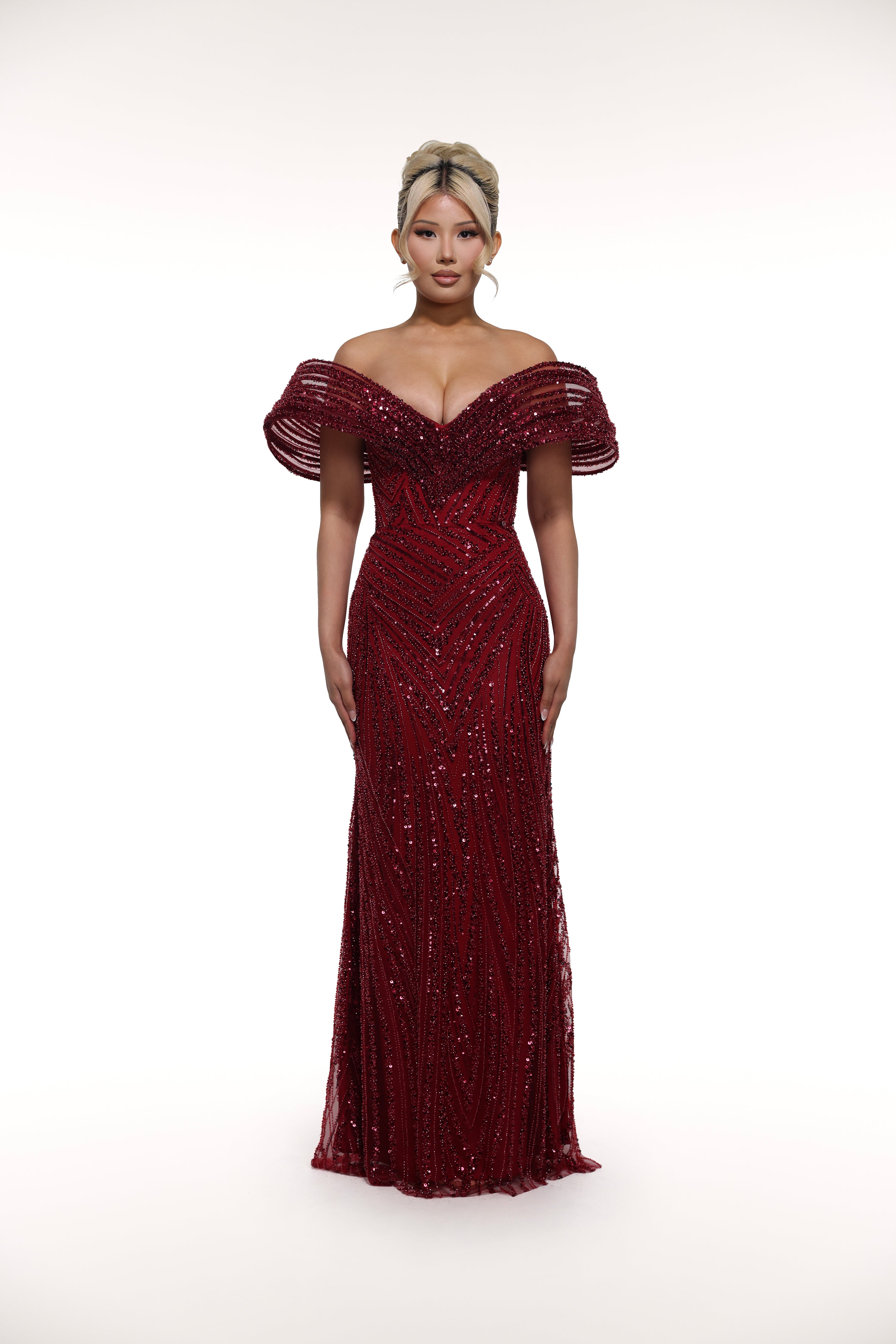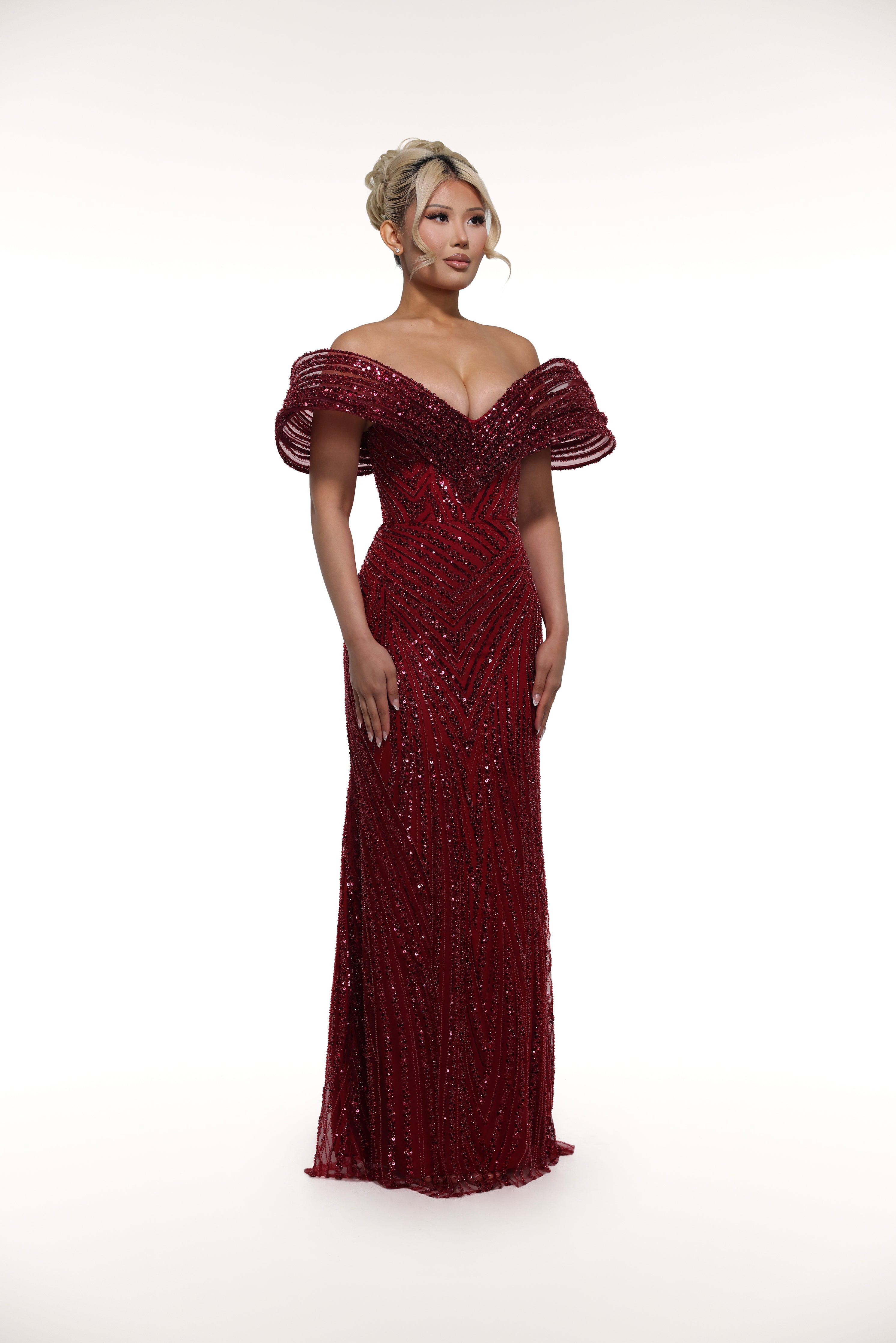 Enhance your elegance with the 'Raelene' gown. The off-shoulder flare highlights your beautiful neckline while the sweetheart neckline adds a touch of charm. The sequin pattern adds a touch of sparkle to your look.