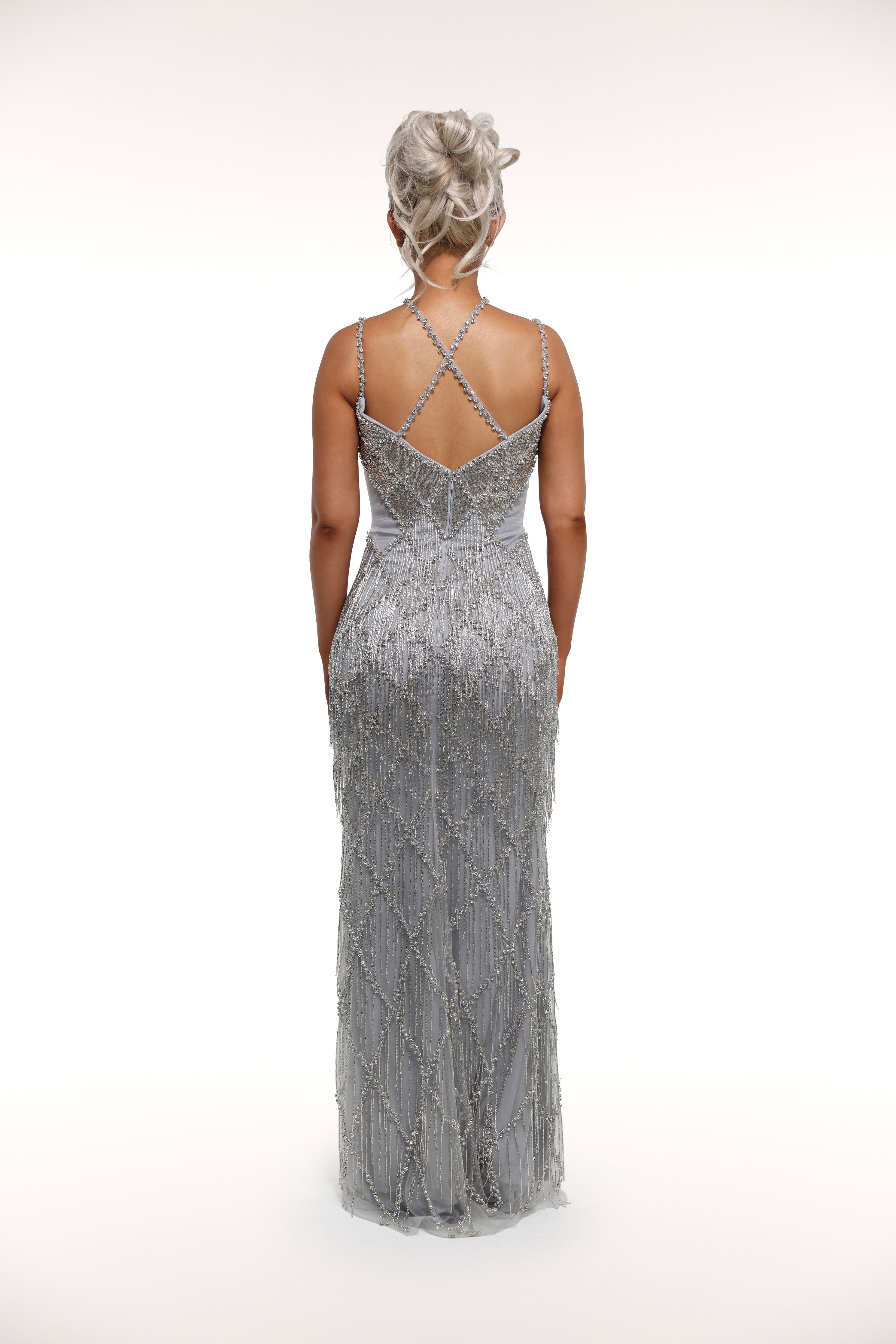 Introducing 'Lanazia' the stunning gown embellished with silver details and adorned with criss-cross straps and dancing silver tassels. Channel your inner elegance and shine at any event.