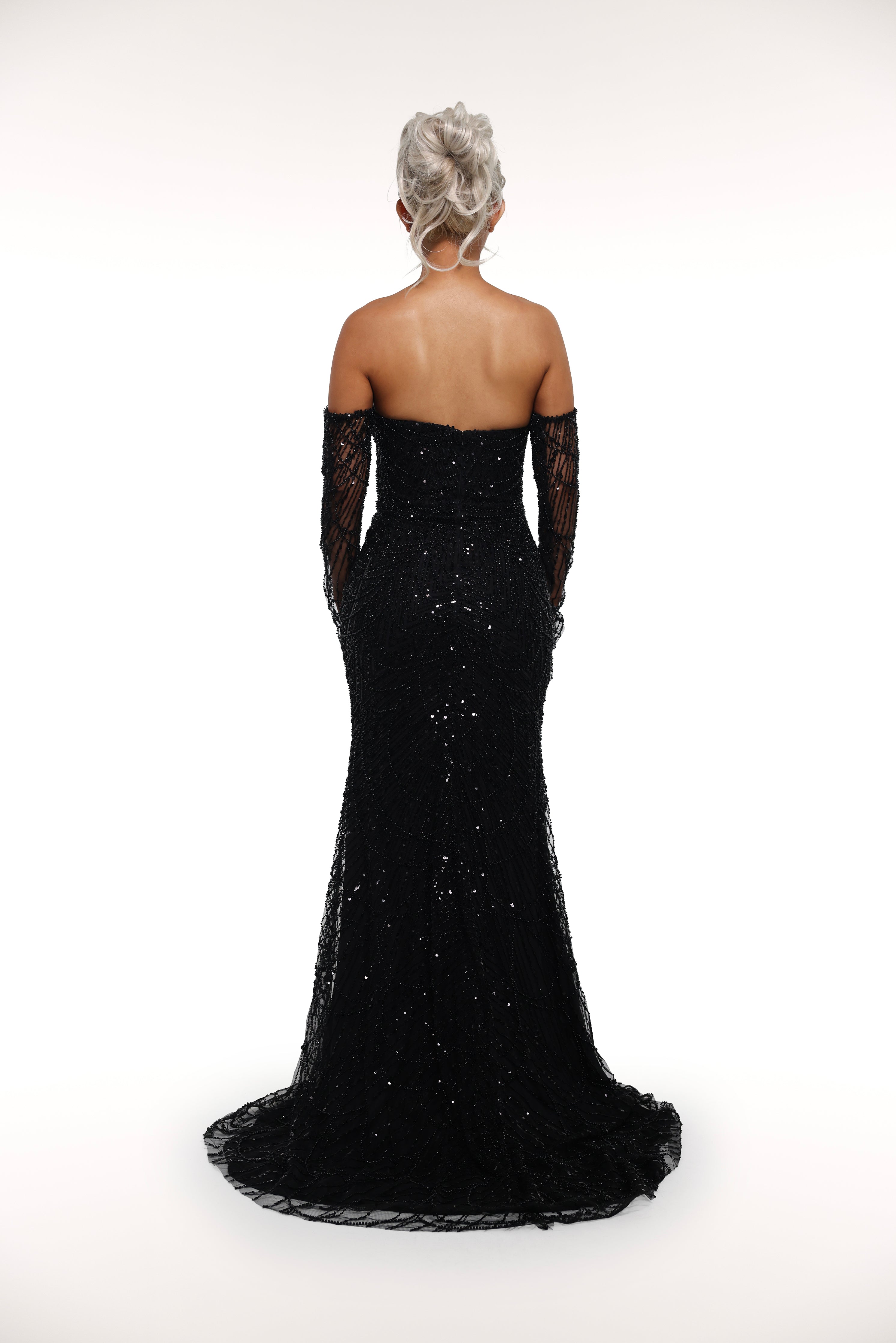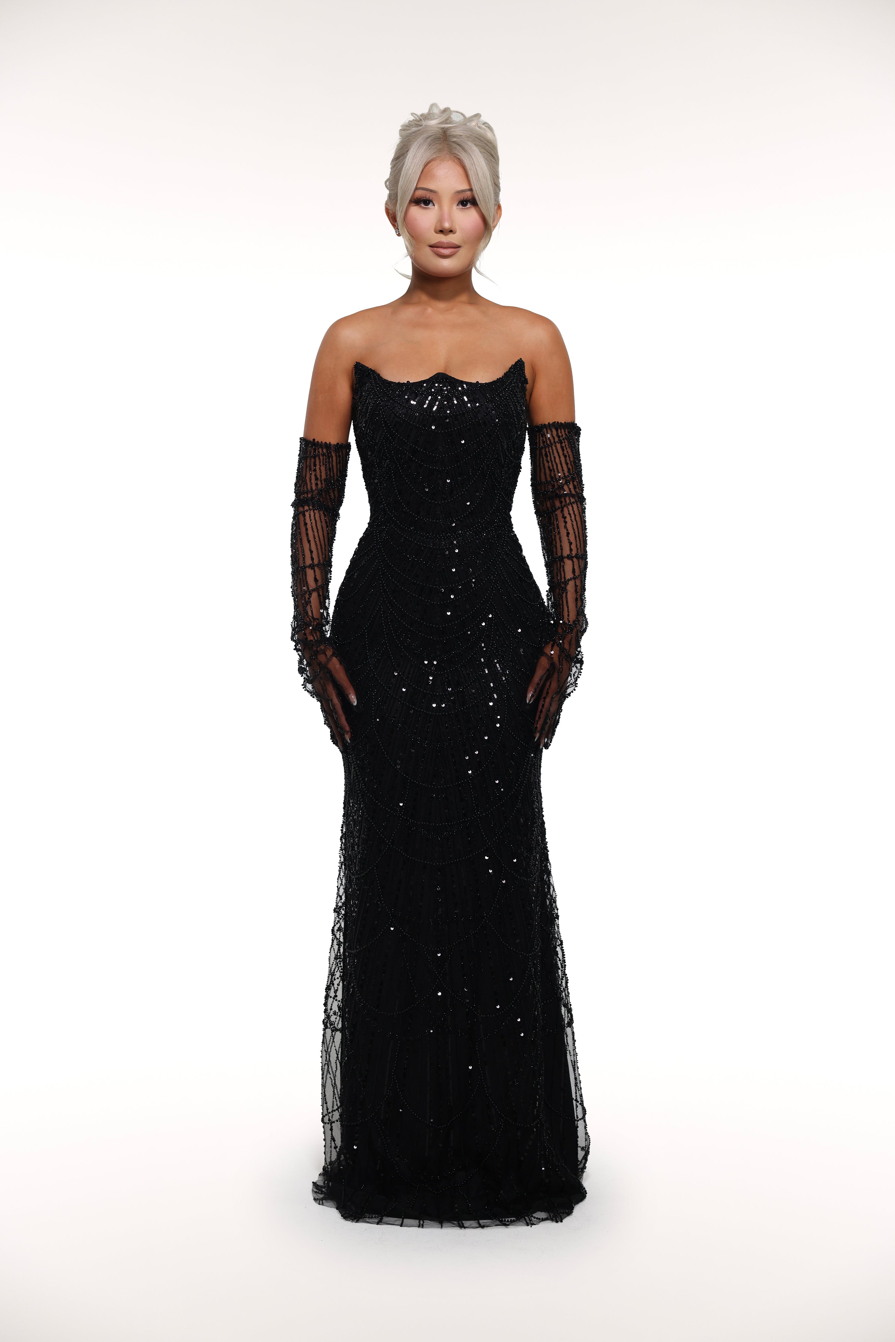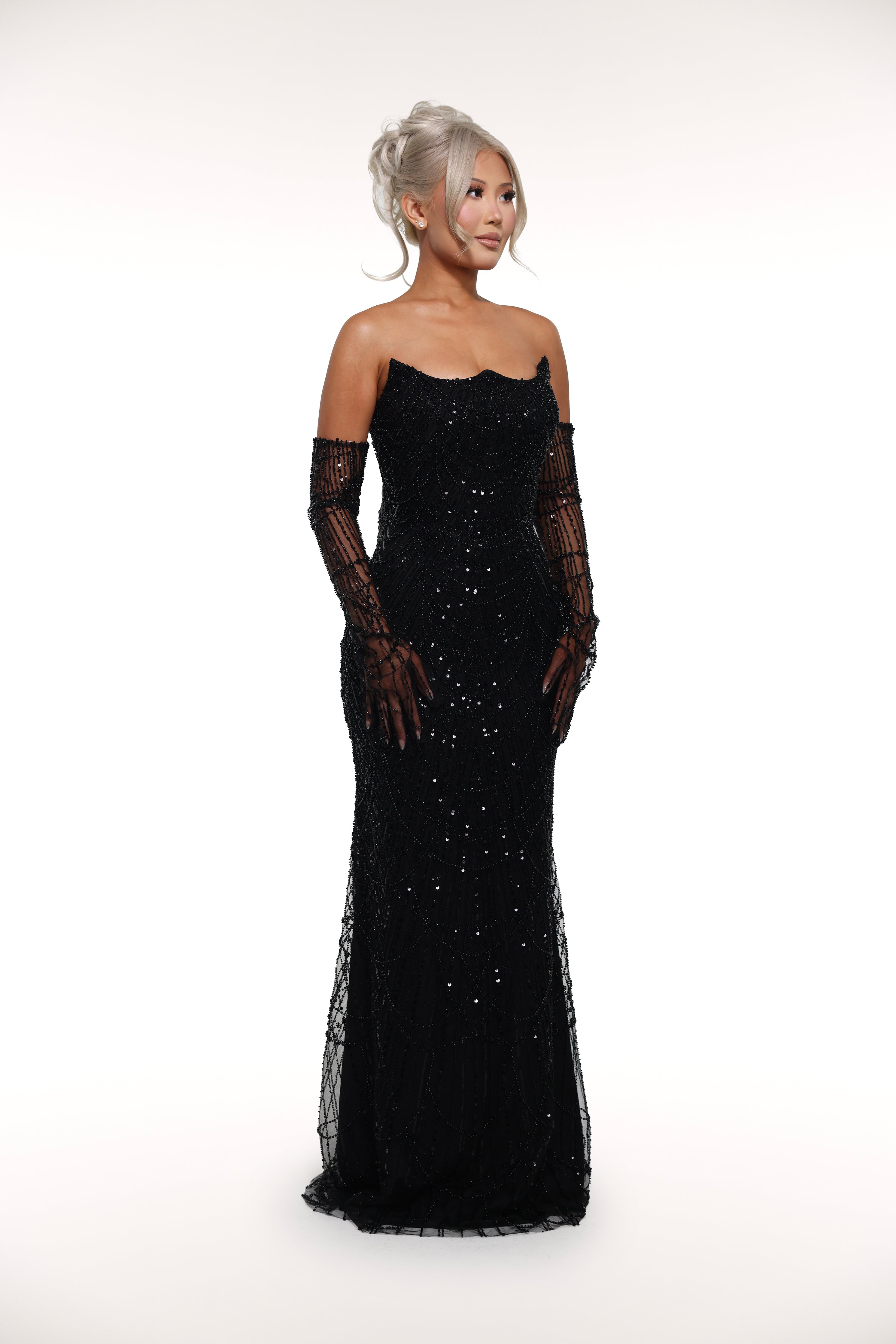 Introducing 'Swavy' a stunning gown - a strapless masterpiece adorned with sparkling rhinestones and completed with elegant elbow-length gloves. Elevate any special occasion with this fashion-forward ensemble.