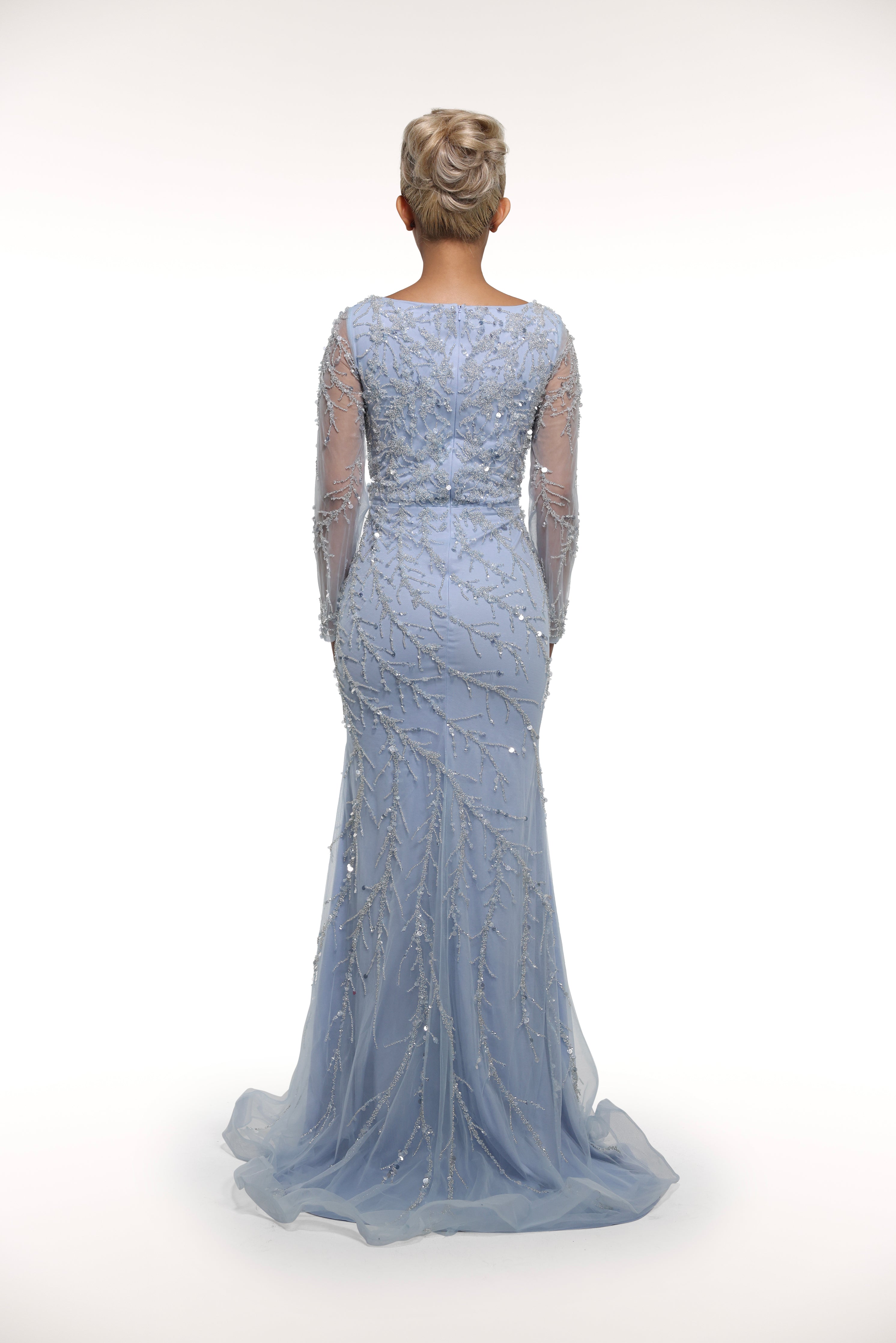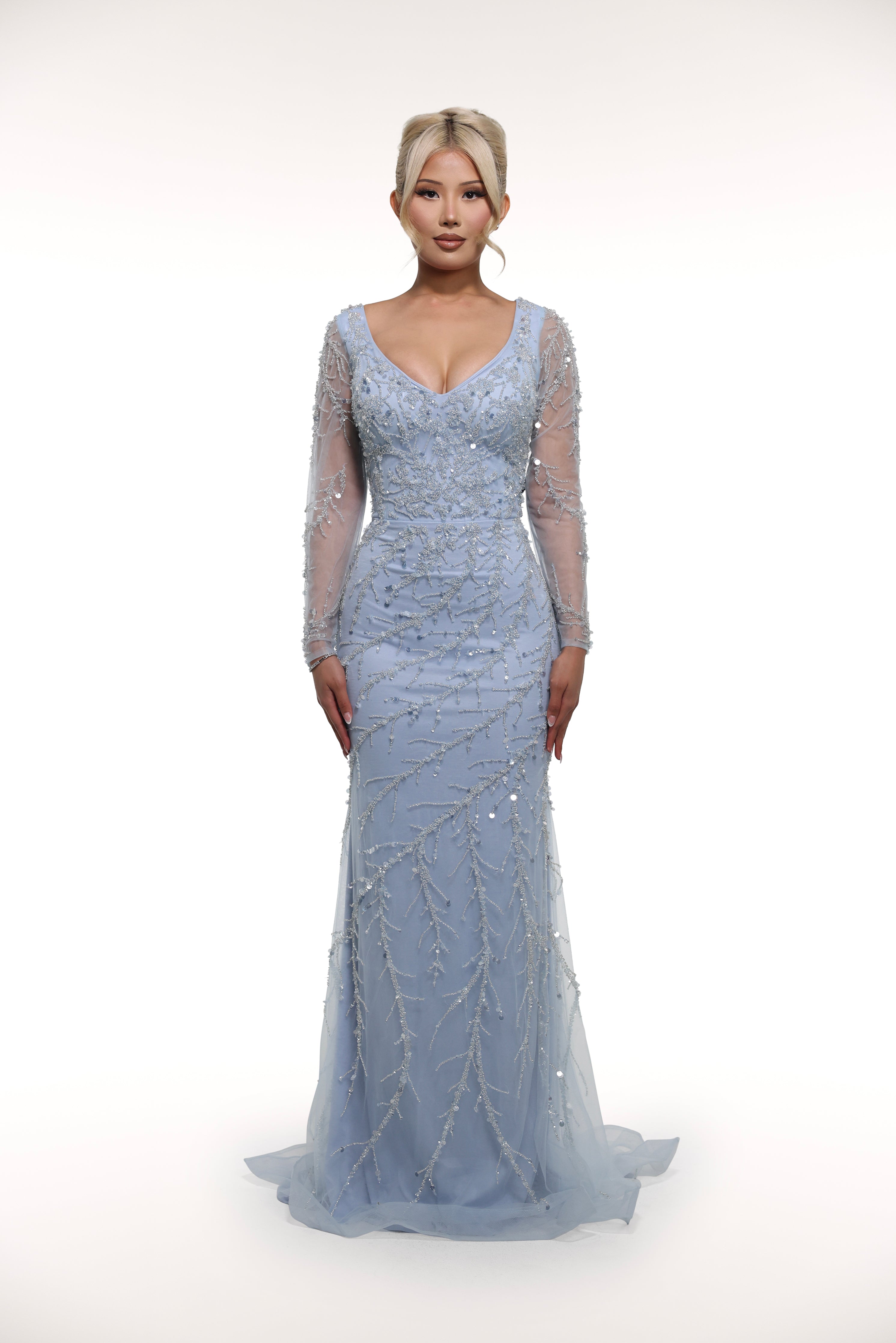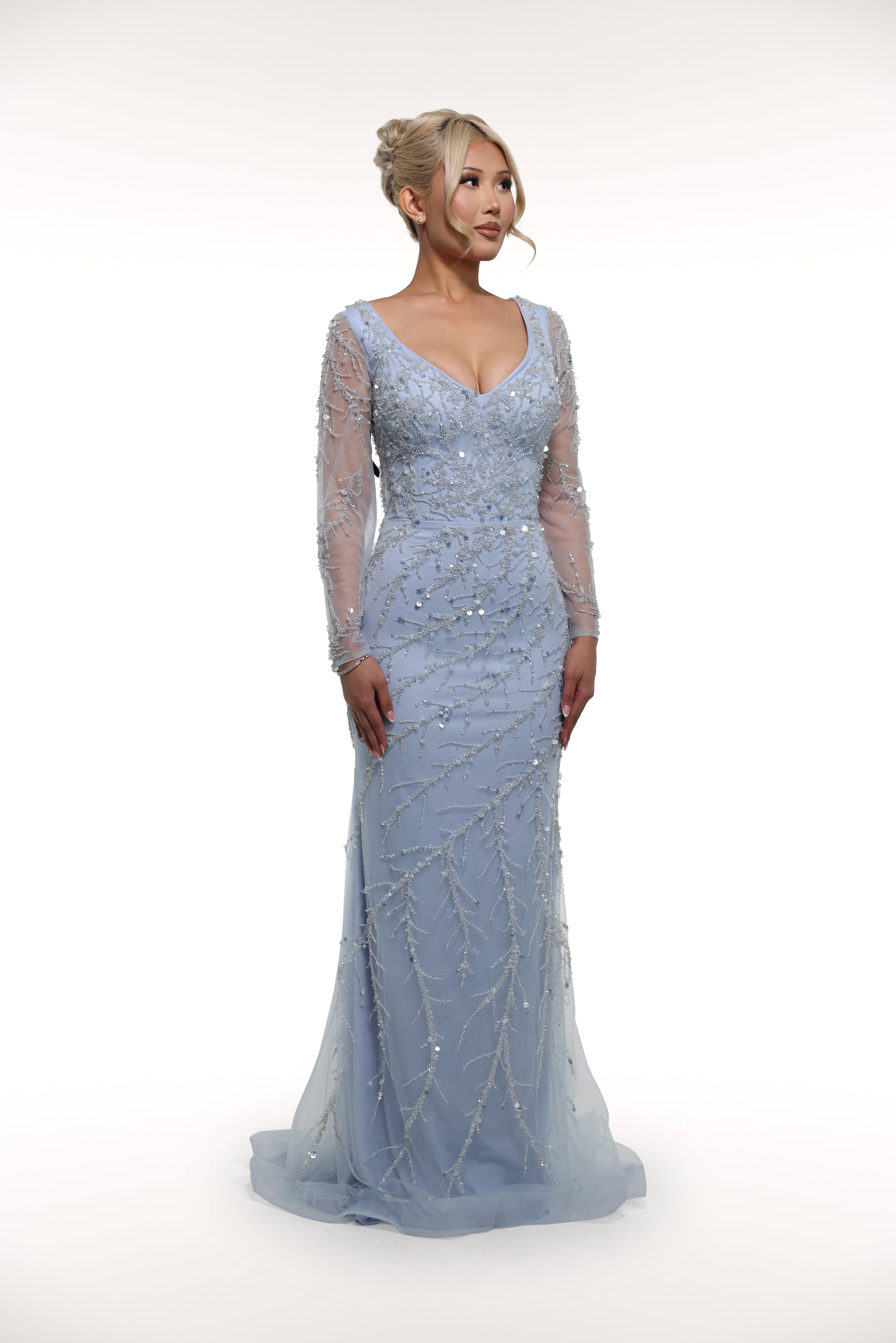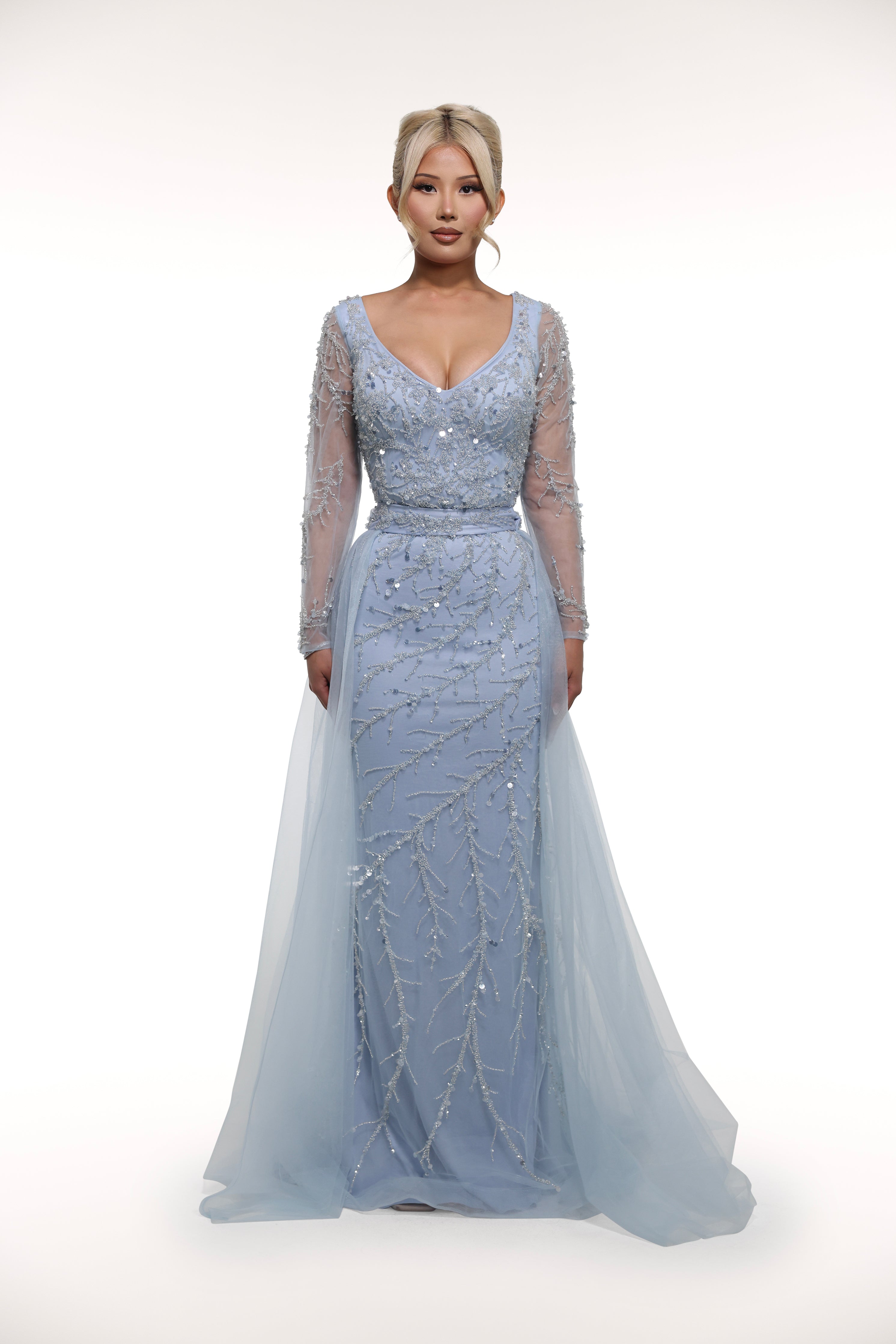 Introducing 'Rinnia', the epitome of elegance. This stunning long sleeve gown boasts an overlay tulle skirt, embellished throughout for a touch of glamour. In a beautiful light blue shade, this dress is sure to turn heads and make a statement at any special occasion.