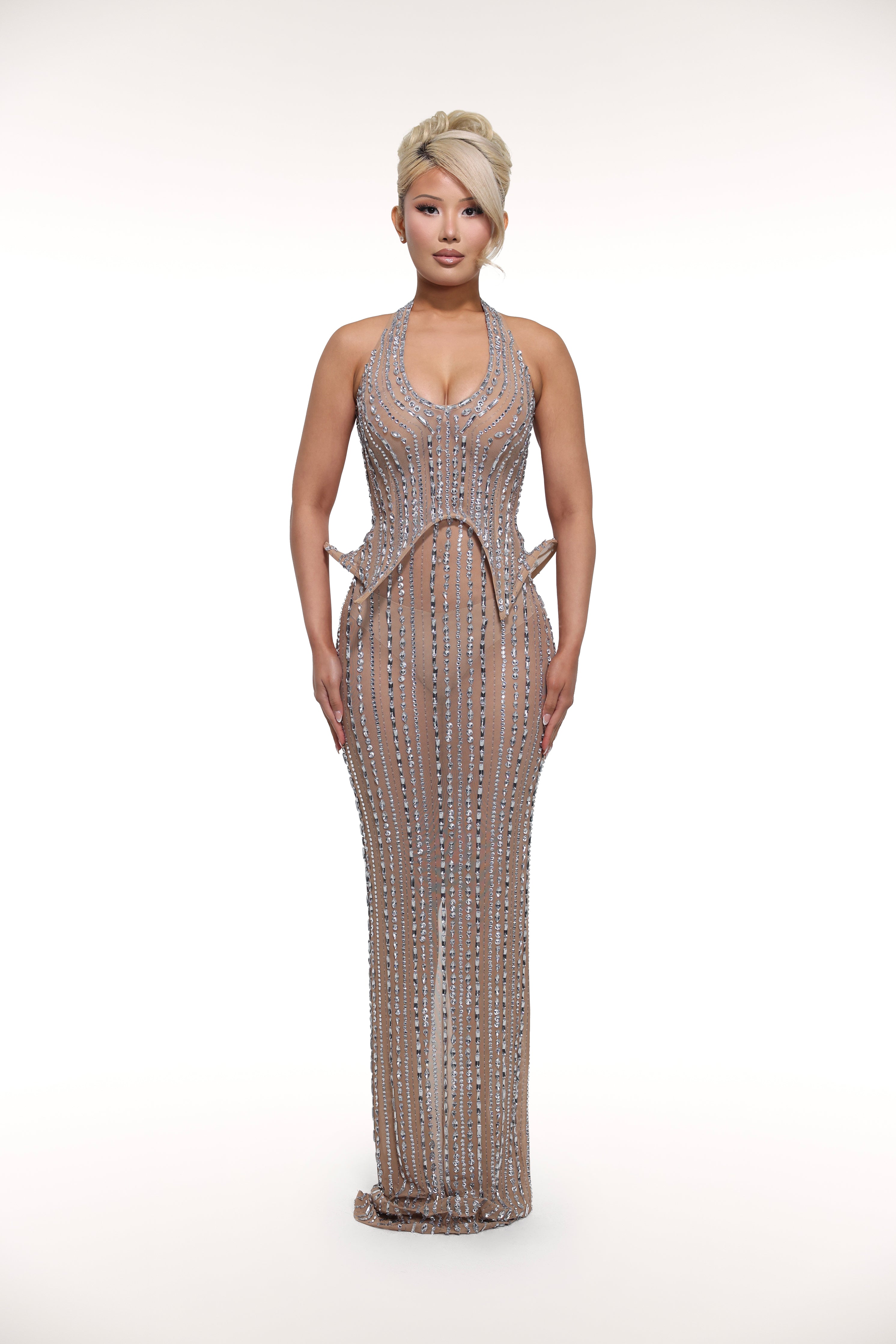 'Domunique' is a truly one-of-a-kind gown both in looks and style. Halter top neckline that emphasizes the plunging neckline for a sexy look with an intricate detail for the hips. This long dress is made of a stretchy mesh fabric with a slit in the back for easy movement and a figure-hugging outline and matching rhinestone embellishments covering the whole piece.