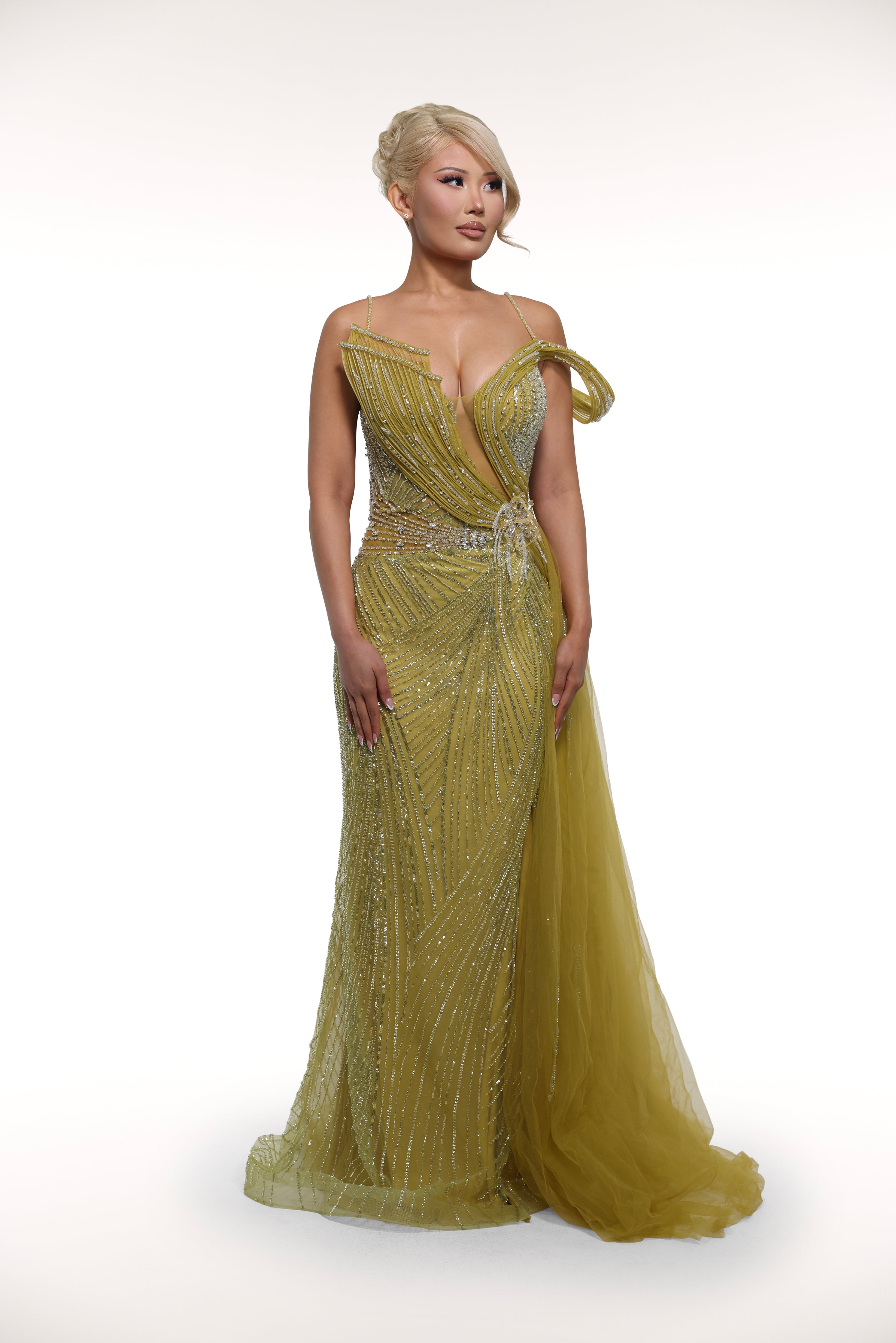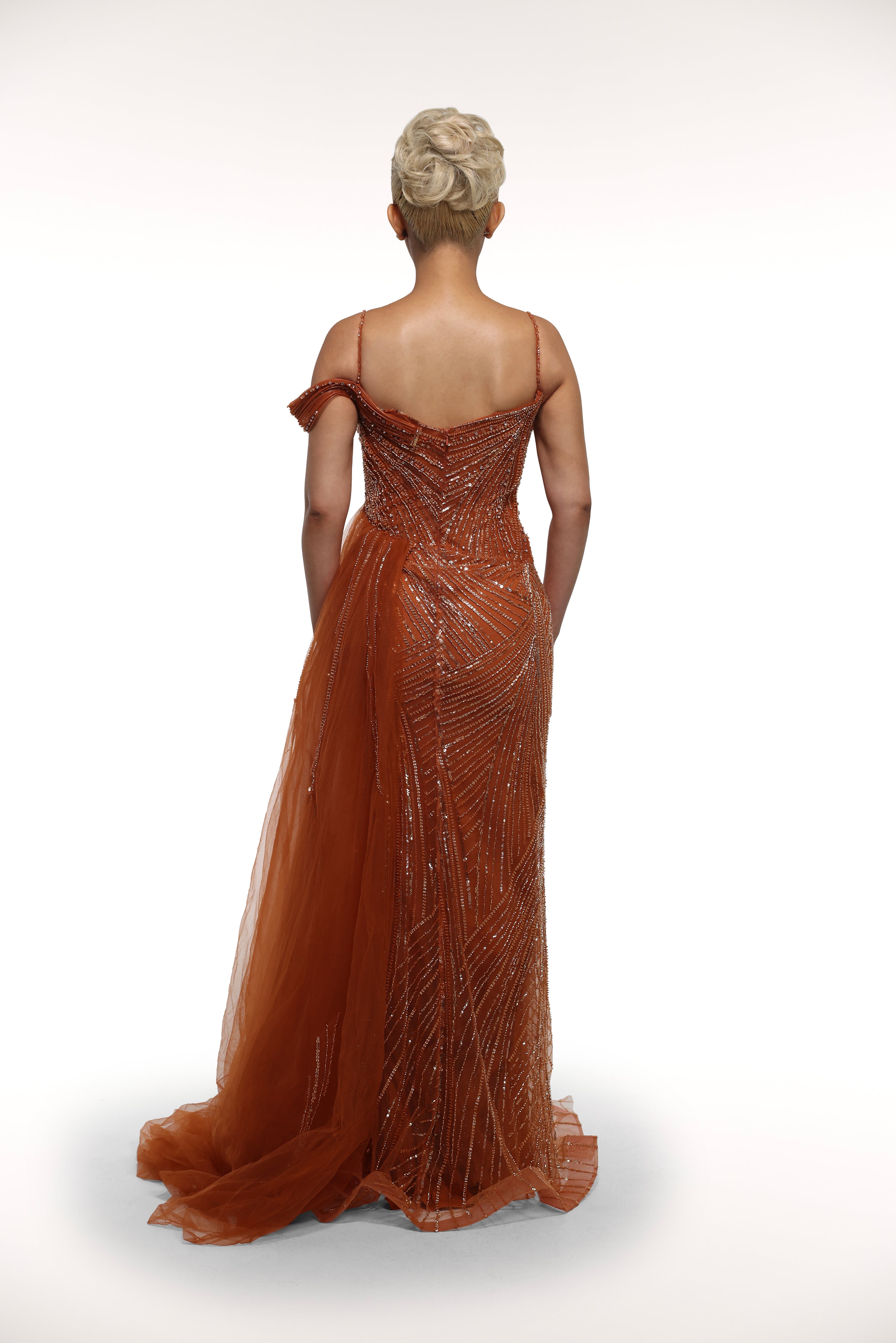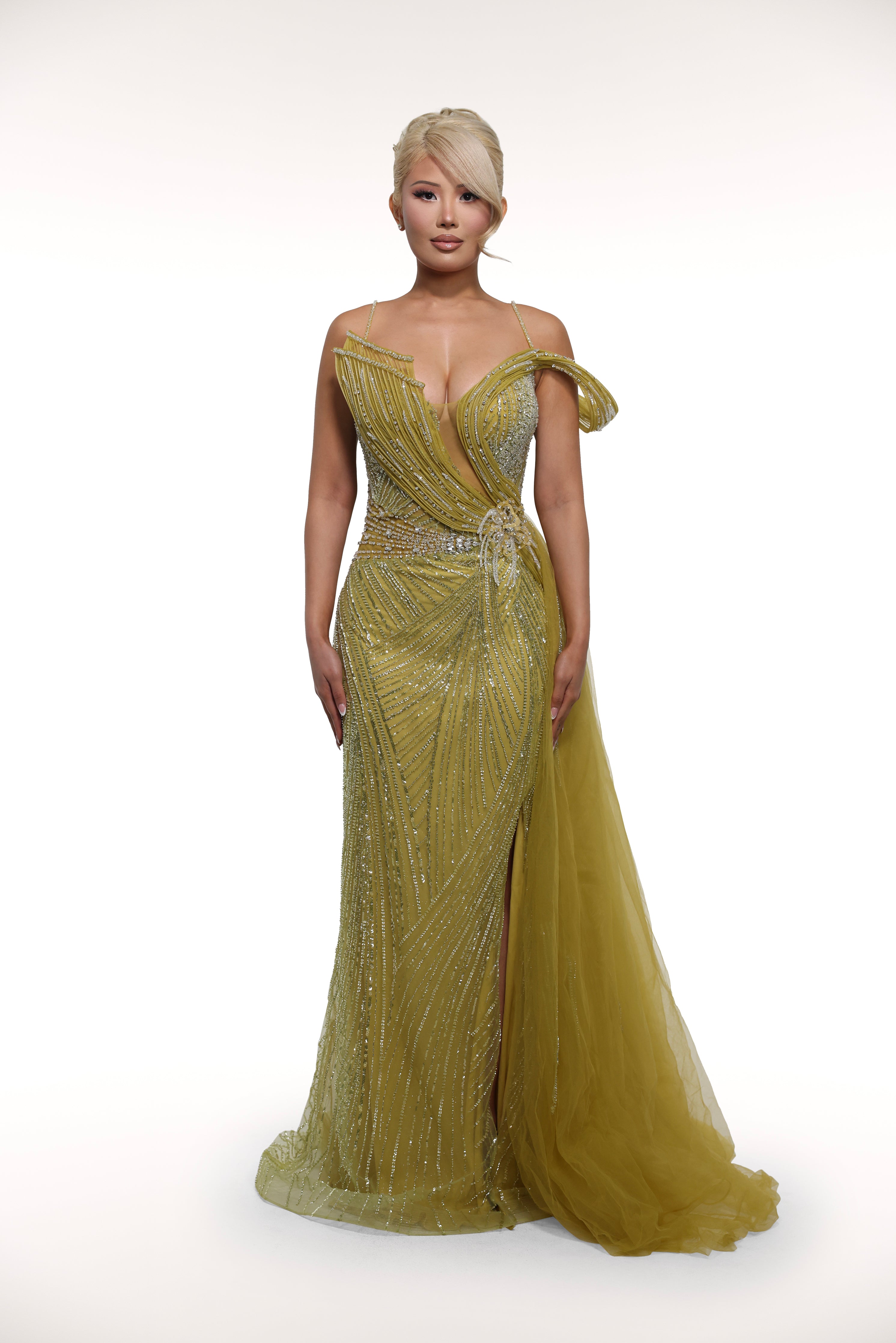 Enhance your beauty with 'Citrina', a stunning embellished gown. Its slit on the left leg adds a touch of allure, while the straps provide support. The wavy details along the right side and left off-shoulder strap exude elegance. Complete your look with the added tulle skirt on the left for a perfect flare.