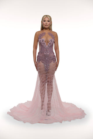 A woman wearing a glamorous, fitted brown gown with feather details poses beside an ornate mirror in a bright room.