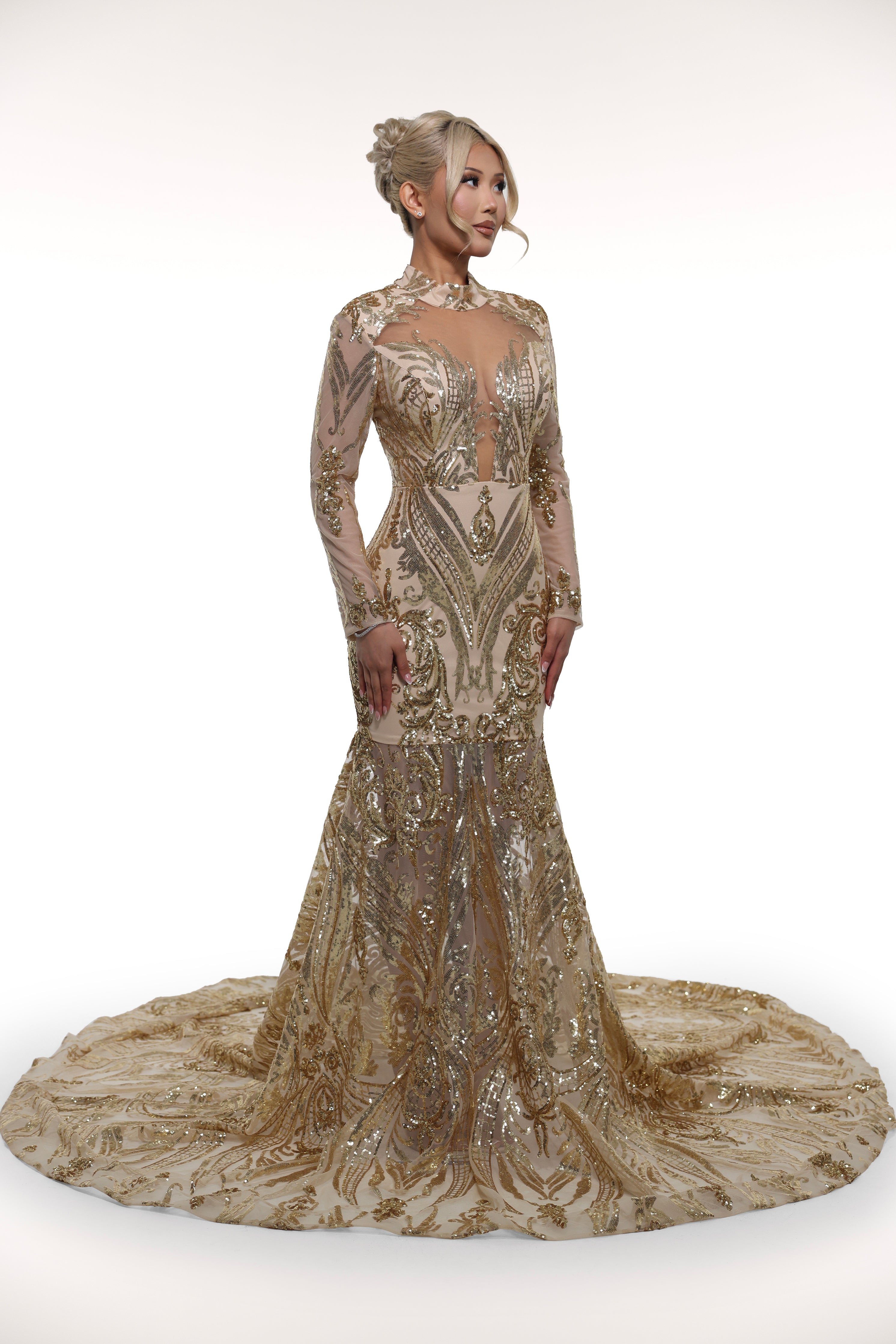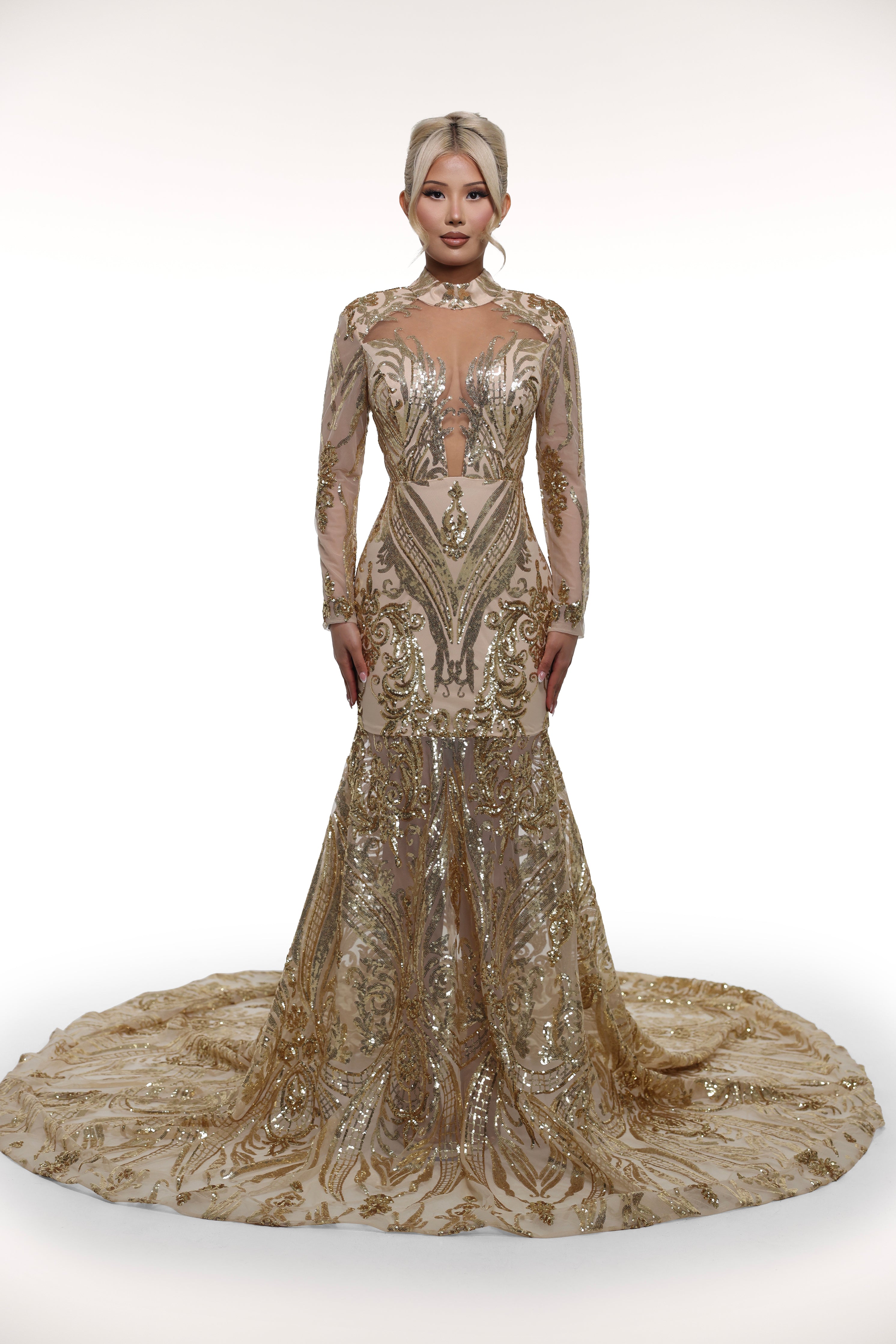 Expertly crafted, the 'Alyna Gown' showcases a high neck design and long sleeves with a stunning sequin pattern. The elegant gown is completed with a long tail and a delicate mesh chest lining, creating a sophisticated and timeless look.