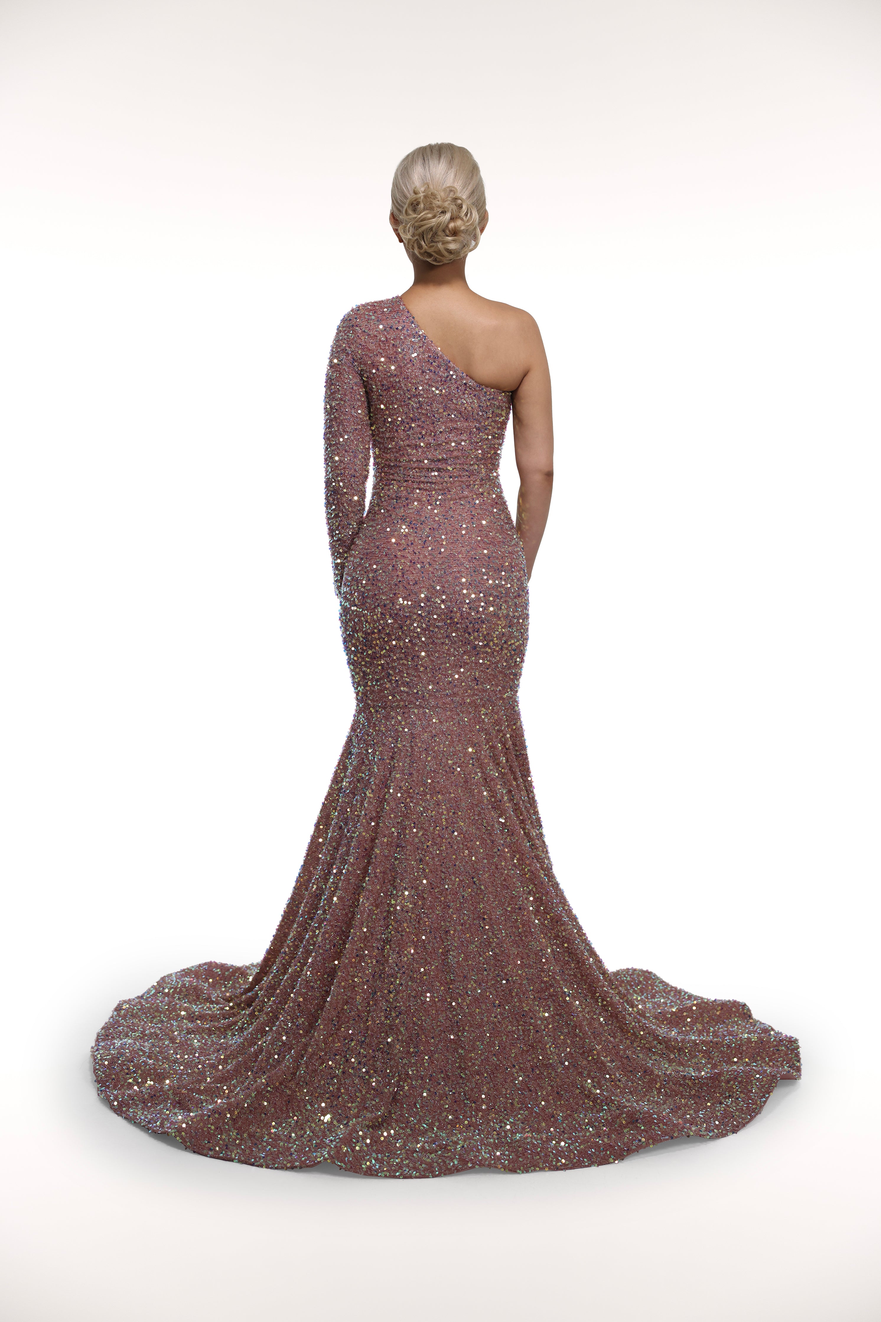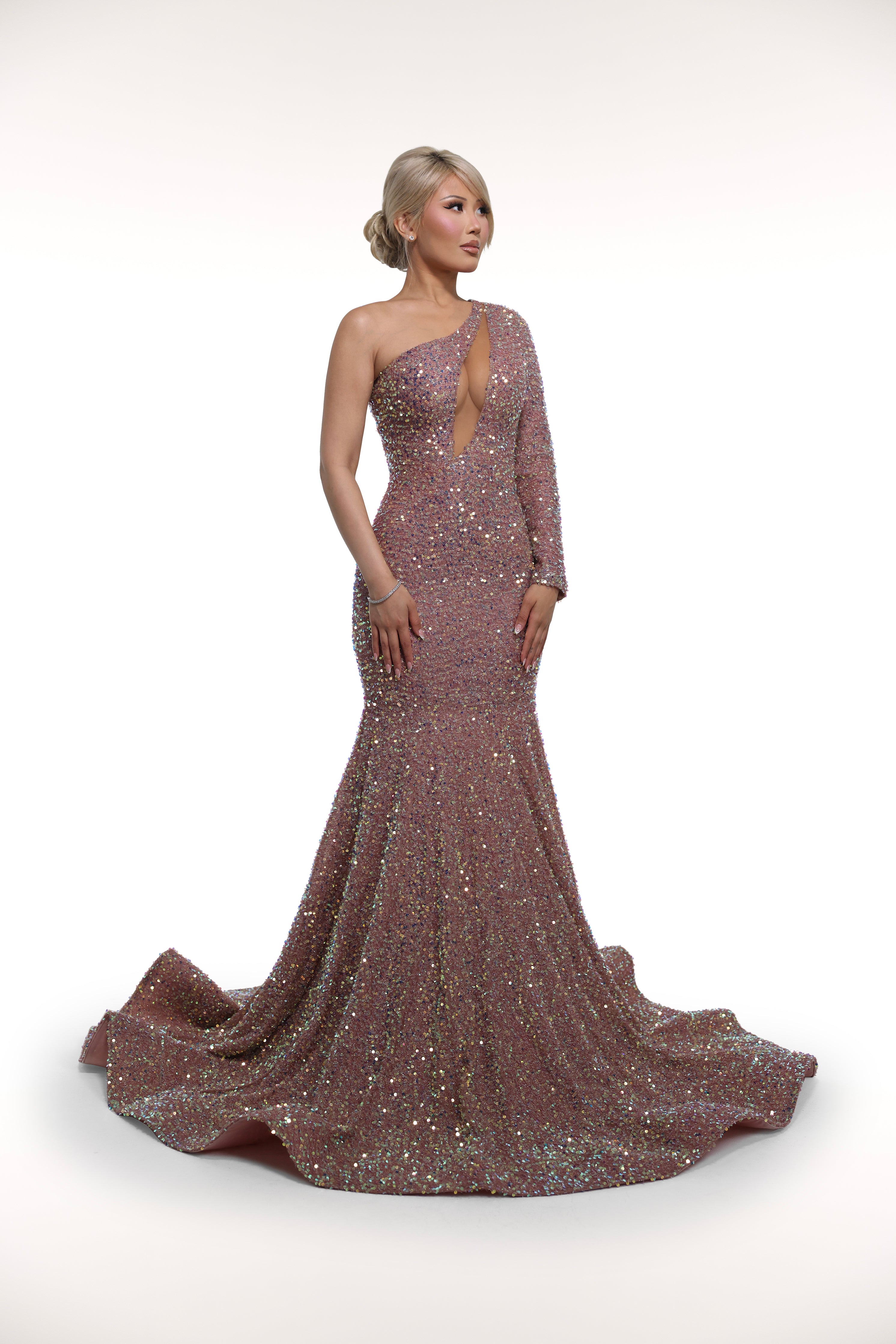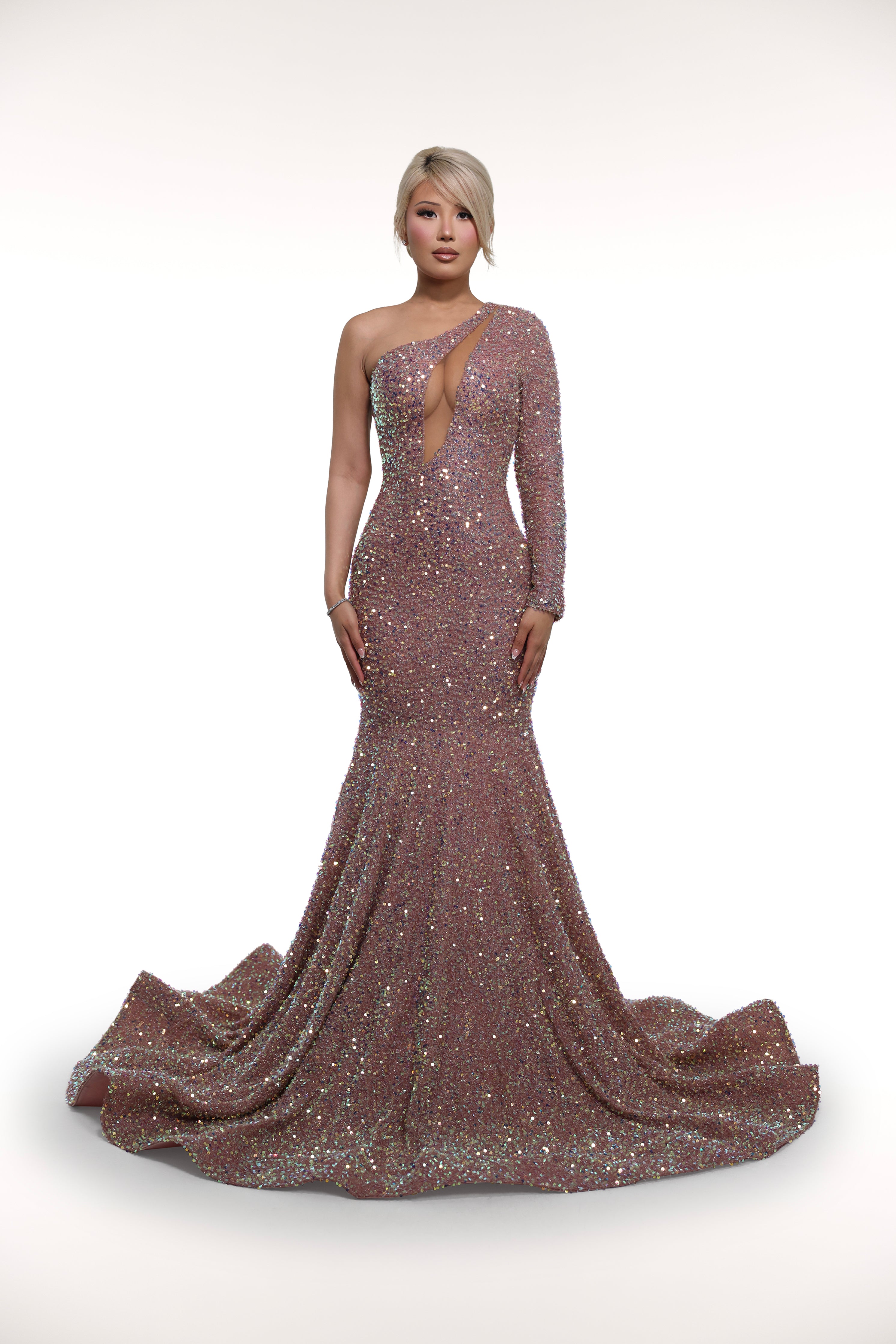The 'Champagnes' gown is a dazzling one-sleeve ensemble crafted with glitter sequin fabric and a mesh-lined cutout. Its unique design features a diagonal bust cutout that accentuates the figure and adds a touch of elegance. Perfect for formal events, this gown is sure to make a statement.