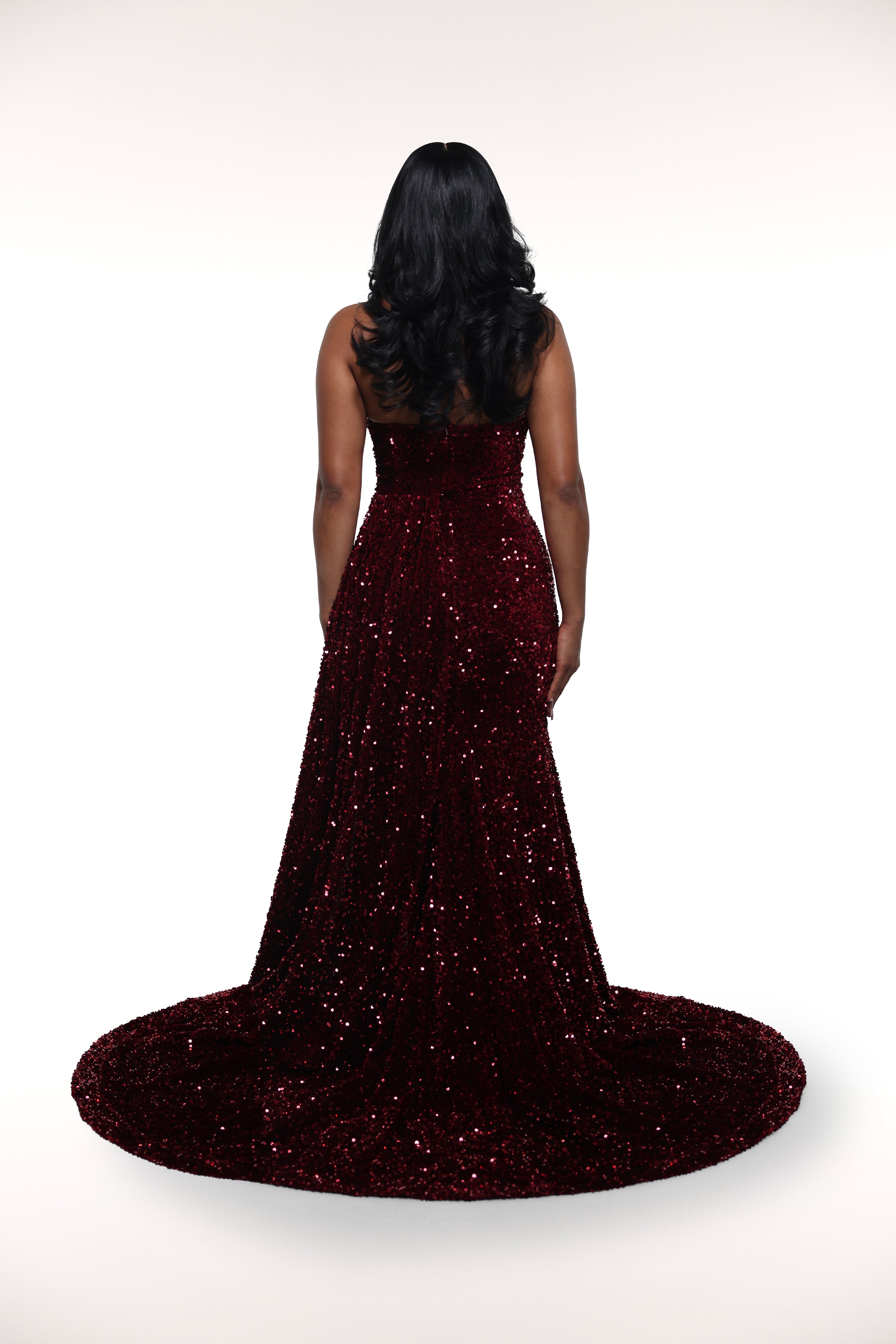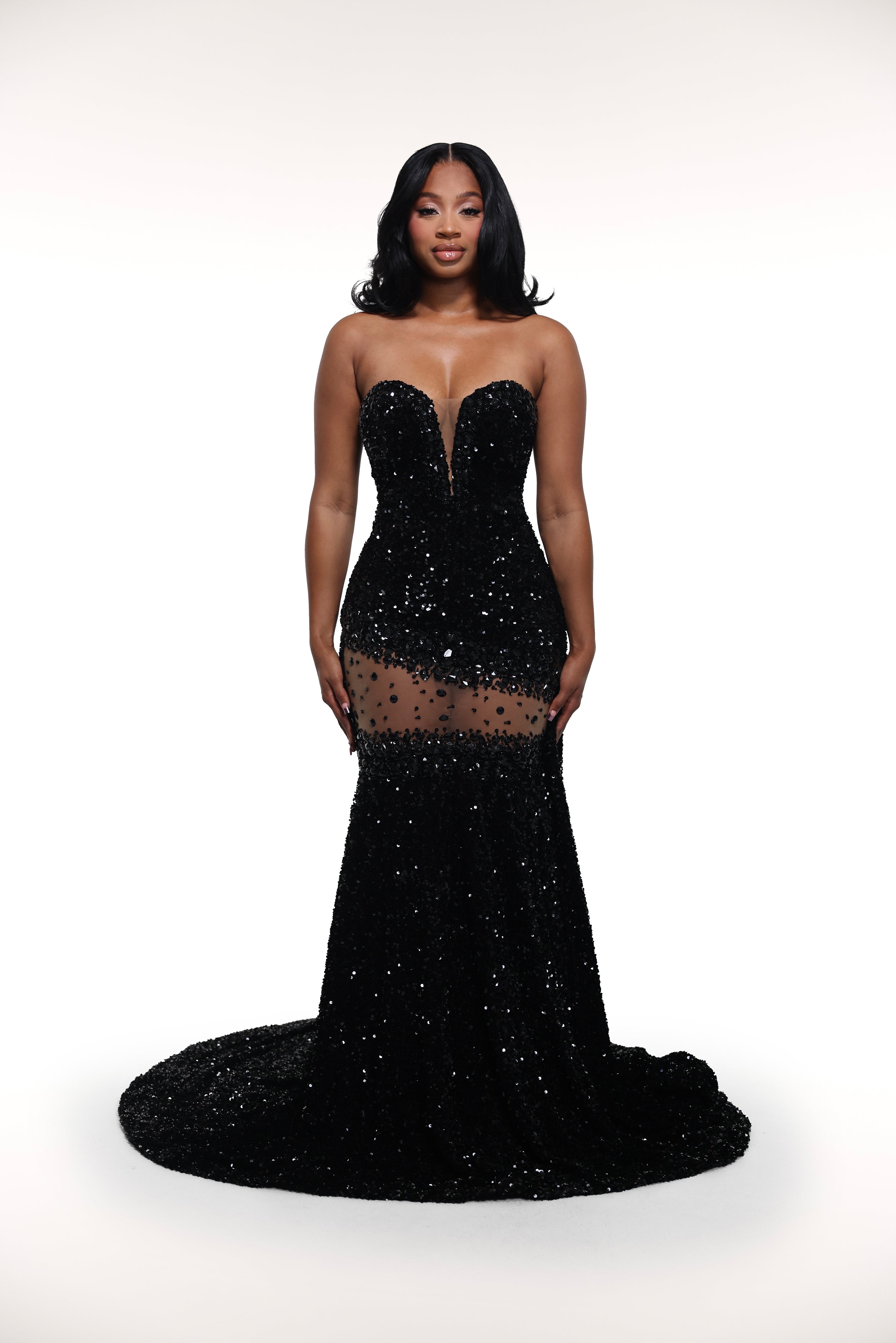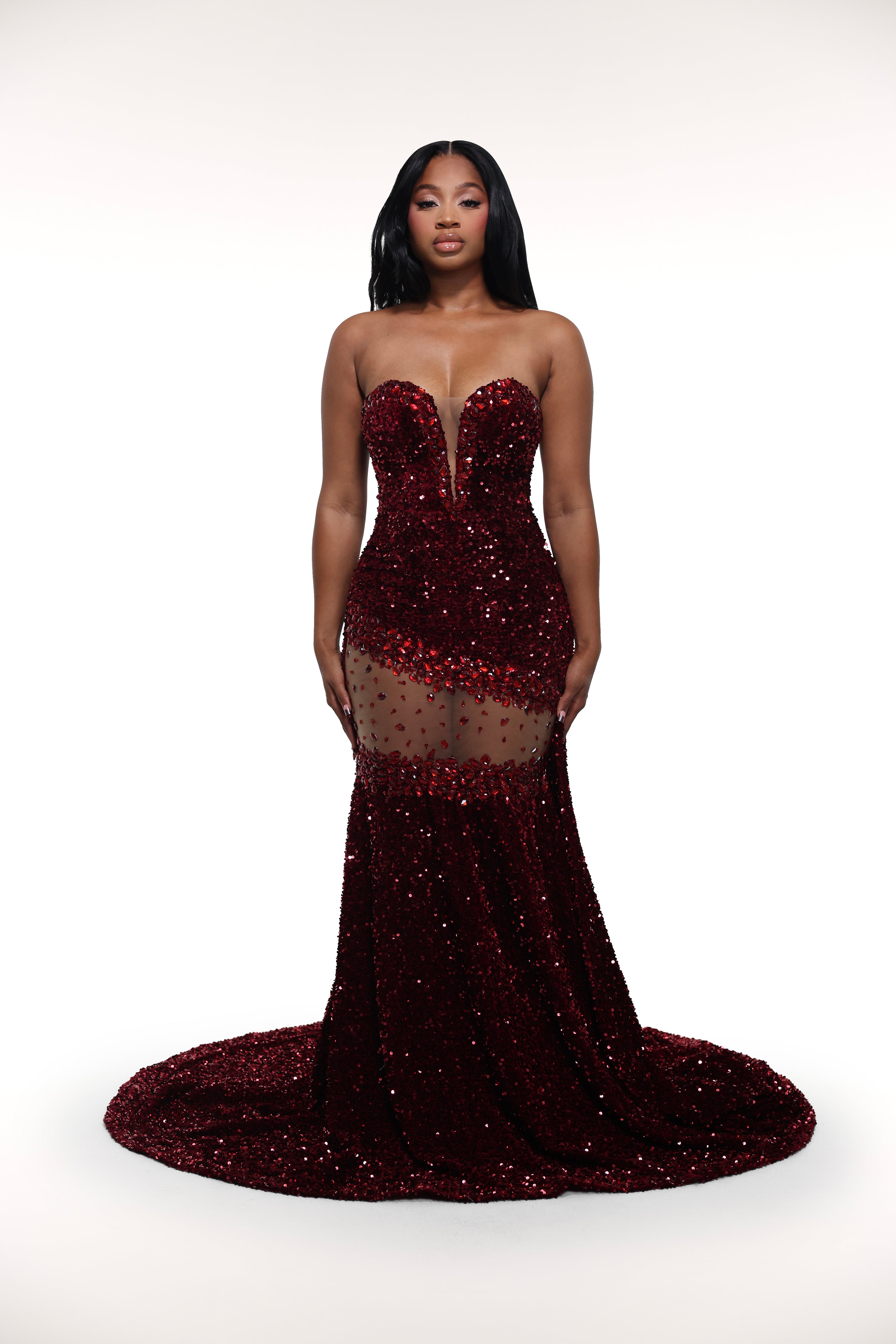 Expertly crafted for dramatic effect, the 'Cindy Gown' features a strapless sweetheart neckline adorned with shimmering sequins. This show-stopping gown also boasts a faux mesh cut-out embellished with sparkling rhinestones.