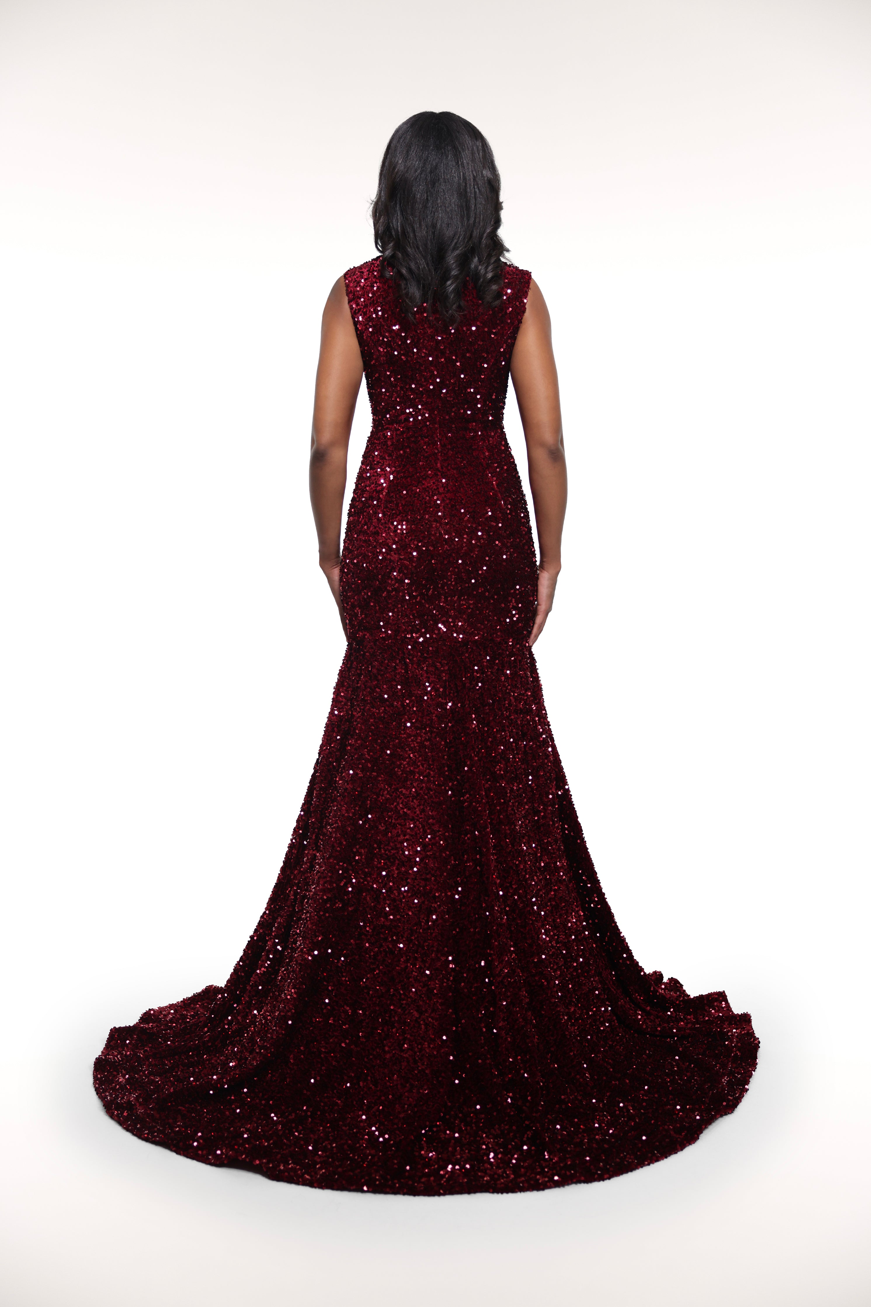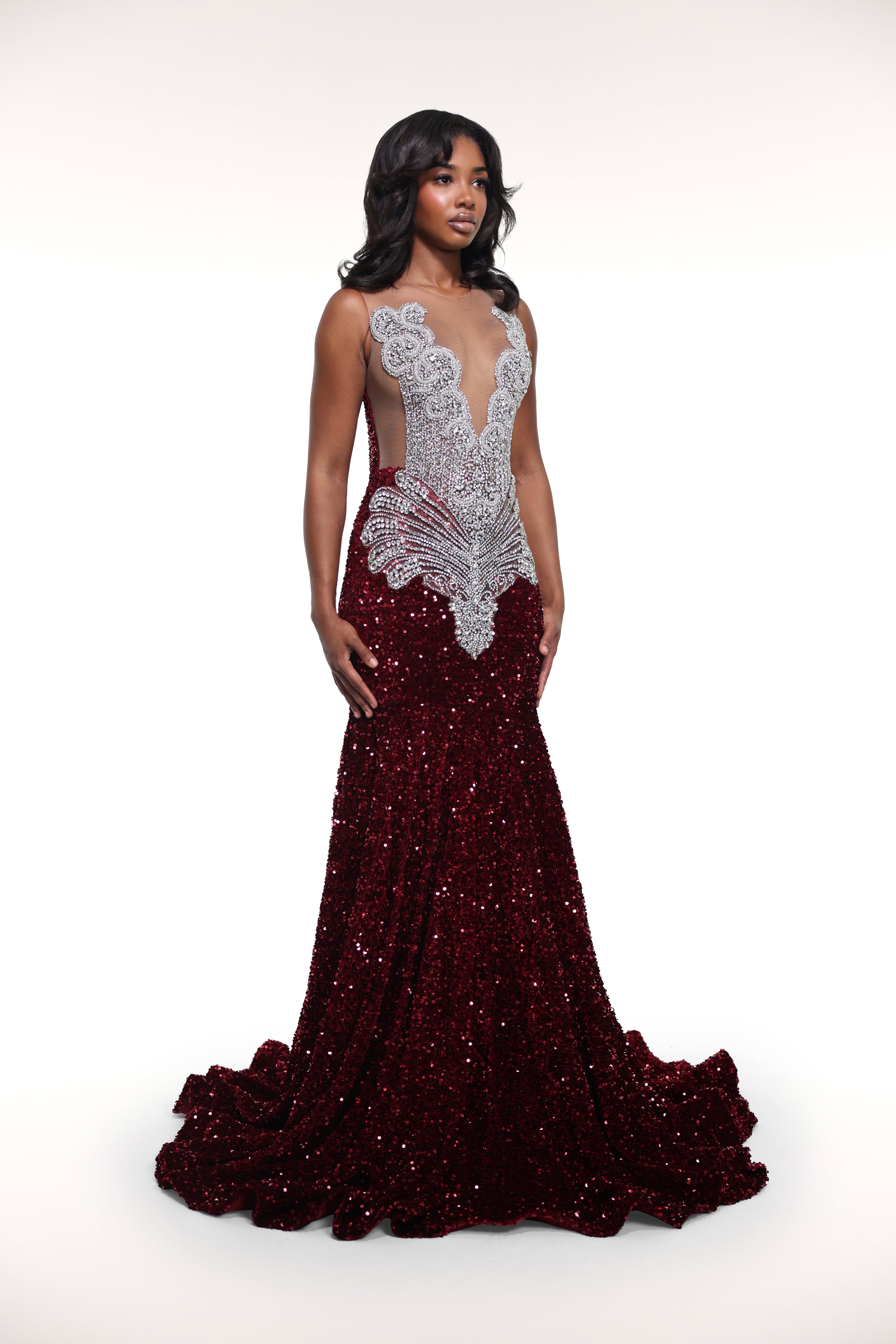 'Keyara' is a sequin mermaid silhouette dress with a v-shaped designed beaded mesh top.