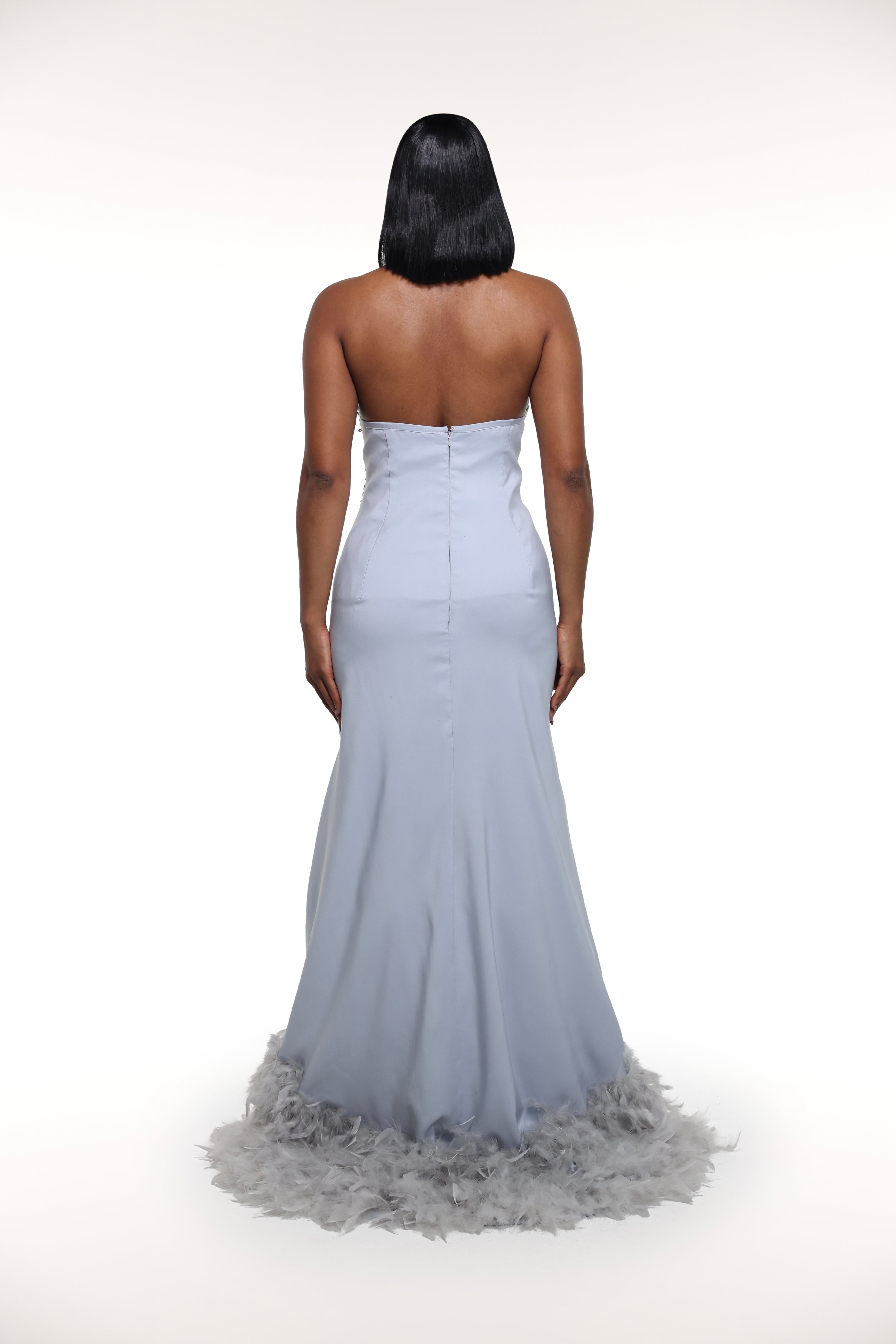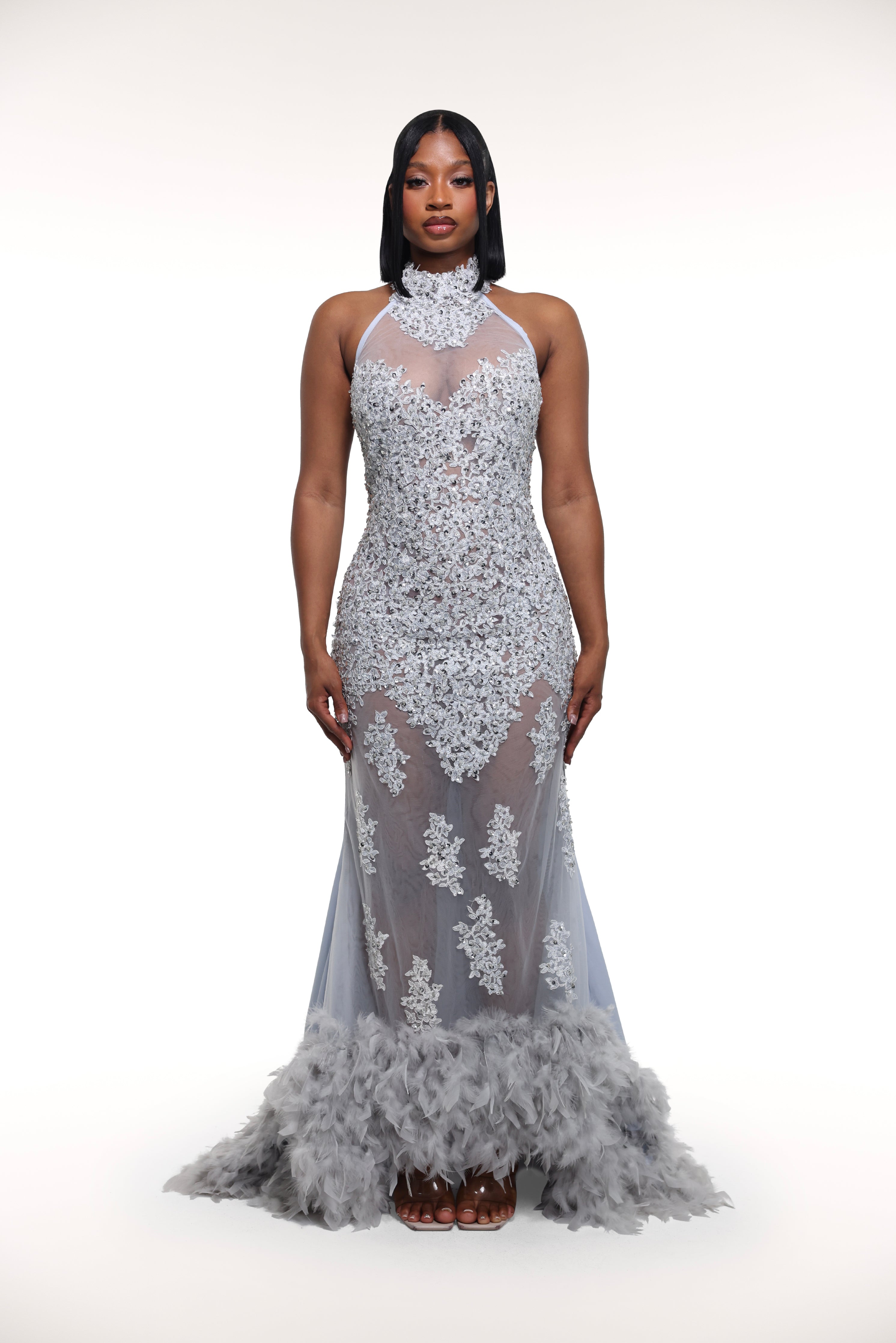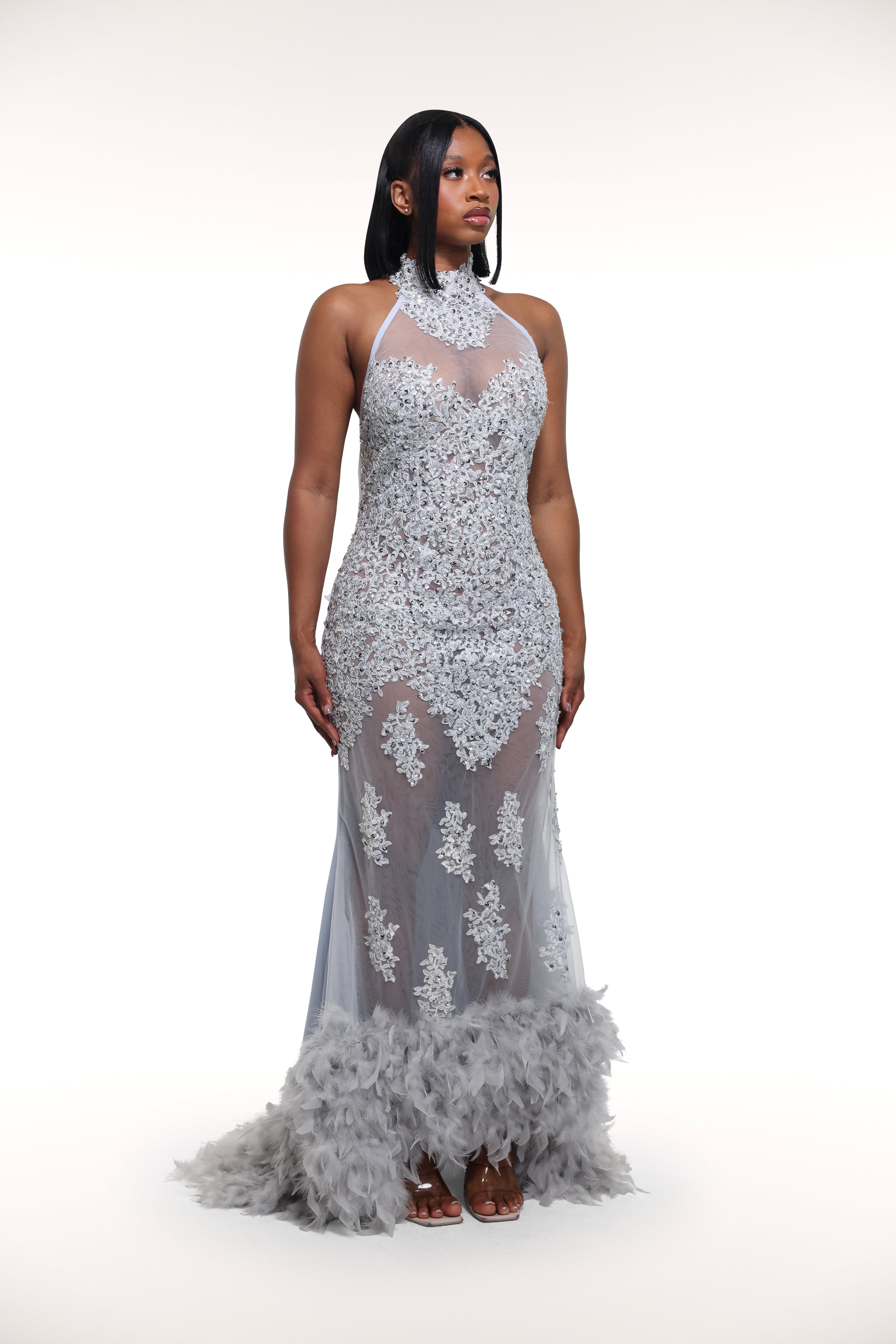Indulge in a fantasy with this exquisite evening gown. The unlined lace halter neckline adds a touch of sophistication, while the lycra backed zipper ensures a perfect fit. Adorned with feathers along the trim and a long train, this gown is a work of art.