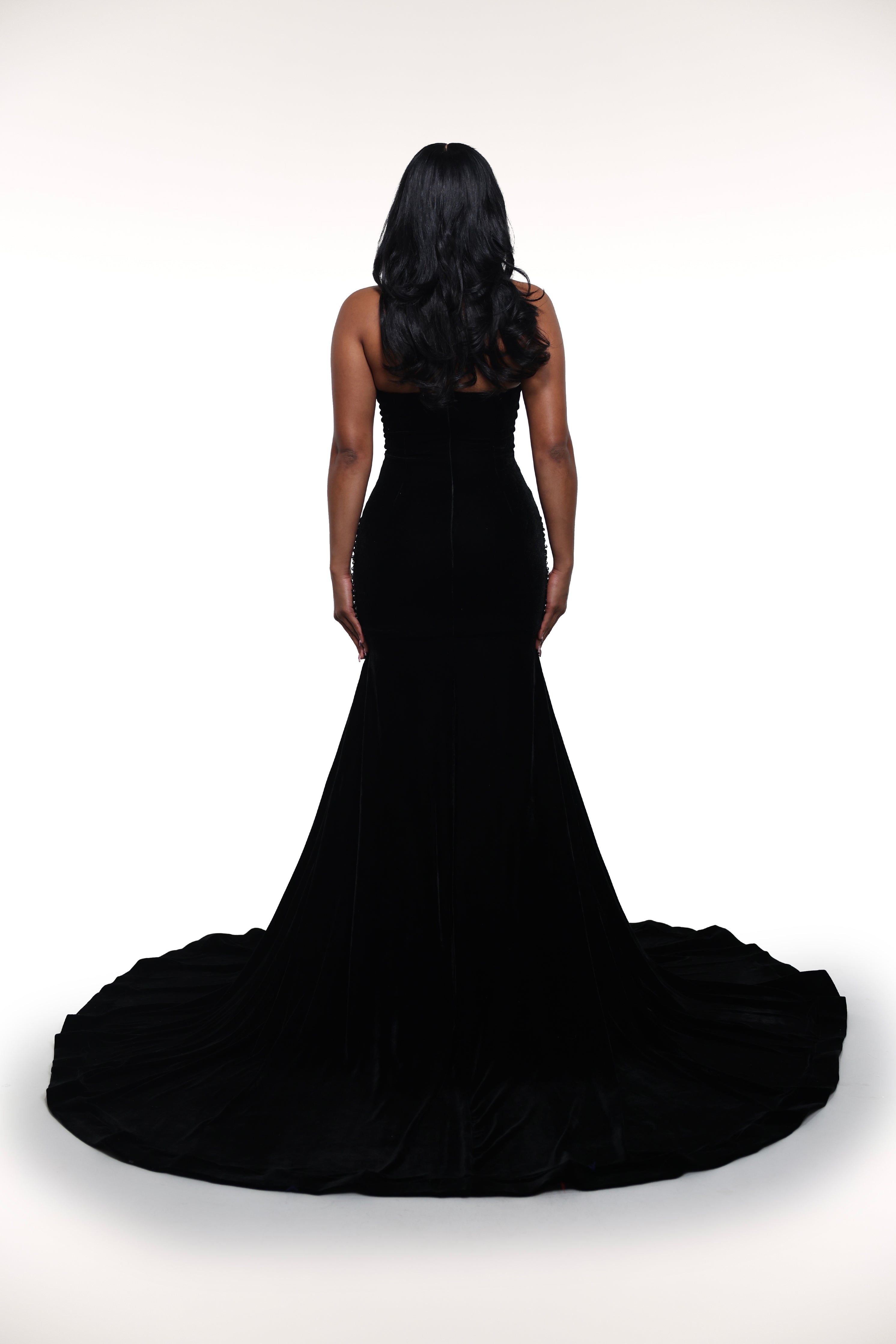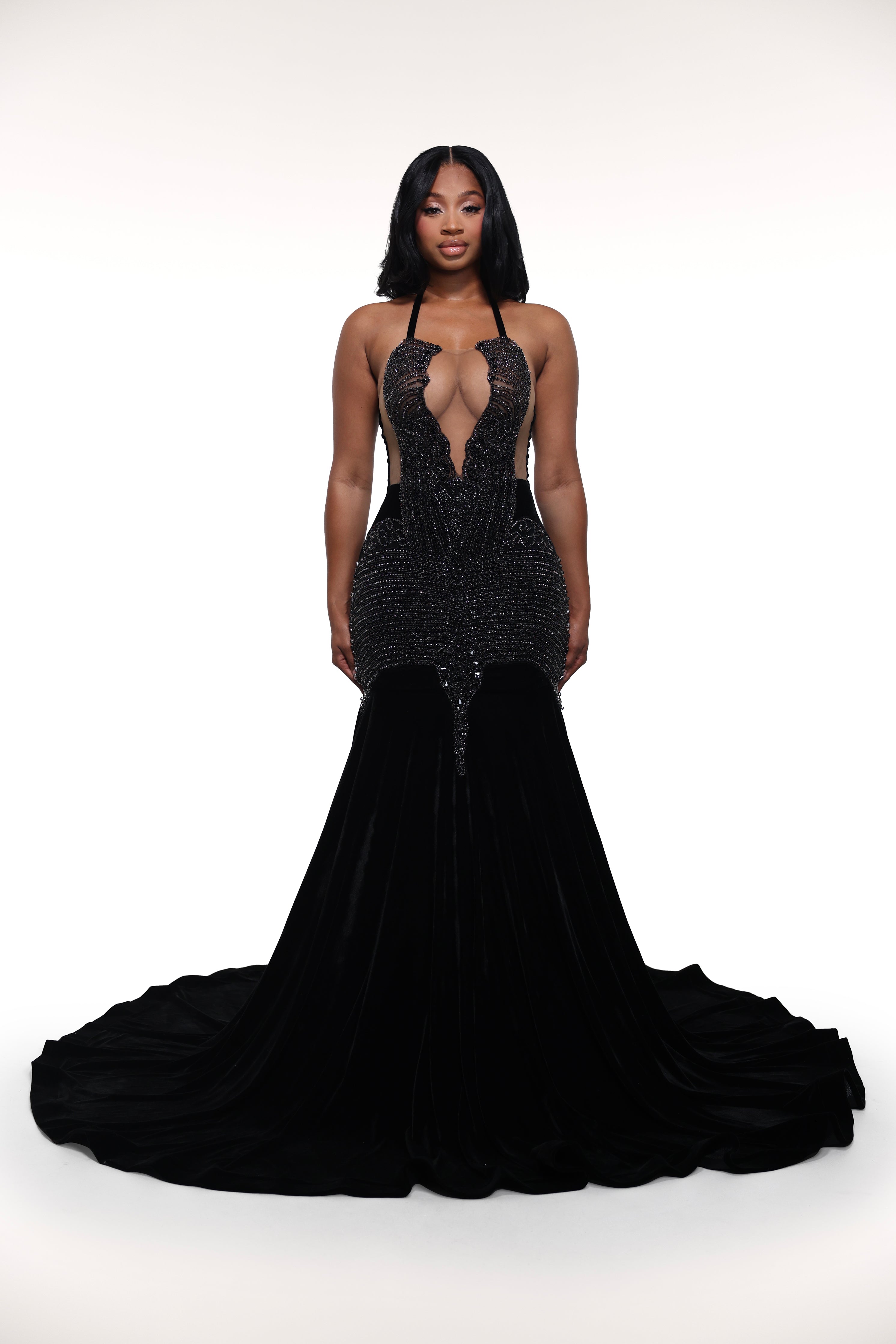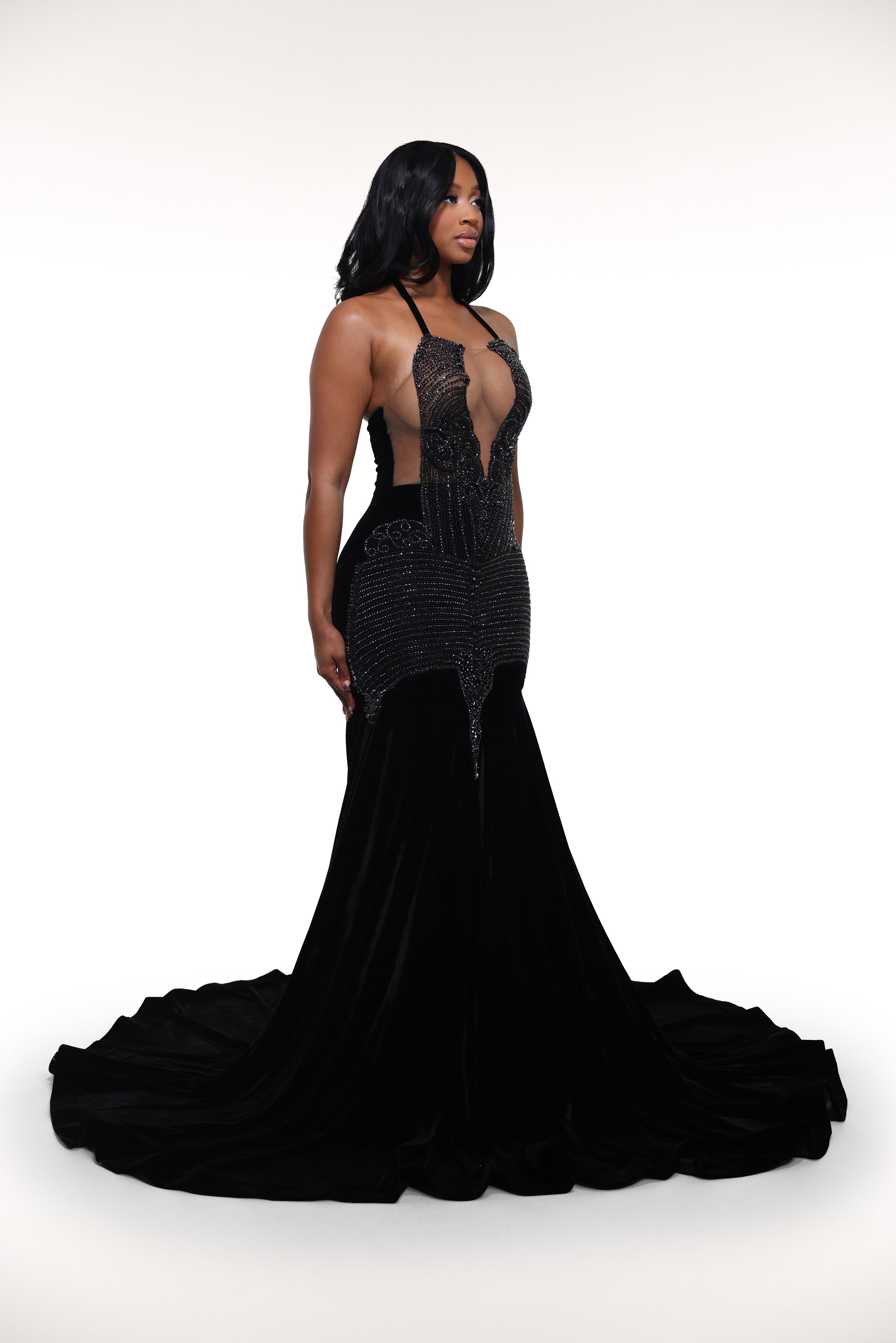 Indulge in the luxurious elegance of our 'Jet' gown. This black velvet masterpiece features a mesmerizing black rhinestone bodice and a halter top design that exudes sophistication. Make a statement and elevate your style with this exclusive, one-of-a-kind piece.
