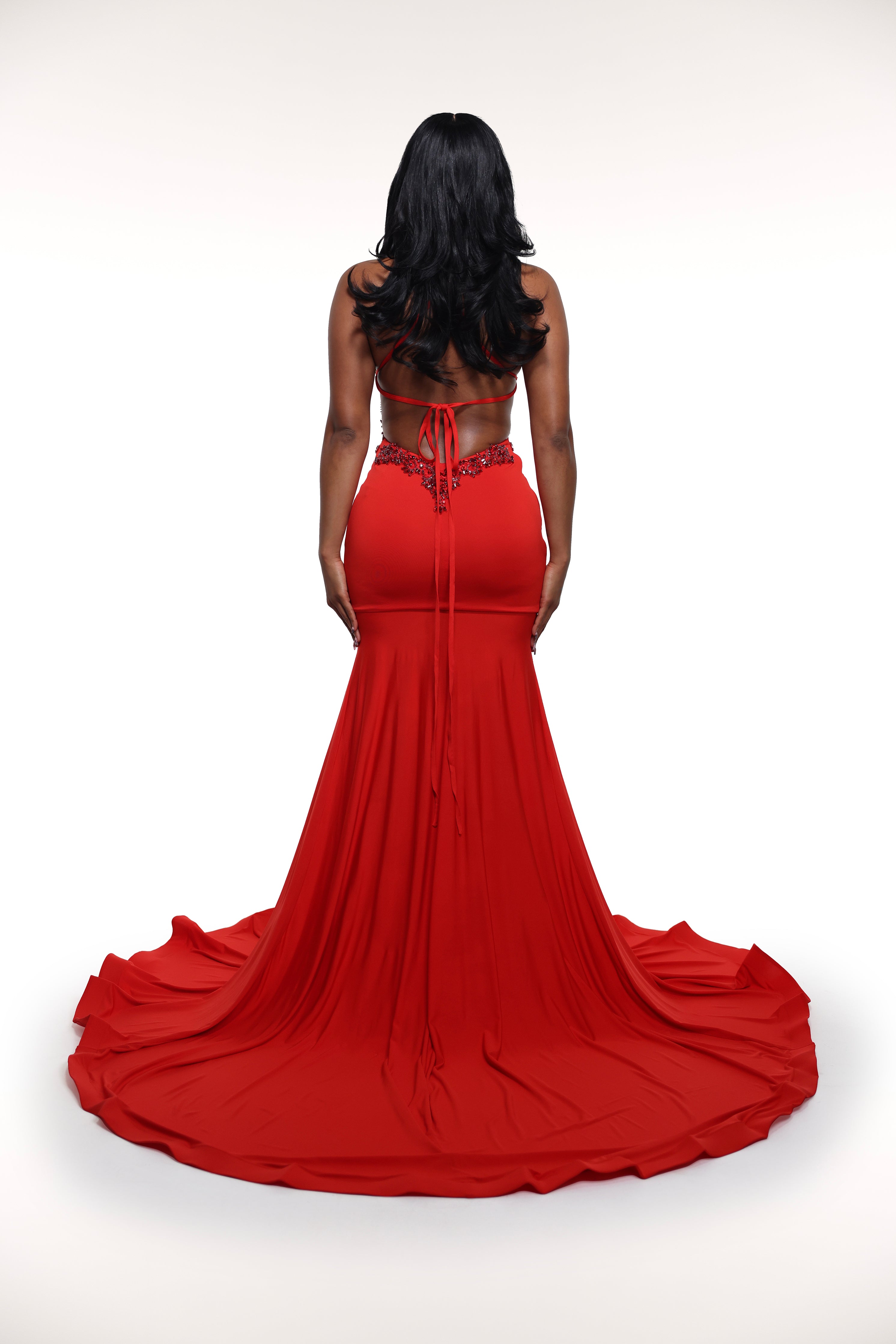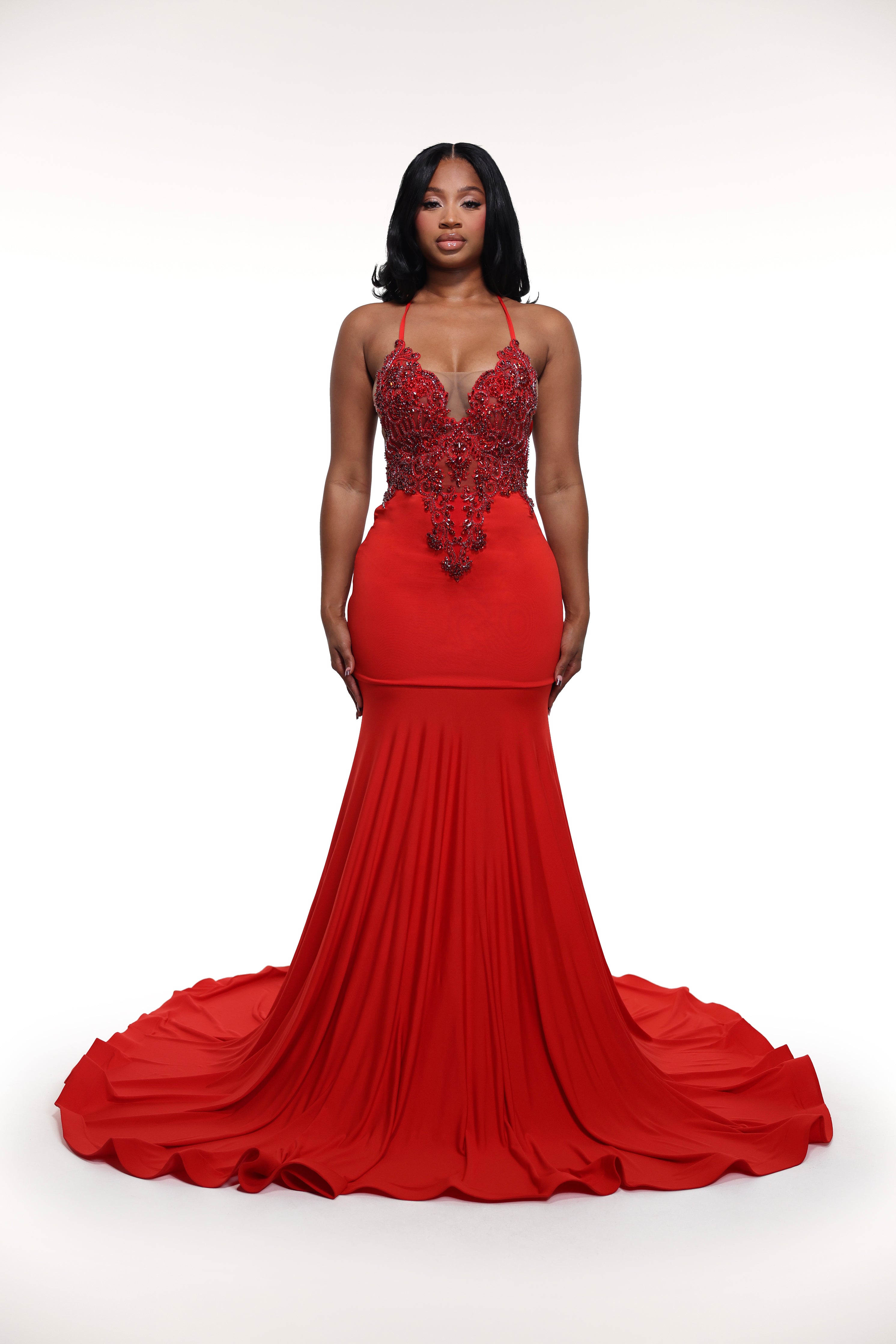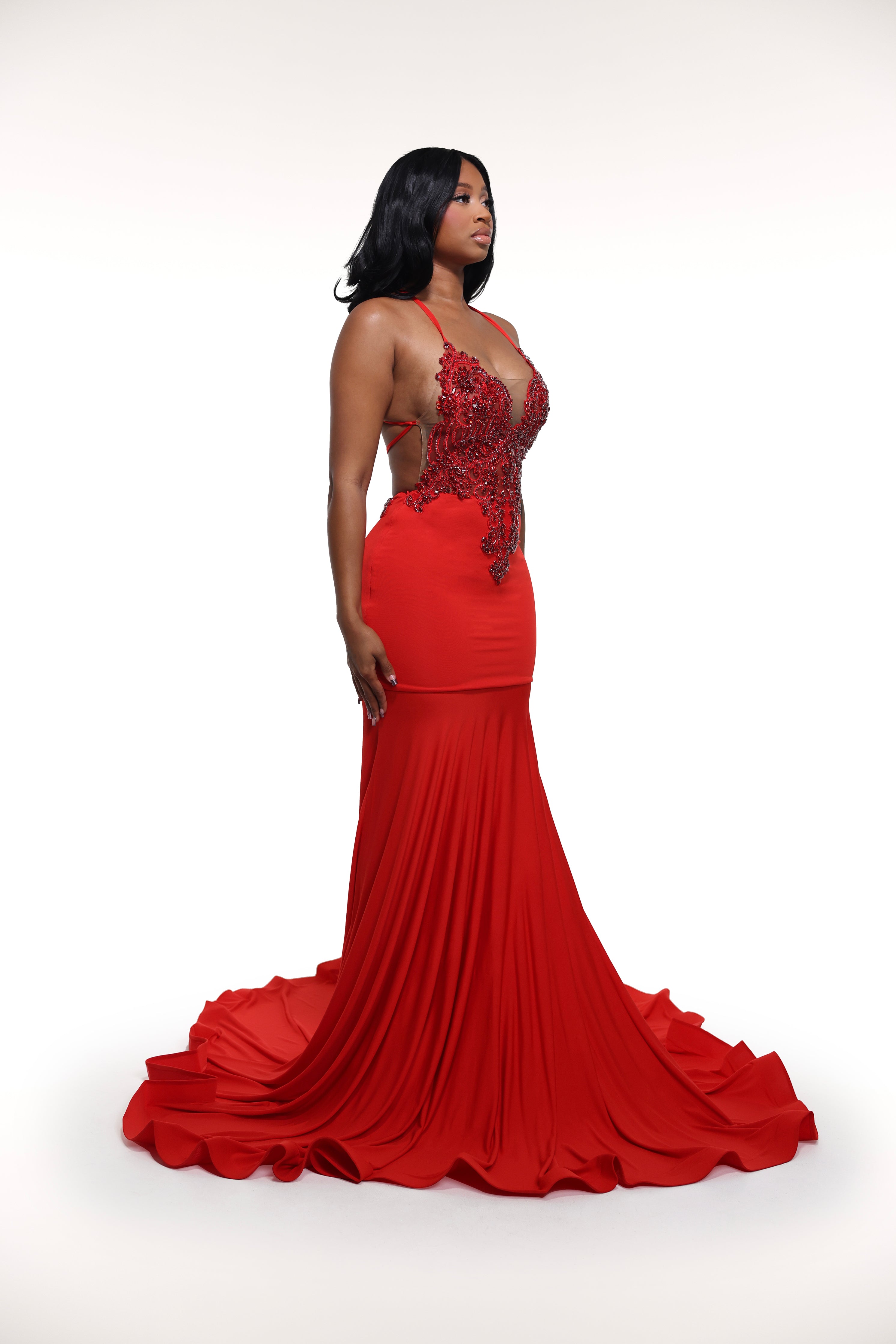Effortlessly elevate your evening look with 'Muah', a stunning prom gown featuring a stretchy spandex fabric that molds perfectly to your body. The tie cross body back adds a touch of sophistication, while matching appliques on the bust create a cohesive and elegant ensemble.