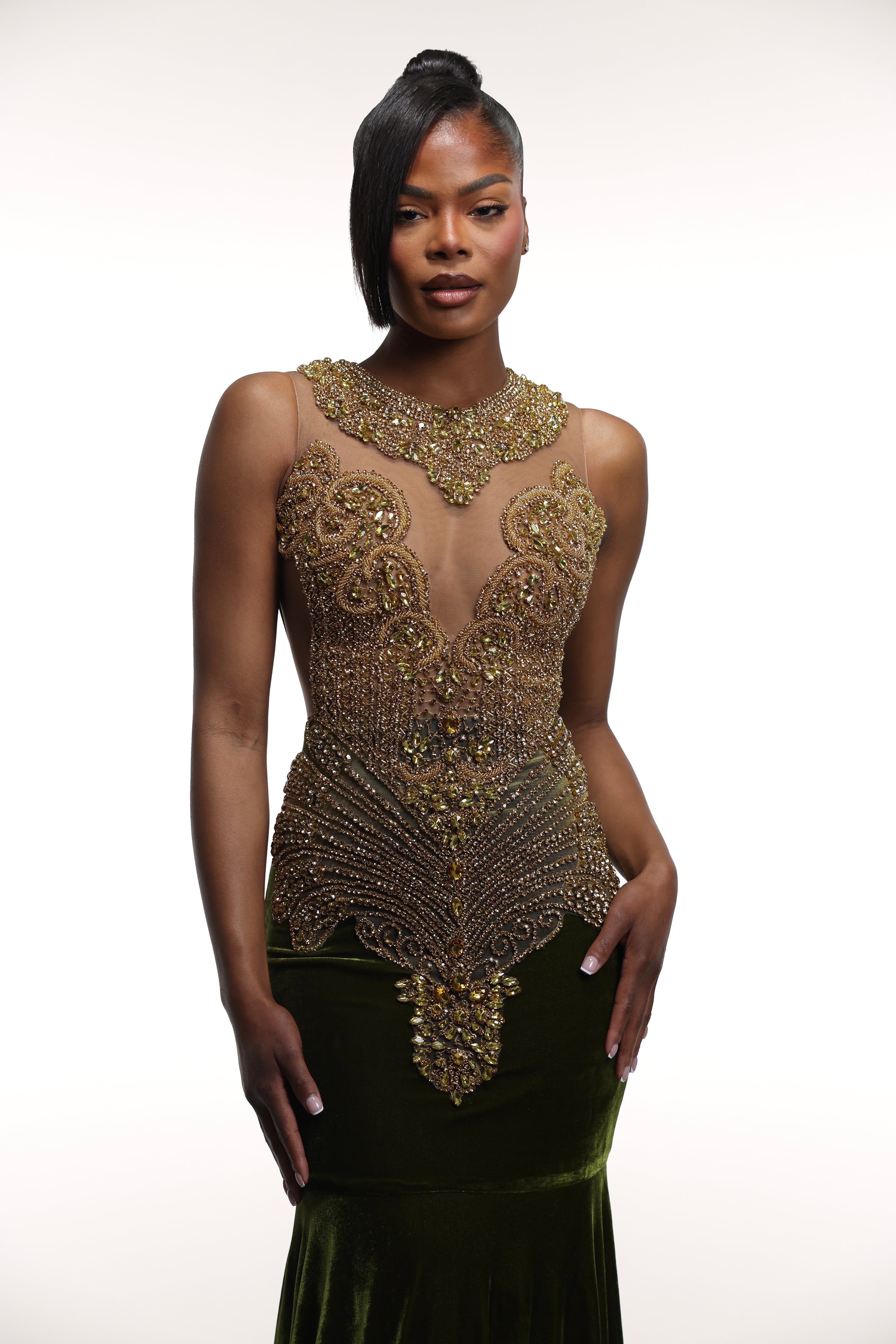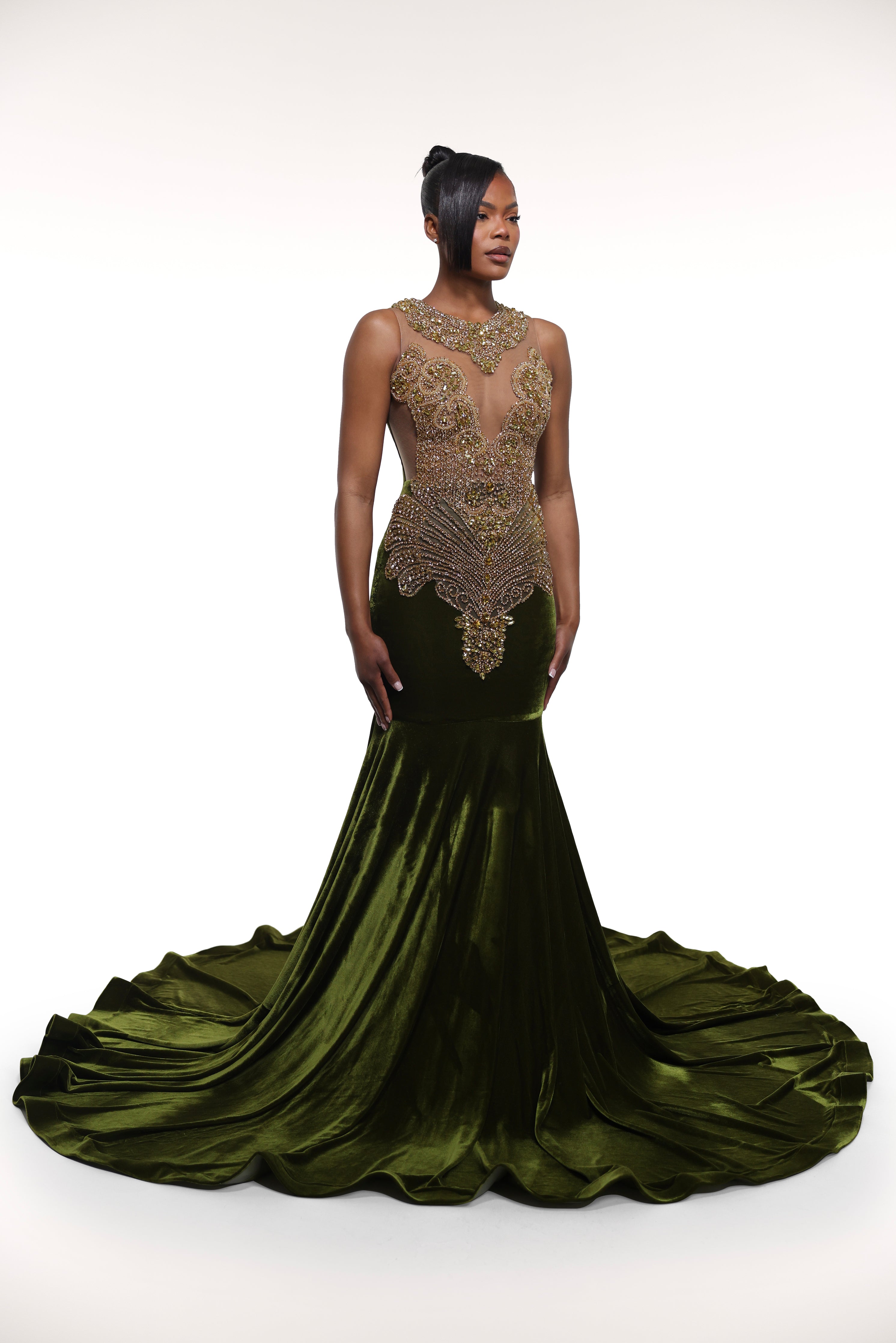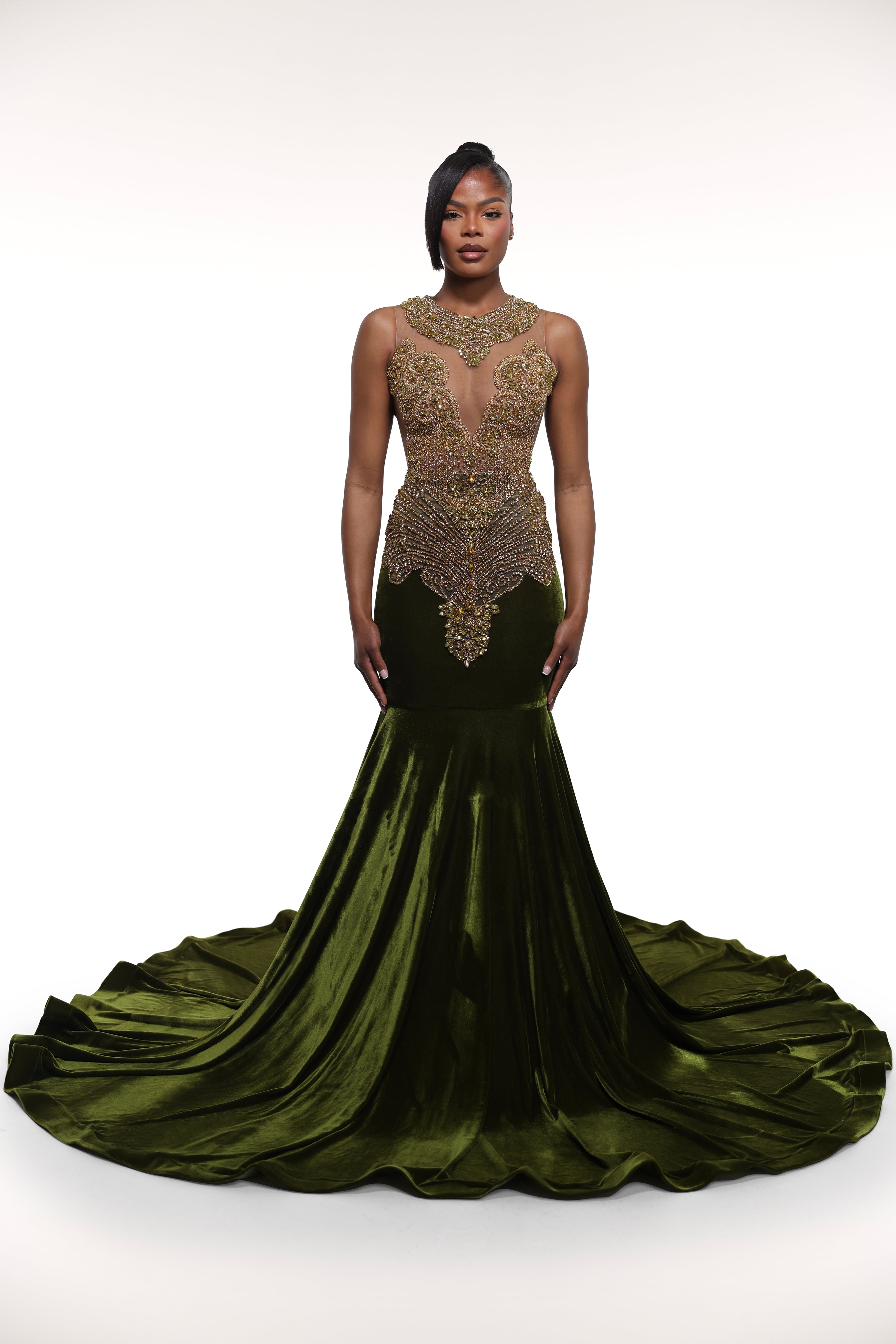 'Olivia' gown features a luxurious velvet mermaid design with scrunch waistline detailing for a flattering fit. Complete with a matching rhinestone appliqué for added elegance.