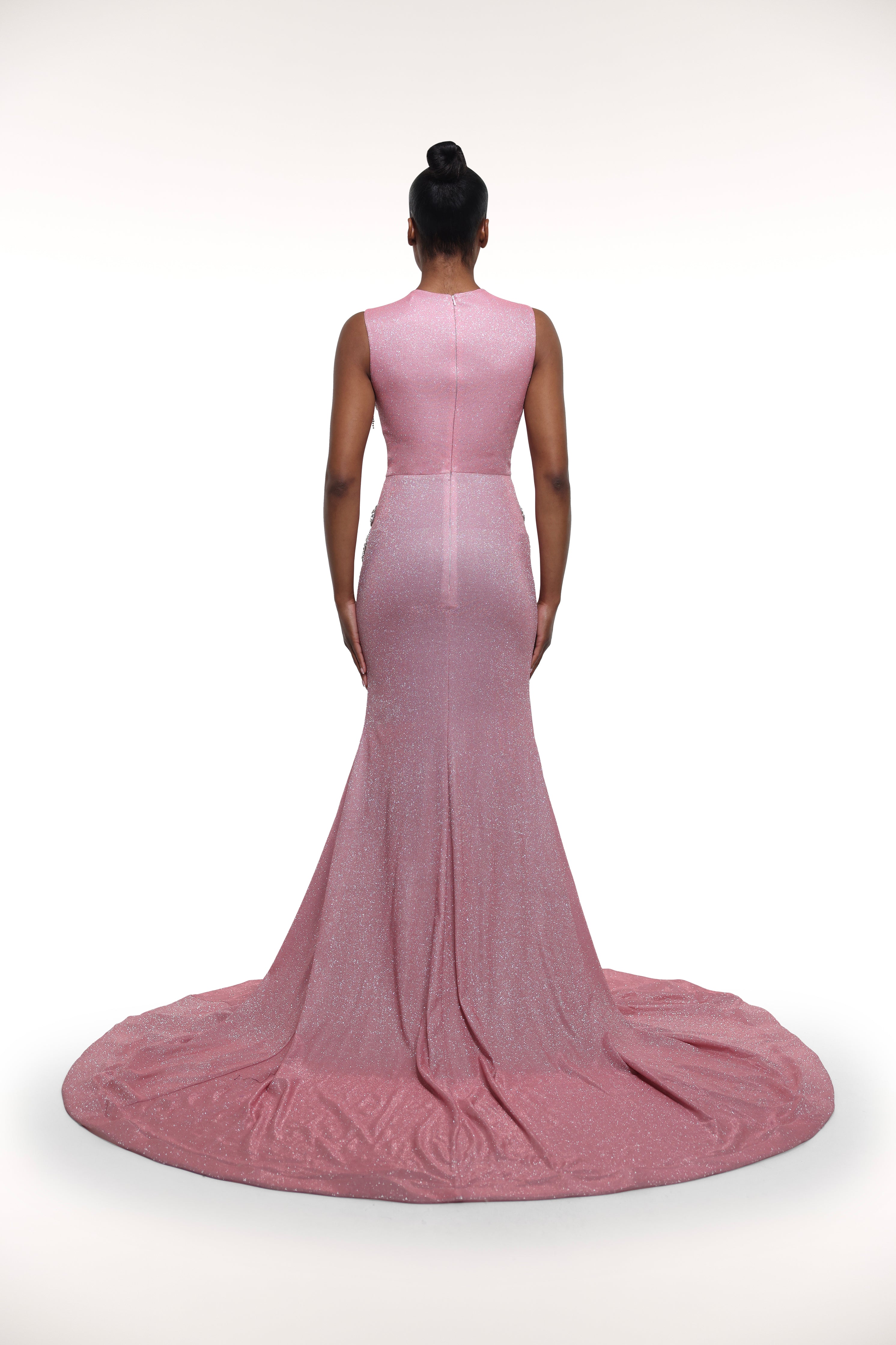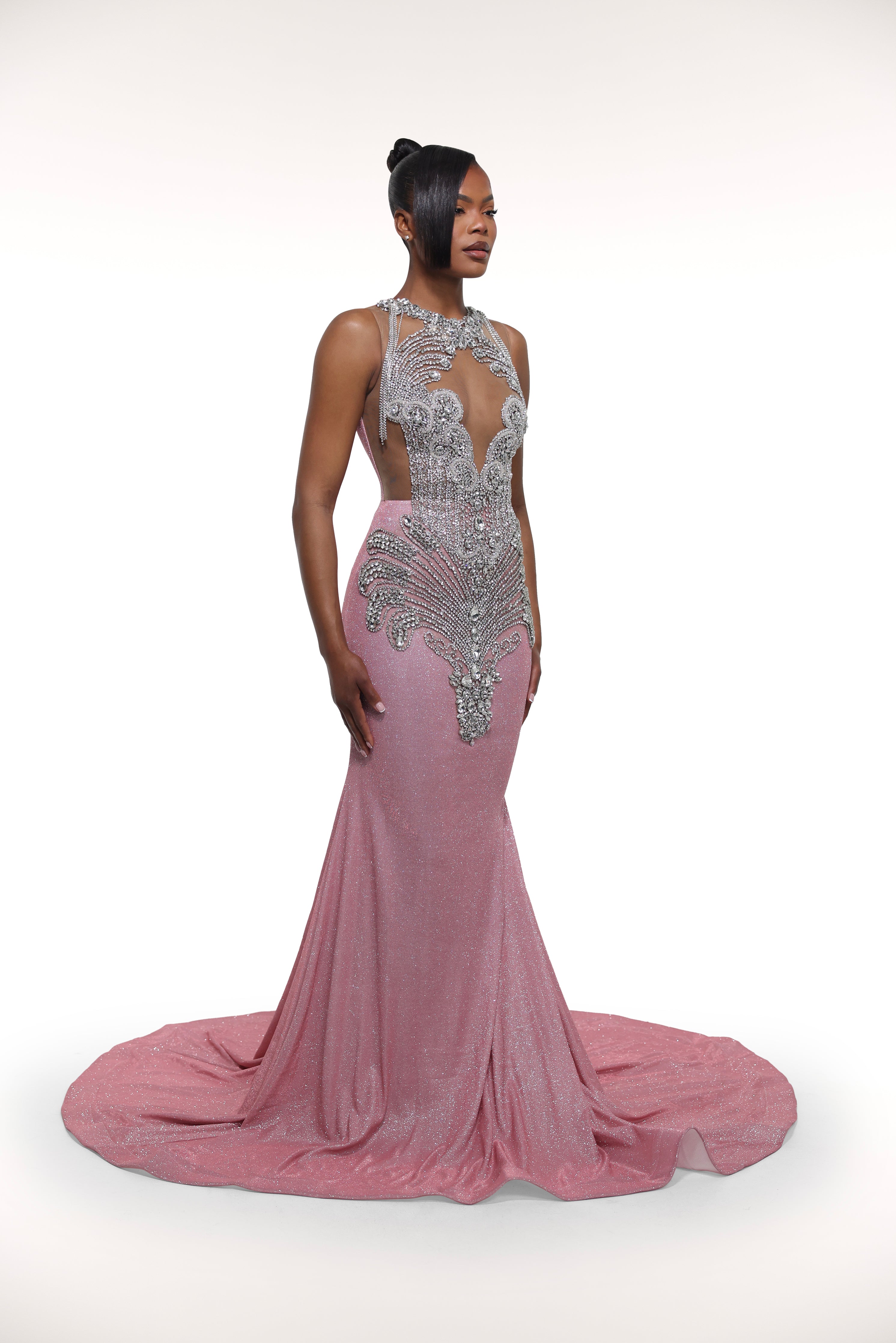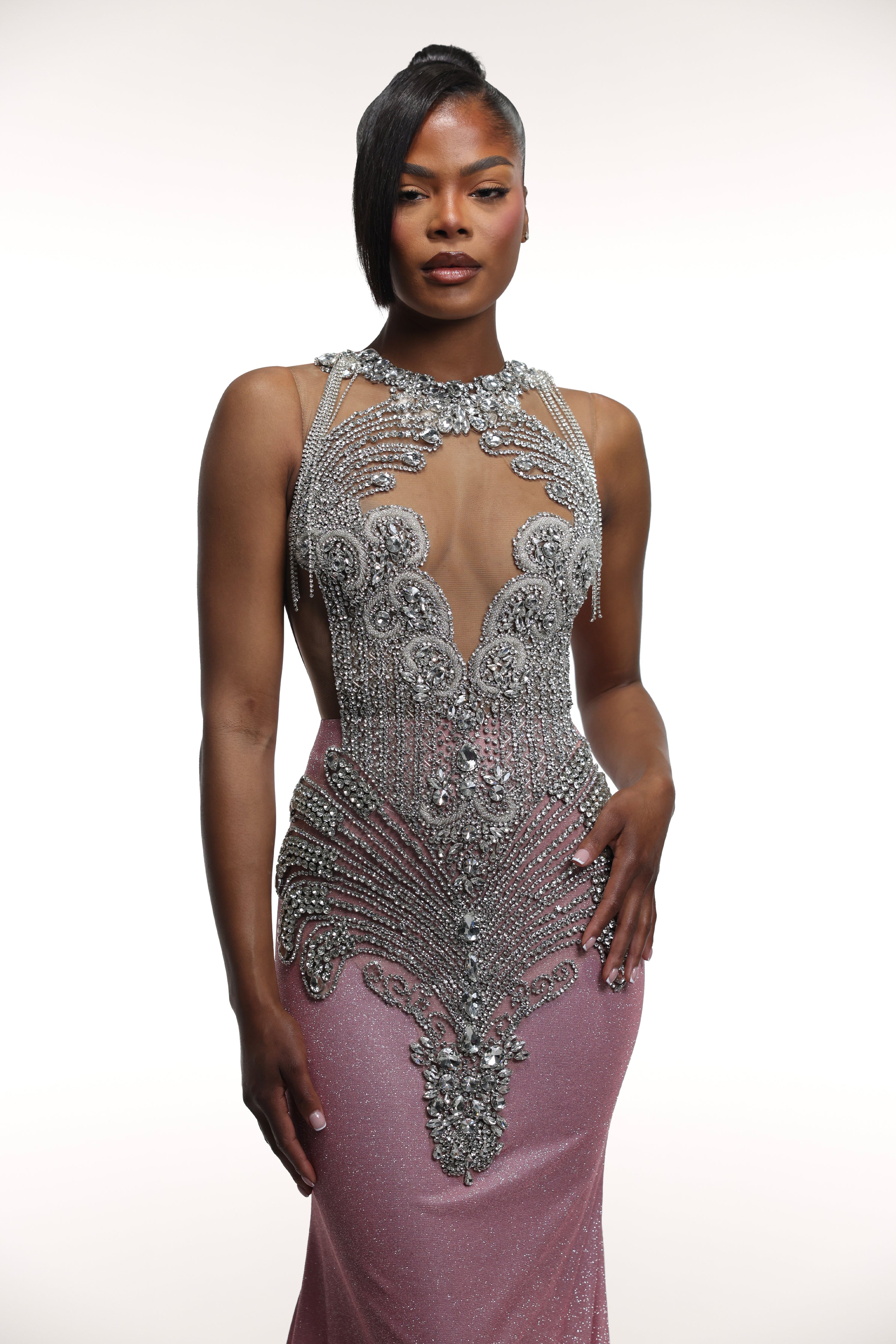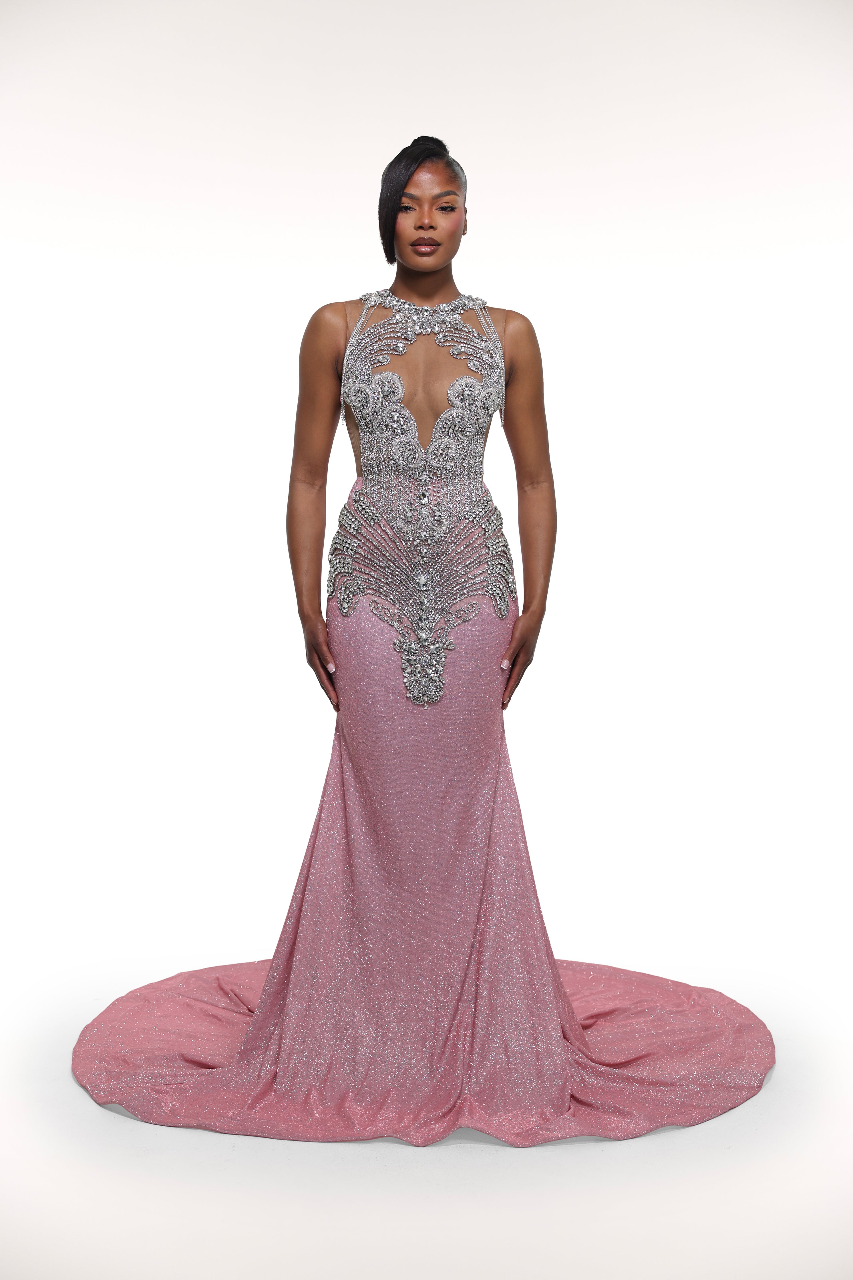 Shimmer with confidence in 'Roseate'! This stunning gown features a high rhinestone neckline and bodice, adding a touch of sparkle to any occasion. The shimmery pink skirt and zipper back complete the look.