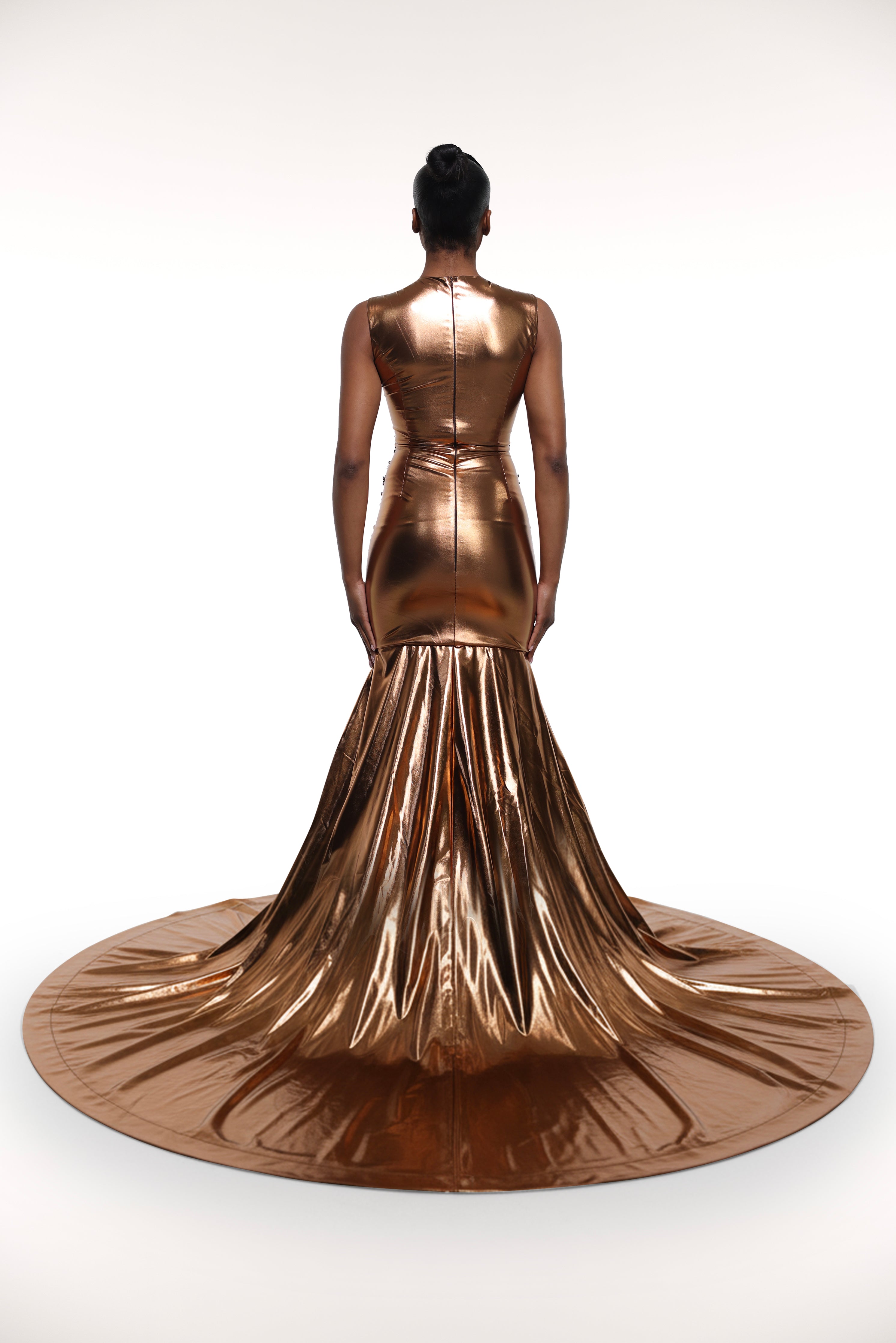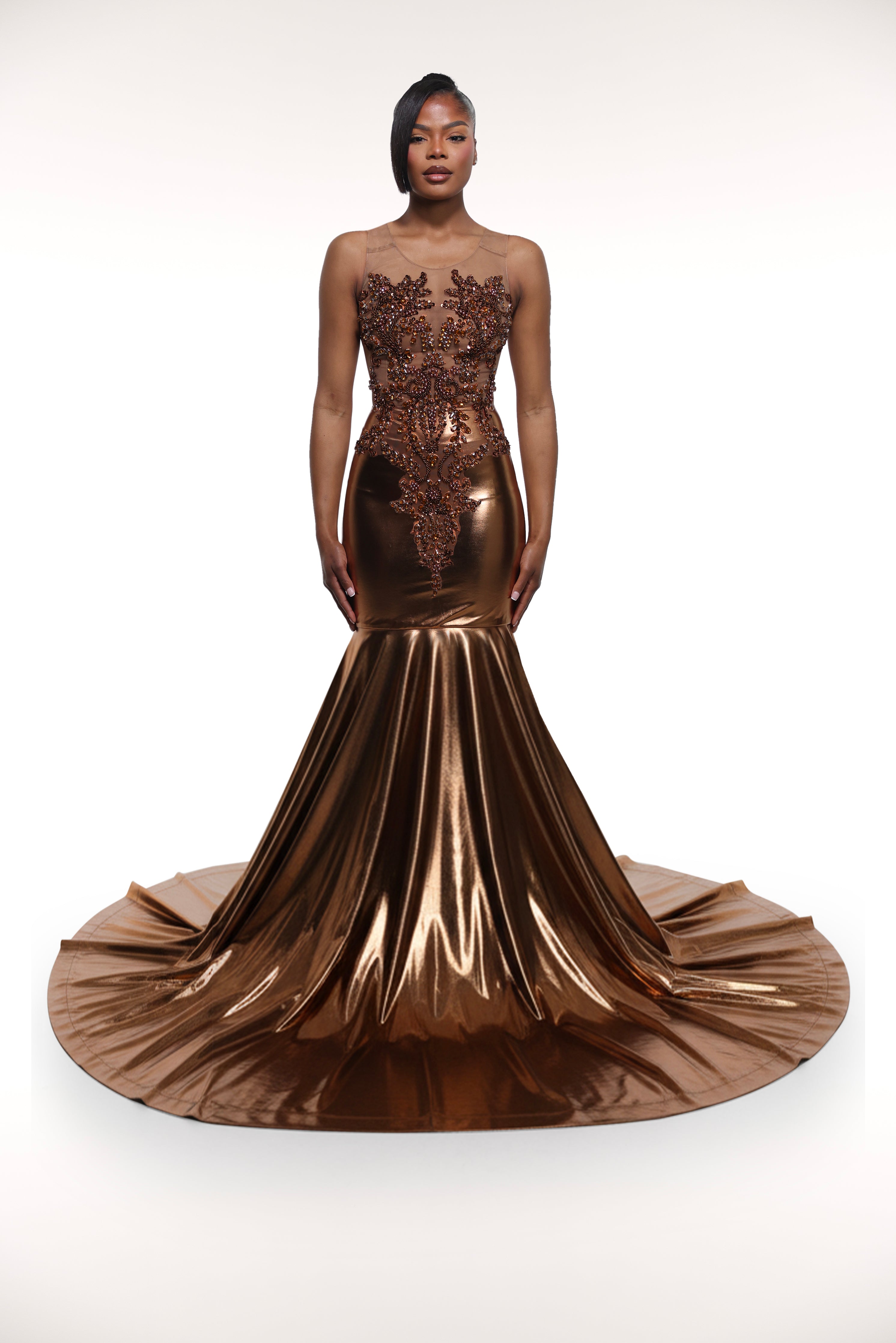 A beautiful metallic bronze gown 'Savannah' features a mermaid silhouette that has slight stretch, and a sleeveless beaded mesh top.