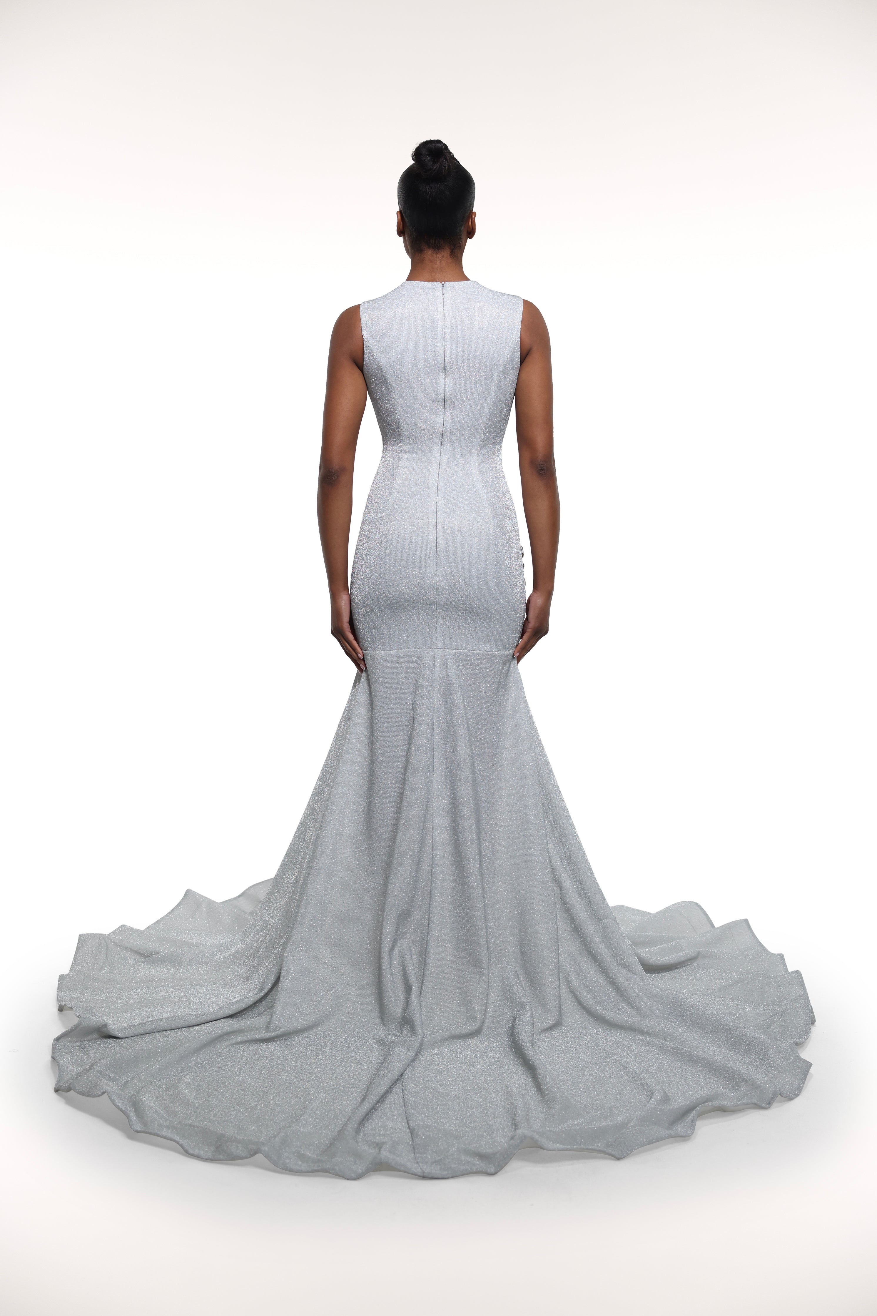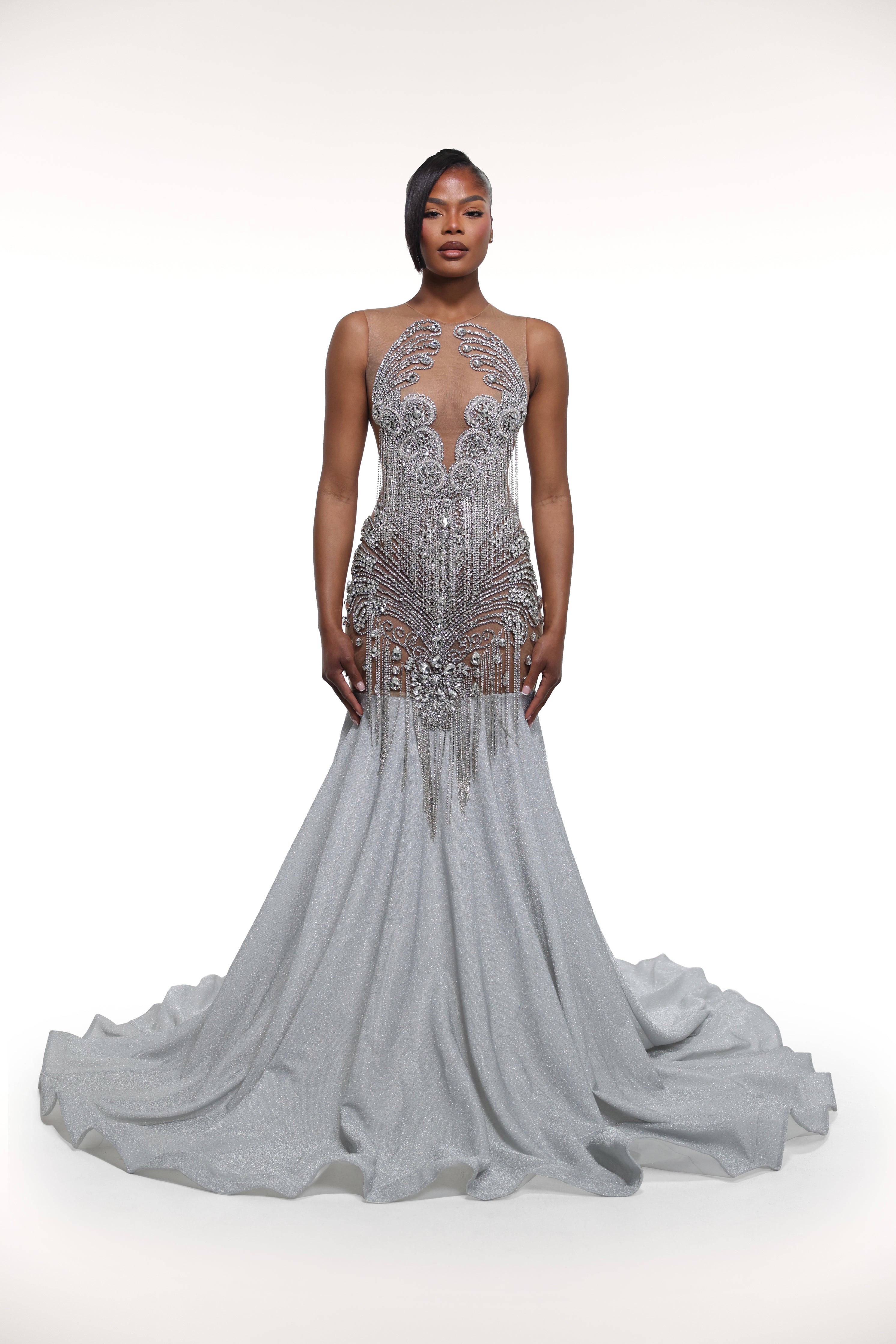 Made with luxurious sparkly fabric, 'Stellar' is the perfect gown for any formal event. The high neckline and rhinestone bodice add a touch of elegance, while the zipper back ensures a perfect fit.