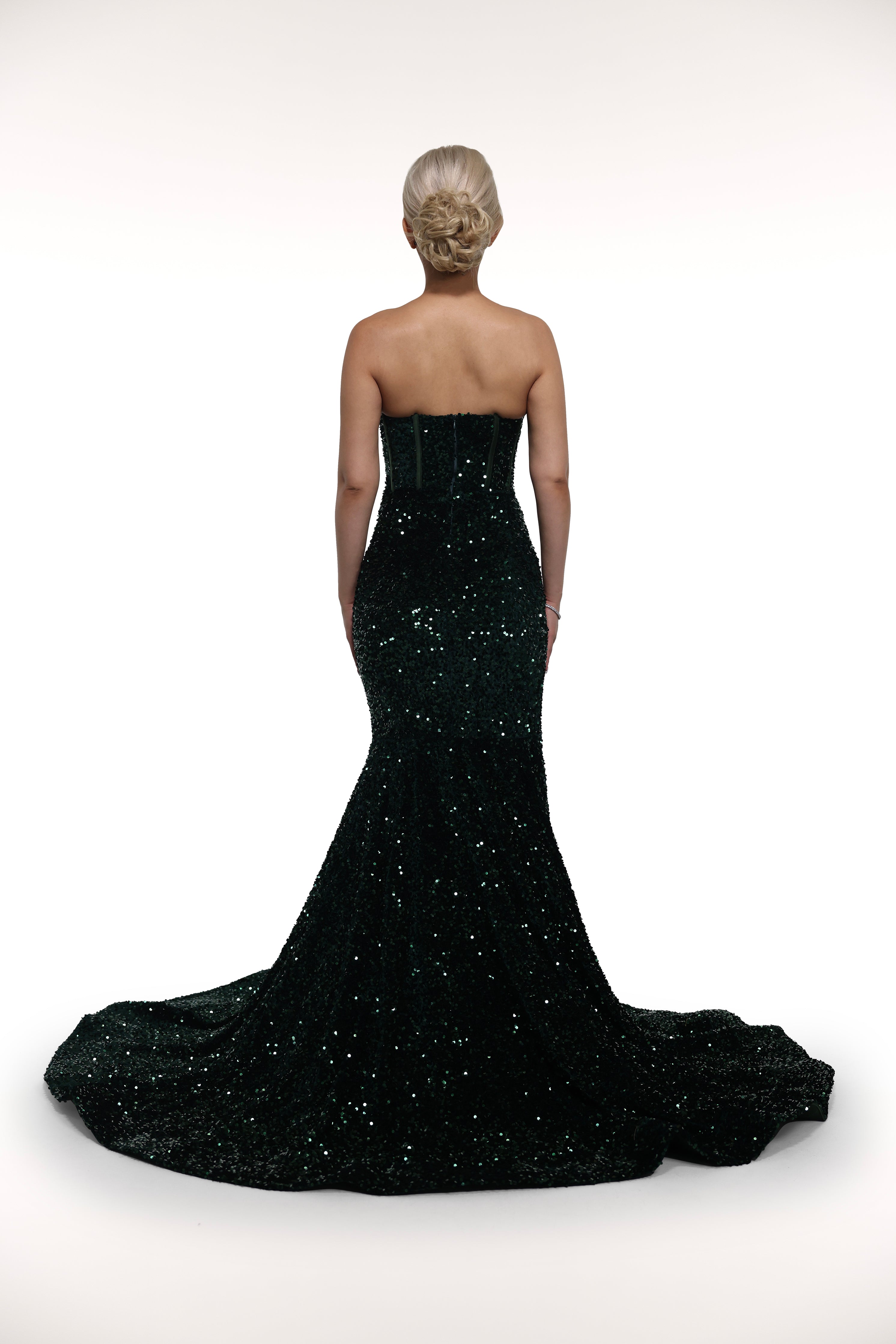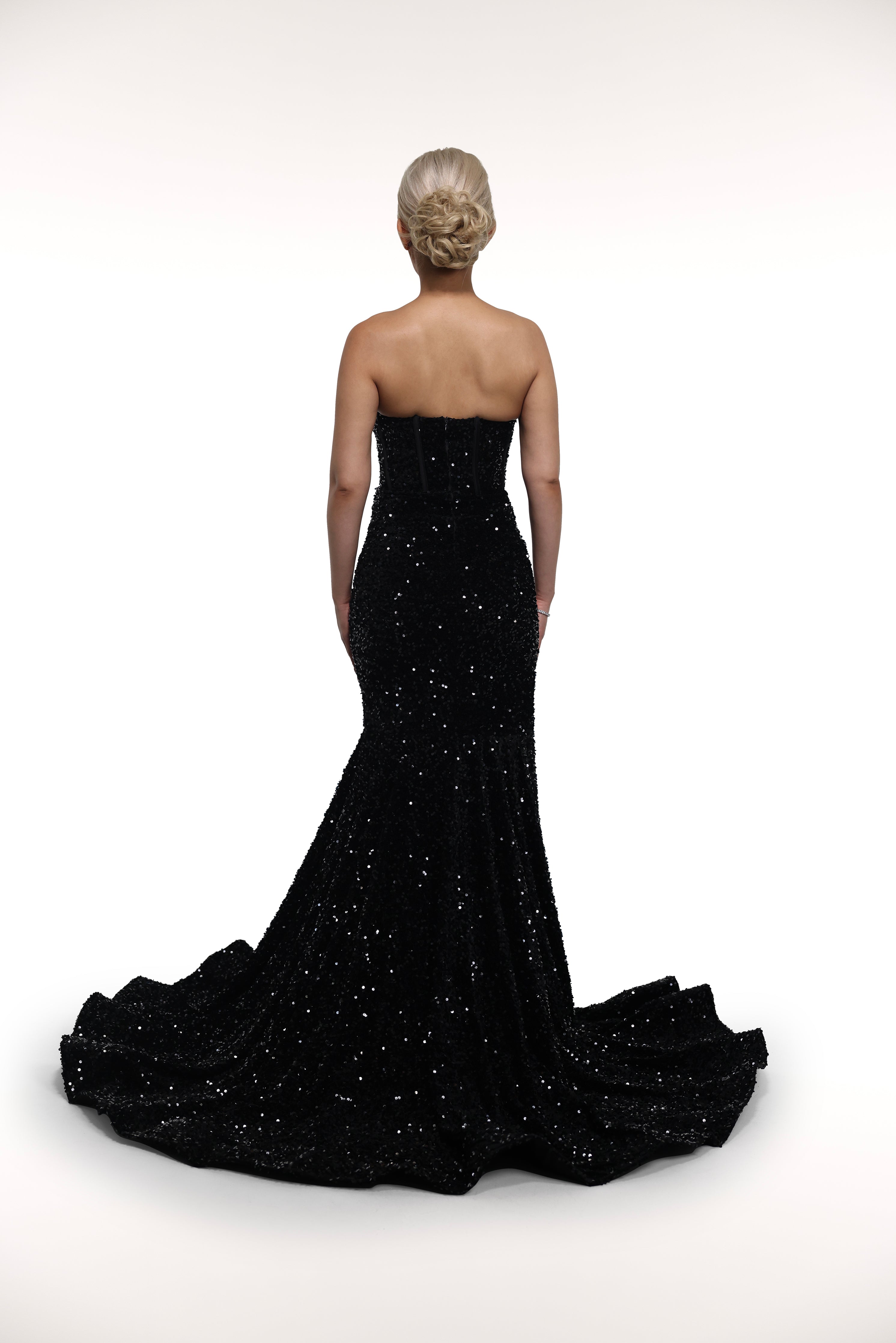 ‘Zeina’ gown a corset strapless dress made of sequin fabric with a slight stretch. It also features a slit and a mermaid silhouette that flares out into a train.