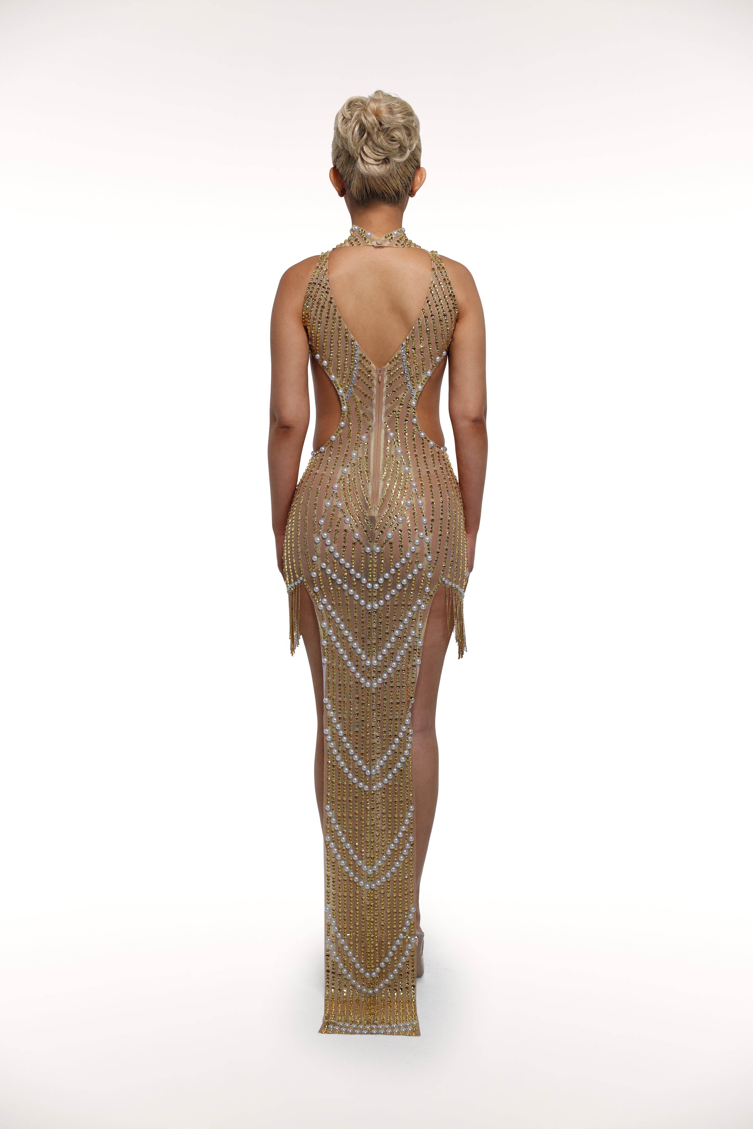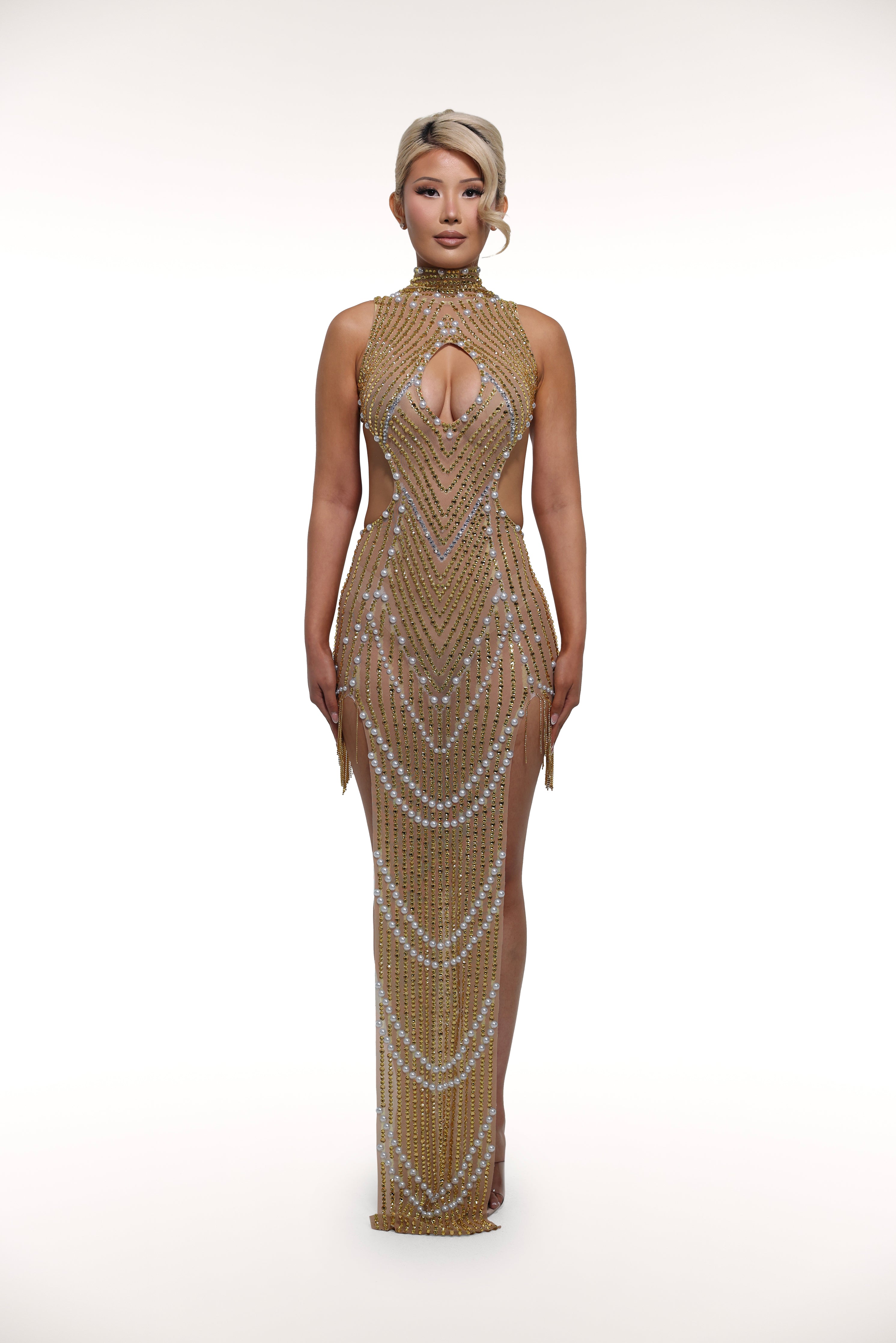 Rhinestones and pearls galore 'Leona' is made from a stretchy mesh fabric. This dress features a high neckline, stone fringe at the thigh and cutouts where it counts: at bust, hips and legs.