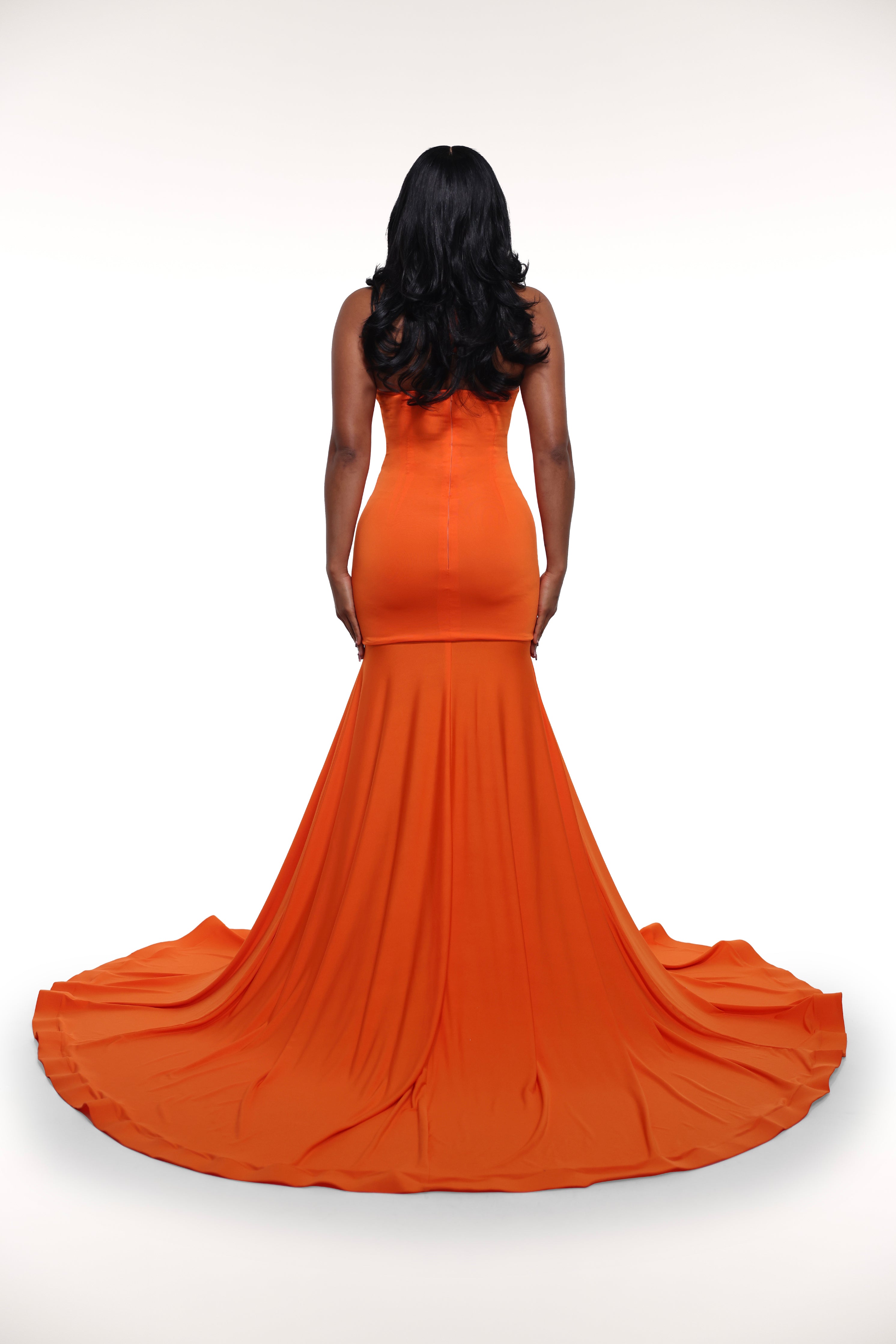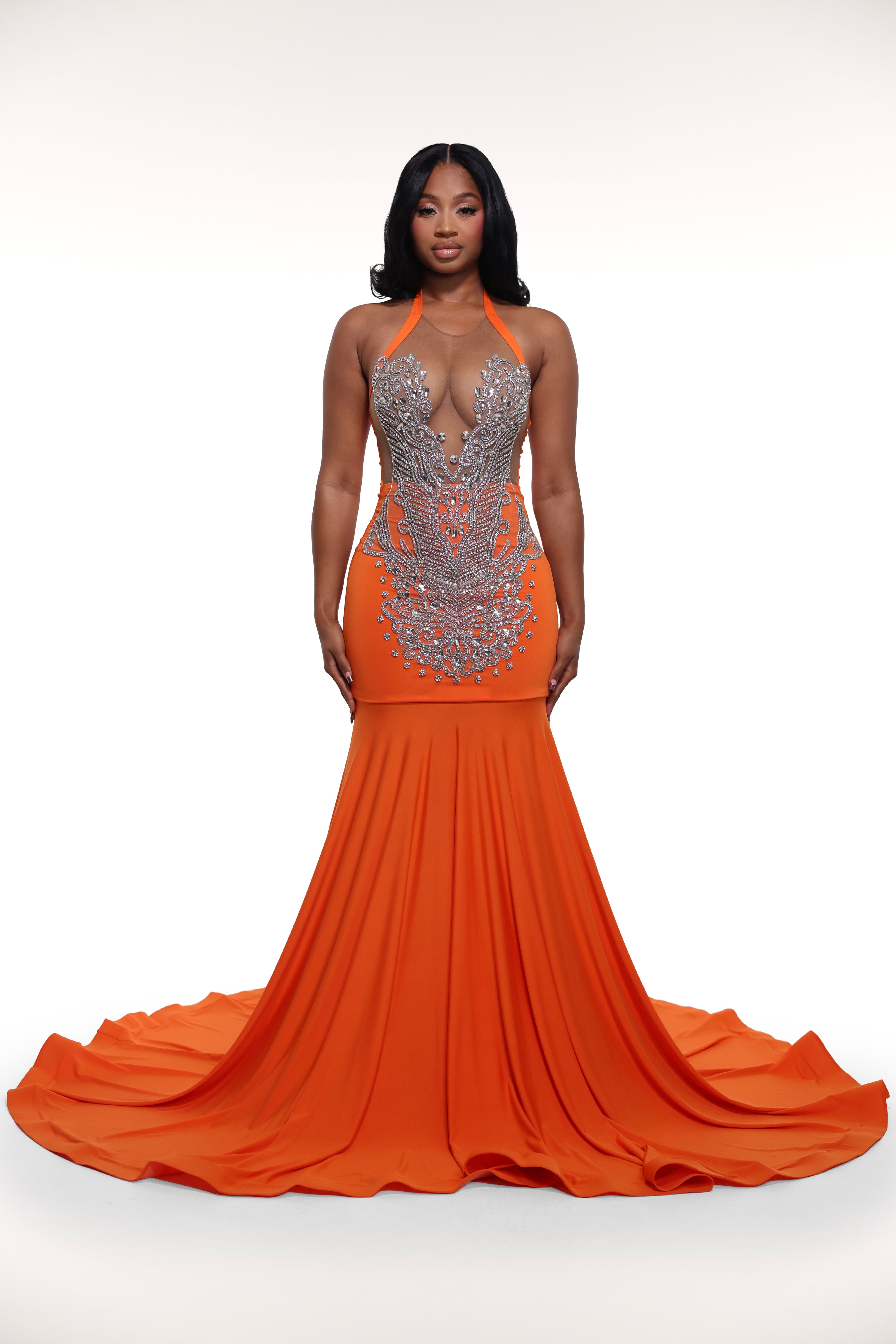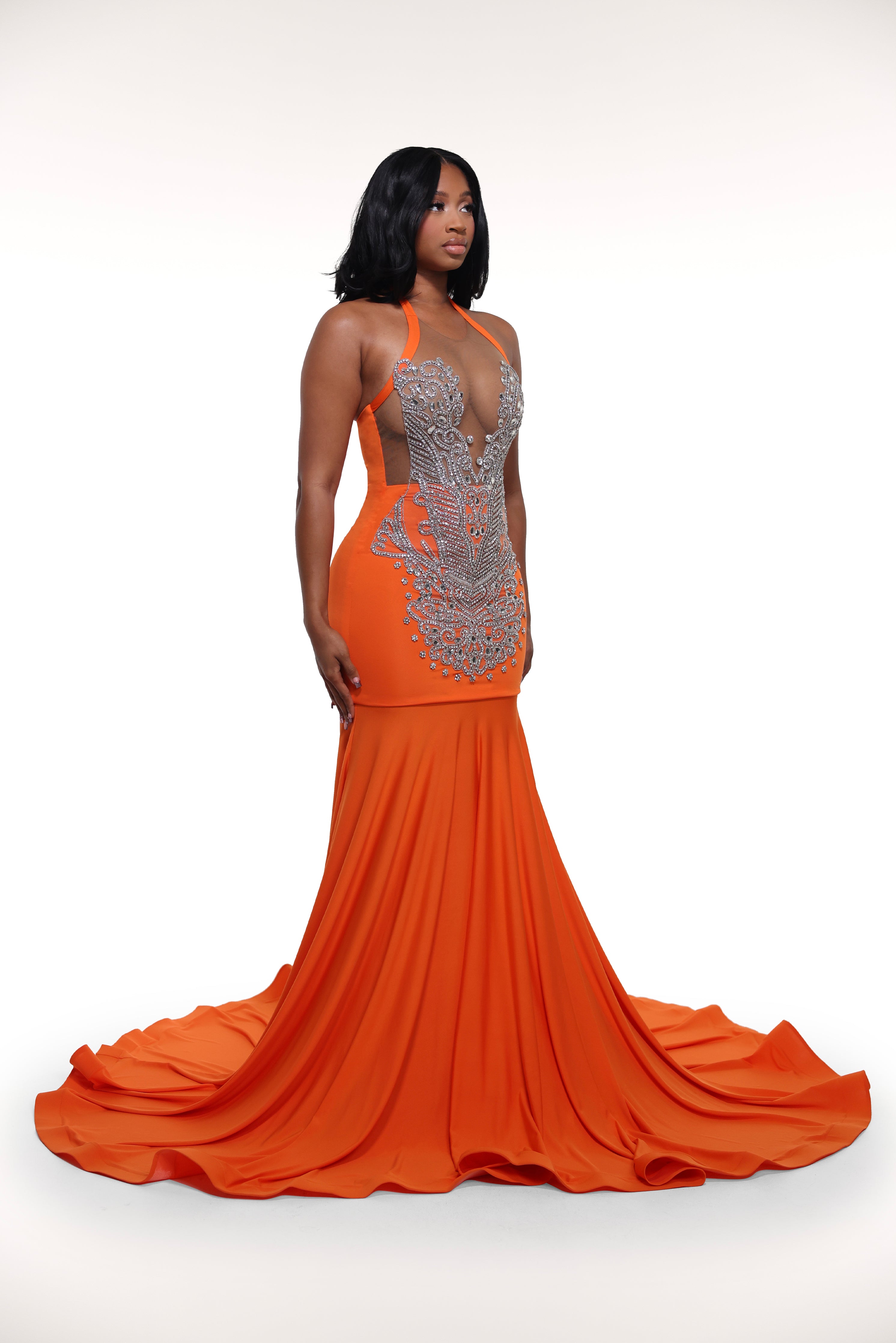 'Yamileth’ features a stretchy fabric with a mermaid silhouette and a sleeveless v-neck mesh top with straps that tie to the back embellished with rhinestones.