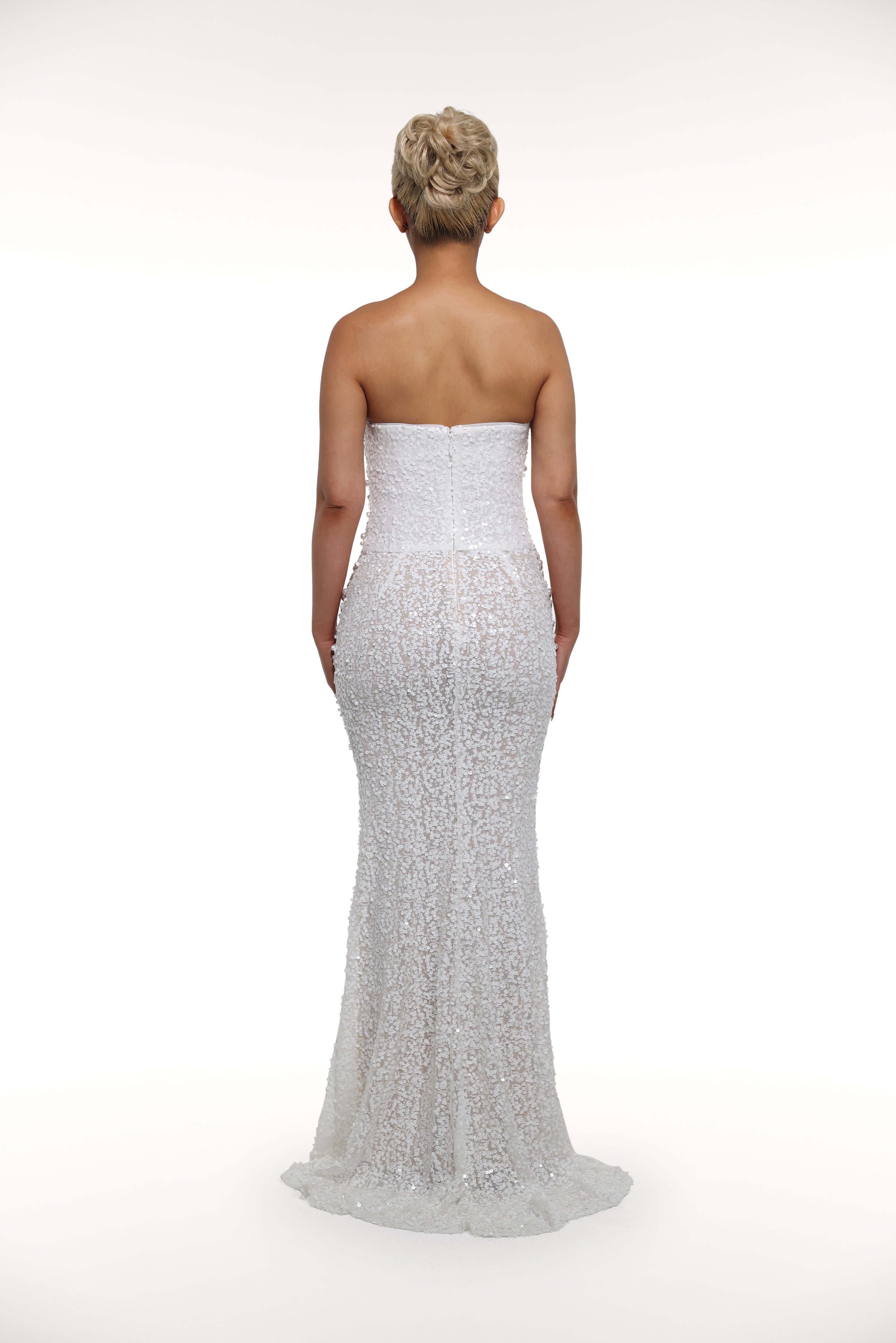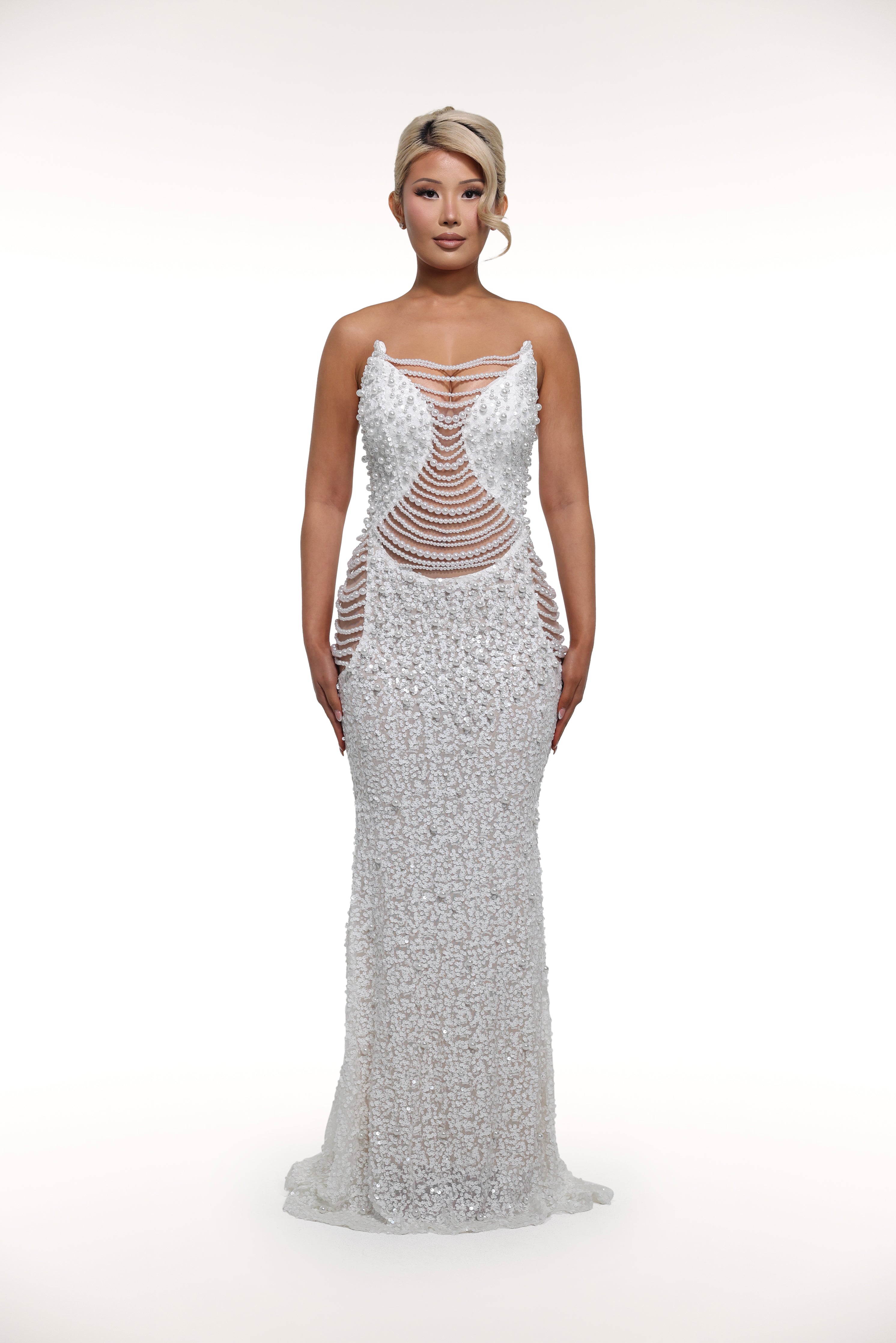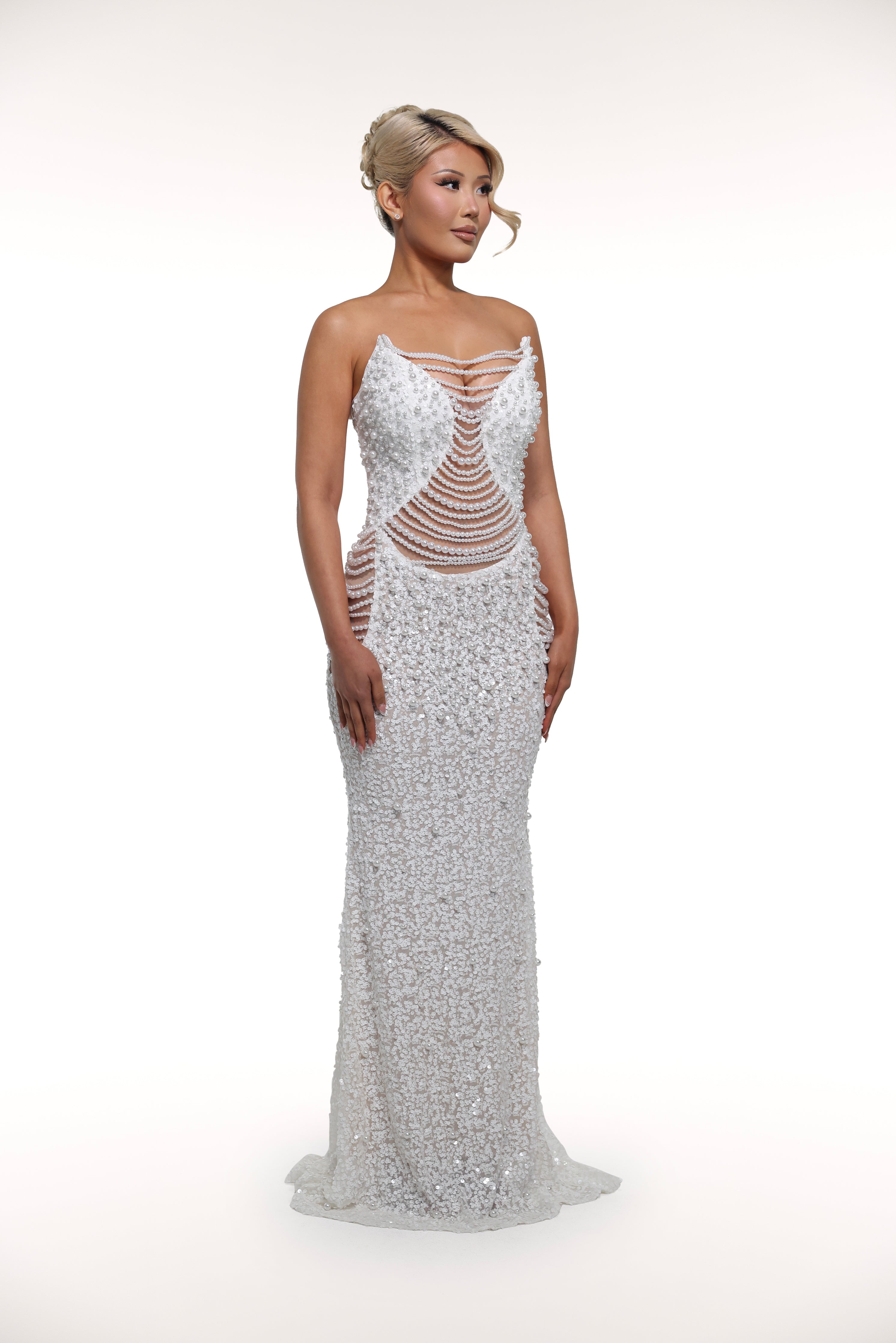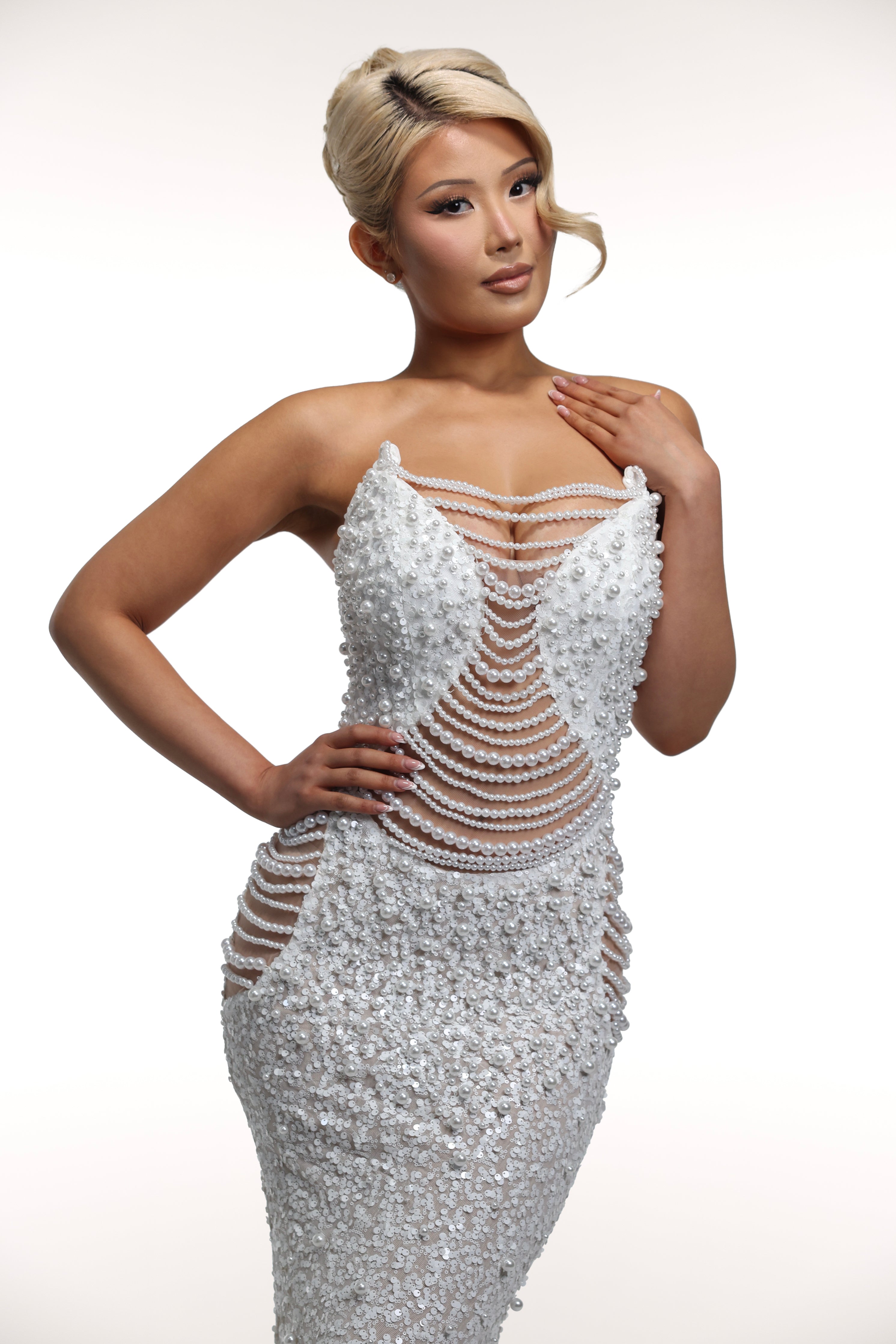 Our ‘Faith’ dress is a showstopper. It’s giving a classic modern look embellished with pearls. Crafted from stretchy mesh fabric, it has a sweetheart neckline with pointed details for a distinctive style. Pearls drape across the bodice and at the hips, complemented by stylish cutouts.