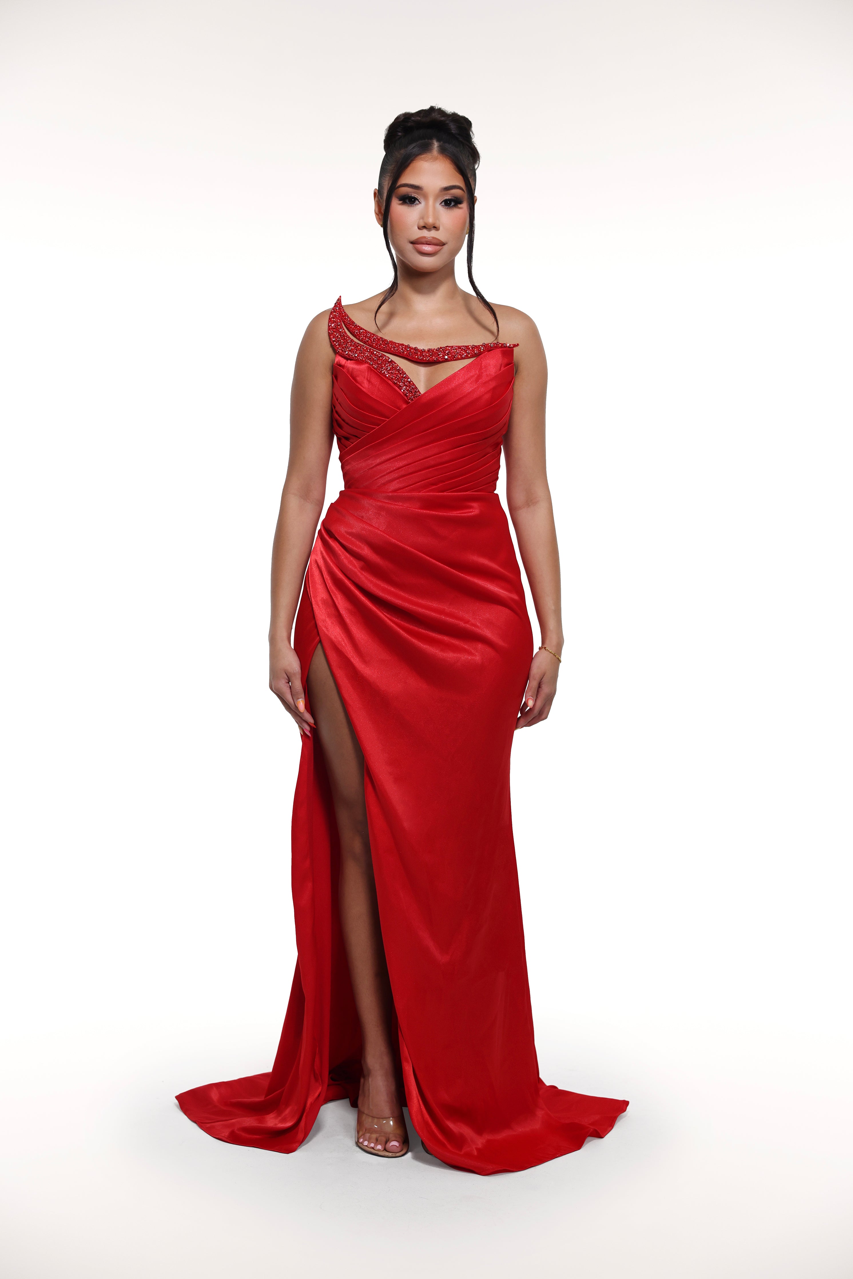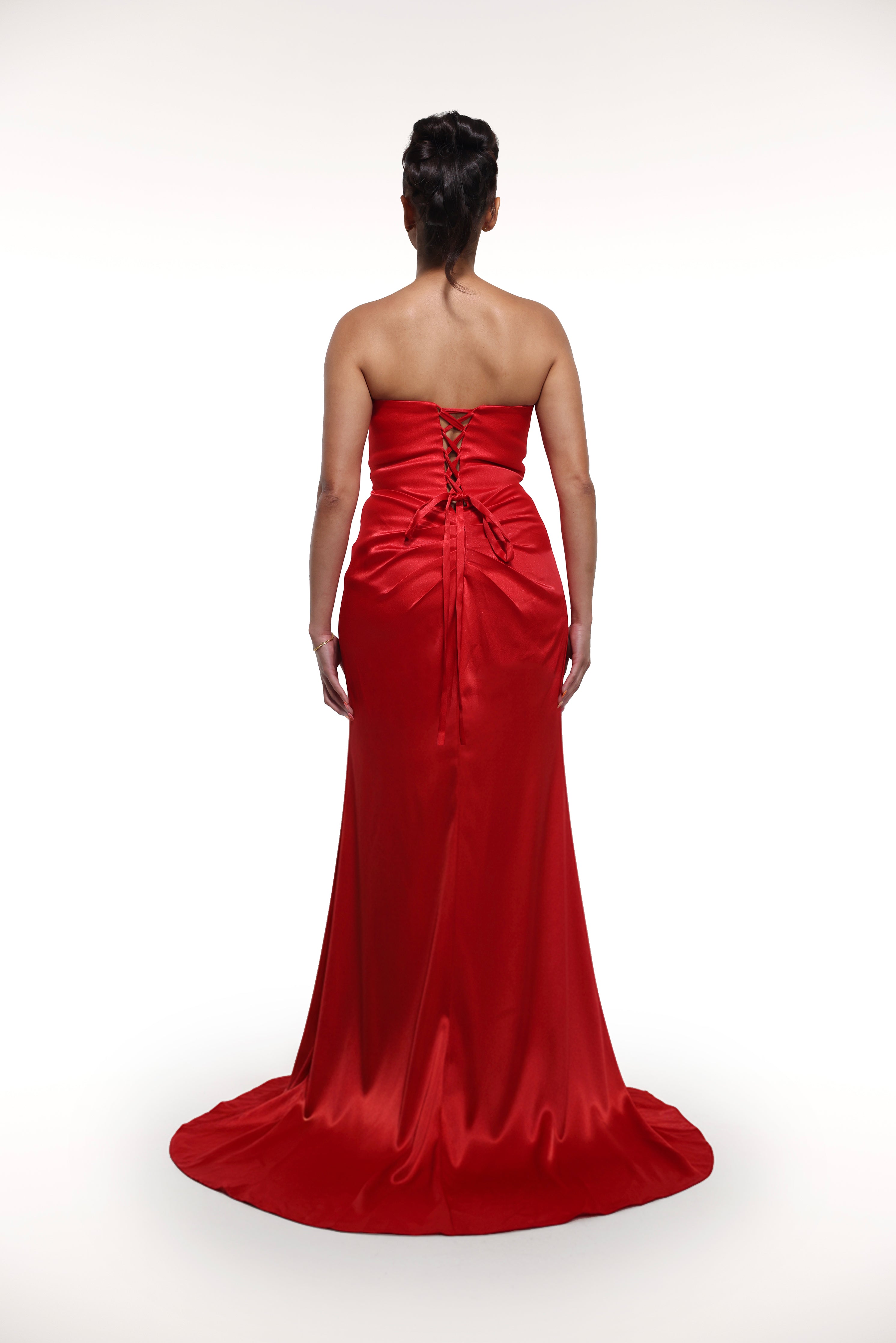 ‘Sienna’ in a gorgeous burnt orange color. It features a pleated bust with a beaded intricate design, slit, an a-line silhouette and ties at the back (adjustable corset).