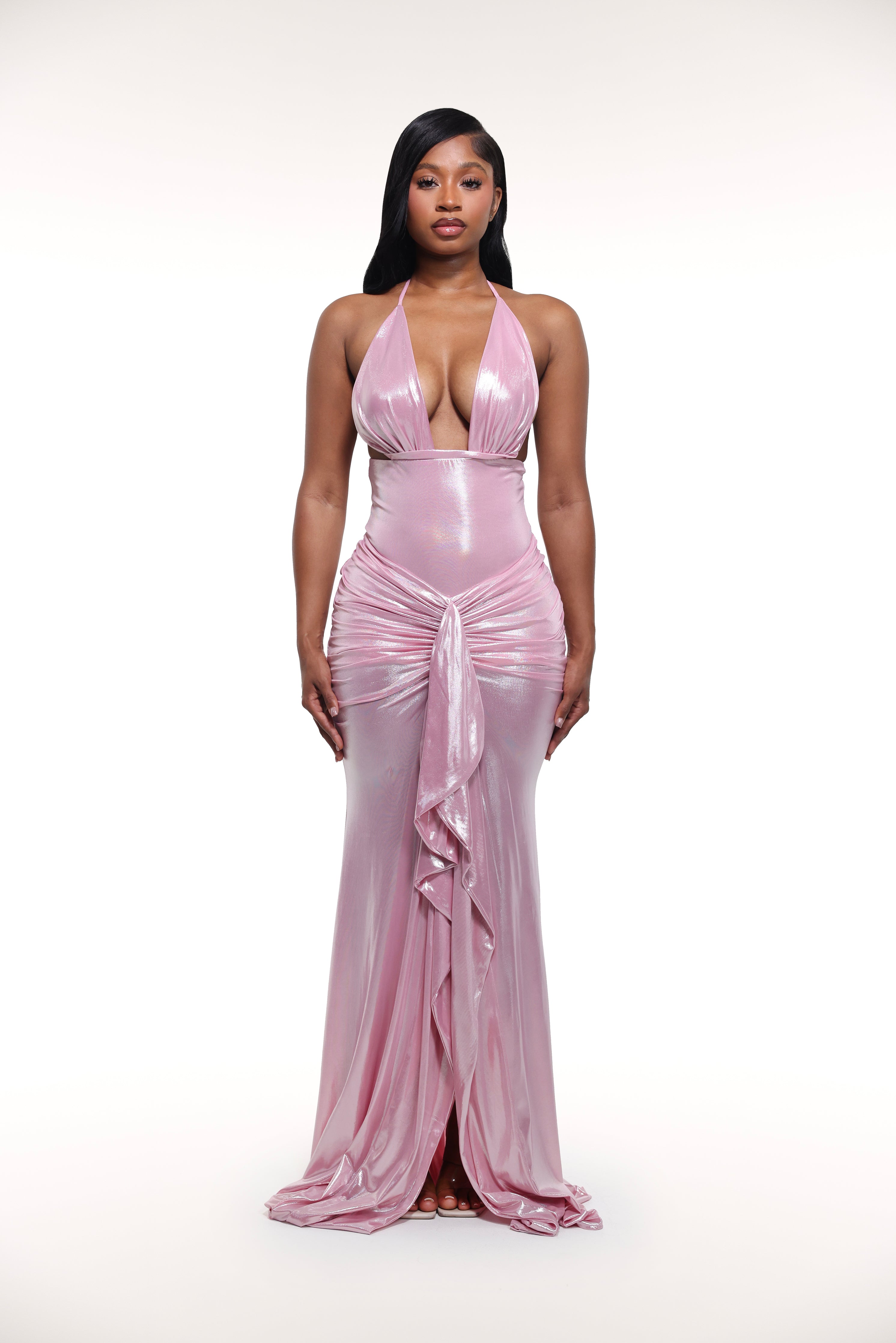 Give it up for 'Lora' our gorgeous metallic pink two piece for her elegance and beauty. This piece features a plunging halter neckline bodysuit and a scrunched matching skirt to pair.