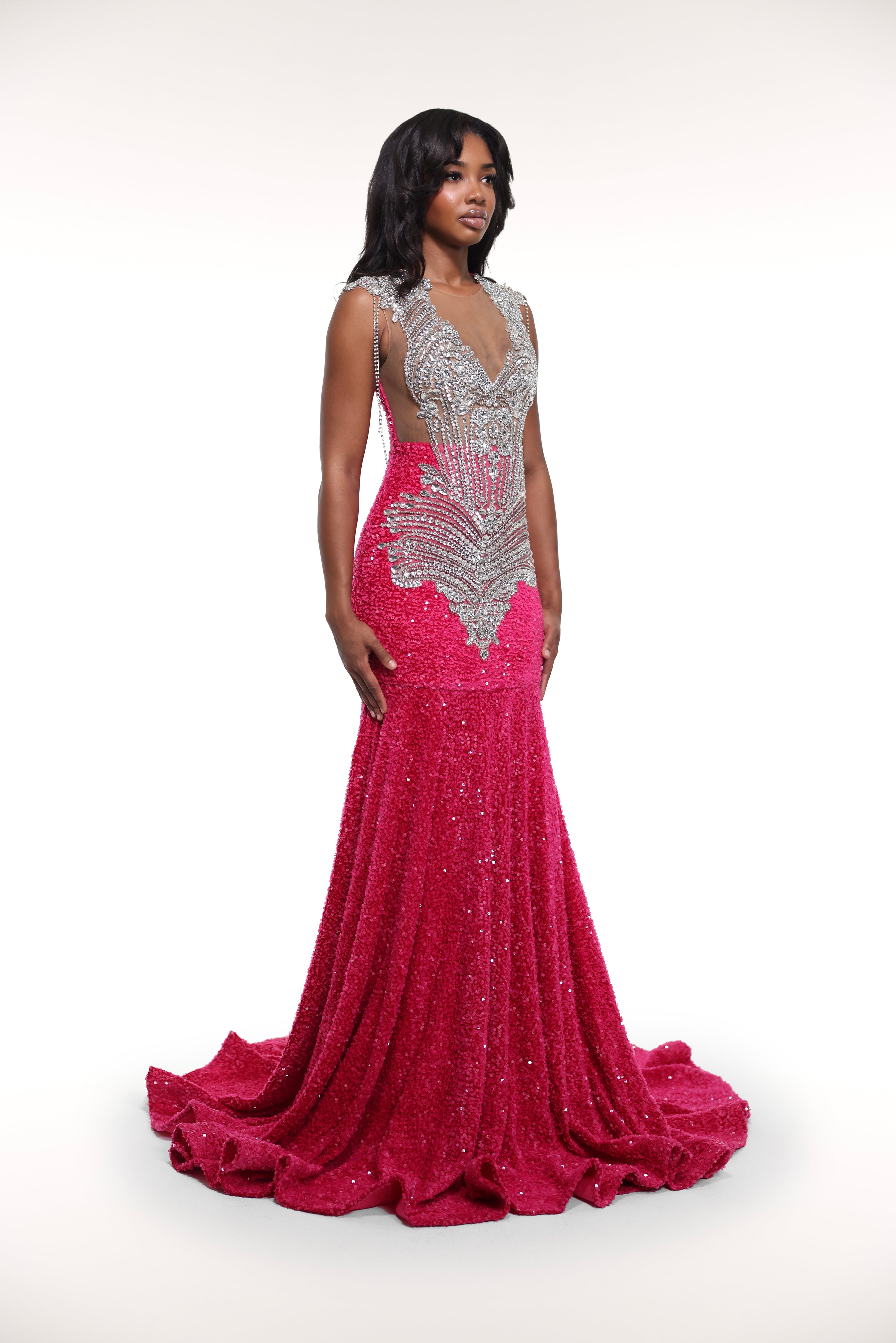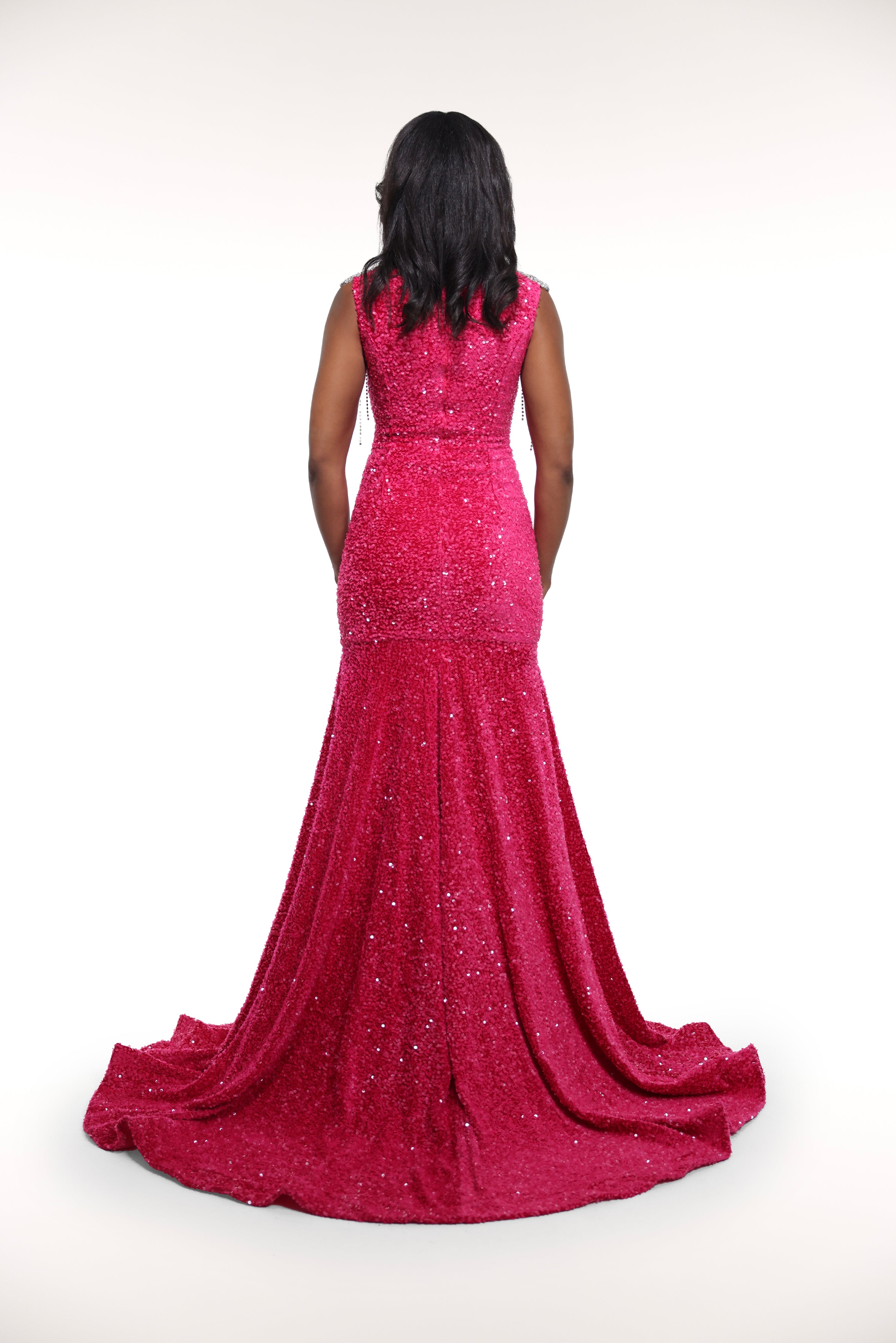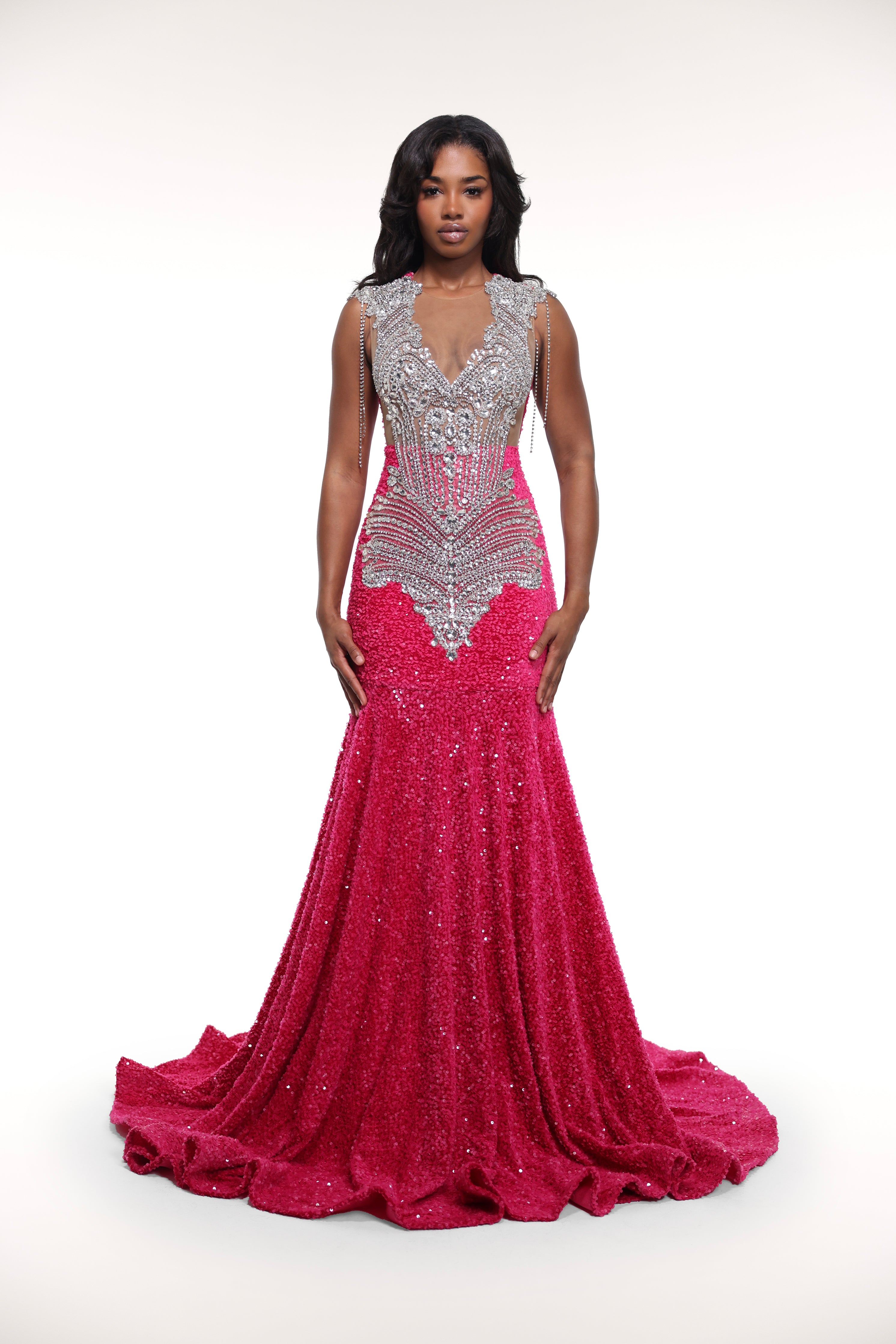 Introducing 'Hottie', the luxurious velvet sequin gown adorned with silver appliques and rhinestone tassles on the shoulder. With a convenient zip back, this dress exudes elegance and sophistication.