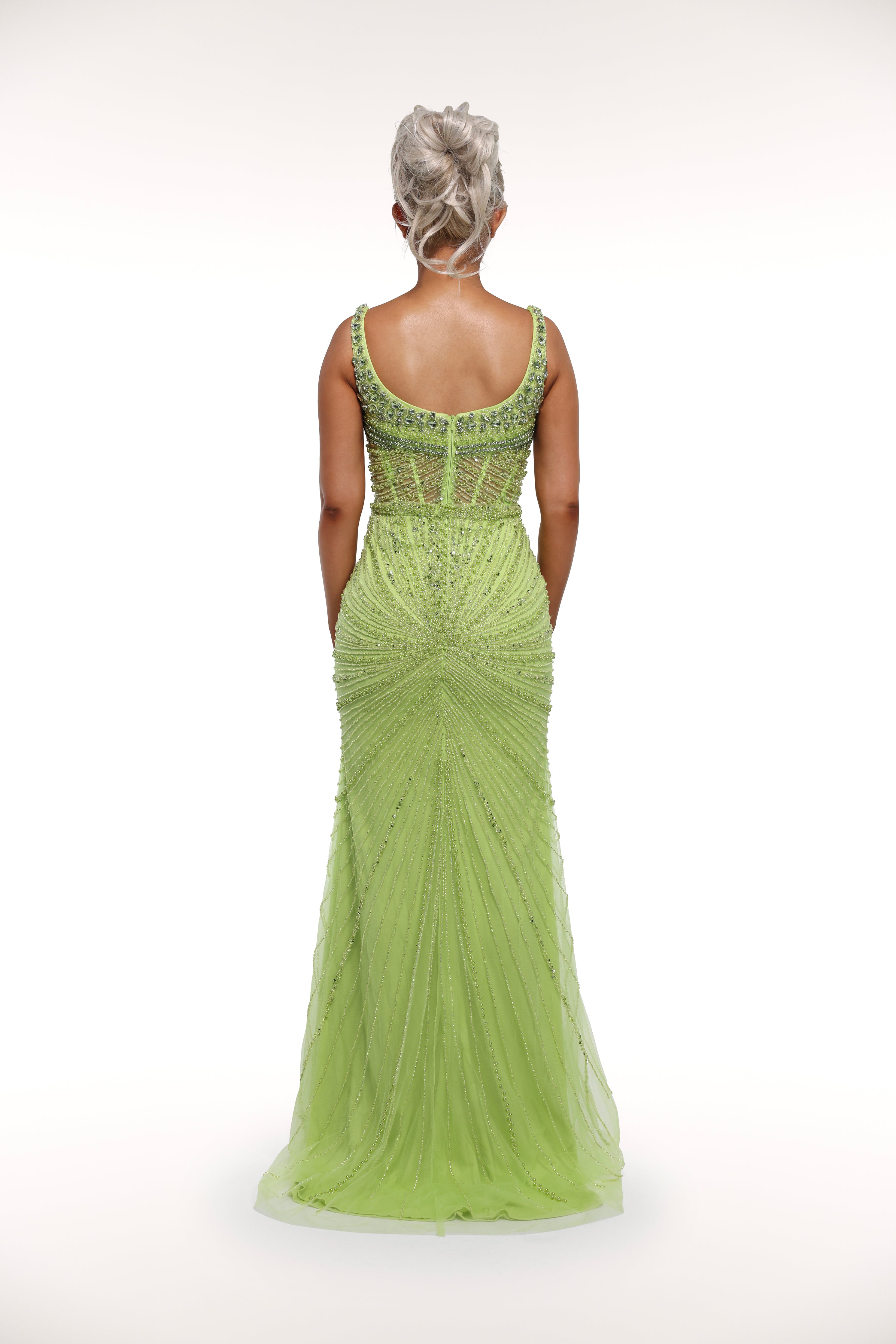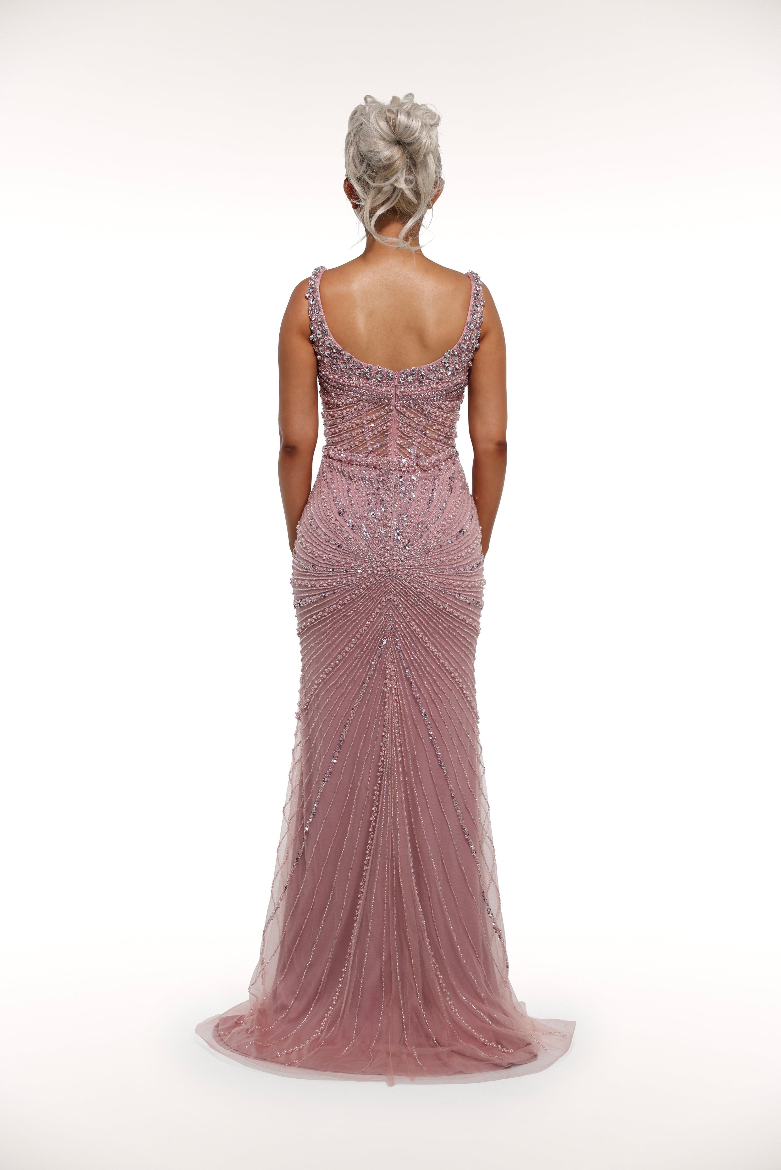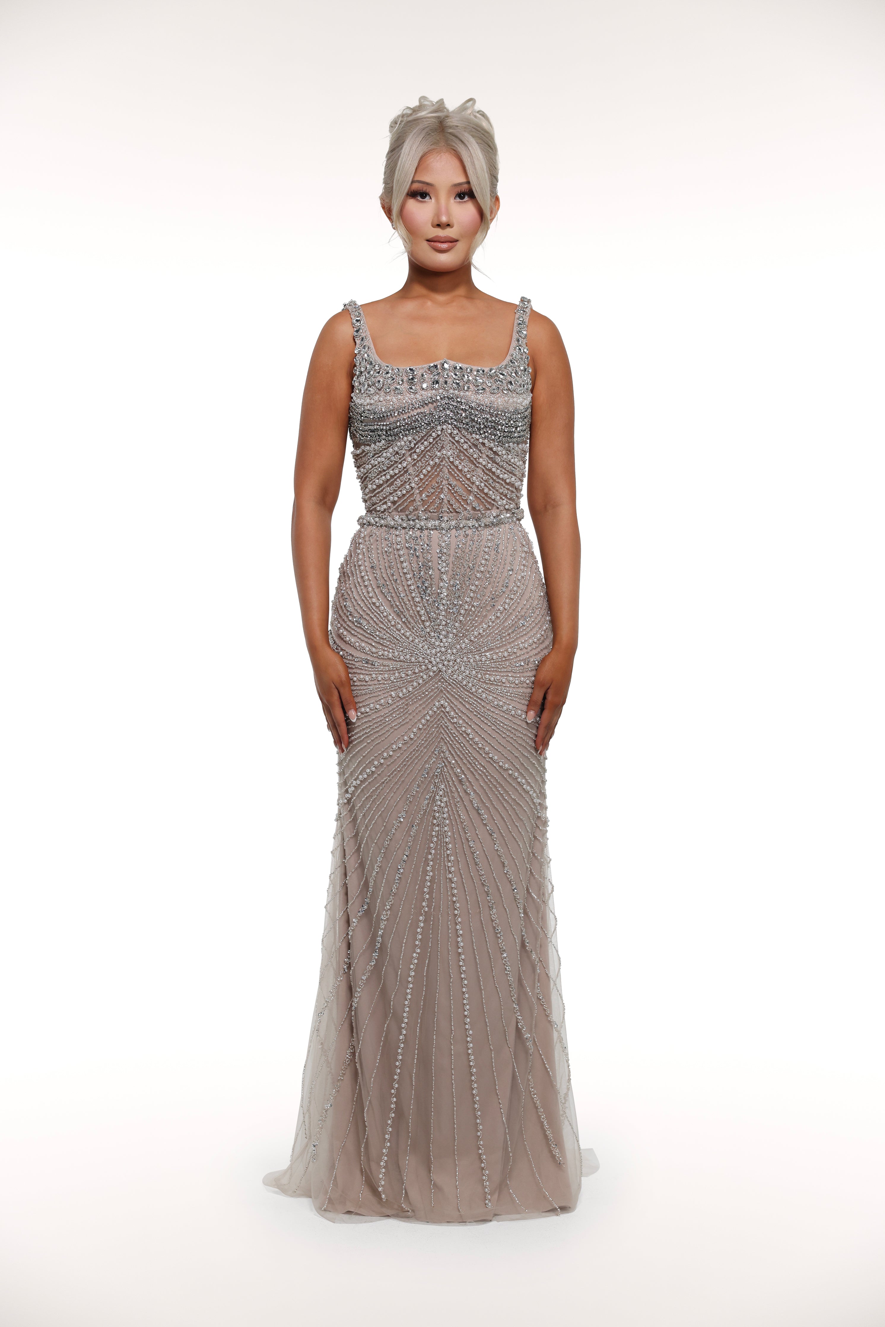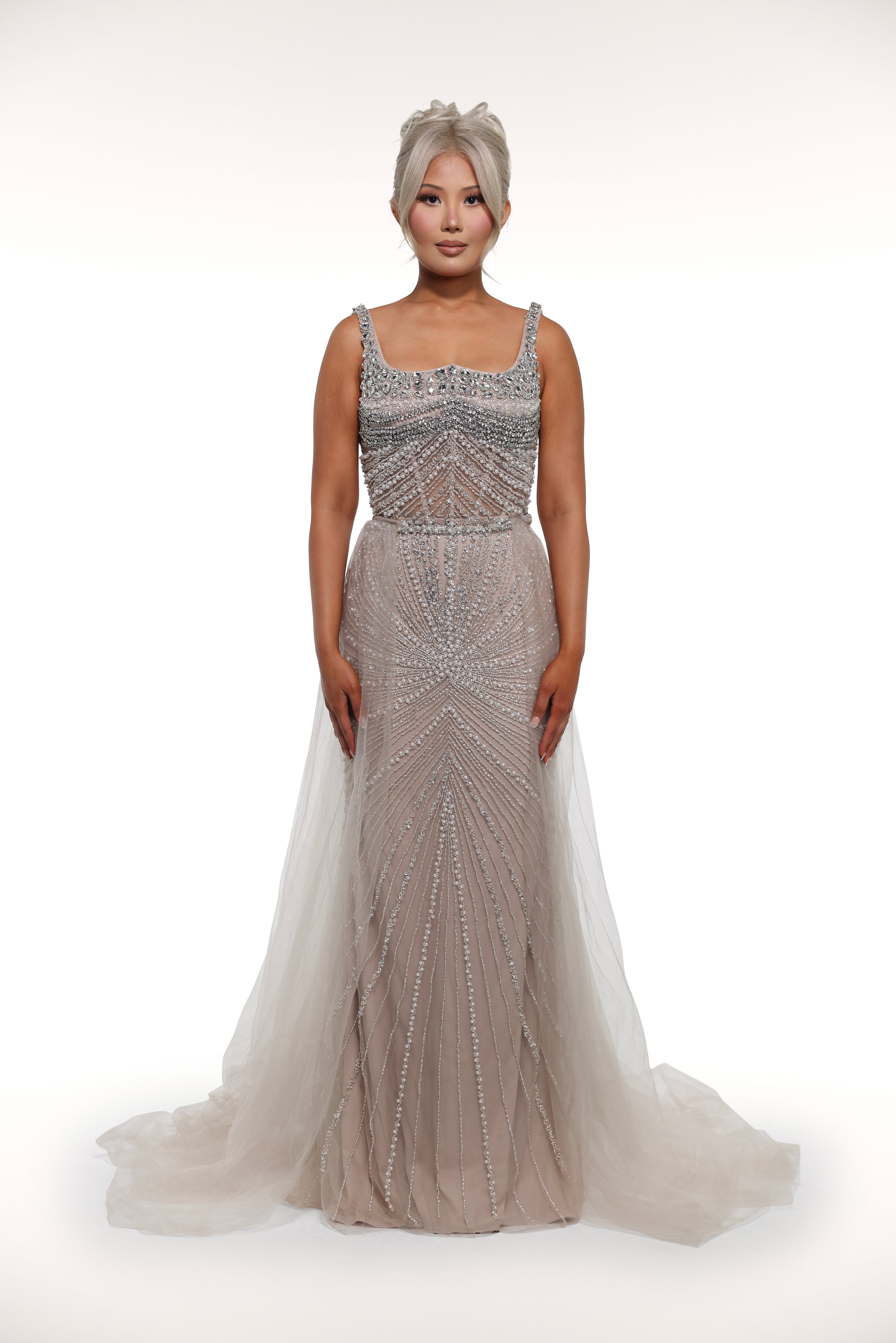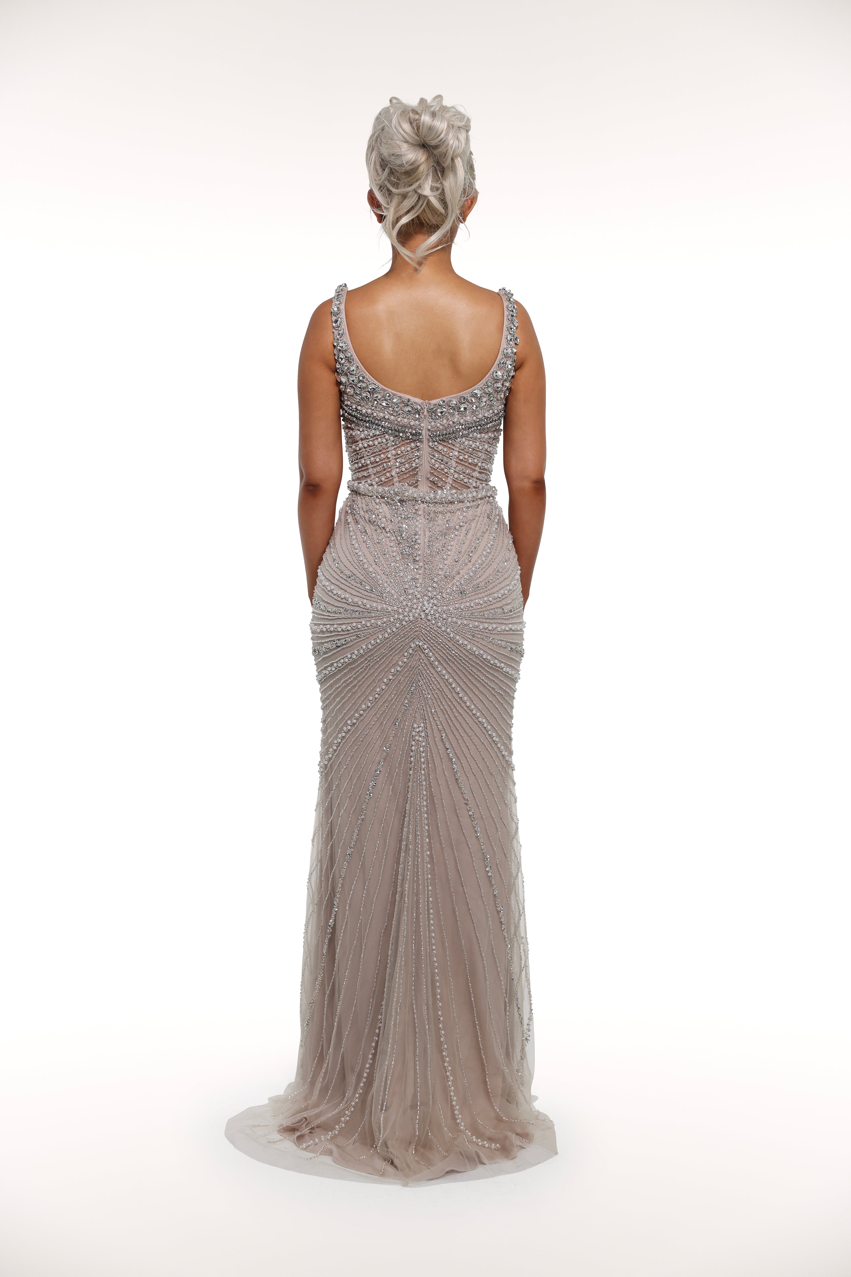 This 'Kiara' gown is a true show-stopper with its intricate embellishments throughout, mesh corset bust design, and sparkling silver crystals, adding the perfect touch of glamour. Perfect for a special occasion or formal event, this dress exudes elegance and sophistication.