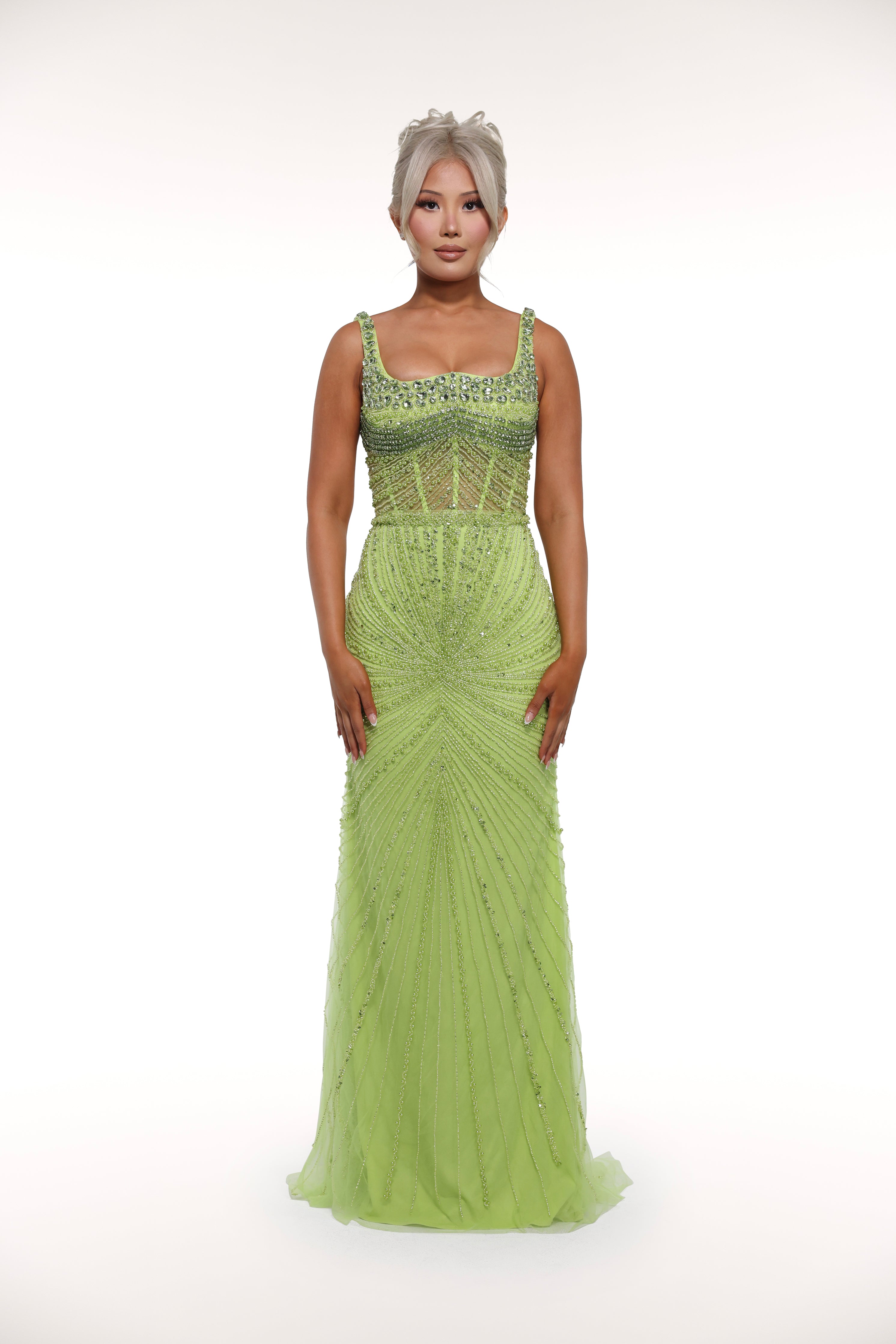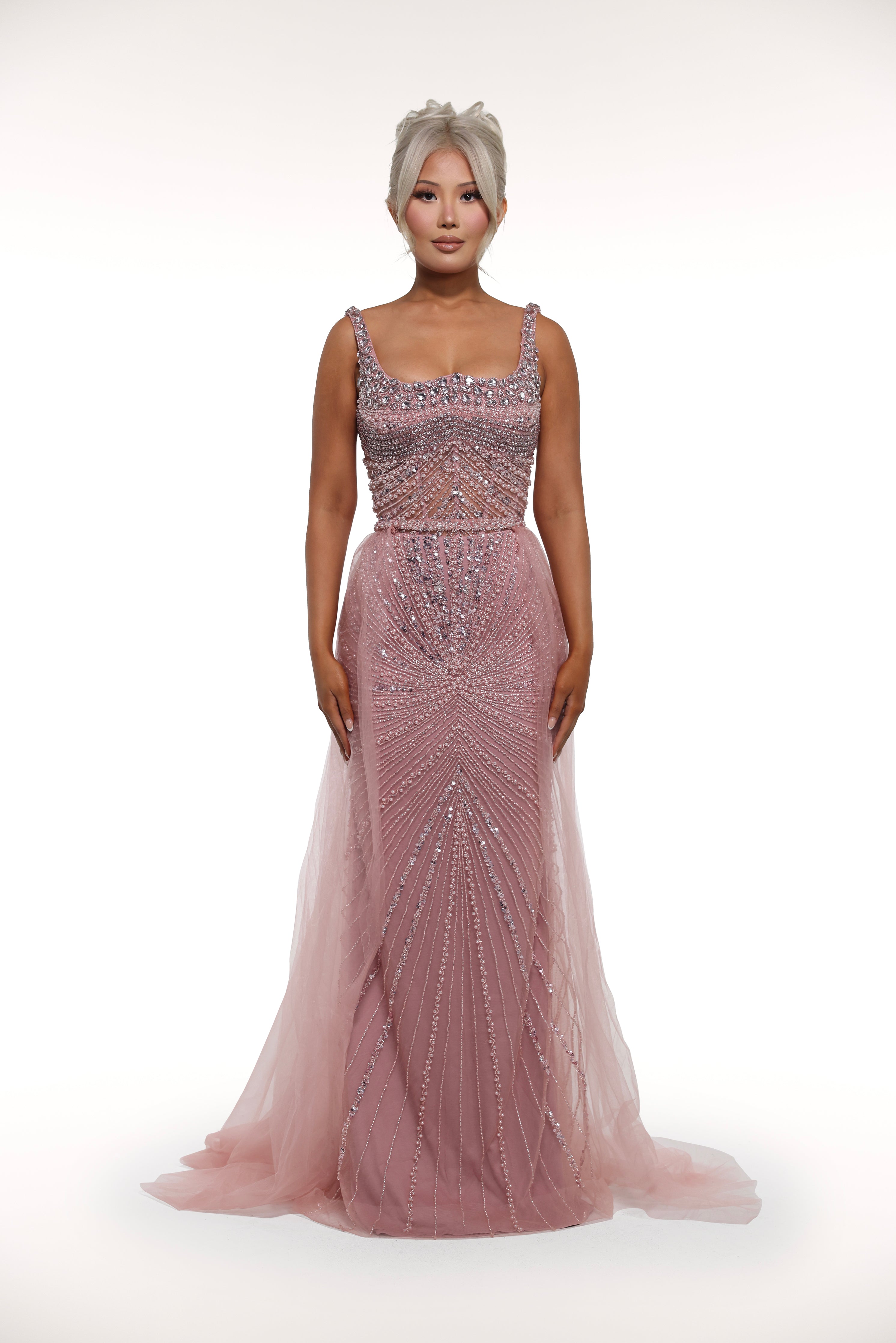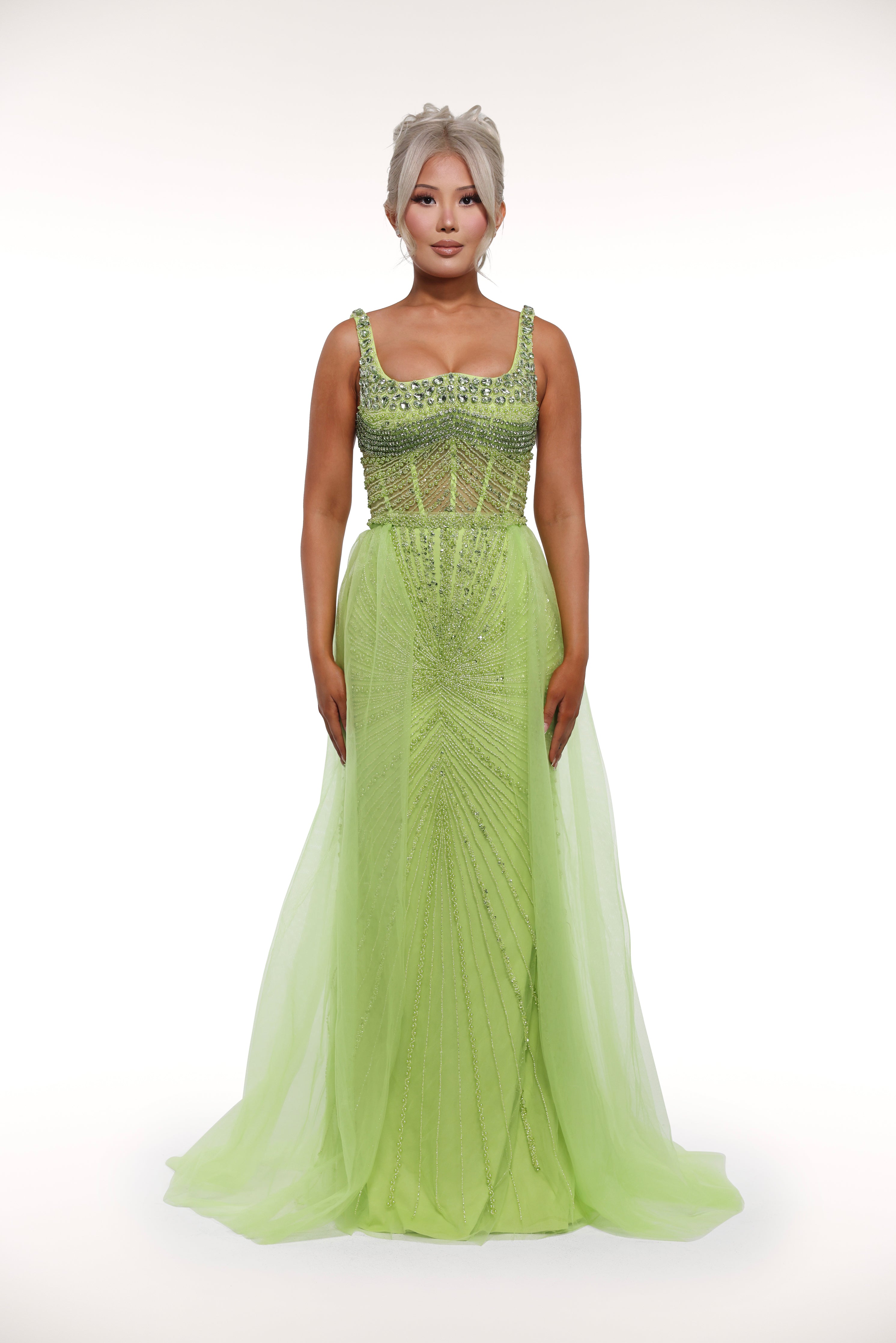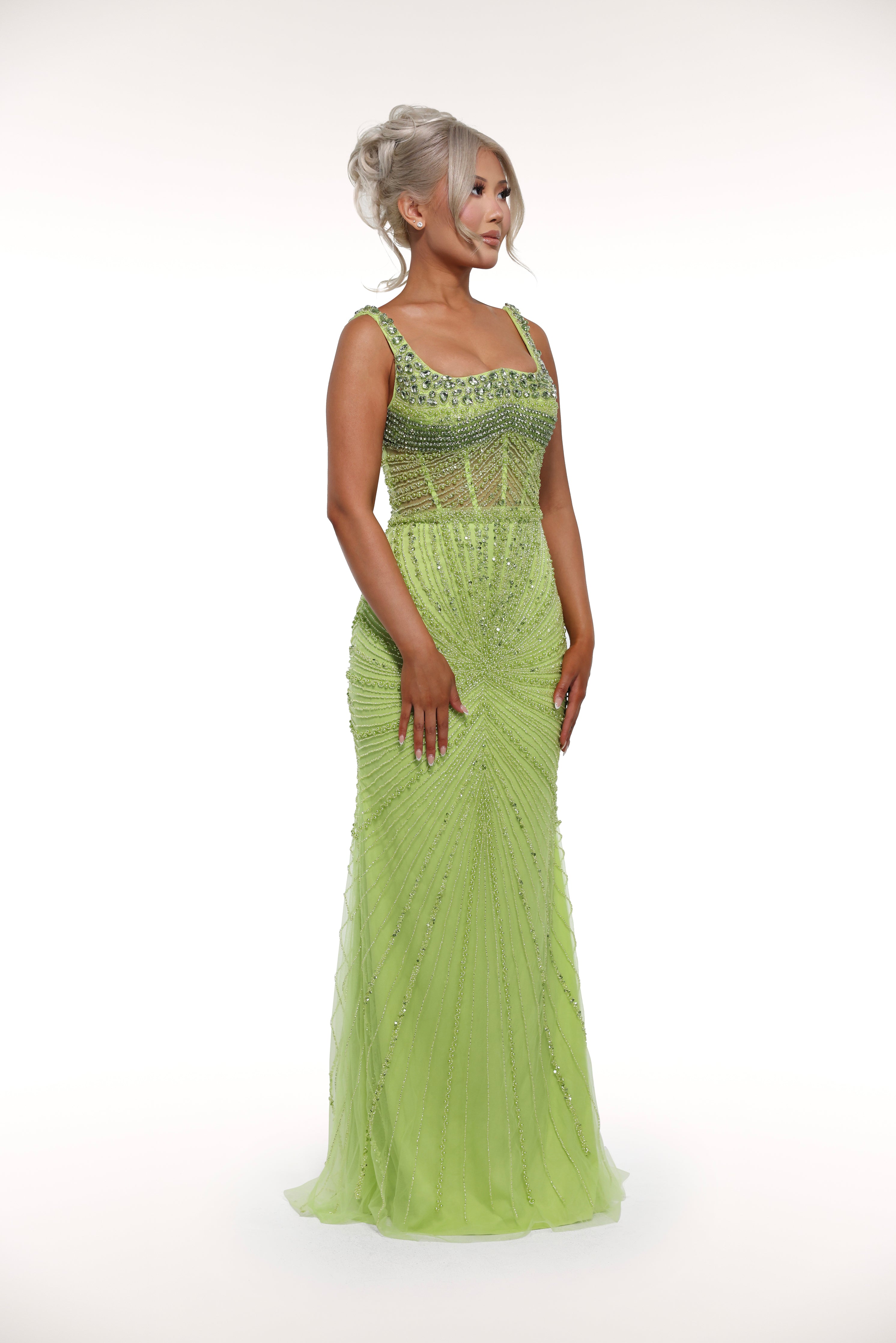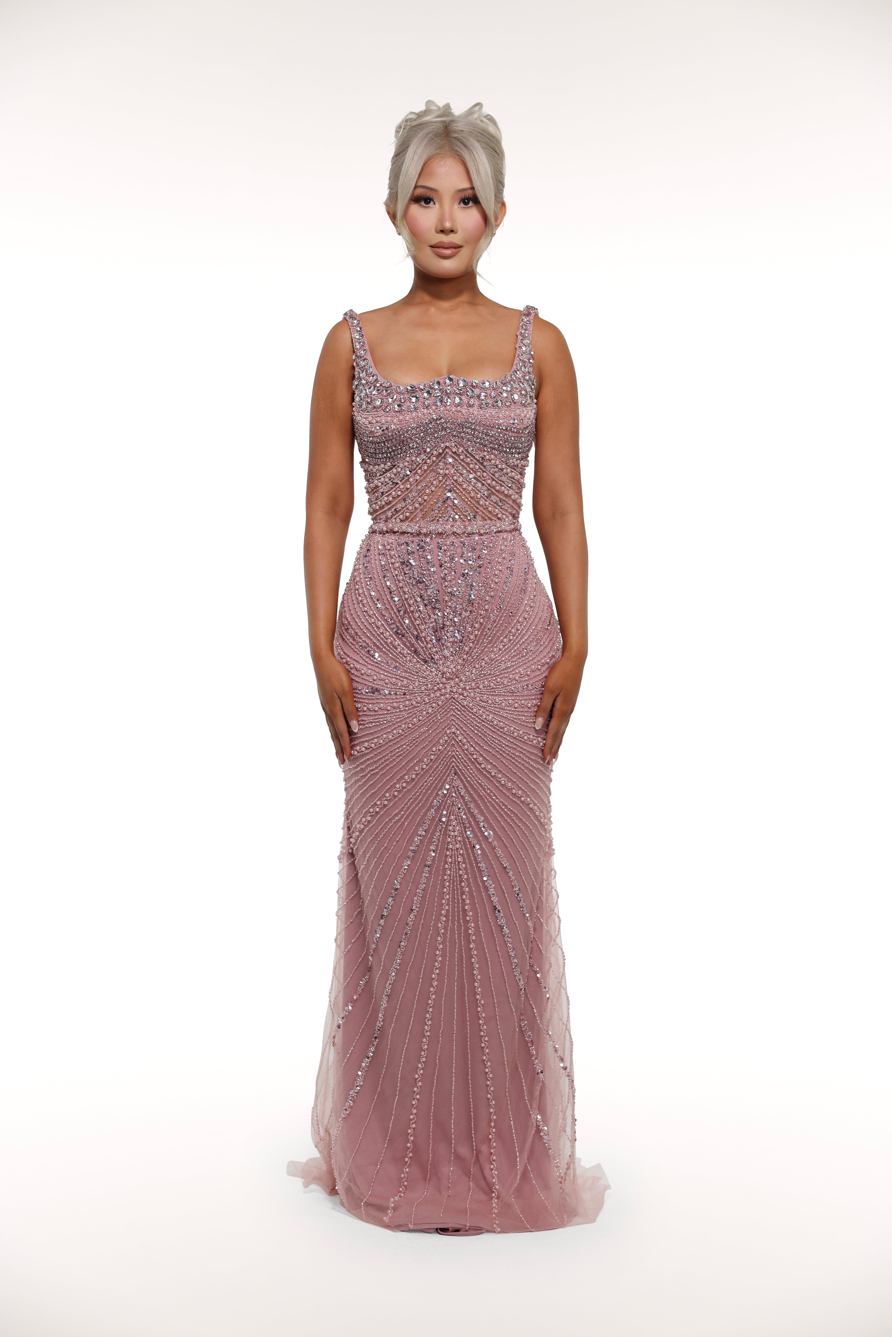 This 'Kiara' gown is a true show-stopper with its intricate embellishments throughout, mesh corset bust design, and sparkling silver crystals, adding the perfect touch of glamour. Perfect for a special occasion or formal event, this dress exudes elegance and sophistication.